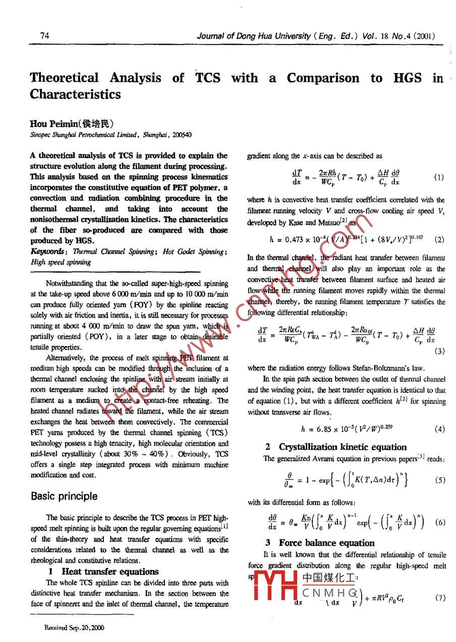 74Journal of Dong Hua University ( Eng. Ed.) Vol. 18 No .4 (2001)Theoretical Analysis of TCS with a Comparison to HGS inCharacteristicsHou Peimin(侯培民)Sinope Shanghai Petrochemical Limited, Shconghai , 200540A theoretical analysis of TCS is provided to explain thegnadient along the x axis can be described asstructure evolution along the flament during processing.This amalysis based on the spinning process kinematics業(yè)。_ 2πRh(r- ro)+ AH d1)dx=- WC,Cp dxincorporates the constitutive equation of PET polymer, aconvection and radiation combining procedure in thewhere h is convective heat transfer coefficient correlated with thethermal channel, and taking into account thefilament running velocity V and coss-fIow cooling air speed V,nonisothermal crystallization kinetics. The characteristicsdeveloped by Kase and Matsuo2 asof the fiber so-produced are compared with thoseproduced by HGS.h = 0.473 x 10~4(VA).34[1 + (8VJ/V)2]0.167 (2)Keywords: Themal Channel Spinning; Hot Godet Spinning;In the themmal chanel, the nadiant heat transfer between filamentHigh speed spinningand themal channel will also play an important role as theNotwithstanding that the so-called super-high-speed spinningconvective heat transfer between flament surface and heated airat the take up speed above 6000 m/min and up to 10 000 m/minflow while the nning filament moves rapidly within the theralcan produce fully oriented yarm (FOY) by the spinline reactingchannel, thereby, the nning filament temperature T satisfies thesolely with air friction and inertia, it is still necessary for procsesfollowing diferential reltionship:running at about 4 000 m/min to draw the spun yam, which isdT_ 2πReC;2xRaOH業(yè)parially oriented (POY), in a later stage to obtain desinabledx=~ WCp(TW- %) -WC(T-To)+Tdxtensile properties.3)Alemaively, the process of melt spinning PET flament atmedium high speeds can be modifed through the inclusion of awhere the radiation energy fllows Stefan-Bolumann's law.thermal channel enclosing the spinline wih air stream initally atn the spin path scction between the outlet of themnal channelroom temperature sucked into the channel by the high speedand the winding point, the heat transfer equation is identical l0 thatflament as a medium to create a contact-free recheating. Theof equation (1), but with a dfferent cofficient h{2] for spinningheated channel rdiates toward the filament, while the air streanwithout transverse air flows.exchanges the heat between them convcively. The commercialh= 6.85 x 10~*( V2/W)0.259(4)PET yams produced by the themal channel spinning (TCS)technology possess a high tenacity, high molecular orientation and2 Crystallization kinetic equationmid-level crsailiniy (about 30% ~ 40%) . Obviously, TCSThe generalized Avrami equation in previous papers-3J reads:offers a single step integated process with minimum machinemodification and cost.g=1-0p{- (*"(0nd)'}(5)Basic principlewith its diferenial fom as fllows:The basic principle to describe the TCS process in PET high-speed melt spinning is built upon the regular goverming equationstal想∞0氣(。合山)“c(-(告0) (6)of the thin-theory and heat transfer equations with specific3 Force balance equationconsideratioms related to the themnal channel as well s theIt is well known that the differential relationship of tensilerheological and consitutive relations.force gradient distribution along the regular high-speed melt1 Heat transfer equations中國煤化工:The whole TCS spinline can be divided into three parts withdistinctive heat transfer mechanism. In the section betwen theTHCNMHG) + πRVpoCq(7)face of spinneret and the inlet of thermal channel, the temperaturedx\dx VReceivred Sep.20,2000Jourmal of Dong Hua University (Eng. Ed.) Vol. 18 No.4(200) 75where Cr is the skin- friction coffcient depending on the velocitydn = Aopd_ An(9)V of the running filament . However, the cequation (7) is onlydsuitable for the spin path sections outside the channel. In thechannel, due to the much stronger sin-rction a new equation (8)where τm is he relaxation time of PET polymer, the strain-opticalceffcient Aop was experimentally determined, and thus theis derived to describte the tensile force gradient along the x-axisobtained valuel4) 0.53 is used here.within the channelBesides the above-mentioned equations from (1) to (9),2ryk v.2(8)constiutive equation of PET polymer, continuity equaion andlxln( R./R)other material property relations are adequately considered.where kt is a empirical coefficient in the range of 1.2~ 2.2,Experimentalincreasing with the wind-up speed between 3 600 m/min ~ 4 400m/min, μ is the dynamic viscosity.The PET chips used in this study have an intinsic viscositySpinning orientation equation[IV] of 0.66 dl/g. In the spinning experiments, the round orifceAlthough the high degree of molecular orientation required forof spinneret plate is 0.02 cm in diameter and the thermal channe!good mechanical behavior of textile fibers is produced mainly inis 150 cm long and 1.65 cm in inner nadius. The PET flamnent wasthe course of drawing, the high molecular orientation can alsoprepared in TCS spining eaquiprnent made in Barmag Company,achieved by the themal channel spinning (TCS) technology, ancGermany under the various process conditions as listed in Table I,satisfies the requirements for textile processes.and its properties such as birefringence, diameter and crytallinityThe relationship between birefringence and flamentwere measured by means of Senammont Method and X-raydeformation in the spinline was suggested by Nishiuniltl asDifraction Method, respectively.Table 1 The themal channel spinning process conditionsSpinningCross air flowThemal channelTake-up velocity,1emperaturt,velocity, cm/stenperature, Cposition" . cntemperalure, 它km/min2804020110160/180/2003.6/4.0/4.4Themal channel position refters如the distance between he face of spinneret and the inle of themal channedlisted in Table 2. It is evident that they are in good agr