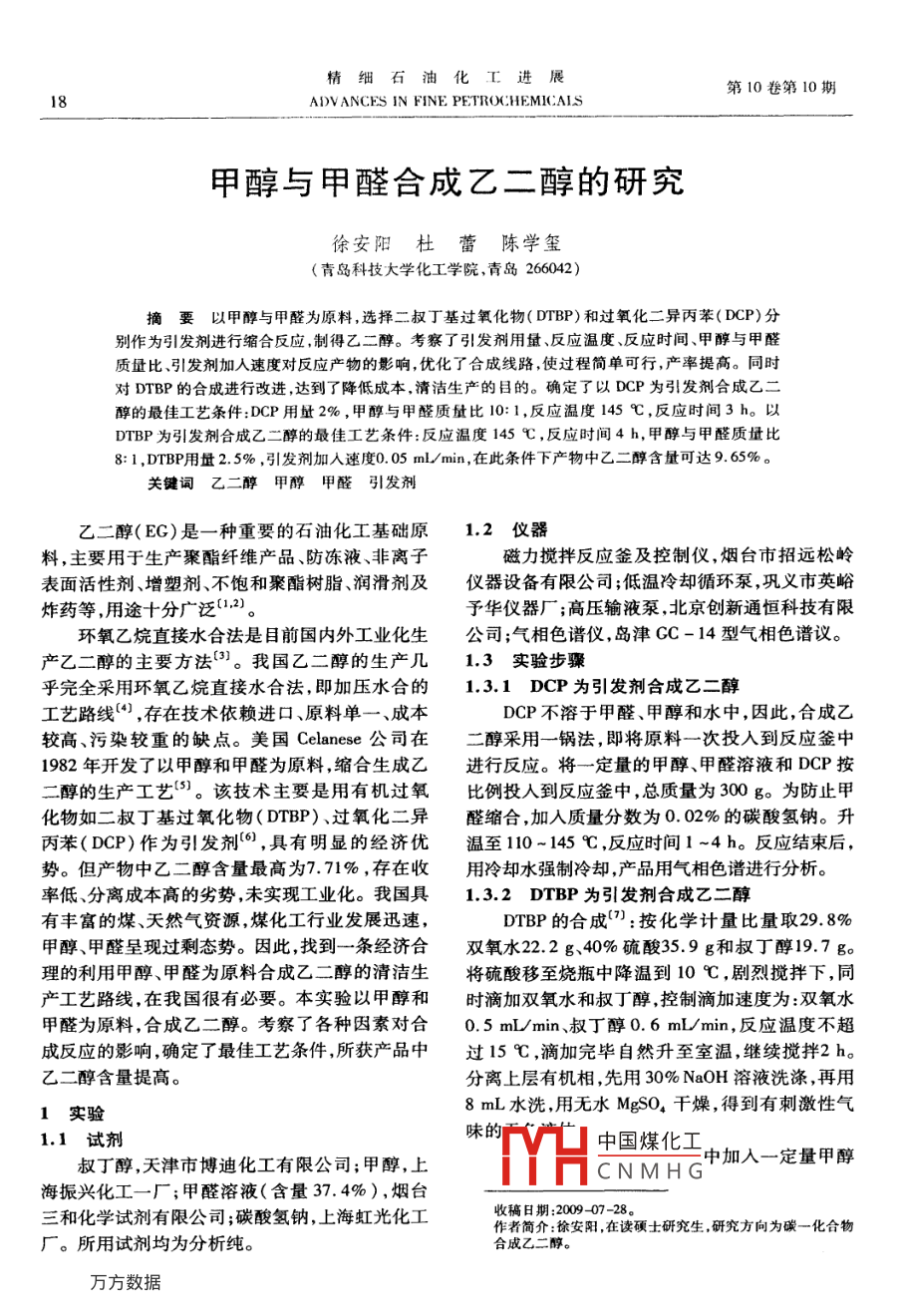 甲醇與甲醛合成乙二醇的研究