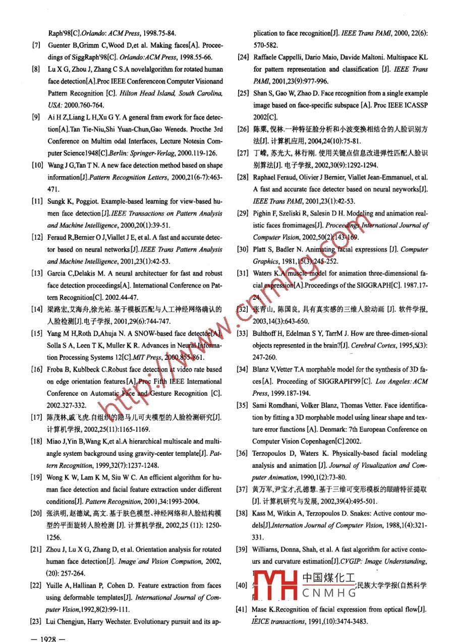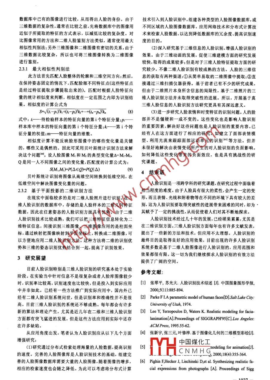 第27卷第11期計(jì)算機(jī)工程與設(shè)計(jì)2006年6月Vol.27No.11Computer Engineering and DesignJune 2006人臉識(shí)別技術(shù)張會(huì)森,王映輝(陜西師范大學(xué)計(jì)算機(jī)科學(xué)學(xué)院,陜西西安710062)摘要:人臉圖像的 易取性和人臉變化的多樣性使人臉識(shí)別研究更富有挑戰(zhàn)性.按照人臉檢測(cè)、特征提取和識(shí)別3個(gè)關(guān)鍵過(guò)程,分別對(duì)基于二維和三維人臉信息的人臉識(shí)別技術(shù)和方法進(jìn)行了詳細(xì)的闡述;展望了人臉識(shí)別研究的趨勢(shì),并提出了可能取得突破性研究進(jìn)展的研究途徑。關(guān)鍵詞:人臉識(shí)別;特征提取;特征臉;彈性匹配;形變模型.中圖法分類號(hào):TP18文獻(xiàn)標(biāo)識(shí)碼:A文章編號(hào): 000-7024 (2006) 11-1923-06Face recognition technologyZHANG Hui-sen,WANG Ying-hui(School of Computer Science, Shanxi Normal University, Xian 710062, China)Abstract: People face image of easy fetch and people face variety make the face recognition of study more challenging. According tothe people faces of measure, feature extraction and face recognition three pieces ofkey course in face recognition, person face recognitiontechnology and method based on 2-D and 3-D person face information are explained in detail. Research trend of face recognition is given,and the research way is presented by which the unprecedented research progresses could be got possibly.Key words: face recognition; feature extraction; eigenface; elastic matching; morphable model三維人臉研究過(guò)程中,Parke"第I個(gè)將人臉模型參數(shù)化,并且可以通過(guò)參數(shù)的變化產(chǎn)生簡(jiǎn)單的動(dòng)畫,但是人臉參數(shù)復(fù)雜,且人臉的結(jié)構(gòu)都是一樣的,但世界上不存在完全一樣 的兩缺乏真實(shí)感。隨后Lee等人田使用真實(shí)人臉圖像合成紋理技張人臉,即使是雙胞胎也存在著可區(qū)分之處。因?yàn)槿四樀拿嫘g(shù),實(shí)現(xiàn)了具有真實(shí)感并且能產(chǎn)生各種表情的人臉模型,但是部特征存在差異,使得計(jì)算機(jī)人臉識(shí)別成為可能。人臉識(shí)別該模型使用了肌肉模型,計(jì)算量較大。隨后又出現(xiàn)了基于幾技術(shù)的研究始于20世紀(jì)60年代末,經(jīng)過(guò)幾十年的發(fā)展已經(jīng)何模型變形的人臉建模方法,該方法使用了多幅不同角度的取得了很大的進(jìn)展。人臉圖像,從這些圖像中提取有用的人臉特征點(diǎn),使用視覺(jué)方近年來(lái)隨著各個(gè)部門對(duì)身份驗(yàn)證要求的提高,各種身份法恢復(fù)出這些點(diǎn)的三維位置,然后再修改二維人臉圖像,最后識(shí)別技術(shù)得到了迅速發(fā)展。與其它身份識(shí)別技術(shù)相比,人臉進(jìn)行紋理映射或三維模型彩繪得到人臉的三維圖像。這種識(shí)別能在最自然、直接,特別是在非接觸環(huán)境和不驚動(dòng)被檢測(cè)方法簡(jiǎn)單且過(guò)真度高,是目前比較流行的方法。其中代表性人的情況下進(jìn)行的,因此計(jì)算機(jī)人臉識(shí)別技術(shù)成為最活躍的的有:Lee等人的基于正交圖像的三維人臉克隆";:Pighin等人研究領(lǐng)域之的基于圖像的人臉造型':Guenter等人的人臉造型技術(shù)等。人臉識(shí)別技術(shù)是生物識(shí)別技術(shù)的一種, 它結(jié)合了圖像處目前有許多研究人員從事人臉識(shí)別的研究,在國(guó)內(nèi)比較理、計(jì)算機(jī)圖形學(xué)、模式識(shí)別、可視化技術(shù)、人體生理學(xué)、認(rèn)知著名的研究機(jī)構(gòu)有清華大學(xué)明和中科院計(jì)算機(jī)技術(shù)研究所科學(xué)和心理學(xué)等多個(gè)研究領(lǐng)域,幾十年來(lái)尤其是在二維人臉等,在人臉識(shí)別方面積累了較多的經(jīng)驗(yàn),取得了較多的成果。識(shí)別方面,已經(jīng)產(chǎn)生了較豐富的技術(shù)、方法和理論。在三維人1二維人臉識(shí)別臉識(shí)別方面,由于其復(fù)雜性和數(shù)據(jù)獲取的困難性,三維人臉識(shí)別的研究進(jìn)展落后于二維人臉識(shí)別。二維人臉識(shí)別主要涉及人臉檢測(cè)、特征提取和人臉鑒別在人臉識(shí)別研究過(guò)程中,最早的研究者是Bledse'l",他以等步驟。典型的人臉圖像包括正面和側(cè)面兩種,在二維人臉人臉特征點(diǎn)的間距、比率等參數(shù)為依據(jù),建成了一個(gè)半自動(dòng)的識(shí)別中基于正面的識(shí)別方法研究最多,主要集中在人臉的檢人臉識(shí)別系統(tǒng)。Parke"第 1個(gè)用計(jì)算機(jī)生成了人臉圖像;在測(cè)和中國(guó)煤化工收稿日期: 2005-04-03.0TYHCNMH G基金項(xiàng)目:國(guó)家863高技術(shù)研究發(fā)展計(jì)劃基金項(xiàng)目(003A118105);陜西省自然基金項(xiàng)目(03F35);陜西師范大學(xué)校級(jí)重點(diǎn)基金項(xiàng)目(995147)。作者簡(jiǎn)介:張會(huì)森(1979-),男, 河北巨鹿人,碩士研究生,研究方向?yàn)閳D形圖像技術(shù)與模式識(shí)別;王映輝 (1967-),男,甘肅莊浪人,教授,碩士生導(dǎo)師,研究方向?yàn)榭梢暬?、模式識(shí)別和軟件演化技術(shù)。- 1923 -.1 人臉檢測(cè)可選取虹膜中心、內(nèi)眼角點(diǎn)外眼角點(diǎn)、上下眼瞼點(diǎn)、兩內(nèi)眼角人臉檢測(cè)是從輸入的圖像中尋找可能存在的人臉區(qū)域,距、兩外眼角距和兩眼眼高等特征,這些信息可以確定出眼睛并確定其大小和姿態(tài)的過(guò)程。目前人臉檢測(cè)的方法很多,大的大小和