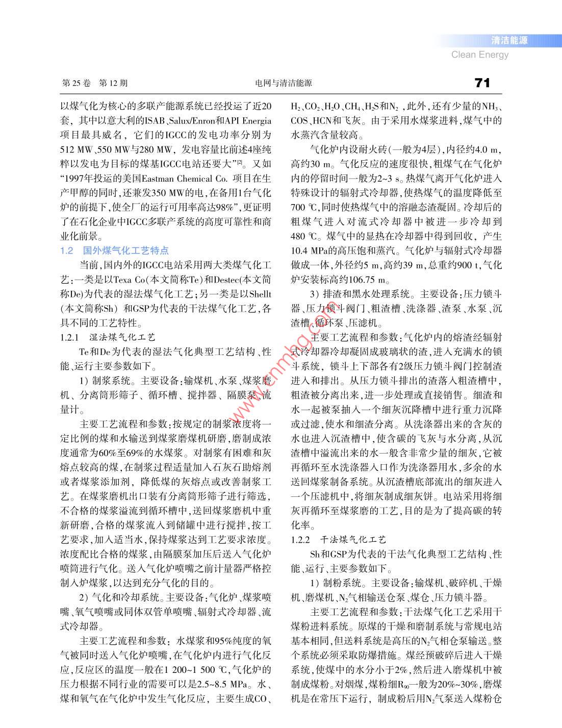 清潔能源Clean Energy第25卷第12期電網(wǎng)與清潔能源Vol.25 No.122009年12月Power System and Clean EnergyDec, 2009文章編號(hào): 1674- -3814( 2009 )12-0070-05中圖分類號(hào):TM611文獻(xiàn)標(biāo)志碼:A采用GSP氣化技術(shù)的IGCC電站嚴(yán)二敏',嚴(yán)行健2(1.東亞電力管理咨詢(南京)有限公司,南京 210008; 2.江蘇省電機(jī)工程學(xué)會(huì),南京210024)IGCC Power Plant Using GSP Gasification TechnologyYAN Er-min', YAN Xing-jian?(1.East Asia IPower Management Consulting (Nanjing) Co.,Ltd., Nanjing 210008, Jiangsu Province, China;2.Jiangsu Society of Electrical Enginering, Nanjing 210024, Jiangsu Province, China)ABSTRACT: Coal gasification technology, equipment and tech-1 900 944 kN.m/a。該合成氣為南京IGCC電站和該化工園醋酸、精細(xì)化工染料等產(chǎn)業(yè)提供生產(chǎn)燃料和IGCC power plants were analyed comprehensively for wet and dry原料,順應(yīng)了南京化工園區(qū)經(jīng)濟(jì)發(fā)展的需求。coal gasification technology by research and study, with the NanjingChemical Industry Park petrochemical enterprises, it is suitable to1國(guó)外IGCC電站的煤氣化工藝主要choose GSPdry gas tchnology in Nanjing Chemical Industry Park.KEY WORDS: IGCC power station; coal gasification techno-特點(diǎn)logy; GSP gasification technology摘要:通過(guò)調(diào)研、考察,綜合分析了濕法和干法兩種煤氣化工.1 國(guó)外IGCC電站發(fā)展概況藝、設(shè)備技術(shù)特點(diǎn)和經(jīng)濟(jì)效益及在IGCC電站的應(yīng)用情況,結(jié)IGCC潔凈煤發(fā)電技術(shù)自20世紀(jì)70年代初期研合南京化工園的石化企業(yè)實(shí)際,認(rèn)為選擇采用CSP干法煤氣發(fā)開始,至今已有30多年歷史。由于技術(shù)復(fù)雜,特別化技術(shù)在南京化工園內(nèi)IGCC電站應(yīng)用是合適的。是建廠投資居高不下,致使至今正式投人商業(yè)運(yùn)營(yíng)的純發(fā)電的煤基IGCC電站為數(shù)不多。“正式投人商關(guān)鍵詞: IGCC電站;煤氣化技術(shù);GSP氣化技術(shù)業(yè)性示范運(yùn)行的純發(fā)電的煤基ICCC電站只有4座,它們是:Wabash River IGCC電站( 美國(guó)),Tampa) 引言IGCC電站(美國(guó)), Buggemun IGCC電站(荷蘭)和Puertollano IGCC電站(西班牙)”121。國(guó)內(nèi)首座采用GSP干法煤氣化技術(shù)的IGCC電站與此同時(shí),IGCC發(fā)電技術(shù)卻在石化企業(yè)中找到擬于2010年在南京開工建設(shè),將由南京蘭天燃?xì)鉄崃思夹g(shù)與經(jīng)濟(jì)的有效結(jié)合點(diǎn),這就是在20世紀(jì)90年代電有限公司在南京化學(xué)工業(yè)園投資建成。工程為熱興起的以煤氣化技術(shù)為核心的多聯(lián)產(chǎn)能源系統(tǒng)的建電聯(lián)供,“本期建設(shè)1套200~230 MW(1x150 ~170 MW立。因?yàn)槭髽I(yè)中本來(lái)就必須設(shè)置以氧氣為氣化劑等級(jí)燃機(jī)+1x50-60 MW蒸汽輪機(jī))燃?xì)庹羝?lián)合循的煤(或渣油及石油焦)氣化裝置和煤氣凈化系統(tǒng),及環(huán)機(jī)組,規(guī)劃按2套200-~230 MW(2x150 MW~170 MW合成氣后續(xù)產(chǎn)品,如一氧化碳、氫氣等可作為某些石等級(jí)燃機(jī)+2臺(tái)余熱鍋爐+2x50~60 MW蒸汽輪機(jī))化產(chǎn)品(醋酸、甲醇等)的主要原料;高硫渣油瀝青或機(jī)組考慮”。南京IGCC電廠以煤炭作為制備合成石油焦是廉價(jià)燃料。企業(yè)本身需要耗用大量的電能和氣的原料,采用GSP干法氣化技術(shù),年產(chǎn)合成氣能力蒸汽,因而煤基IGCC發(fā)電技術(shù)在石化企業(yè)中的應(yīng)用必然會(huì)帶來(lái)規(guī)模經(jīng)濟(jì)的效應(yīng),使整個(gè)企業(yè)的經(jīng)濟(jì)效益基金項(xiàng)目:清潔能源產(chǎn)業(yè)發(fā)展基金(HB02501)。得到提高,同時(shí)能改善環(huán)保質(zhì)量。“自1995年以來(lái)這種清潔能源Clean Energy第25卷第12期電網(wǎng)與清潔能源71以煤氣化為核心的多聯(lián)產(chǎn)能源系統(tǒng)已經(jīng)投運(yùn)了近20H2、CO2、H2O .CH4、H2S和N2 , 此外,還有少量的NH3、套,其中以意大利的ISAB、Salux/Enron和API Energia COS 、HCN和飛灰。由于采用水煤漿進(jìn)料,煤氣中的項(xiàng)目最具威名,它們的IGCC的發(fā)電功率分別為.水蒸汽含量較高。512 MW、550 MW與280 MW,發(fā)電容量比前述4座純氣化爐內(nèi)設(shè)耐火磚(一般為4層),內(nèi)徑約4.0 m,粹以發(fā)電為目標(biāo)的煤基IGCC電站還要大”四。又如高約30 m。氣化反應(yīng)的速度很快,粗煤氣在氣化爐“1997年投運(yùn)的美國(guó)Eastman Chemical Co.項(xiàng)目在生內(nèi)的停留時(shí)間一般為2~3 s。熱煤氣離開氣化爐進(jìn)入產(chǎn)甲醇的同時(shí),還兼發(fā)350 MW的電,在備用1臺(tái)氣化特殊設(shè)計(jì)的輻射式冷卻器,使熱煤氣的溫度降低至爐的前提下,使全廠的運(yùn)行可用率高達(dá)98%”,更證明700 C,同時(shí)使熱煤氣中的溶融態(tài)渣凝固。冷卻后的了在石化企業(yè)中IGCC多聯(lián)產(chǎn)系統(tǒng)的高度可靠性和商粗煤氣進(jìn)入對(duì)流式冷卻器中被進(jìn)一步冷卻到業(yè)化前景。480 C。煤氣中的顯熱在冷卻器中得到回收,產(chǎn)生1.2 國(guó)外煤氣化工藝特點(diǎn)10.4 MPa的高壓飽和蒸汽。氣化爐與輻射式冷卻器當(dāng)前,國(guó)內(nèi)外的IGCC電站采用兩大類煤氣化工故成-體,外徑約5 m,高約39 m,總重約900t,氣化藝:一類是以Texa Co(本文簡(jiǎn)稱Te)和IDestec(本文簡(jiǎn)爐安裝標(biāo)高約106.75 m。稱De)為代表的濕法煤氣化工藝;另一類是以Shellt :3)排渣和黑水處
