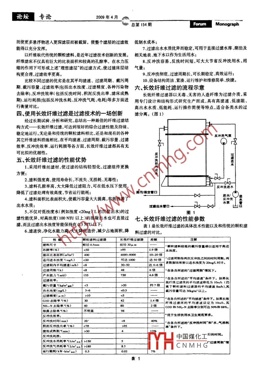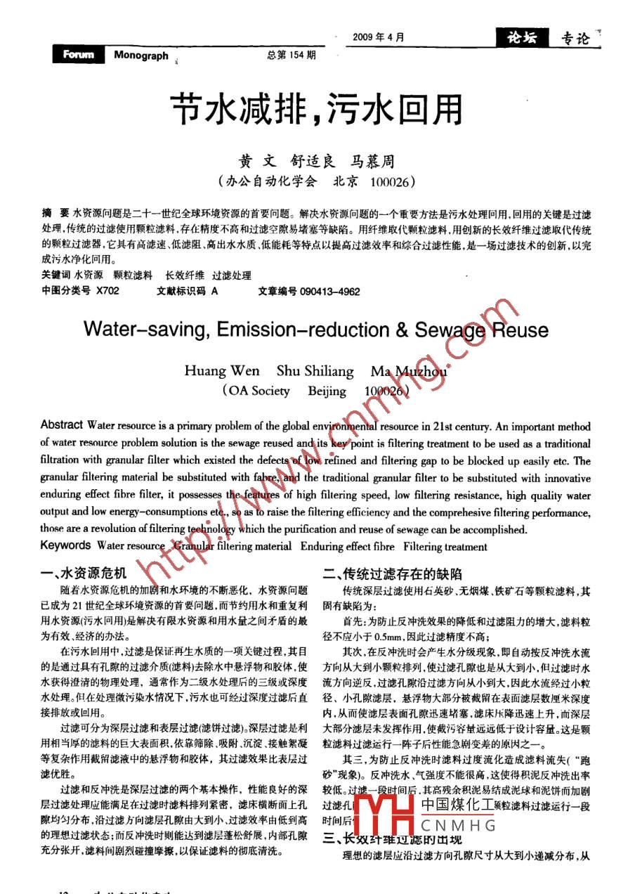 2009年4月論壇專論”Forwm Monograph總第154期節(jié)水減排,污水回用.黃文舒適良馬慕周(辦公自動化學(xué)會北京 100026)摘要水資源問題是二十一世紀(jì)全球環(huán)境資源的首要問題。解決水資源問題的一個重要方法是污水處理問用,回用的關(guān)鍵是過濾處理,傳統(tǒng)的過濾使用顆粒濾料,存在精度不高和過濾空隙易堵塞等缺陷。用纖維取代顆粒濾料,用創(chuàng)新的長效纖維過濾取代傳統(tǒng)的顆粒過濾器,它具有高濾速低濾阻.高出水水質(zhì)、低能耗等特點(diǎn)以提高過濾效率和綜合過濾性能,是-場過濾技術(shù)的創(chuàng)新,以完成污水凈化問用。關(guān)鍵詞水資源顆粒濾料長效纖維 過濾處理中圖分類號X702文獻(xiàn)標(biāo)識碼A文章編號090413- -4962Water- saving, Emission- reduction & Sewage ReuseHuang Wen Shu Shiliang Ma Muzhou(OA SocietyBeijing100026)Abstract W ater resource is a primary problem of the global environmental resource in 21st century. An important methodof water resource problem solution is the sewage reused and its key point is filtering treatment to be used as a traditionalfiltration with granular filter which existed the dects of low refined and filtering gap to be blocked up easily etc. Thegranular filtering material be substituted with fabre, and the traditional granular filter to be substituted with innovativeenduring effect fibre filter, it possesses the features of high filtering speed, low filtering resistance, high quality wateroutput and low energy- -consumptions etc, so as to raise the filtering fficiency and the comprehesive filtering performance,those are a revolution of filtering technology which the purification and reuse of sewage can be accomplished.Keywords W ater resource Granular filtering material Enduring effect fibre Filtering treatment-水資源危機(jī)二、傳統(tǒng)過濾存在的缺陷隨著水資源危機(jī)的加劇和水環(huán)境的不斷惡化,水資源問題傳統(tǒng)深層過濾使用石英砂、無煙煤、鐵礦石等顆粒濾料,其已成為21世紀(jì)全球環(huán)境資源的首要問題,而節(jié)約用水和重復(fù)利固有缺陷為:用水資源(污水回用)是解決有限水資源和用水量之間矛盾的最首先:為防止反沖洗效果的降低和過濾阻力的增大,濾料粒為有效、經(jīng)濟(jì)的辦法。徑不應(yīng)小于0.5mm,因此過濾精度不高;在污水回用中,過濾是保證再生水質(zhì)的- -項(xiàng)關(guān)鍵過程,其目其次,在反沖洗時會產(chǎn)生水分級現(xiàn)象,即自動按反沖洗水流的是通過具有孔隙的過濾介質(zhì)(濾料)去除水中懸浮物和膠體,使方向從大到小顆粒排列.使過濾孔腺也是從大到小,但過濾時水水獲得澄清的物理處理,通常作為二級水處理后的三級或深度流方向逆 反.過濾孔隙沿過濾方向從小到大.因此水流經(jīng)過小粒水處理。但在處理微污染水情況下,污水也可經(jīng)過深度過濾后直徑、 小孔隙濾層,懸浮物大部分被截留在表面濾層數(shù)厘米深度接排放或回用。內(nèi),從而使濾層表面孔隙迅速堵塞.濾床壓降迅速上升,而深層過濾可分為深層過濾和表層過濾(濾餅過濾)。深層過濾是利大部分濾層未發(fā)揮作用,使識污容量 遠(yuǎn)遠(yuǎn)低于設(shè)計容量。這是顆用相當(dāng)厚的濾料的巨大表面積,依靠篩除.吸附.沉淀、接觸絮凝粒濾料過濾運(yùn)行- -陣 子后性能急劇變差的原因之-。等復(fù)雜作用截留濾液中的懸浮物和膠體,其過濾效果比表層過其三,為防止反沖洗時濾料過度流化造成濾料流失(“跑濾優(yōu)勝。砂"現(xiàn)象)。反沖洗水、氣強(qiáng)度不能很高,這使得積泥反沖洗出率過濾和反沖洗是深層過濾的兩個基本操作,性能良好的深較低。 過濾一段時間后.其高殘余積泥易結(jié)成沈球和泥餅而加劇層過濾處理應(yīng)能滿足在過濾時濾料排列緊密,濾床橫斷面上孔過濾孔中國煤化工頓粒濾料過濾運(yùn)行一-段隙均勻分布,沿過濾向?yàn)V層孔隙由大到小過濾效率由低到高時間后YHCNMHG的理想過濾狀態(tài):而反沖洗時則能達(dá)到濾層蓬松舒展,內(nèi)部孔腺三、 長雙計班過濾的出現(xiàn)充分張開,濾料間劇烈碰撞摩擦,以保證濾料的徹底清洗。理想的濾層應(yīng)沿過濾方向孔隙尺寸從大到小遞減分布,從13方數(shù)徐 自動化雜志論壇專論2009年4月總第154期ForumMonograph而使更多懸浮物進(jìn)人更深濾層而被截留,使整個濾層的過濾效低制水成本;能得以充分發(fā)揮。7.過濾出水水質(zhì)優(yōu)異而穩(wěn)定,可用于直接過濾水庫、湖泊及以纖維取代傳統(tǒng)的顆粒濾料,是近年過濾技術(shù)創(chuàng)新的發(fā)展。相關(guān)地表 地下水以作為生活用水;纖維濾床不僅具有巨大的比表面積和較高的孔隙率,在水力壓8、反沖洗容易,反洗時間短,可大大節(jié)省反沖洗用水,用縮的作用下可形成上述“理想濾層”的過濾方式,使過濾床層結(jié)氣量;構(gòu)更合理,過濾效率更高。9、反沖洗徹底,過濾周期長,可長期穩(wěn)定、高效運(yùn)行;比較不同過濾的優(yōu)劣是在其平均濾速、過濾周期、截污周10、設(shè)備結(jié)構(gòu)簡潔.緊湊,運(yùn)行維護(hù)和維修簡單、快捷。期、截污容量、過濾效率(包括出水濁度、過濾精度、各種污染物六、 長效纖維過濾的流程示意去除率)、反沖洗效率(包括反洗時間、積泥反洗出率、濾床成熟長效纖維過濾器以無毒、無害的人造纖維為過濾介質(zhì),采期)、運(yùn)行耗損(包括反沖洗水耗反沖洗[耗電耗)等多方面進(