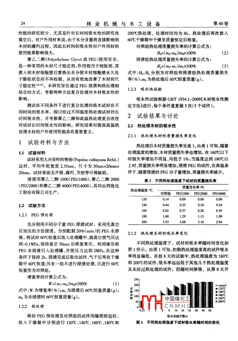 第40卷第2期林業(yè)機(jī)械與木工設(shè)備Vol 40 No.22012年2月FORESTRY MACHINERY & WOODWORKING EQUIPMENTFeb. 2012試驗(yàn)與研究聚乙二醇和高溫?zé)崽幚韽?fù)合改性對楊術(shù)吸水性的影響徐煒玥,朱愿,歐陽靚,曹金珍*(北京林業(yè)大學(xué)材料科學(xué)與技術(shù)學(xué)院,北京100083)摘要:木材易吸水、尺寸穩(wěn)定性差 等缺陷嚴(yán)重限制了其應(yīng)用,通過聚乙二醇浸漬、熱處理改性可以改善這些不足。通過采用3種不同分子量的聚乙二醇(PEG1000、PEG2000、PEG4000)對楊木進(jìn)行預(yù)處理,然后在不同溫度條件下( 120C、1409C、160C、180C、2009C)進(jìn)行熱處理,研究不同條件復(fù)合處理對楊木試材吸水性的影響。試驗(yàn)表明,熱處理可以改善試件初期的吸水性能,PEG浸漬處理則能抑制試件長期吸水,通過復(fù)合改性處理可以達(dá)到同時(shí)控制試件短期和長期水分吸收的目的。關(guān)鍵詞:熱處理;聚乙二醇;吸水性能中圖分類號:S781.43文獻(xiàn)標(biāo)識(shí)碼:A.‘文章編號 :2095- -2953(2012)02-0023- -04The Effect of Polyethylene Glycol( PEG ) and Compound Modification throughHigh Temperature Treatment on Water Absorption of PoplarXU Wei- yue, ZHU Yuan, OUYANG Liang,CAO Jin- azhen*(College of Material Science and Technology, Beijing Forestry University, Beijig 100083, China)Abstract: The high water absorption and poor dimension stability of wood limit its application strongly. Impregnated withpolyethylene glycol and modified by heat treatment, such insufficiencies can be improved. Poplar is pretreated withpolyethylene glycol with three diferent molecular weights(PEG1000, PEC2000 ,PEC4000), followed by the heat treatment atfive temperatures ( 120C , 1409, 1609C,1809C ,200C), to study the efect of the treatment under different compoundconditions on the water absorption of poplar test pieces. The experiment shows that heat treatment can improve the waterabsorption ability of poplar test pieces at the initial stage, and that PEG impregnation can inhibit the long -term waterabsorption of poplar test pieces. Through the compound modification treatment, the purpose of controlling short -term andlong-term water absorption at the same time can be achieved.Key words :heat treatment; polyethylene glycol(PEG ); water absorption木材是- -種天然高分子材料,具有強(qiáng)重比高、色澤天寸穩(wěn)定性,但會(huì)對環(huán)境產(chǎn)生不利影響;二是高溫?zé)崽幦缓鸵准庸さ忍匦?因此被廣泛應(yīng)用。但木材也存在易吸理,這種方法能有效降低木材吸濕性1I-3] ,提高其尺寸穩(wěn)水吸濕、尺寸穩(wěn)定性差及易被菌類和蟲蟻等侵害的缺陷。定性4+6和耐久性",不污染環(huán)境,廢棄后處理也方便,尤其是對戶外用材,提高其尺寸穩(wěn)定性可以延長使用壽是-項(xiàng)很有發(fā)展?jié)摿Φ哪静谋Wo(hù)技術(shù)。吸水性和吸濕性命、拓寬應(yīng)用范圍,所以需要對木材進(jìn)行改性處理。是兩個(gè)不同的概念,雖然高溫?zé)崽幚韺δ静奈鼭裥缘膫鹘y(tǒng)的改性處理方法有兩種,一是浸漬防腐劑樹影響已有定論,但對木材吸水性的影響至今仍有爭議。脂等物質(zhì),這種方法雖然能有效提高木材耐久性及尺有研究認(rèn)為VH]中國煤化 千木材吸水率14-0),但Kortelaine收稿日期:2011-10-17CN MH C進(jìn)行170-230C基金項(xiàng)目:國家林業(yè)局“948”項(xiàng)目(2011-4-05)熱處理后進(jìn)行的吸小任風(fēng)擔(dān)農(nóng)明,然處理后歐洲赤松*通訊作者:曹金珍,北京林業(yè)大學(xué)材料科學(xué)與技術(shù)學(xué)院心邊材吸水性增加,而挪威云杉吸水性則隨熱處理溫教授,博士生導(dǎo)師度的增加而減少。總體來說,國內(nèi)外對熱處理木材吸水24林業(yè)機(jī)械與木工設(shè)備第40卷性能的研究較少,尤其是針對長時(shí)間吸水性的研究尚200心C熱處理,處理時(shí)間均為4h。熱處理后再次放入屬空白。對戶外用材來說,由于水分含量將直接影響到60噸千燥箱中干燥至質(zhì)量恒定后稱重。木材的腐朽過程,因此長時(shí)間的吸水性對戶外用材的對照組熱處理質(zhì)量損失率的計(jì)算公式為:使用效果影響很大。Hg=(mr -mo)/mox100%(2)聚乙二醇(Polyethylene Clycol 或PEG)使用安全,浸漬組熱處理質(zhì)量損失率的計(jì)算公式為:是一種常用的木材尺寸穩(wěn)定劑,作用相當(dāng)于潤脹劑,其H,=(m- -m)/m,x100%滲人到木材細(xì)胞壁后置換出水分使木材細(xì)胞壁永久處式中:H、Hp分別為對照組和浸漬組熱處理質(zhì)量損失于膨脹狀態(tài)而不再收縮,從而有效地改善了木材的尺率(% );m2為熱處理后60C恒重質(zhì)量(g)。寸穩(wěn)定性(12-14)。本研究旨在通過PEG浸漬和熱處理相1.2.3吸水性試驗(yàn)結(jié)合的方式,考察兩種方法復(fù)合處理對木材吸水性的影響。吸水性試驗(yàn)根據(jù)GB/T 1934.1-2009《木材吸水性測測試在不同條件下進(jìn)行復(fù)合處理的楊木試材在不定方法》進(jìn)行,每個(gè)條件重復(fù)做5次(5個(gè)試件)。同時(shí)間的吸水率,探討經(jīng)過不同溫度熱處理試材的長2試驗(yàn)結(jié)果與討論時(shí)間吸水性,并考察聚乙二醇和高溫?zé)崽幚韽?fù)合改性對試材長時(shí)間吸水性的影響。研究結(jié)果對提高高溫?zé)?.1熱處理木材的吸水性處理木材的戶外使用性能具有重要意義。2.1.1熱處理木材的質(zhì)量損失率變化1試驗(yàn)材料與方法熱處理后木材質(zhì)量損失率見表1。由表1可知,隨著1.1試驗(yàn)材料處理溫度的增加,木材質(zhì)量損失率也增加。在1609以下試