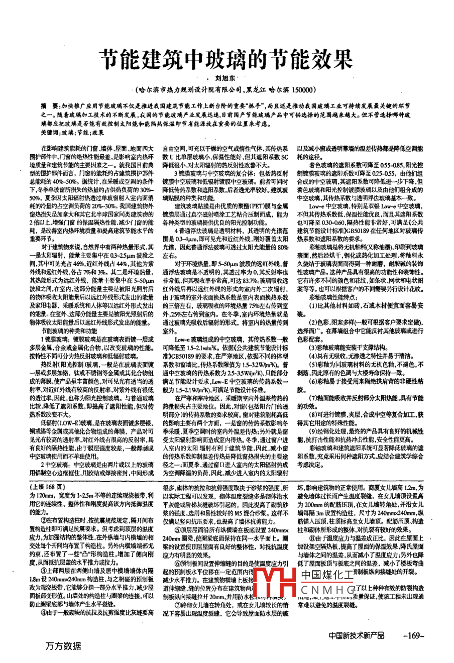 節(jié)能建筑中玻璃的節(jié)能效果劉旭東(哈爾濱市熱力規(guī)劃設(shè)計院有限公司,黑龍江哈爾濱150000擴要:加快推廣應(yīng)用節(jié)能玻璃不僅是推進我國建筑節(jié)能工作上新臺階的重要“抓手”,而且還是推動我國玻璃工業(yè)可持續(xù)發(fā)展最關(guān)鍵的環(huán)節(jié)之一。隨著玻璃加工技術(shù)的不斷發(fā)展,我國的節(jié)能攻璃產(chǎn)業(yè)發(fā)展迅連目前國產(chǎn)節(jié)能玻璃產(chǎn)品中可供選擇的范圍越來越大。但不管選擇哪種玻璃都應(yīng)把玻璃是否能有效控制太陽能和能隔熱保溫即節(jié)省能源放在重要的位置來考慮關(guān)鍵詞:玻璃;節(jié)能;效果在影響建筑能耗的門窗、墻體屋面地面四大自由空間可充以干燥的空氣或惰性氣體其傳熱系以及減小窗或透明幕墻的溫差傳熱都是降低空調(diào)能團護部件中門窗的絕熱性能最差,是影響室內(nèi)熱環(huán)數(shù)U比單層玻璃小保溫性能好但其遮陽系數(shù)SC耗的途徑。境質(zhì)量和建筑節(jié)能的主要因素之一。就我國目前典降低很小對太陽輻射的熱反射性改善不大著色玻璃的遮陽系數(shù)可降至055085,陽光控型的國護部件而言,門窗的能耗約占建筑圍護部件3鍍膜玻璃與中空玻璃的復合體:包括熱反射制黌膜玻璃的遮陽系數(shù)可降至025055,由他們組總能耗的40%-50‰。據(jù)統(tǒng)計在采暖或空調(diào)的條件鍵膜中空玻璃和低輻射鍍膜中空玻璃。前者可同時合成的中空玻璃其遮陽系數(shù)可降低進一步下降但下冬季單玻窗所損失的熱量約占供熱負荷的30%降低傳熱系數(shù)和遮陽系數(shù),后者透光率較好。建筑玻著色玻璃和陽光控制鍍膜玻璃以及由他們組合成的50%,夏季因太陽輻射熱透過單玻窗射入室內(nèi)而消璃貼膜的種類和功能中空玻璃,其傳熱系數(shù)與透明浮法玻璃基本一致。窗熱損失是加拿大和其它北半球國家冋類建筑物的鏡膜層通過真空磁射噴涂工藝粘合壓制而成,能為不但其傳熱系數(shù)低保溢性能優(yōu)良而且其2倍以上增強門窗的保溫隔熱性能減少門窗的能各種類型的玻璃提供優(yōu)良的陽光控制功能。也可降至030060,隔熱性能非常好,耗,是改善室內(nèi)熱環(huán)境質(zhì)量和提高建筑節(jié)能水平的4普通浮法玻璃是透明材料,其透明的光譜范建筑節(jié)能設(shè)計標準XB50189在任何地區(qū)對玻璃傳重要環(huán)節(jié)。圍是034um,即可見光和近紅外線,剛好覆蓋太陽熱系數(shù)和遮陽系數(shù)的要求對于建筑物來說,白然界中有兩種熱量形式其光譜,因此普通浮法玻璃可透過太陽光能量的80%釉玻璃是將無機和料又稱油墨),印刷到玻璃一是太陽輻射,能量主要集中在03-25μm波段之左右表面然后經(jīng)烘干,鋼化或熱化加工處理,將料永,其中可見光占46%,近紅外線占4%,其他為紫對于環(huán)境熱量,即550μm波段的遠紅外線普久燒結(jié)于玻璃表面而得到一種耐磨,耐酸堿的裝飾線和遠紅外線各占7%和3%。其二是環(huán)境熱量,通浮法玻璃是不透明的其透過率為0其反射率也性玻璃產(chǎn)品這種產(chǎn)品具有很高的功能性和裝飾性其熱能形式為遠紅外線,能量主要集中在5-50m非常低但其吸收率非常高可達837%玻璃吸收遠它有許多不同的顏色和花紋如條狀網(wǎng)狀和電狀圖波段之間在室內(nèi)這部分能量主要是被陽光照射后紅外線后再以遠紅外線的形式向室內(nèi)外二次輻射,案等等。也可以根據(jù)客戶的不同需要另行設(shè)計花紋的物體吸收太陽能景后以遠紅外線形式發(fā)出的能量由于玻璃的室外表面換熱系數(shù)是室內(nèi)表面換熱系數(shù)彩釉玻璃性能特點:及家用電器、采暖系統(tǒng)和人體等以遠紅外形式發(fā)出的三倍左右,玻璃吸收的環(huán)境熱量7%左右傳到室(1)比其他材料如磚石或木材便宜面容易安的能量在室外這部分能量主要是被陽光照射后的外,25%左右傳到室內(nèi)。在冬季室內(nèi)環(huán)境熱觸就是裝物體吸收太陽能量后以遠紅外線形式發(fā)出的能量。通過玻璃先吸收后輻射的形式,將室內(nèi)的熱量傳到(2)色彩圖案多樣(般可根據(jù)客戶要求定做選擇面廣。在幕墻組合中它能反襯其他玻璃或進行鍵脫玻璃:鍍膜玻璃是在玻璃表面鍵一層或owe玻璃組成的中空玻璃,其傳熱系數(shù)般色彩配套多層金屬合金或金屬化合物以改變玻璃的性能。可降低至1521wmK。依據(jù)《公共建筑節(jié)能設(shè)計標(3)彩釉玻璃能安裝于支撐結(jié)構(gòu)。按特性不同可分為熱反射玻璃和低輻射玻璃。準GB50189的要求在嚴寒地區(qū)依據(jù)不同的體型4)其有無吸收無滲透之特性并易于清潔。反射陽光控制)玻璃,一般足在玻璃表面鍵系數(shù)和窗墻比傳熱系數(shù)限值為15-32Wmk普5)彩釉為同玻璃材料的無機色釉不褪色不一層或多層如絡(luò),鈦或不銹鋼等金屬或其化合物組通中空玻璃的傳熱系數(shù)為2535WmK,只能部分鞲落因此原有的色調(diào)與大樓壽命保持致成的薄膜使產(chǎn)品呈豐富顏色對可見光有適當?shù)耐笣M足節(jié)能設(shè)計要求,Lw-E中空玻璃的傳熱系數(shù)一(6)彩釉易于接受用來隔絕拱肩背的非硬性粘射率對近紅外線有較高的反射率對紫外線有很低般為15-21Wm0,可滿足節(jié)能設(shè)計標準。的透過率因此也稱為陽光控制玻璃。與普通玻璃在嚴寒和寒冷地區(qū),采暖期室內(nèi)外溫差傳熱的(7)面能吸收并反