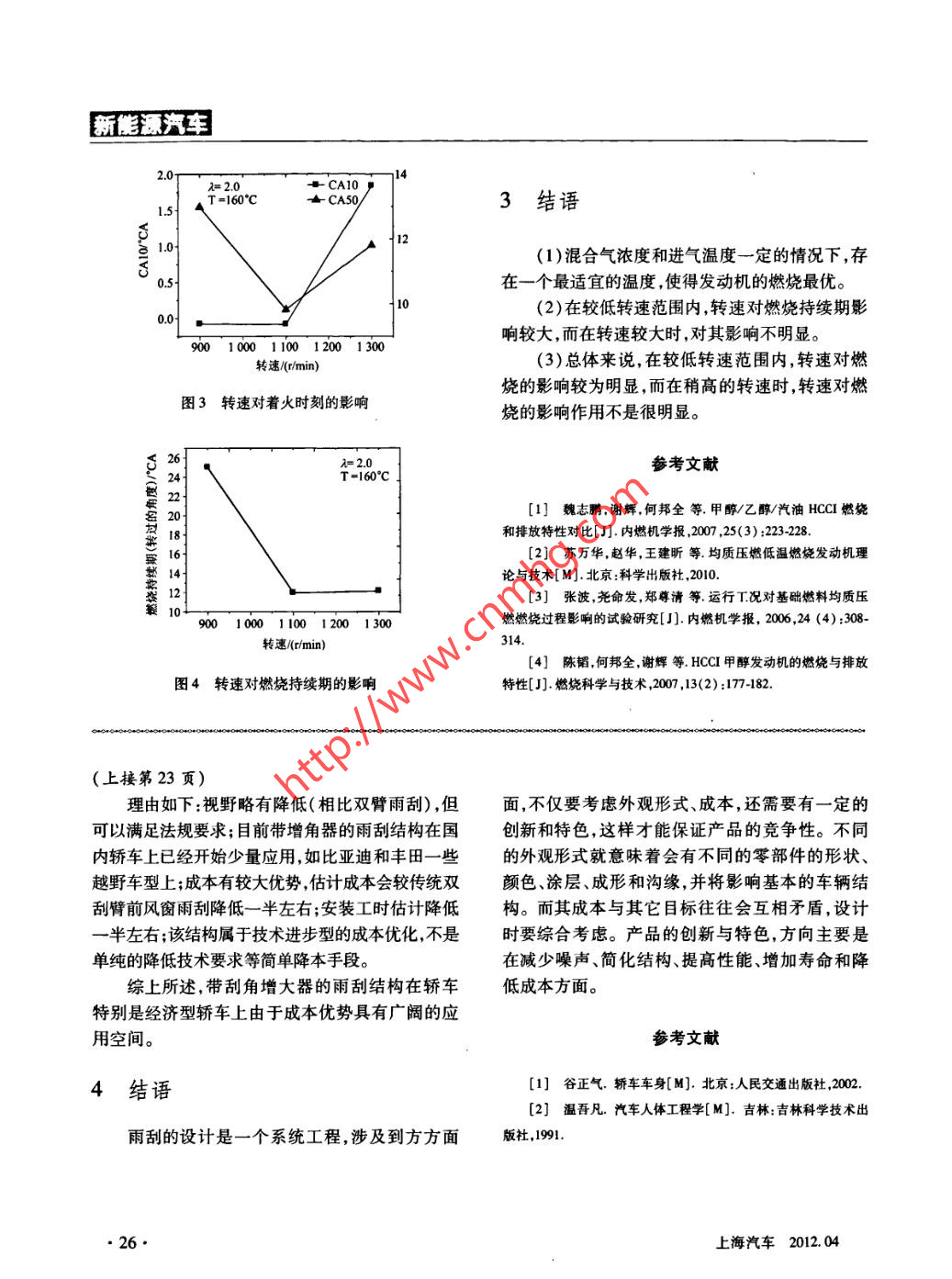 新能源汽車轉速對甲醇HCCI燃燒特性的影響試驗研究薛樂(長安大學汽車學院,西安 710064)[摘要]在一臺雙缸4沖程柴油機上實現(xiàn)了甲醇均質壓燃的試驗,分析了發(fā)動機轉速對甲醇均質壓燃燃燒特性的影響。試驗結果表明:過量空氣系數(shù)和進氣溫度- -定的情況下 ,隨著發(fā)動機轉速在一定 范圍內的升高,缸內壓力、壓力升高率和放熱率均有所升高,且存在-個最佳的轉速,使得壓力、壓力升高率和放熱率處在較好的水平。[ Abstract] An experiment of HCCI combustion characteristics fueled with methanol is done ona double-cylinder, four strokes diesel engine. The influence of engine speed on combustion character-istic of HCCI combustion is analyzed. Results indicate: when excessive air coefficient and intake tem-perature are constant, cylinder pressure, pressure increase rate and heat release rate are raised withthe increase of engine speed within limits, and there is an optimal engine speed which can make thecylinder pressure, pressure increase rate and heat release rate at an optimal level.[關鍵詞]均質壓燃 甲醇燃燒特性柴油機doi:10. 3969/j. issn. 1007 -4554. 2012. 04. 060引言1試驗儀器和設備在能源危機和排放法規(guī)8益嚴峻的今天,節(jié)試驗中所使用的發(fā)動機為CT2100Q,雙缸自能減排的巨大壓力使得內燃機研究人員不斷尋找然吸氣4沖程柴油機,具體參數(shù)如表1所示。新的燃燒方式,而醇類燃料的均質壓燃就是一-種.表1發(fā)動機具體參數(shù)很有希望的新型燃燒方式"。均質壓燃是- -種均項目參數(shù)質混合氣通過壓縮方式實現(xiàn)著火的燃燒方式,它燃燒室形狀可以使碳煙和NOx的排放降到很低的水平。缸內缸徑x活塞行程/mm100x 105的混合氣幾乎同時開始著火,沒有明顯的火焰?zhèn)髋帕?mL1 650壓縮比17: I播,燃燒持續(xù)期較短,放熱較為集中,很大程度上額定功率/相應轉速_25kW/2 600 (r/min)提高了熱效率[2]。影響均質壓燃的因素有很多,最大扭矩/相應轉速110N.m/2 000 (x/ min)進氣門開啟角/°CA17 BTDC例如:進氣溫度、過量空氣系數(shù)、配氣相位、發(fā)動機進氣門關閉角/CA43 ABDC轉速和壓縮比等。這里主要討論發(fā)動機轉速對其排氣門開啟角/9CA47 BBDC燃燒性能的影響。.排氣門關閉角/°CA17 ABDC收稿日期: 2012 -02 -06●24.上海汽車2012. 04.新能源汽車為了能在此發(fā)動機上很好地實現(xiàn)均質壓燃模2.0fr=1100/mins =l 300r/min式將發(fā)動機的兩個氣缸其中-個用作HCCI試驗氣缸,另外-一個則供給普通柴油,兩者的進氣系」n-900r/minT-160^c1.5。5統(tǒng)、供油系統(tǒng)和排氣系統(tǒng)分別是獨立的,在需要時切換到HCCI模式下運行,從而有效地實現(xiàn)了甲醇.r=1 3007/mo.5在HCCI模式的運行。試驗中使用的主要儀器如,k向100/mj\1m-900 /min0.0出表2所示。-20-1001020304050表2試驗中使用的主要儀器曲軸轉角/°CA項目儀器名稱型號生產(chǎn)廠家81 轉速對缸壓和壓力升高率的影響一1燃燒分析儀CB566日本小野公司2電渦流測功機FST2C(CW25)|奧地利 AVL公司]3003壓電式壓力傳感器6052AKistler250| T =160°C電荷放大器5019B千20同100 /min/nr1 300 r/min在試驗中,壓電式壓力傳感器安裝在HCCI試n=900 r/min100驗氣缸上,燃燒分析儀記錄每個工況下60個循環(huán)50一的缸內壓力數(shù)據(jù),從而求得壓力的平均值,這樣通過放熱規(guī)律即可求出壓力升高率、累積放熱率等-20-100102030405060參數(shù)值。圖2轉速對放熱率的影響2試驗結果分析90%時所對應的曲軸轉角記為CA10、CA50、2.1轉速對缸壓和壓力升高 率的影響CA90,用它們分別表示著火時刻、燃燒中點和燃燒在試驗中,過量空氣系數(shù)和近期溫度確定不結束的時刻,所以CA10和CA90之間所對應的曲變。圖1和圖2分別顯示了轉速對缸壓、壓力升軸轉角則表示燃燒持續(xù)期。高率以及放熱率的影響情況。在圖1中,明顯可如圖3和圖4所示,分別為轉速對著火時刻和以看出,隨著轉速升高,缸壓和壓力升高率的峰值燃燒持續(xù)期的影響曲線。圖3中,隨著轉速的升高,都有明顯的增加,但轉速從1 000 r/min 上升到著火時刻明顯推遲,這是因為廢氣對混合氣的稀釋1300r/min時,缸壓卻出現(xiàn)了稍有下降的趨勢。作用明顯要強于對其加熱作用,從而使得著火有所原因是隨著轉速的進--步升高,發(fā)動機每循環(huán)所推遲,同時可以看出,在轉速為1100r/min時的燃用的時間減少,排氣行程所用時間變短,從而缸內燒速度最快,混合氣燃燒相對比較集中,熱效率較的殘余廢氣率相對增加,殘余廢氣對下一循環(huán)的高。轉速再增加,只會使得燃燒整個推后。如圖4混合氣有著加熱和稀釋的雙重作用,轉速越高時,所示,燃燒持續(xù)期隨著轉速的上升而減小,但可以稀釋作用會變得更加明顯,并且此時發(fā)動機的熱.看出,轉速進--步升高,燃燒持續(xù)期基本保持不變負荷增加13.4 ,因此最高的壓力、壓力升高率稍有甚至燃燒持續(xù)期出現(xiàn)微弱增加的趨勢,這是因為下降,而且相對應的峰值出現(xiàn)時刻也有所滯后。此時轉速已不是影響燃燒的主要因素,混合氣在2.2轉速對燃燒情況的影響1100r/min的轉速下燃燒最好,提高轉速不能對-般將燃料的累積放熱率為10%、50%和燃燒持續(xù)期造成明顯的影響。上海汽車2012. 04●25●.新修源汽車.0T+CA10 )14T =160°C▲CA50/3結語.5+12(1)混合氣濃度和進氣溫度-定的情況下,存在一個最適宜的溫度,使得發(fā)動機的燃燒最優(yōu)。+1(2)在較低轉速范圍內,轉速對燃燒持續(xù)期影.0|響較大,而在轉速