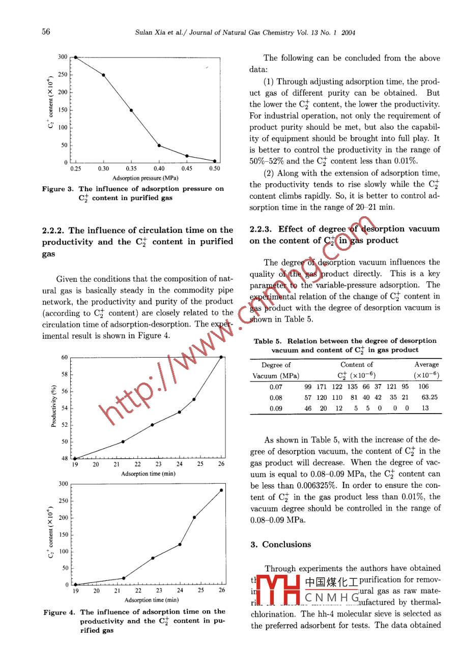 Jounlo NaturalCao CheityJournal of Natural Gas Chemistry 13(2004)53 -57SCIENCE PRESSStudy on Pressure Swing Adsorption Removing C2 from NaturalGas as Raw Material for Thermal ChlorinationSulan Xial*,Jiahua Zhu',Xiaobin Zeng2,Zhaohua Feng',Xinyu Cheng21. School of Chemical Engineering, Sichruan University, Chengdu 610065, China2. Honghe Chemical INC, Zigong 643000, China(Manuscript received October 02, 2003; revised December 22, 2003]Abstract: The experimental investigation dermonstrates that a satisfactory result can be expected forpressure swing adsorption (PSA) purification of natural gas as raw material for thermal chlorinationprocess. Using hh-4 molecular sieve as adsorbent for removing C2 components, the suitable adsorptionpressure is 0.4-0.45 MPa, desorption vacuum is 0.08- 0.09 MPa and circulation time is 20- 21 min.Key words: chloride methane, natural gas purification, pressure swing adsorption1. Introductionrination reaction will be influenced, ie. there will bemore perchlorides produced. In addition, the qual-Chloride methane (adbreviated as CMS) is theity of trichloro methane product will also be seriouslygeneral designation of monochloro, dichloro, trichloroinfluenced. The separating efficiency of the productand tetrachloro methanes. They all have impor-will be reduced and the dichloro methane in the prod-tant industrial application. Monochloro methane anduct due to side reaction will exceed the specified limit.trichloro methane are raw materials for organic siliconIn the natural gas provided in the Sichuan area, theand organic fluorin respectively. Dichloro methane iscontent of ethane and other C2 components is aboutan excellent organic solvent. And tetrachloro methane1% (V%). It can only be used as the raw material foris now largely used in the production of refrigerantproducing chloride methane when the C7 content isand fire-extinguishing agent.made less than 0.01% through purification.Concerning the production method of chlorideAccording to the principle of PSA purificationmethane, it can be divided into methanol method andof gaseous mixture, the different adsorbates will bemethane method according to the route of raw mate-separated by selective adsorption, mainly due to therial. And it can be divided into thermal-chlorinationdifferences in the adsorbing capacity of the adsorbatemethod, photo-chlorination method and catalytic-along with the change of pressure. Under high pres-chlorination method according to the way of chlori-sure, the impurity components containing C2 will benation. In China, the thermal-chlorination methodadsorbed when the natural gas is flowing through theis mainly adopted. Using natural gas and chlorine aspacked bed of adsorbent. Thus the purified naturalraw materials, the displacement reaction is conductedgas will be discharged from the outlet of adsorptionin a temperature range of 420 -440 °C, and the fourower.中國煤化工rbed impurity willchlorides are produced simultaneously [1]. Experiencebe remHCN M H Gegerate the ed-in the production indicates that if the C$ content insorbing capauioy.1 ie 1alll pal uuueters determiningthe natural gas raw material exceeds 0.01%, the chlo-the performances of the whole circulation operation* Corresponding author. E-mail: jhzhu@scu.edu.cn54Sulan Xia et al./ Journal of Natural Gas Chemistry Vol. 13 No. 1 2004process are: adsorbent capability, the cycle of oper-strength and flow resistance in packed bed, the com-ation pressure and the circulation time of adsorptionposition and volume quantity of desorption gas alongand desorption [2].with the change of desorption vacuum are particularlytested. The desorption volumes of methane and C22. Selection of adsorbent and PSA operationas well as separation coefficients (the ratio betweencondition for removing ethane and other C2the desorption volume of C2 and CH4) of four ad-components from natural gassorbents at different conditions of desorption vacuumare listed in Table 3.2.1. Determination of adsorbentTable 1 and Table 2 respectively give the typ-Table 3. The desorption volumes of methane and C士as well as separation coefficientsical composition of raw material natural gas andof four adsorbentsthe current purification requirement in the thermal-VacuumDesorption volume (ml/g)chlorination method for producing chloride methane.Adsorbent(MPa) CH4 C咕 Separation coefficientsTable 1. The composition of raw material natural gas0.05.2 101.9ComponentComposition (%)0.07.4 17.02.3CH495.570.0910.349.54.8CO22.02hh-26.2 10.51.7C2H60.808.2 20.12.5C3H80.1817.347.12.He0.005hh-35.6 18.03.20.0079.0 23.32.6N1.3413.9 46.53.4Ct0.078hh-4.6.3 21.03.3p=0.5 MPa10.0 26.00.09 15.9 53.2Table 2. The composition of product gas anddesorption gas to meet the demand forthe thermal chlorinationThe following conclusions can be drawn from theComposition inabove experimental data:product gas (%)desorption gas (%)(1) With the increase of desorption vacuum the92.792.5desorption volumes of the four adsorbents all increase.咕0.012.98When the increase of desorption vacuum is from 0.050.76MPa to 0.07 MPa, the increase of desorption volumeof Cz is comparatively small; while the increase ofN27.11.77desorption vacuum is from 0.07 MPa to 0.09 MPa,He,Ar0.17the increase of desorption volume of C2 increases byH2Oabout 2.2 times as much on an average.H2S<50 mg/m3(2) Among the above-mentioned four adsorbents,hh-4 has the largest desorption volume of C2, indi-The selection of adsorbent is vially important forcating its largest adsorbing capacity of C去.the purification task. In industry, the adsorbents used(3) Desorption vacuum is in direct proportion toin PSA for removing C2 from natural gas are mainlydesorption volume. Too low a vacuum is unfavor-activated carbon, molecular sieve, alumina and silica中國煤化工e is a sudden changegel. According to the characteristics of purifying C2ent for the four adsor-from natural gas, four different types of molecularMHc N M H Gracum should not besieve are chosen to examine 