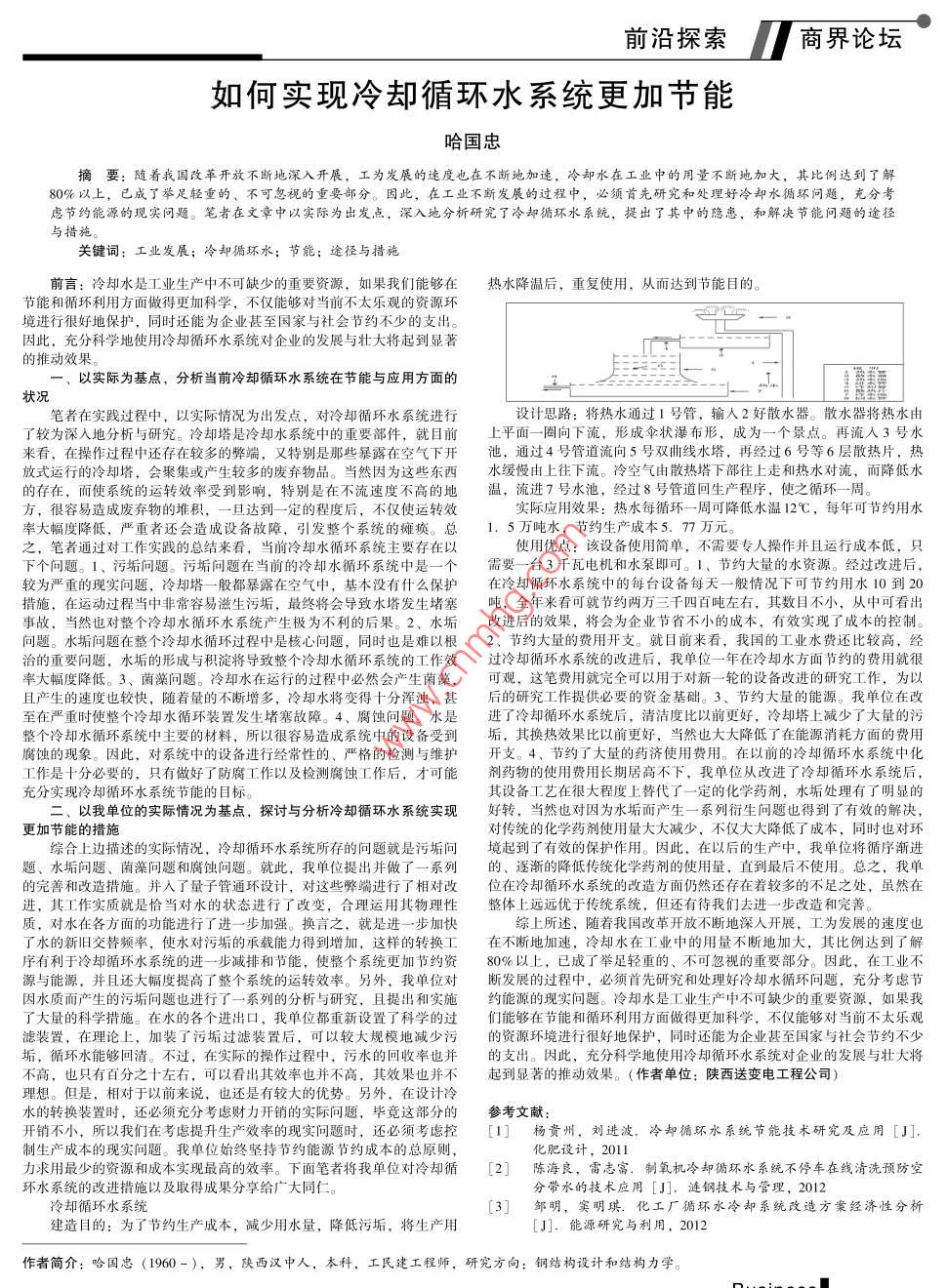 前沿探索商界論壇如何實現冷卻循環(huán)水系統(tǒng)更加節(jié)能哈國忠隨著我國改革開放不斷地深入開展,工為發(fā)展的速度也在不斷地加速,冷卻水在工業(yè)中的用量不斷地加大,其比例達到了解80%以上,已成了舉足輕重的、不可忽視的重要部分。因此,在工業(yè)不斷發(fā)展的過程中,必須首先研究和處理妤冷卻水循環(huán)問題,充分考慮節(jié)約能源的現實問題。筆者在文章中以實際為出發(fā)點,深入地分析研究了冷卻循環(huán)水系統(tǒng),提出了其中的隱患,和解決節(jié)能問題的途徑與措施。關鍵詞:工業(yè)發(fā)展;冷卻循環(huán)水;節(jié)能;途徑與措施前言:冷卻水是工業(yè)生產中不可缺少的重要資源,如果我們能夠在熱水降溫后,重復使用,從而達到節(jié)能目的節(jié)能和循環(huán)利用方面做得更加科學,不僅能夠對當前不太樂觀的資源環(huán)境進行很好地保護,同時還能為企業(yè)甚至國家與社會節(jié)約不少的支出因此,充分科學地使用冷卻循環(huán)水系統(tǒng)對企業(yè)的發(fā)展與壯大將起到顯著的推動效果。以實際為基點,分析當前冷卻循環(huán)水系統(tǒng)在節(jié)能與應用方面的狀況筆者在實踐過程中,以實際情況為出發(fā)點,對冷卻循環(huán)水系統(tǒng)進行設計思路:將熱水通過1號管,輸入2好散水器。散水器將熱水由了較為深入地分析與研究。冷卻塔是冷卻水系統(tǒng)中的重要部件,就目前上平面一圈向下流,形成傘狀瀑布形,成為一個景點。再流入3號水來看,在操作過程中還存在較多的弊端,又特別是那些暴露在空氣下開池,通過4號管道流向5號雙曲線水塔,再經過6號等6層散熱片,熱放式運行的冷卻塔,會聚集或產生較多的廢棄物品。當然因為這些東西水緩慢由上往下流。冷空氣由散熱塔下部往上走和熱水對流,而降低水的存在,而使系統(tǒng)的運轉效率受到影響,特別是在不流速度不高的地溫,流進7號水池,經過8號管道回生產程序,使之循環(huán)一周方,很容易造成廢棄物的堆積,一旦達到一定的程度后,不僅使運轉效實際應用效果:熱水每循環(huán)一周可降低水溫12℃,每年可節(jié)約用水率大幅度降低,嚴重者還會造成設備故障,引發(fā)整個系統(tǒng)的癱瘓???.5萬噸水,節(jié)約生產成本5.77萬元之,筆者通過對工作實踐的總結來看,當前冷卻水循環(huán)系統(tǒng)主要存在以使用優(yōu)點:該設備使用簡單,不需要專人操作并且運行成本低,只下個問題。1、污垢問題。污垢問題在當前的冷卻水循環(huán)系統(tǒng)中是一個需要一臺3千瓦電機和水泵即可。1、節(jié)約大量的水資源。經過改進后較為嚴重的現實問題,冷卻塔一般都暴露在空氣中,基本沒有什么保護在冷卻循環(huán)水系統(tǒng)中的每臺設備每天一般情況下可節(jié)約用水10到20措施,在運動過程當中非常容易滋生污垢,最終將會導致水塔發(fā)生堵塞噸,全年來看可就節(jié)約兩萬三千四百噸左右,其數目不小,從中可看出事故,當然也對整個冷卻水循環(huán)水系統(tǒng)產生極為不利的后果。2、水垢改進后的效果,將會為企業(yè)節(jié)省不小的成本,有效實現了成本的控制可題。水垢問題在整個冷卻水循環(huán)過程中是核心問題,同時也是難以根2、節(jié)約大量的費用開支。就目前來看,我國的工業(yè)水費還比較高,經治的重要間題,水垢的形成與積淀將導致整個冷卻水循環(huán)系統(tǒng)的工作效過冷卻循環(huán)水系統(tǒng)的改進后,我單位一年在冷卻水方面節(jié)約的費用就很率大幅度降低。3、菌藻問題。冷卻水在運行的過程中必然會產生菌藻,可觀,這筆費用就完全可以用于對新一輪的設備改進的研究工作,為以且產生的速度也較快,隨著量的不斷增多,冷卻水將變得十分渾濁,甚后的研究工作提供必要的資金基礎。3、節(jié)約大量的能源。我單位在改至在嚴重時使整個冷卻水循環(huán)裝置發(fā)生堵寨故障。4、腐蝕問題。水是進了冷卻循環(huán)水系統(tǒng)后,清潔度比以前更好,冷卻塔上減少了大量的污整個冷卻水循環(huán)系統(tǒng)中主要的材料,所以很容易造成系統(tǒng)中的設備受到垢,其換熱效果比以前更好,當然也大大降低了在能源消耗方面的費用腐蝕的現象。因此,對系統(tǒng)中的設備進行經常性的、嚴格的檢測與維護開支。4、節(jié)約了大量的藥濟使用費用。在以前的冷卻循環(huán)水系統(tǒng)中化作是十分必要的,只有做好了防腐工作以及檢測腐蝕工作后,才可能劑藥物的使用費用長期居高不下,我單位從改進了冷卻循環(huán)水系統(tǒng)后充分實現冷卻循環(huán)水系統(tǒng)節(jié)能的目標。其設備工藝在很大程度上替代了一定的化學藥劑,水垢處理有了明顯的二、以我單位的實際情況為基點,探討與分析冷卻循環(huán)水系統(tǒng)實現好轉,當然也對因為水垢而產生一系列衍生問題也得到了有效的解決更加節(jié)能的措施對傳統(tǒng)的化學藥劑使用量大大減少,不僅大大降低了成本,同時也對環(huán)綜合上邊描述的實際情況,冷卻循環(huán)水系統(tǒng)所存的問題就是污垢問境起到了有效的保護作用。因此,在以后的生產中,我單位將循序漸進題、水垢問題、菌藻問題和腐蝕問題。就此,我單位提出并做了一系列的、逐漸的降低傳統(tǒng)化學藥劑的使用量,直到最后不使用。總之,我單的完善和改造措施。并入了量