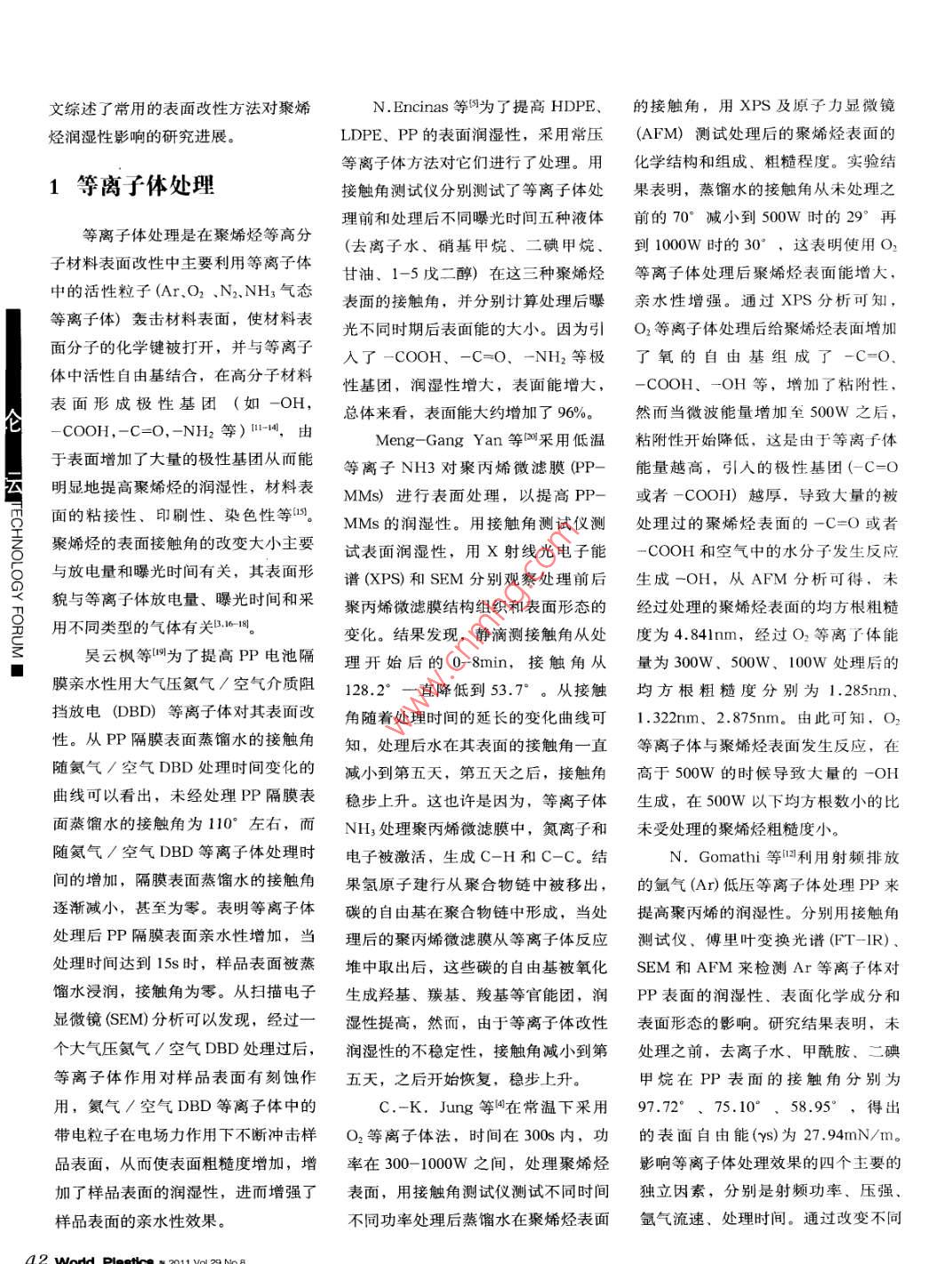 文綜述了常用的表面改性方法對聚烯N. Encinas等5為了提高HDPE、的接觸角,用XPS及原子力顯微鏡烴潤濕性影響的研究進展。LDPE、PP的表面潤濕性,采用常壓(AFM)測試處理后的聚烯烴表面的等離子體方法對它們進行了處理。用化學結構和組成、粗糙程度。實驗結1等離子體處理接觸角測試儀分別測試了等離子體處果表明,蒸餾水的接觸角從未處理之理前和處理后不同曝光時間五種液體前的70°減小到500W時的29°再等離子體處理是在聚烯烴等高分(去離子水、硝基甲烷、二碘甲烷、到1000W時的30°,這表明使用O2子材料表面改性中主要利用等離子體甘油、1-5戊二醇)在這三種聚烯烴等離子體處理后聚烯烴表面能增大,中的活性粒子(Ar.O2、N2.NH; 氣態(tài)表面的接觸角,并分別計算處理后曝親水性增強。通過XPS分析可知,等離子體)轟擊材料表面,使材料表光不同時期后表面能的大小。因為引O2等離子體處理后給聚烯烴表面增加面分子的化學鍵被打開,并與等離子入了-COOH、-C=0、-NH2 等極了氧的自由基組成了-C=0.體中活性自由基結合,在高分子材料性基團,潤濕性增大,表面能增大,-COOH、-OH等,增加了粘附性,表面形成極性基團(如-OH,侖- COOH,-C=O,-NH2等)1-1,由總體來看,表面能大約增加了96%。然而當微波能量增加全500W之后,Meng- Gang Yan 等叫采用低溫粘附性開始降低,這是由于等離子體于表面增加了大量的極性基團從而能等離子NH3對聚丙烯微濾膜(PP-能量越高,引人的極性基團(-C=O云明顯地提高聚烯烴的潤濕性,材料表MMs)進行表面處理,以提高PP-或者 - COOH)越厚,導致大量的被面的粘接性、印刷性、染色性等[5。MMs的潤濕性。用接觸角測試儀測.處理過的聚烯烴表面的-C=O或者.聚烯烴的表面接觸角的改變大小主要試表面潤濕性,用X射線光電子能-COOH和空氣中的水分子發(fā)生反應雖與放電量和曝光時間有關,其表面形譜(XPS)和SEM分別觀察處理前后生成-OH,從AFM分析可得,未貌與等離子體放電量、曝光時間和采聚丙烯微濾膜結構組織和表面形態(tài)的經(jīng)過處理的聚烯烴表面的均方根粗糙用不同類型的氣體有關B.1-1日。變化。結果發(fā)現(xiàn),靜滴測接觸角從處度為4.841nm,經(jīng)過O2等離子體能ξ吳云楓等網(wǎng)為了提高PP電池隔理開始后的0-8min,接觸角從量為300W、500W、100W 處理后的膜親水性用大氣壓氦氣/空氣介質(zhì)阻128.2° -直降低到53.7°。從接觸均方根粗糙度分別為1.285nm.擋放電(DBD) 等離子體對其表面改角隨著處理時間的延長的變化曲線可1.322nm、2.875nm。由此可知,O2性。從PP隔膜表面蒸餾水的接觸角知,處理后水在其表面的接觸角一直等離子體與聚烯烴表面發(fā)生反應,在隨氦氣/空氣DBD處理時間變化的減小到第五天,第五天之后,接觸角高于 500W的時候?qū)е麓罅康?OH曲線可以看出,未經(jīng)處理PP隔膜表穩(wěn)步上升。這也許是因為,等離子體生成, 在500W以下均方根數(shù)小的比面蒸餾水的接觸角為110°左右,而NH3處理聚丙烯微濾膜中,氮離子和未受處理的聚烯烴粗糙度小。隨氦氣/空氣DBD等離子體處理時電子被激活,生成C-H和C-C。結N.Gomathi等2利用射頻排放間的增加,隔膜表面蒸餾水的接觸角果氫原子建行從聚合物鏈中被移出,的氬氣(Ar)低壓等離子體處理PP來逐漸減小,甚至為零。表明等離子體碳的自由基在聚合物鏈中形成,當處.提高聚丙烯的潤濕性。分別用接觸角處理后PP隔膜表面親水性增加,當理后的聚丙烯微濾膜從等離子體反應測試儀、傅里葉變換光譜(FT-IR) .處理時間達到1Ss時,樣品表面被蒸堆中取出后,這些碳的自由基被氧化SEM和AFM來檢測Ar等離子體對餾水浸潤,接觸角為零。從掃描電子生成羥基、羰基、羧基等官能團,潤PP表面的潤濕性、表面化學成分和顯微鏡(SEM)分析可以發(fā)現(xiàn),經(jīng)過一濕性提高,然而,由于等離子體改性表面形 態(tài)的影響。研究結果表明,未個大氣壓氦氣/空氣DBD處理過后,潤濕性的不穩(wěn)定性,接觸角減小到第處理之前,去離子水、甲酰胺、二碘等離子體作用對樣品表面有刻蝕作五天,之后開始恢復,穩(wěn)步上升。甲烷在PP表面的接觸角分別為用,氦氣/空氣DBD等離子體中的C.-K.Jung等I在常溫下采用97.72°、 75.10° 、 58.95° ,得出帶電粒子在電場力作用下不斷沖擊樣O2等離子體法,時間在300s內(nèi),功的表面自由能(ys)為27. 94mN/m。品表面,從而使表面粗糙度增加,增率在300- -1000W之間,處理聚烯烴影響等離子體處理效果的四個主要的加了樣品表面的潤濕性,進而增強了表面, 用接觸角測試儀測試不同時間獨 立因素,分別是射頻功率、壓強、樣品表面的親水性效果。不同功率處理后蒸餾水在聚烯烴表面氬氣流速、處理時間。通過改變不同42 Word Plestics % 2011 Vol .29 N.8的變量進行實驗,最終得到對潤濕性乙二醇的接觸角從80.5° 減小到16° 。結果表明,這些薄膜的表面的最佳處理效果的一-組條件是射頻功率80.1°極性分量和總表面能增加。光極性隨著功能化聚合物的增加而增為155W,壓強為20.8Pa,Ar 流速接枝后,CPP薄膜表面產(chǎn)生了大量的加。薄膜表面極性的增加減小了液體為16sccm,處理時間為8min。自由基,引人了一些極性基團如在薄膜表面的接觸角,從而增大了薄2表面接枝-COOH等,使得材料表面的極性增膜表面的潤濕性。加,材料表面的浸潤性增加,接觸角2.3化學引發(fā)接枝接枝改性是指將具有各種功能的極性單體接枝到聚烯烴主鏈上的一種明顯減小,