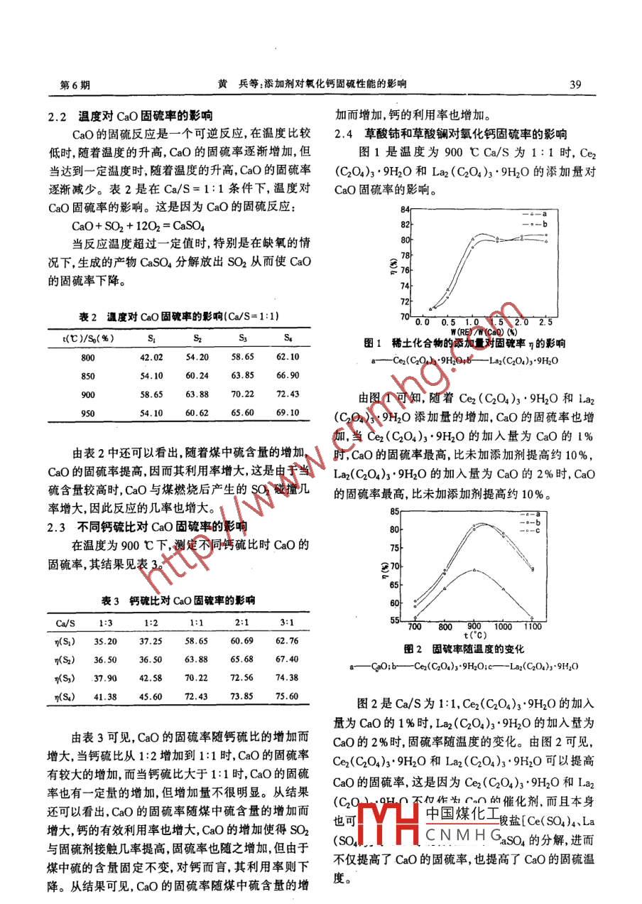 第22卷第6期有色礦冶Vol. 22. No62006年12月NON - FERROUS MINING AND METALLURGYDecember 2006文章編號: 1007 - 967X(2006)06 - 0038 - 03添加劑對氧化鈣固硫性能的影響黃兵1,2,牛 剛了,邵忠寶,楊 雪',矯立男1(1東北大學理學院,遼寧沈陽1000;2沈陽市第三十八中學,遼寧沈陽10001;3長春工程學院,長春130012)摘要:研究了掭 加劑對氧化鈣在煤燃燒過程中固硫性能的影響。討論了燃煤硫的含量、溫度、鈣'硫比、添加草酸鈰和草酸鑭對氧化鈣固硫性能的影響。實驗結果表明:隨蓍煤中硫含量的增加,氧化鈣的固硫率增大;氧化鈣的固硫率在最佳固硫溫度以下隨溫度升高而增大,超過最佳固硫溫度則隨溫度升高而下降;氧化鈣的最佳固硫溫度約900C;鈣硫比大于1:1時固硫效果比較好,最大固硫率可達約72%;草酸鈰和草酸鑭的掭加,更有效地提高了氧化鈣的利用率,可提高氧化鈣的固硫率約10%,且使固硫溫度提高約100 C。關鍵詞:氧化鈣;草酸鈰;草酸鑭;固硫率;鈣硫比中圖分類號:TF111.145文獻標識碼:A的用量對CaO固硫性能的影響。0前言我國是以煤為主要能源,在一次能源中煤占1實驗75%左右,有關SO2來源的分類研究表明,我國大1.1 儀器及藥品氣中的sO2主要是煤炭燃燒產生的,約占總排量的電子天平,感量為0.0001 g; 馬弗爐;氧化鈣94%左右。SO2和酸雨污染是我國大氣污染的主要(CaO,分析純);草酸鈰[Ce2(C204)s●9H2O,分析問題,是可能制約我國經濟可持續(xù)發(fā)展的重要環(huán)境純];草酸鑭[ La2(C2O4)3.9H2O,分析純]。因素。所以,發(fā)展燃煤鍋爐的脫硫技術,削減其SO21.2 實驗方法排放量已成為一項刻不容緩的任務。科技工作者在選用4種不同質量分數硫的煤,用艾士卡法測這方面已進行了大量的研究工作[1-8]。根據脫硫定煤中的硫質量分數,測量結果列于表1。以分析技術的實施階段,基本可分為三大類:即燃燒前脫純的CaO為基,添加不同比例的草酸鈰和草酸鑭,硫[9]、燃燒中脫硫(1,2和燃燒后的煙氣脫硫[10]。燃將CaO基的固硫劑以不同的鈣硫比加入煤粉里混燒前脫硫因脫除效率較低,難以滿足環(huán)保要求;煙氣合均勻后放入剛玉坩堝中,在馬弗爐中煅燒,升溫速脫硫技術發(fā)展與應用已較為成熟,但其昂貴的設備率為5C/min,保溫30min,用硫酸鋇質量法測定投資和運行費用極大地限制了它的廣泛應用11];燃燃燒后煤質中的全硫含量,按下式計算固硫率:燒中脫(固)硫技術是在媒中添加一-定 的固硫劑使煤η= S:/So 100%在燃燒或氣化時生成的氣態(tài)硫化物在爐內吸收,或式中:p一固硫率;S 燒結 后煤灰中的全氣相中殘存的硫化物與剛進入爐內的脫硫劑接觸而硫含量;So一-煤中的全硫含 量。被吸收,從而使排出氣體中SO2含量降低,其具有2結果與討論設備操作簡單,占用空間小,投資少等優(yōu)勢,適合于對現(xiàn)行鍋爐進行改進及含中、低硫的燃煤;它存在的2.1四種煤質的全硫含量一個很大的缺陷便是脫硫效果較差。CaO 價格便表1示出了不同煤質的全硫含量。宜,原材料豐富,目前普遍用作脫硫技術中的固硫表14 種煤質的全磅含量劑,但CaO固硫率較低,高溫時固硫效果較差,為解中國煤化工- sSs決這一問題,本文在CaO固硫劑中添了草酸鈰和草.822.24酸鑭,研究燃煤的硫含量、溫度、鈣硫比以及添加劑三HCNMHG●收稿日期:2006 -08 -25作者簡介:黃兵女,碩士,研究方向:材料化學。第6期黃兵等:添加劑對 氧化鈣固硫性能的影響392.2溫 度對CaO固硫率的影響加而增加,鈣的利用率也增加。CaO的固硫反應是一個可逆反應,在溫度比較2.4草酸鈰和草酸鑭對氧化鈣固硫率的影響低時,隨著溫度的升高,CaO的固硫率逐漸增加,但圖1是溫度為900 CCa/S為1:1 時, Cer當達到一定溫度時,隨著溫度的升高, CaO的固硫率(C2O4)3. 9H2O和Laz (C2O4)3.9H2O的添加量對逐漸減少。表2是在Ca/S=1:1條件下,溫度對CaO固硫率的影響。CaO固硫率的影響。這是因為CaO的固硫反應:84CaO+ SO2 + 1202 = CaSO482- -.-b當反應溫度超過--定值時,特別是在缺氧的情8況下,生成的產物CaSO4分解放出SO2從而使CaO?70的固硫率下降。7472表2溫度對CaO固破率的影響(Ca/S= 1:1)700.00.510152025t(C)/S。(%)SS4圖1稀土化合物的添加 對固碗率η的影響800042.0254.2058.6562.10a--Ce(C2O)s*.9H2O;b- - -La2(C204)3.9H2O85(54.1060.2463.8566.9063.8870.2272.43由圖1可知,隨著Cer (C204)3.9H2O和laz95060. 6265.6069. 10(C2O4)3●9H20添加量的增加,CaO的固硫率也增加,當Ce2(C2O4)3.9H20的加入量為CaO的1%由表2中還可以看出,隨著煤中硫含量的增加,時,CaO的固硫率最高,比未加添加劑提高約10%,CaO的固硫率提高,因而其利用率增大,這是由于當La(C204)s.9H20的加入量為CaO的2%時, CaO硫含量較高時,CaO與煤燃燒后產生的SO2碰撞幾的固硫率最高,比未加添加劑提高約10%。率增大,因此反應的幾率也增大。852.3不同鈣硫比對 CaO固硫率的影響8C-6在溫度為900 C下,測定不同鈣硫比時CaO的75固硫率,其結果見表3。27065表3鈣硫比對CaO固硫率的影響6C_Ca/S1:3:21:12:13:155700~ 800~ 90、 1000 1100n(S)35. 2037.2560.6962.76圖2固硫率隨溫 度的變化n(Sz) 36 5036.5065.6867.40o一-GgO;b-- -Ce(C2O)s+9H2O;c- _Laz(C204)s.9H2O》(Ss) :37.9042.5872.56 74.3n(S4)41.3845.6073.8575.60圖2是Ca/S為1:1, Cer(C2O4)3.9H2O的加入量為CaO的1%時, La2(C2O,)s .9H2O的加入量為由表3可見,CaO的固硫率隨鈣硫比的增加而CaO的2%時,固硫率隨溫度的變化。由圖2可見,增大,當鈣硫比從1:2增加到1:1時, CaO的固硫率Ce2(C204)3' 9H2O和Laz(C2O4)3.9H2O可以提高有較大的增加,而當鈣硫比大于1:1時,CaO的固硫CaO的固硫率,這是因為Cer(C2O);.9H2O和La