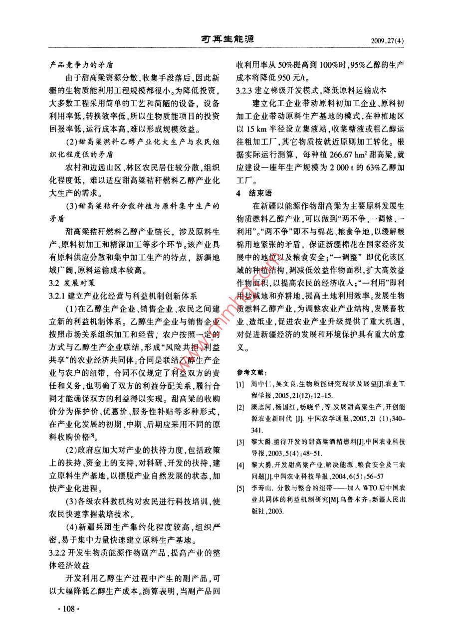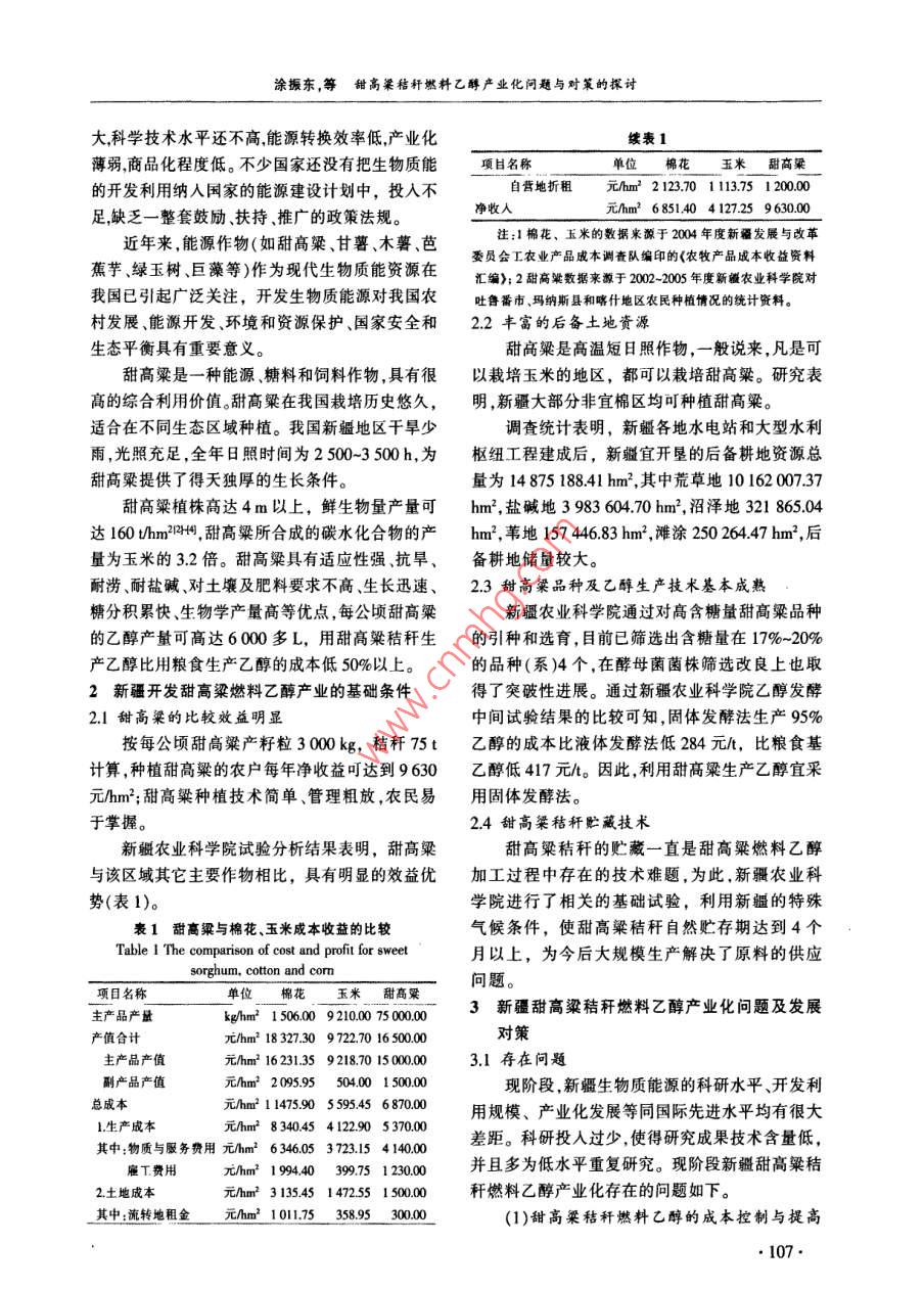 第27卷第4期可耳生能Vol 27 No 42009年8月Renewable Energy Resourcesug.2009甜高粱秸稈燃料乙醇產(chǎn)業(yè)化問(wèn)題與對(duì)策的探討涂振東',王釗英!,傅力2(1新疆農(nóng)業(yè)科學(xué)院,新疆烏魯木齊830091;2新疆農(nóng)業(yè)大學(xué),新疆烏魯木齊830093)摘要:甜高粱具有極高的光合速率,有“高能植物”之稱,其單位種植面積的乙醇產(chǎn)量較高。甜高粱特別適合在我國(guó)栽培,甜高粱燃料乙醇極具開發(fā)價(jià)值,它對(duì)能源安全和環(huán)境保護(hù)具有舉足輕重的作用。文章簡(jiǎn)單介紹了新甜高粱用于生產(chǎn)低成本燃料乙醇的優(yōu)勢(shì)試驗(yàn)情況以及產(chǎn)業(yè)化過(guò)程中面臨的問(wèn)題,并提出了解決這些問(wèn)題應(yīng)采取的對(duì)策。關(guān)鍵詞:甜高粱;燃料乙醇;產(chǎn)業(yè)化;問(wèn)題與對(duì)策中圖分類號(hào):TQ5174;S2l6,2文獻(xiàn)標(biāo)志碼:C文章編號(hào):1671-5292(2009)04-0106-03The problems and countermeasure in the industrializationof ethanol fuel extracted from sweet sorghumWANG Zhao-ying, FU Li(1.Xinjiang Academy of Agricultural Sciences, Urumqi 830091, China; 2. Xinjiang Agricultural University, UrumqiAbstract: The sweet sorghum has very high photosynthetic efficiency. So, itwas awarded wlhigh-energy Crop". The yield of alcohol per unit area extracted from sweet sorghum is very highand sweet sorghum adapts to the climate of China. The technology of sweet sorghum to ethanol fuelis of great development value. It will play an important role in the views of energy security andenvironment protection. Both the experiments of producing low cost fuel ethanol in Xinjiang andthe problems in the industrialization of ethanol fuel extracted from sweet sorghum are introducedin this paper. The countermeasures to solve these problems is also put forwardKey words: the sweet sorghum' ethanol fuel; industrialization; problems and countermeasure1甜高粱秸稈作為生物質(zhì)能源原料的意義右,如美國(guó)為4%,芬蘭瑞典和奧地利較高,分別生物質(zhì)資源包括植物和有機(jī)廢棄物等資源。為18%,16%和13%;發(fā)展中國(guó)家占有的比例較地球上生物質(zhì)資源極其豐富,每年經(jīng)光合作用產(chǎn)高,為33%;非洲地區(qū)所占比例更高,達(dá)55%,如生的生物質(zhì)約1700億t,但作為能源利用的生物蘇丹生物質(zhì)能消耗占國(guó)家能源消費(fèi)總量的87%;質(zhì)資源還不到總量的1%,開發(fā)潛力巨大。目前,中國(guó)生物質(zhì)資源豐富,目前生物質(zhì)能消耗占總能生物質(zhì)能是世界第4大消費(fèi)能源,位于石油、煤和耗的15%左右。天然氣3大常規(guī)能源之后,占世界總能耗的從世界范圍來(lái)看雖然近20年來(lái)生物質(zhì)能的11%。不同國(guó)家和地區(qū)的生物質(zhì)能消費(fèi)在其總能開發(fā)利用有了明顯的進(jìn)展,但其潛力還遠(yuǎn)遠(yuǎn)沒(méi)有耗中所占比例差別很大:發(fā)達(dá)國(guó)家普遍在3%左充分地發(fā)揮出來(lái),生物質(zhì)能開發(fā)利用的規(guī)模還不收稿日期:2009-05-19。基金項(xiàng)目:農(nóng)業(yè)部農(nóng)業(yè)公益性行業(yè)科研專項(xiàng)(3-30);新疆自然科學(xué)基金項(xiàng)目(200821175)。作者簡(jiǎn)介:涂振東(1962-),男,研究員,碩士,從事生物質(zhì)能源與農(nóng)業(yè)生物技術(shù)研究與管理工作。E- mail: thd919@126com涂振東,等甜高梁秸稈燃料乙醇產(chǎn)業(yè)化問(wèn)題與對(duì)策的探討大科學(xué)技術(shù)水平還不高,能源轉(zhuǎn)換效率低產(chǎn)業(yè)化續(xù)表1薄弱商品化程度低。不少國(guó)家還沒(méi)有把生物質(zhì)能項(xiàng)名稱單位棉花玉來(lái)翻高梁的開發(fā)利用納人國(guó)家的能源建設(shè)計(jì)劃中,投人不自營(yíng)地折租元/hm22123.70111375120000足,缺乏一整套鼓勵(lì)、扶持推廣的政策法規(guī)。凈收人元∧hm26851404127.25963000近年來(lái),能源作物(如甜高粱、甘薯、木薯、芭注;1棉花、玉米的數(shù)據(jù)來(lái)源于2004年度新疆發(fā)展與改革蕉芋、綠玉樹、巨藻等)作為現(xiàn)代生物質(zhì)能資源在委員會(huì)工農(nóng)業(yè)產(chǎn)品成本調(diào)查隊(duì)編印的《農(nóng)牧產(chǎn)品成本收益資料匯編》;2甜高粱數(shù)據(jù)來(lái)源于2002-2005年度新疆農(nóng)業(yè)科學(xué)院對(duì)我國(guó)已引起廣泛關(guān)注,開發(fā)生物質(zhì)能源對(duì)我國(guó)農(nóng)吐魯番市、瑪納斯縣和略什地區(qū)農(nóng)民種植情況的統(tǒng)計(jì)資料。村發(fā)展、能源開發(fā)、環(huán)境和資源保護(hù)、國(guó)家安全和2.2豐富的后備土地資源生態(tài)平衡具有重要意義。甜高粱是高溫短日照作物,一般說(shuō)來(lái),凡是可甜高粱是一種能源、糖料和飼料作物,具有很以栽培玉米的地區(qū),都可以栽培甜高粱。研究表髙的綜合利用價(jià)值。甜高粱在我國(guó)栽培歷史悠久,明,新疆大部分非宜棉區(qū)均可種植甜高粱。適合在不同生態(tài)區(qū)域種植。我國(guó)新疆地區(qū)干旱少調(diào)查統(tǒng)計(jì)表明,新疆各地水電站和大型水利雨,光照充足,全年日照時(shí)間為2500~3500h,為樞紐工程建成后,新疆宜開墾的后備耕地資源總甜高粱提供了得天獨(dú)厚的生長(zhǎng)條件。量為148751884lhm2,其中荒草地10l62007.37甜高粱植株高達(dá)4m以上,鮮生物量產(chǎn)量可hm2,鹽堿地3983604.70hm2,沼澤地321865.04達(dá)160thm24,甜高粱所合成的碳水化合物的產(chǎn)hm2,葦?shù)?574683hm2,灘涂25026447hm2,后