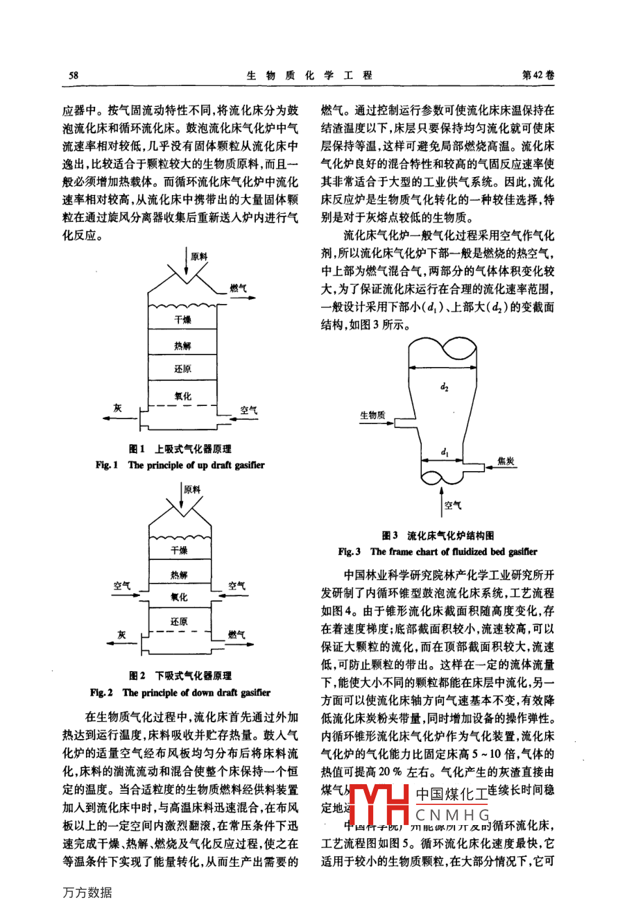 第42卷第2期生物質(zhì)化學(xué)工程Vol 42 No. 22008年3月Biomass Chemical EngineeringMar.2008ccEcc/sC/sc專題講座生物質(zhì)能源轉(zhuǎn)化技術(shù)與應(yīng)用生物質(zhì)發(fā)電技術(shù)和設(shè)備劉寶亮2,蔣劍春(1.中國林業(yè)科學(xué)研究院林產(chǎn)化學(xué)工業(yè)研究所;國家林業(yè)局林產(chǎn)化學(xué)工程重點開放性實驗室,江蘇南京210042;2.常州工學(xué)院理學(xué)院化學(xué)系,江蘇常州213022)摘要:生物質(zhì)能源是惟一的可再生、可替代化石能源轉(zhuǎn)化成氣態(tài)、液態(tài)和固態(tài)燃料以及其它化工原料或產(chǎn)品的碳資源隨著化石能源的枯竭和人類對全球性環(huán)境污染問題的關(guān)注,生物質(zhì)能替代化石能源利用的研究和開發(fā),已成為國內(nèi)外眾多學(xué)者研究和關(guān)注的熱點。本系列講座主要講逑以生物質(zhì)能源為主要原料,通過不同的途徑轉(zhuǎn)化為潔凈的、高品位的氣體、液體或體燃料。本講主要介紹了國內(nèi)外生物質(zhì)發(fā)電的技術(shù)和設(shè)備的發(fā)展狀況,及一些國家對生物質(zhì)發(fā)電的規(guī)劃,重點介紹了目前主要的發(fā)電技術(shù):直燃發(fā)電、氣化發(fā)電和沼氣發(fā)電。關(guān)鍵詞:生物質(zhì)能源;氣化;然燒;沼氣;發(fā)電中圖分類號:TQ91;TQ3512文獻標識碼:A文章編號:1673-5854(2008)02-0055-06Conversion Technology and Utilization of Biomass Energy ( VI)-Technology and Equipment for Biomass Power GenerationLIU Bao-liang",JIANG Jian-chun'1. Institute of Chemical Industry of Forest Products, CAF; Key and Open Lab. on Forest Chemical Engineering, SFA, Nanjing210042, China; 2. Department of Chemistry, School of Science, Changzhou Institute of Technology, Changzhou 213002, China)Abstract: Biomass is the sole renewable carbon resource that can be transferred into gas, liquid, and solid fuels as well as otherchemicals. As the fossil energy will be exhaustive, human pay more attention to the problem of global environment. Manyscholars and researchers in the world have been focusing on the research and development of biomass energy to substitute for fossilenergy. The clean and high quality gases, liquid and solid fuels converted from renewable biomass resource by different wayswere described in the course series. In this paper the development of biomass power generation at home and abroad, and the planof some countries are introduced. The main technologies of biomass power generation have three types: direct combustion powergeneration, biomass gasification for power generation and power generation by methaneKey words: biomass energy; gasification; combustion; methane power generation礦物燃料的大量使用,推動了社會的發(fā)展,但生物質(zhì)能是太陽能以化學(xué)能形式儲存在生物由于礦物燃料是不可再生能源使用時間有限,還質(zhì)中的能量。生物質(zhì)資源包括農(nóng)作物秸稈和農(nóng)業(yè)有礦物燃料的大量使用,引起了日益嚴重的環(huán)境加工剩余物、薪材及林業(yè)加工剩余物禽畜糞便、問題。因此各國政府和科學(xué)家對資源豐富、可再工業(yè)有機廢水和廢渣城市生活垃圾和能源植物生性強、有利于改善環(huán)境和可持續(xù)發(fā)展的生物資生物質(zhì)能可轉(zhuǎn)換為多種終端能源如電力氣體燃源的開發(fā)利用給予了極大的關(guān)注。料、固體燃料和液體燃料等。生物質(zhì)是一種可再中國煤化工收稿日期:200707-20CNMHG基金項目國家“十一五”科技支撐計劃:農(nóng)林剩余物制備生物燃氣關(guān)鍵技術(shù)研究(2006BAD07A03)者簡介:劉寶亮(1977-),男河北唐山人,博士,從事生物質(zhì)熱化學(xué)轉(zhuǎn)化利用的研究;聯(lián)系電話:13861032499;Ema1: Ibliangl977生物質(zhì)化學(xué)工程第42卷生能源,具有以下特點:1)可再生性;2)低污染造具有世界先進水平的燃燒生物質(zhì)的循環(huán)流化床性(生物質(zhì)硫含量、氮含量低燃燒過程中產(chǎn)生的鍋爐公司最大發(fā)電量為30萬千瓦。該公司利用SO2、NOx較低、生物質(zhì)作為燃料時,二氧化碳凈木材加工業(yè)造紙業(yè)的廢棄物為燃料廢棄物的最排放量近似于零,可有效地減少溫室效應(yīng));3)廣高含水量可達60%,排煙溫度為140℃,熱電效泛的分布性6。生物質(zhì)發(fā)電技術(shù)是將生物質(zhì)能率達88%;奧地利成功地推行了建立燃燒木材剩源轉(zhuǎn)化為電能的一種技術(shù),作為一種可持續(xù)發(fā)展余物的區(qū)域供電站計劃,生物質(zhì)能在總能耗中的的能源生物質(zhì)發(fā)電在國際上越來越受到重視在比例由原來2%~3%激增到19年的10%,國內(nèi)也越來越受到政府的關(guān)注和民間的擁護。生到20世紀末已增加到20%以上。到目前為止,物質(zhì)能是惟一的一種可再生又可直接貯存與運輸該國已擁有裝機容量為1~2MW的區(qū)域供熱站的能源,是僅次于煤炭、石油和天然氣的第四大能及供電站80~90座;瑞典和丹麥正在實施利用生源資源,約占全球總能耗的14%。在發(fā)展中國家物質(zhì)的熱電聯(lián)產(chǎn)計劃,使生物質(zhì)在轉(zhuǎn)換為高品位則更為突出生物質(zhì)能占總能耗的35%。據(jù)預(yù)電能的同時滿足供熱的需求以大大提高其轉(zhuǎn)換測,到2050年,生物質(zhì)能用量將占全球燃料直接效率。用量的38%,發(fā)電量占全球總電量的17%根據(jù)我國《可再生能源中長期發(fā)展規(guī)劃》確定的2國內(nèi)生物質(zhì)發(fā)電技術(shù)的發(fā)展現(xiàn)狀主要發(fā)展目標,到2010年,生物質(