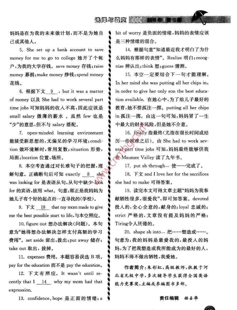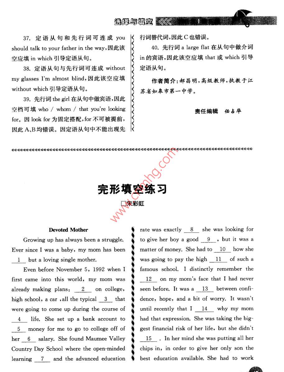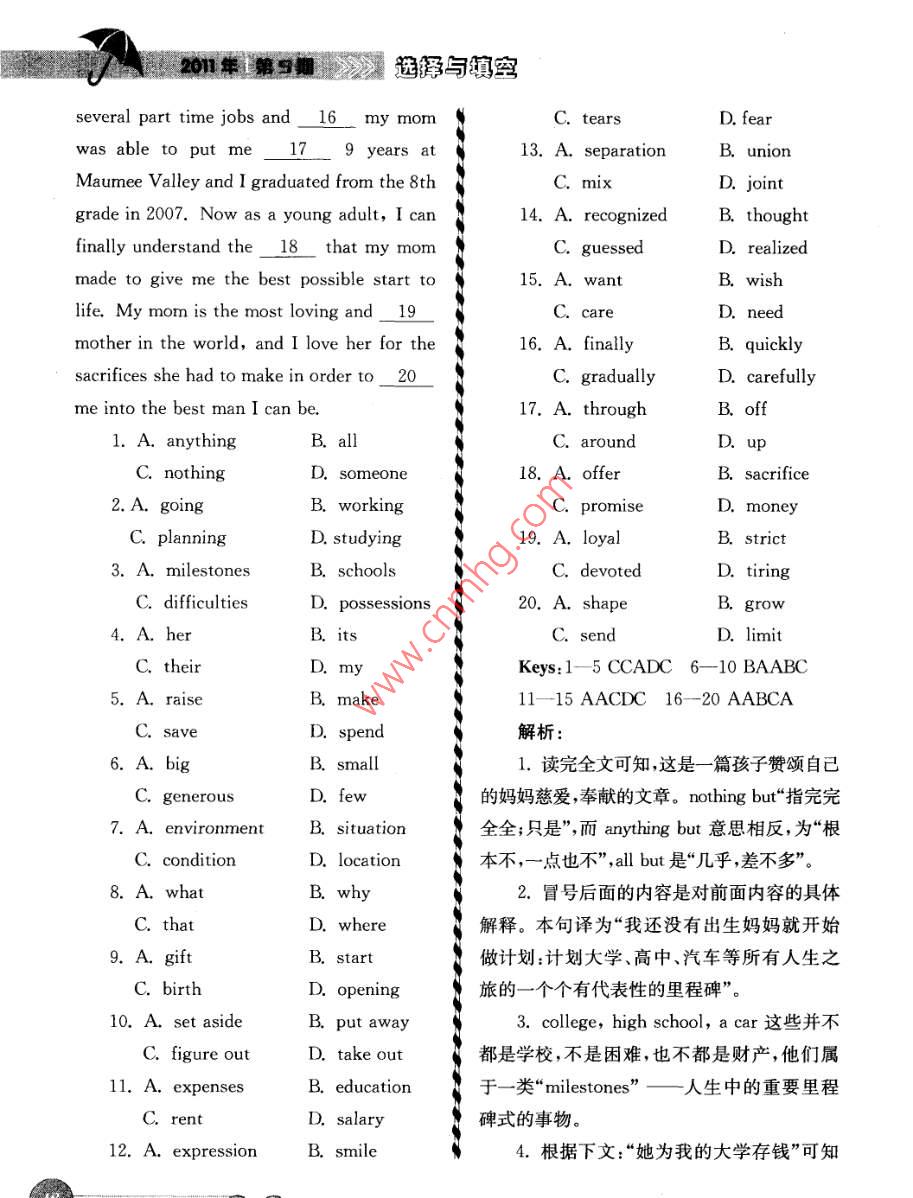 選擇與填空337.定語從句和先行詞可連成行詞替代詞,因此C也錯誤。should talk to your father in the way,因此該40.先行詞 a large flat在從句中做介詞空應(yīng)填 in which引導(dǎo)定語從句。in的賓語,因此該空應(yīng)填that或 which引導(dǎo)38。定語從句與先行詞可連成 without定語從句。my glasses I'm almost blind,因此該空應(yīng)填作者簡介:郝昌明,高級教師,執(zhí)教于江without which引導(dǎo)定語從句。蘇省如皋市第一中學(xué)。39.先行詞 the girl在從句中做賓語,因此空檔可填who/ whom/ that you're looking R責(zé)任編輯任占華for。因 look for為固定搭配,for不可被提前,因此A、B均錯誤。因定語從句中不能出現(xiàn)先ee∈∈∈ee∈ 666CCCCGEGCCCCCCEE∈ 6CC5CCCSCO∈ GC-GCCGCCCGCGCGCCCCGGC66EGEGGEGEGCGGO∈ee∈ee完形填空練習(xí)口朱彩虹Devoted Motherrate was exactly 8 she was looking forGrowing up has always been a strugglto give her boy a good 9, but it was aEver since I was a baby, my mom has been N matter of money. She had to 10 how she1 but a loving single mother.was going to pay the high 1l of such aEven before November 5, 1992 when I famous school. I distinctly remember thefirst came into this world, my mom was12 on my mom's face that I had neveralready making plaon college, N seen before. It was a 13 between confi-high school, a car, all the typical_3 that dence, hope, and a bit of worry. It wasn'twere going to come up during the course of i until recently that I 14 why my momlife.She set up a bank account to had that expression. She was taking the big-5 money for me to go to college off of a gest financial risk of her life, but she didnther 6 salary. She found Maumee Vall15. In her mind she was putting all herCountry Day School where the open-minded n chips in, in order to give her only son thelearning 7 and the advanced education best education available. She had to work歌2第》》與填空several part time jobs and 16 my momtearsearwas able to put me 19 years at13. A. separationBMaumee Valley and I graduated from the 8thC. mixD. jointgrade in 2007. Now as a young adult, I can14. A. recognized B. thoughtfinally understand the 18 that my momD. realizedmade to give me the best possible start to15. A. wantB. wishlife. My mom is the most loving and 19C. caremother in the world, and I love her for the16. A. finallyB. quicklysacrifices she had to make in order to 20C. graduallyD. carefullyme into the best man i can be17. A. through1. A. anythingB. allC. aroundC. nothingD. someone18. A. offerB. sacrifice2.AB. workingC. promiseanning19. A. loyalB. strict3. A. milestonesB. schoolsC. devotedC. difficultiesD. possessions20. A. shapegrow4. A. hersenC. theirmyKeys: 1-5 CCADC 6-10 BAABC5. A. raisemake11-15 AACDC 16-20 AABCA解析sima1.讀完全文可知,這是一篇孩子贊頌自己generous的媽媽慈愛,奉獻(xiàn)的文章。 nothing but“指完完environmentB. situation全全;只是”,而 anything but意思相反,為“根C. conditionD. location本不,一點也不”, all but是“幾乎,差不多”。what2.冒號后面的內(nèi)容是對前面內(nèi)容的具體解釋。本句譯為“我還沒有出生媽媽就開始B. start做計劃:計劃大學(xué)、高中、汽車等所有人生之C. birthD. opening旅的一個個有代表性的里程碑”。10. A. set asideB. put away3. college, high school,acar這些并不C. fitake out都是學(xué)校,不是困難,也不都是財產(chǎn),他們屬11. A. expensesB. education于一類“ milestones”—人生中的重要里程碑式的事物。12. A. expressionB. smile4.根據(jù)下文:“她為我的大學(xué)存錢”可知選擇與填空歐《媽媽是在為我的未來做計劃,而不是為她自 bit of worry是負(fù)面的情緒,媽媽的表情應(yīng)該己或其他人。是三種情緒的混合。5. She set up a bank account to save14.根據(jù)句意“知道最近我才明白了為什money for me to go to college她開了個帳N么媽媽有那樣的表情”。 Realize明白; recog-戶,為我的大學(xué)存錢. save money存錢; raisenize辨認(rèn)出;thnk想;gues猜測money募捐; make money掙錢; spend money15.本空一定要結(jié)合下一句才能理解花錢。In her mind she was putting all her chips in,6.根據(jù)下文9, but it was a matter N in order to give her only son the best educaof money以及 She had to work several part tion available.在她心中,為了給兒子最好的time jobs可知媽媽的收人不高,因此應(yīng)該是身教育,她不惜孤注一擲。 putting all her chipssmall salary微薄的薪水。雖然few也是in孤注一擲。由這一句可知,媽媽冒了一生“少”的意思,但不與 salary搭配中最大的財務(wù)風(fēng)險,但是她不介意。7. open-minded learning environment16. finally指最終(尤指在很長時間或經(jīng)能接受新思想的,無偏見的學(xué)習(xí)環(huán)境; condi歷一些困難之后)。由 She had to work sevtion做環(huán)境解時,常用復(fù)數(shù); situation形勢eral part time jobs可知,媽媽最終能夠供我局面; location位置,場所。在 Maumee valley讀了九年書。8.本空考查通過對長難句子的把握,理17. put sb through…使…完成了解句意。正確斷句后可知 exactly8she18.下文 and I love her for the sacrificeswas looking for是表語從句,從句中缺少 look she had to make 1可得答案for的賓語,故用what。句意:那正是我媽媽為19.讀完本文可得文章主題“媽媽為我奉她兒子有個好的起點而一直尋找的(學(xué)校)。獻(xiàn)犧牲很多,很愛我”,即可知答案。 devoted9.下文18 that my mom made to give投入的,全心全意的,獻(xiàn)身的; loyal忠誠的me the best possible start to life,與本空照應(yīng)strict嚴(yán)格的,文章沒有提及媽媽的嚴(yán)格;10. figure out想辦法解決(問題)。本句·Ting令人厭倦的。意為“她