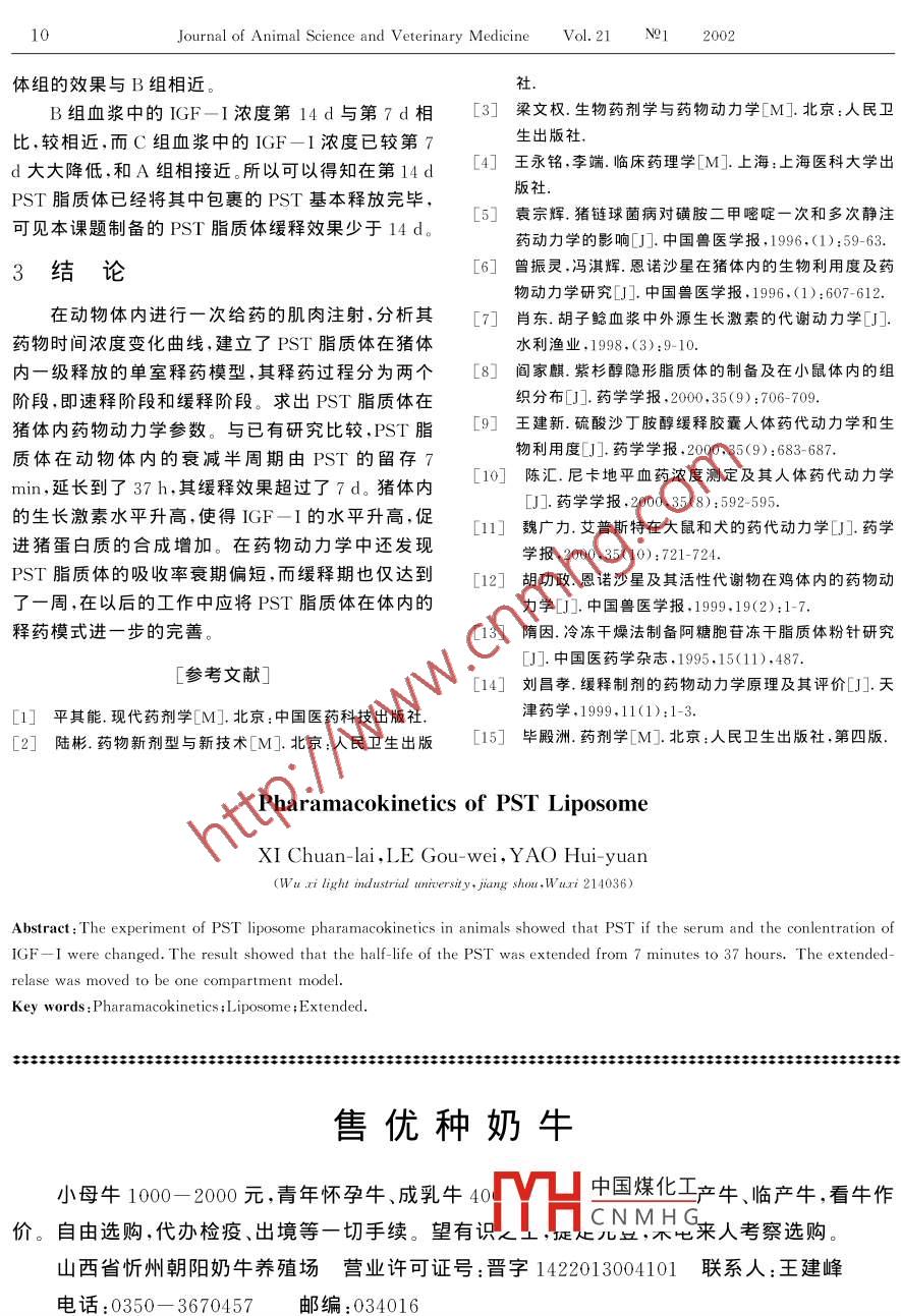畜牧獸醫(yī)雜志第21卷第1期2002年P(guān)ST脂質(zhì)體代謝動力學(xué)的研究胥傳來,樂國偉,姚惠源(無錫輕工業(yè)大學(xué),江蘇無錫214036)摘要:在豬體內(nèi)m.i.PST脂質(zhì)體,研究其在體內(nèi)的藥物代謝動力學(xué)和對肥育豬生產(chǎn)能力的影響,分析其血漿中生長激素濃度隨時間的變化曲線,確定其釋藥模型為單室模型,求岀各項動力學(xué)參數(shù),結(jié)果為PST脂質(zhì)體的緩釋效果顯著,緩釋時間長達7d以上關(guān)鍵詞:代謝動力學(xué);胴體品質(zhì);緩釋中圖分類號:S859.54文獻標識碼:A文章編號:1004-6704(2002)01-0007-04藥物代謝動力學(xué)( pharmacOkinetics是應(yīng)用動能在生長激素的作用下合成IGF-1,以自分泌或旁力學(xué)原理研究藥物在機體內(nèi)的吸收、分布、轉(zhuǎn)化和排分泌的形式,促進肌細胞的分裂,增加蛋白質(zhì)的合泄過程及其運動的速度和規(guī)律;并用數(shù)學(xué)方程定量成。局部產(chǎn)生的IGF-I可能在骨和軟骨的生長中起的預(yù)測藥物體內(nèi)過程的性質(zhì)。由于藥物吸收和分布重要作用,生長激素是以依賴IGF-I的方式直接作過程決定藥物作用的啟動,而作用時間的長短取決用于靶組織。一些研究表明生長激素抑制脂肪酸合于:原型活性藥物的排泄;活性分子生物轉(zhuǎn)化為非活成酶也是通過纖維肝臟及脂肪組織中IGF性分子;在組織內(nèi)的在分布。因此,藥物在體內(nèi)發(fā)揮mRNA的轉(zhuǎn)錄來完成的作用,起劑量和效應(yīng)的關(guān)系,直觀地為藥效學(xué)( pharmacodynaius)研究的內(nèi)容其實還涉及藥物動1實驗材料與方法力學(xué)。藥物進入機體后各部位的藥物濃度就在隨時1.I實驗儀驗及材料間不斷的變化,當藥物在作用部位達到一定的濃度高速冷凍離心機,日本日立;超聲波細胞粉碎儀時即可同細胞的某些組成發(fā)生作用,引起細胞功能( sonis8. Materials inc. Vibra cell);旋轉(zhuǎn)蒸發(fā)儀,上的變化導(dǎo)致一系列生理、生化改變,產(chǎn)生藥理效應(yīng)。海;PST脂質(zhì)體(自制);肝素管,蘇州碧迪醫(yī)療器械在實際上,藥物動力學(xué)的概念和原理有廣泛的廠;希望中豬全價飼料800kg,上海希望飼料公司應(yīng)用包括藥物劑量與藥理效應(yīng)的相互關(guān)系研究;機—次性注射器(200支),蘇州碧迪醫(yī)療器械廠;一次體生理及病理狀態(tài)對藥物吸收及處置的影響;在疾性留滯針(50支),蘇州碧迪醫(yī)療器械廠;HGH放射病狀態(tài)的劑量調(diào)整;藥物制劑的生物利用度測定,藥免疫測定盒,上海生物制劑研究所;GF鎂免測定物相互作用的評價等在實踐中最重要的用途是:通盒,無錫第三人民醫(yī)院提供過體液藥物濃度檢測,應(yīng)用藥物動力學(xué)參數(shù)闡明藥1.2實驗方法物體內(nèi)諸過程的規(guī)律性,為達到所期望的治療藥物1.2.1準備PST注射液的配制,準確稱取濃度擬訂適宜的給藥劑量和時間間隔,以便用藥個PST固體,用無菌超純水配制成濃度為1mg/ml的體化溶液。分子生物學(xué)的研究表明,生長激素使組織中的PST脂質(zhì)性注射液的制備,液體脂質(zhì)體制成后IGF-增加主要是生長激素促進了肝臟和肌肉中在12000rpm下冷凍離心30min,取沉淀用Co進IGF-1的基因轉(zhuǎn)錄,使含有IGF-1遺傳物質(zhì)的行24h輻射滅菌,達到無菌狀態(tài),測定其PST實際DNA轉(zhuǎn)錄成IGF-1mRNA加強,進而翻譯成更多含的IGF—I,促進細胞分化和蛋白質(zhì)的合成,加快肌中國煤化工CNMHG星期的預(yù)飼,預(yù)飼條件肉生長。生長激素除刺激肝細胞產(chǎn)生GF-1外大與頭期相,為目出T水與采食,實驗過程中不量的肝外組織如骨骼肌、脂肪組織、原脂肪細胞等均使用其它任何藥物。1.2.2分組對18頭體重20kg左右的太湖二收稿日期:2001-11-12作者簡仍臠婁居965-),男,江蘇鹽城人,副教授,博士,主要元雜交小公豬進行隨機分組,每組6頭從事動物生物基礎(chǔ)方面的研究對照組(A):整個實驗過程不做任何處理Journal of Animal Science and Veterinary Medicine Vol 21 N91 2002實驗一組(B):每天早上8點頸部肌肉注射室溫孵育30min,4C離心,3500r/min離心30PST注射液4ml;min。取上清液,加0.8 mI Pbs緩沖液混勻?qū)嶒灦M(C):每7d頸部肌肉注射含有PST1.4.2血漿中IGF-I含量的測定將酸醇處理的mg的PST脂質(zhì)體注射液提取液,用RIA分析方法(雙抗法),即加PBS,15I2.3實驗方法在第一次注射后1h開始在A、IGF-1,Ab,Ab2,相繼孵育18~24h和16~18h,離B、C三組耳緣靜脈采取靜脈血2~3ml,前2d采血心后,在FMJ-182放免疫r計數(shù)儀上測定,計算出時間為注射后1、2、3.5、5.5、7.5、10、16、20h;第3d各樣品的IGF-1含量。在C組采血次數(shù)為四次,第4~7d在C組每天早晚血漿中IGF-I含量用(ng/m)表示。各一次采血。第7d,第14dA、B、C三組在8、12由無錫市第三人民醫(yī)院放免中心檢測。16、20點采血。血樣在3000rpm離心機上5min分離血漿。2實驗結(jié)果與分析1.3血漿中的生長激素測定2.1血漿中的生長激素隨時間的變化根據(jù)上海生物制品研究所提供的分析方法予以分析圖1可知A組與B組在一天之內(nèi)出現(xiàn)兩分析。次高峰,表現(xiàn)出生長激素的脈沖釋放B組在A組的由無錫市第三人民醫(yī)院放免中心檢測基礎(chǔ)上疊加,B組血漿中的生長激素濃度在注射后1.4血漿中的IGF-I的測定立即上升,這與已有的研究相符,C組血漿中的生長1.4.1血漿中IGF_I酸醇提取取0.1ml血漿,激素濃度在第一天逐漸升高,到晩上24點達到最高加λ.gml酸醇混合液(毎升中