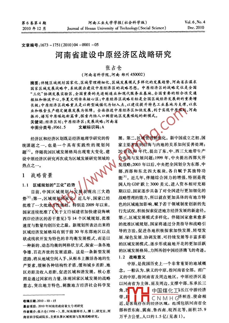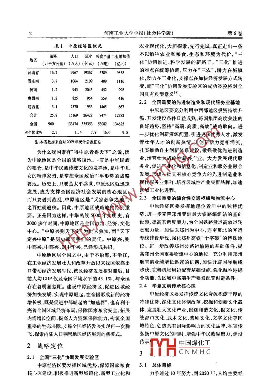 第6卷第4期河南工業(yè)大學(xué)學(xué)報(bào)(社會(huì)科學(xué)版)Vol. 6,No.42010年12月Joumal of Henan University of Technology( Social Science)Dec. 2010文章編號(hào):1673 - 1751(2010)04 -0001 -05河南省建設(shè)中原經(jīng)濟(jì)區(qū)戰(zhàn)略研究張占倉(cāng)(河南省科學(xué)院,河南鄭州450002)摘要:伴隨區(qū)域規(guī)劃國(guó)家化、區(qū)域管理精細(xì)化、區(qū)域發(fā)展模式多樣化的發(fā)展趨勢(shì),河南省在謀求國(guó)家區(qū)域發(fā)展戰(zhàn)略中,系統(tǒng)提出建設(shè)中原經(jīng)濟(jì)區(qū)的戰(zhàn)略思想。中原經(jīng)濟(jì)區(qū)的戰(zhàn)略定位是全國(guó)“三化”協(xié)調(diào)發(fā)展實(shí)驗(yàn)區(qū),全國(guó)重要的先進(jìn)制造業(yè)和現(xiàn)代服務(wù)業(yè)基地,全國(guó)重要的綜合性交通樞紐和物流中心,華夏文明傳承核心區(qū);中原經(jīng)濟(jì)區(qū)戰(zhàn)略目標(biāo)是全國(guó)區(qū)域經(jīng)濟(jì)發(fā)展新的重要增長(zhǎng)極;中原經(jīng)濟(jì)區(qū)戰(zhàn)略重點(diǎn)是以新型城鎮(zhèn)化為切入點(diǎn),以建設(shè)提升特色工業(yè)基地為支撐,以農(nóng)業(yè)和糧食生產(chǎn)穩(wěn)定健康發(fā)展為保障。全面推進(jìn)中原經(jīng)濟(jì)區(qū)加快發(fā)展,利于實(shí)現(xiàn)中原崛起,河南振興,譜寫中原崛起新篇章,探索內(nèi)陸人口稠密地區(qū)發(fā)展崛起的新模式。關(guān)鍵詞:經(jīng)濟(jì)區(qū)劃;中原經(jīng)濟(jì)區(qū);發(fā)展戰(zhàn)略;河南省中圖分類號(hào):F061.5文獻(xiàn)標(biāo)識(shí)碼:A經(jīng)濟(jì)區(qū)和經(jīng)濟(jì)區(qū)劃既是經(jīng)濟(jì)地理學(xué)研究的傳展。第二,區(qū)域管理精細(xì)化。新中國(guó)成立之初,國(guó)統(tǒng)課題之一,也是一個(gè)具有實(shí)踐性的規(guī)劃問家主要考慮到沿海與內(nèi)地的關(guān)系如何妥善處理;題"。伴隨我國(guó)區(qū)域發(fā)展格局出現(xiàn)重大變化,建20世紀(jì)80年代,提出了東、中、西三大地帶生產(chǎn)設(shè)中原經(jīng)濟(jì)區(qū)研究再次成為區(qū)域發(fā)展研究領(lǐng)域的力布局與發(fā)展問題;1999年,中央提出西部大開熱點(diǎn)之一。發(fā)戰(zhàn)略;2003年以后,中央把全國(guó)劃分為東部、中部、西部和東北四大板塊,各自賦予其獨(dú)特功1戰(zhàn)略背景能i3)。近幾年,伴隨綜合國(guó)力的增強(qiáng),特別是我1.1 區(qū)域規(guī)劃的“三化"趨勢(shì)國(guó)人均GDP躍上3000美元,進(jìn)人資本相對(duì)充裕目前,中國(guó)區(qū)域規(guī)劃與發(fā)展表現(xiàn)出三大趨期以后,國(guó)家逐步具備了對(duì)全國(guó)進(jìn)行更加細(xì)化的勢(shì)[2]:第一,區(qū)域規(guī)劃國(guó)家化。近幾年,國(guó)家已經(jīng)戰(zhàn)略管理的能力,所以就在更加具體的有地方特批準(zhǔn)了一大批地方性規(guī)劃。特別是2009年以來(lái),色的區(qū)域施加影響,賦予若干領(lǐng)域制度創(chuàng)新的先國(guó)家連續(xù)批準(zhǔn)了《關(guān)于支持福建省加快建設(shè)海峽行先試權(quán),積極探索促進(jìn)地方經(jīng)濟(jì)發(fā)展的新途徑。西岸經(jīng)濟(jì)區(qū)的若干意見》等14個(gè)區(qū)域規(guī)劃,批準(zhǔn)第三,區(qū)域發(fā)展模式多樣化。伴隨國(guó)家愈來(lái)愈多速度與數(shù)量均創(chuàng)歷史之最。新規(guī)劃所表達(dá)出來(lái)的的批準(zhǔn)區(qū)域規(guī)劃,國(guó)家將通過(guò)分類指導(dǎo)和戰(zhàn)略引區(qū)域經(jīng)濟(jì)發(fā)展格局有別于前30年?yáng)|部地區(qū)以點(diǎn)導(dǎo)的方法,促進(jìn)各地積極探索加快發(fā)展、轉(zhuǎn)型發(fā)狀或線狀開發(fā)為特色的非均衡發(fā)展模式,而是以展、綠色發(fā)展、協(xié)調(diào)發(fā)展、可持續(xù)發(fā)展等豐富多彩-種新的、動(dòng)態(tài)均衡的網(wǎng)格狀方式,探索-條各地的區(qū)域發(fā)展模式,逐步形成遍地開花的更加活躍爭(zhēng)雄、百花齊放的發(fā)展道路。這是一條新型發(fā)展的區(qū)域發(fā)展格局,力圖再創(chuàng)中國(guó)經(jīng)濟(jì)騰飛的奇跡。道路,將從地域空間人手,從根本上激活各地的生1.2 戰(zhàn)略意義產(chǎn)要素,緩解各種結(jié)構(gòu)性矛盾,緩和城鄉(xiāng)差距、地中原,是我國(guó)歷史上一個(gè)非常重要的地域概區(qū)差距及收入差距,促進(jìn)區(qū)域和諧發(fā)展。核心意念。一般認(rèn)為,狹義的中原,指河南省全部。而廣圖是通過(guò)國(guó)家的力量,體現(xiàn)國(guó)家區(qū)域發(fā)展的戰(zhàn)略義的中原,指河南省及周邊地區(qū)。中原經(jīng)濟(jì)區(qū)是意志,突出地方特色,刺激地方經(jīng)濟(jì)社會(huì)科學(xué)發(fā)以河南省為主體,延及周邊,支撐中部,東承長(zhǎng)三角,中國(guó)煤化工長(zhǎng)江中游經(jīng)濟(jì)收稿日期:2010-10-15帶,HCNMHQ濟(jì)相連、使命相近,是客觀存在的經(jīng)濟(jì)區(qū)域。范圍包括河南省全基金項(xiàng)目: 2010年河南省政府承大專項(xiàng)研究作者簡(jiǎn)介:張占倉(cāng)(1958 -) .男,河南偃師市人,博t. 研究員,河部和晉東南、冀南魯西南、皖西北等,面積25.9南省科學(xué)院副院長(zhǎng),主要從事區(qū)城規(guī)劃與發(fā)展戰(zhàn)略研究。萬(wàn)平方公里,人口約1.5億(見表1)。2河南工業(yè)大學(xué)學(xué)報(bào)(社會(huì)科學(xué)版)第6卷表1中原經(jīng)濟(jì)區(qū