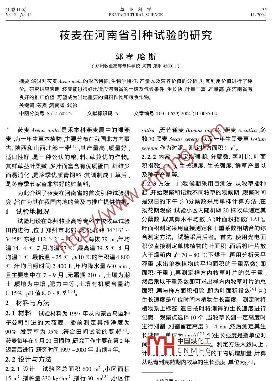 21卷11期草業(yè)科學(xué)35Vol.21 ,No. 11PRATACULTURAL SCIENCE11/2004莜麥在河南省引種試驗(yàn)的研究郭孝哈斯(鄭州牧業(yè)高等??茖W(xué)校河南鄭州450011 )摘要通過對(duì)莜麥Avenanuda的形態(tài)特征、生物學(xué)特征、產(chǎn)量以及營養(yǎng)價(jià)值的分析對(duì)其利用價(jià)值進(jìn)行了評(píng)價(jià)。研究結(jié)果表明莜麥能夠很好地適應(yīng)河南省的土壤及氣候條件生長快葉量豐富產(chǎn)量高在河南省有良好的推廣價(jià)值,可望成為當(dāng)?shù)刂匾娘暳献魑锖图Z食作物。關(guān)鍵詞莜麥河南省試驗(yàn)中圖分類號(hào)S512. 602. 2文獻(xiàn)標(biāo)識(shí)碼A文章編號(hào):1001 -0629( 2004 )l 1-0035-04莜麥Avenanuda是禾本科燕麥屬中的裸燕sativa無芒雀麥Bromus inermis 燕麥A. sativa冬麥為一年生草本植物主要分布在我國北方內(nèi)蒙牧70黑麥Secale cereale以及一年生 黑麥草Lolium古陜西和山西北部-帶1 ,其產(chǎn)量高,質(zhì)量好,perenc 作為對(duì)照。測(cè)定樣方面積1 m。適口性好,是一種公認(rèn)的糧、料、草兼優(yōu)的作物。2.2.2內(nèi)容測(cè)定物候期、分蘗數(shù)、莖葉比、葉面其鮮草莖葉柔嫩多汁而富含有優(yōu)質(zhì)蛋白纖維少積指數(shù)( LAI)生長速度、生長強(qiáng)度、鮮草產(chǎn)量以而易消化,,是冷季優(yōu)質(zhì)青飼料淇調(diào)制成干草后,及種子產(chǎn)量等。是冬春季節(jié)家畜非常好的貯備料。2.2.3方法1 )物候期采用目測(cè)法,從牧草播種為此介紹了莜麥在河南省的首次引種試驗(yàn)研起開始觀察和記載不同牧草的物候期觀察時(shí)間究旨在為其在我國內(nèi)地的普及與推廣提供依據(jù)。是雙日的下午2 )分蘗數(shù)采用單株計(jì)算方法,在1試驗(yàn) 地概況揚(yáng)花期觀察試驗(yàn)小區(qū)內(nèi)隨機(jī)取20株牧草測(cè)定其試驗(yàn)地設(shè)在鄭州牧業(yè)高等??茖W(xué)校牧草試驗(yàn)分蘗數(shù)取其算術(shù)平均數(shù)3 )葉面積指數(shù)( LAI )。田內(nèi)進(jìn)行,位于鄭州市北郊,地處北緯34°16'~葉面積測(cè)定采用直接測(cè)定和干重系數(shù)相結(jié)合的綜34958'東經(jīng)112 042'~ 114°14'海拔79 m年均合測(cè)定方法。試驗(yàn)采用后者。首先使用光電面溫14.4 C 7月均溫27 C最高溫39.5C ;1月積儀直接測(cè)定單株植物的葉面積,而后將葉片放均溫1 C最低溫-25 C ,≥10 C的年積溫4800入干燥箱內(nèi)在70~80 C下烘干再用分析天平C年均日照時(shí)間2 400 h年均降水量640 mm ,秤重求出單株植物的平均面積的干重系數(shù)(即且主要集中在7 -9月,無霜期210 d ,土壤為潮面積/干重) ,再測(cè)定樣方內(nèi)牧草葉片的總干重,土質(zhì)地為中壤,肥力中等,土壤有機(jī)質(zhì)含量約然后乘以干重系數(shù)即可求出樣方內(nèi)牧草葉片的總1.15% ,pH值8.0~8.523。面積再與樣方面積相除,即為葉面積指數(shù)[6] ;4 )生長速度是單位時(shí)間內(nèi)植物生長高度。測(cè)定時(shí)將2材料與方法2.1材料試驗(yàn)材料為 1997年從內(nèi)蒙古烏盟種植物系.上標(biāo)簽逐日按時(shí)將測(cè)得的生長速度進(jìn)行子公司引進(jìn)的大莜麥。播前測(cè)定其純凈度為記載。觀察點(diǎn)選擇10個(gè)當(dāng)牧草長到一定高度時(shí)90%發(fā)芽率為95%,符合田間試驗(yàn)的要求4]。進(jìn)行刈割刈割留茬高度3 ~4 cm然后測(cè)定其生長速度_單位為cm/d7]5)生長強(qiáng)度是指單位時(shí)莜麥每年在9月20日播種研究工作主要在第2年中國煤化工測(cè)定方法大致同上,返青后進(jìn)行研究時(shí)間1997 -2000年持續(xù)4年。.t+MHCNMHGMH的干物質(zhì)增加量,計(jì)算2.2設(shè)計(jì)與方法從返青到完熟期內(nèi)牧草的生長強(qiáng)度單位為g/d。2.2.1設(shè)計(jì)試驗(yàn)區(qū)總面積600m2,小區(qū)面積15 m2播種量230 kg/hm2播行30 cm[5],小區(qū)作收稿日期2003-09-03對(duì)比排列重復(fù)3次。試驗(yàn)用紫花苜蓿Medicago作者簡(jiǎn)介郭教( 1964-). 男,內(nèi)蒙古商都人,副教授。36PRATACULTURAL SCIENCEC Vol.21 ,No. 11)11/2004統(tǒng)計(jì)方法采用新復(fù)極差方差分析法通過F表1莜麥以及對(duì)照的單 株分蘗數(shù)、莖葉比、檢驗(yàn)分析和比較莜麥上述各項(xiàng)生物學(xué)指標(biāo)以及生葉面積指數(shù)的比較長特點(diǎn)。牧草名稱分蘗數(shù)莖葉比LAI3研究結(jié)果莜麥68.3+2.1 2.21 +0.07 1.78+0.103.1物候期莜麥在上年9月20日播種」周紫花苜蓿.2.82+0.11 1.68+0. 11無芒雀麥.38.2+1.6 2.76+0.12 1. 24 +0.07后出苗10月上旬形成分蘗芽,并在中旬有少量燕麥54.8+1.9 2.25+0.09 1.81 +0.13分蘗芽形成短的營養(yǎng)枝大多數(shù)分蘗芽連同分蘗冬牧70黑麥40.2+1.2 2.74+0.05 1.71 +0.11枝在11月中旬進(jìn)入越冬期。一年生黑麥草76.9+2.6 2.25+0.12 1.47 +0.08第2年3月初返青3月中旬進(jìn)入分蘗期此3.3生長速度及生長強(qiáng)度從返青到完熟 莜時(shí)越冬后的分蘗芽不斷形成分蘗枝,同時(shí)又形成麥的生長速度呈S" 形曲線峰期在4月下旬到5.新的分蘗芽,大約持續(xù)2周。3月底到4月初進(jìn)月初的抽穗-揚(yáng)花期,峰值2. 39 cm/d。從整個(gè)入拔節(jié)期A月中旬孕穗,下旬抽穗A月底進(jìn)入揚(yáng).生育期內(nèi)的生長速度來看莜麥1.12 cm/d顯著花期。5月上旬乳熟,中旬蠟熟5月底到6月初.地高于無芒雀麥( 0.89 em/d )及紫花苜蓿( 0.91種子成熟。cm/d)。莜麥到完熟期時(shí)高度達(dá)到最大值( 114. 63.2分蘗、莖葉比及葉面積指數(shù)