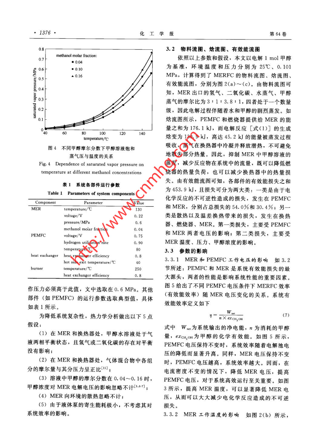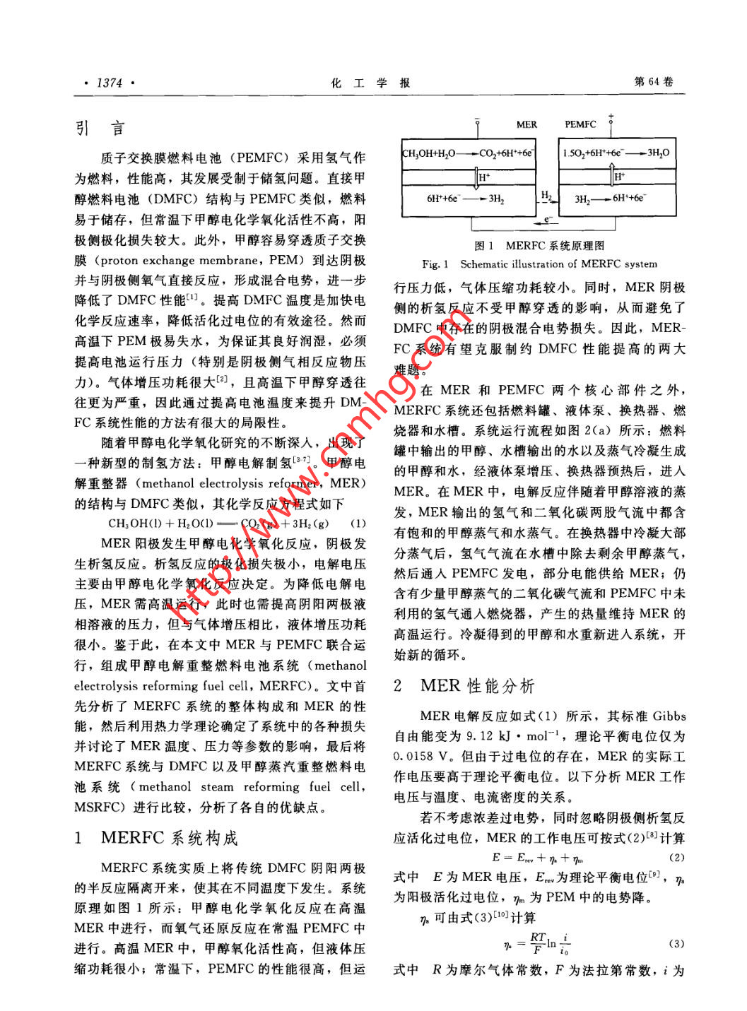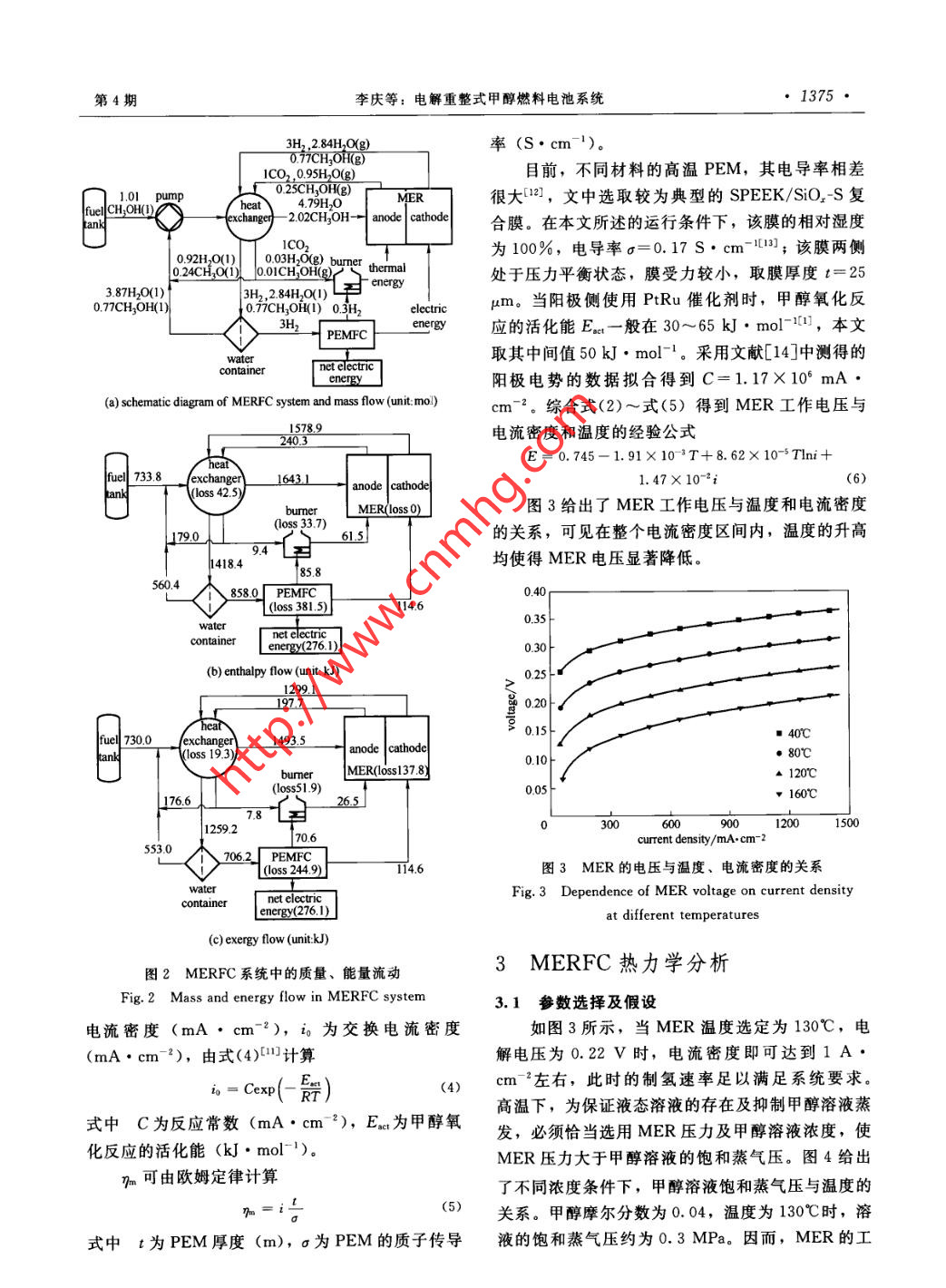 第64卷第4期化工學(xué)報Vol. 64 No. 42013年4月CIESC JournalApril 2013研究論文資電解重整式甲醇燃料電池系統(tǒng).李慶,葉強,楊曉光(上海交通大學(xué)機械與動力工程學(xué)院,上海200240)摘要:為解決直接甲醇燃料電池中甲醇氧化活性低及甲醇穿透問題,提出一種新型的電解重整式甲醇燃料電池系統(tǒng)。在系統(tǒng)中,高溫電解重整器重整甲醇為常溫燃料電池供氫,燃料電池的部分電能供給電解重整器使用。通過對系統(tǒng)的物料流、焓流、有效能流的分析,確定了系統(tǒng)中的不可逆因素。結(jié)果表明:電解重整器電壓是影響系統(tǒng)效率的重要參數(shù);升高重整器溫度可以顯著降低其電壓,但必須采用合理的壓力、甲醇溶液濃度以抑制甲醇溶液的蒸發(fā),降低熱量損失。與傳統(tǒng)的直接甲醇燃料電池系統(tǒng)以及高溫甲醇熱重整聯(lián)合質(zhì)子交換膜燃料電池系統(tǒng)相比,該系統(tǒng)性能較高、結(jié)構(gòu)緊湊。關(guān)鍵詞:甲醇重整;電解;制氫;燃料電池DOI: 10. 3969/j. issn. 0438- 1157.2013. 04. 034中圖分類號: TQ 152; TK 91文獻標(biāo)志碼: A文章編號: 0438- 1157 (2013) 04- 1373-07PEMFC system incorporating a methanol electrolytic reformerLI Qing, YE Qiang, YANG Xiaoguang(School of Mechanical and Power Engineering , Shanghai Jiao Tong University, Shanghai 200240, China)Abstract: Slow rate of methanol oxidation and its crossover are two major challenges for direct methanolfuel cells (DMFC). The sluggish kinetics can be relieved by elevating cell temperature which, however,leads to other problems like membrane dehydration. To solve these problems, it is proposed that amethanol electrolytic reformer ( MER) is combined with polymer electrolyte membrane fuel cell(PEMFC) system. Working at elevated temperature, the MER provides hydrogen for the PEMFC and isdriven by power provided by the PEMFC. Essential components included in this system are described andflows of mass, enthalpy and exergy are presented. Thermodynamic analysis shows that exergy destructionsoccur in main components, i.e. ,PEMFC and MER. The voltage of MER is an important parameterinfluencing the efficiency of the system. Rising temperature in MER, MER voltage required significantlydecreases, but exergy losses caused by heat dissipation and heat transfer increase exponentially due to theintensified evaporation of methanol solution. To mitigate evaporation, low methanol concentration and highpressure could be necessary. When MER works at higher methanol concentration, higher pressure isrequired for efficient operation. The overall performance and efficiency of this system is much better thanthat of a DMFC. Without carbon monoxide in hydrogen generated, comparing with a competitive system inwhich a thermal methanol steam reformer is incorporated, this system has potentials to be built simplier.Key words: methanol reforming; electrolysis; hydrogen production; fuel cell2012-07-03收到初稿,2012- 11- - 22收到修改稿。Received date:聯(lián)系人:葉強。第一作者:李慶(1988-), 男,碩士研究生。Correspoading author: Dr. YE Qiang, qye@ sjtu. edu. cn基金項目:國家自然科學(xué)基金項目(51276111).Foundation item: supported by the National Natural ScienceFoundation of China (51276111).第64卷1374●化工學(xué)報MERPEMFC引言| 150O,+6H*+6e^- - 3H2。O質(zhì)子交換膜燃料電池(PEMFC)采用氫氣作為燃料,性能高,其發(fā)展受制于儲氫問題。直接甲醇燃料電池(DMFC)結(jié)構(gòu)與PEMFC類似,燃料61*+6e^-- - 3H2些3H2- 一6H*+6e^易于儲存,但常溫下甲醇電化學(xué)氧化活性不高,陽極側(cè)極化損失較大。此外,甲醇容易穿透質(zhì)子交換g1 MERFC系統(tǒng)原理圖膜(proton exchange membrane, PEM)到達陰極Fig. 1 Schematic ilustrtion of MERFC system并與陰極側(cè)氧氣直接反應(yīng),形成混合電勢,進一步行壓力低,氣體壓縮功耗較小。同時,MER陰極降低了DMFC性能”。提高DMFC溫度是加快電側(cè)的析氫反應(yīng)不受甲醇穿透的影響,從而避免了化學(xué)反應(yīng)速率,降低活化過電位的有效途徑。然而DMFC中存在的陰極混合電勢損失。因此,MER-高溫下PEM極易失水,為保證其良好潤濕,必須FC系統(tǒng)有望克服制約DMFC性能提高的兩大提高電池運行壓力(特別是陰極側(cè)氣相反應(yīng)物壓難題。力)。氣體增壓功耗很大印,且高溫下甲醇穿透往在MER和PEMFC兩個核心部件之外,往更為嚴重,因此通過提高電池溫度來提升DM-MERFC系統(tǒng)還包括燃料罐、液體泵、換熱器、燃FC系統(tǒng)性能的方法有很大的局限性.燒器和水槽。系統(tǒng)運行流程如圖2(a)所示:燃料隨著甲醇電化學(xué)氧化研究的不斷深入,出現(xiàn)了罐 中輸出的甲醇、水槽輸出的水以及蒸氣冷凝生成- .種新型的制氫方法:甲醇電解制氫[1。甲醇電的甲醇和水,經(jīng)液體泵增壓、換熱器預(yù)熱后,進入解重整器(methanol electrolysis reformer, MER)MER.在MER中,電解反應(yīng)伴隨著甲醇溶液的蒸的結(jié)構(gòu)與DMFC類似,其化學(xué)反應(yīng)方程式如下發(fā),MER輸出的氫氣和二氧化碳兩股氣流中都含CH,OH() + H201)- - . CO,(g) +3H;(g) (1)有飽和的甲醇蒸氣和水蒸氣。在換熱器中冷凝大部MER陽極發(fā)生甲醇電化學(xué)氧化反應(yīng),陰極發(fā)分蒸氣后,氫氣氣流在水槽中除去剩余甲醇蒸氣,生析氫反應(yīng)。析氫反應(yīng)的極化損失極小,電解電壓然后通入PEMFC發(fā)電,部分電能供給MER;仍主要由甲醇電化學(xué)氧化反應(yīng)決定。為降低電解電含有少量甲醇蒸氣的二氧化碳氣流和PEMFC中未壓,MER需高溫運行,此時也需提高陰陽兩極液利用的