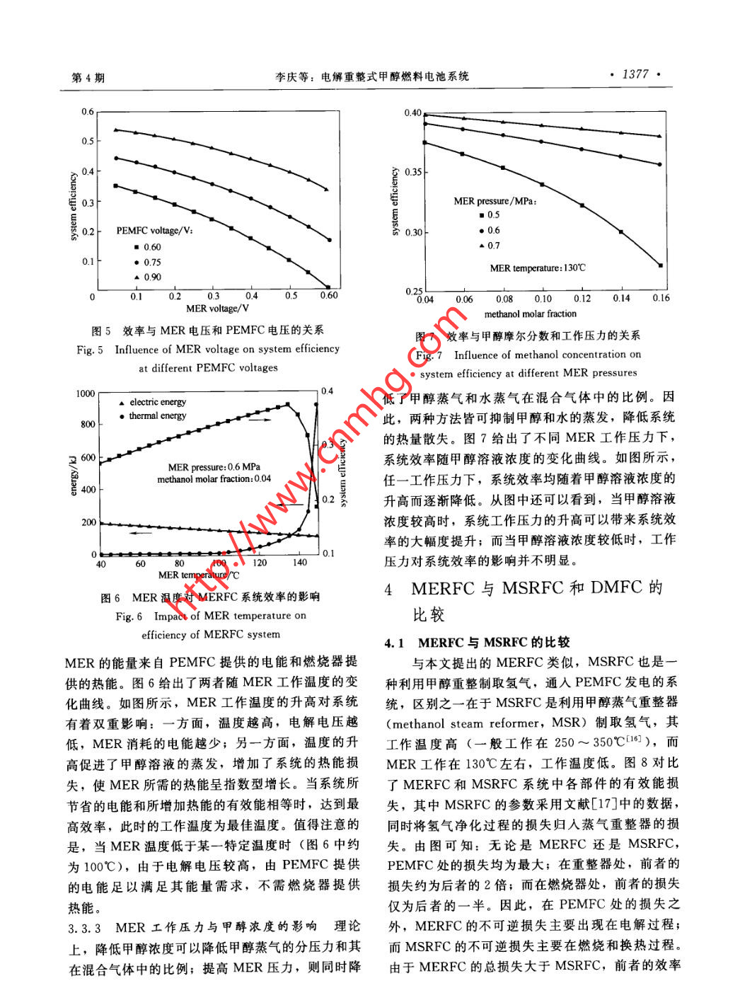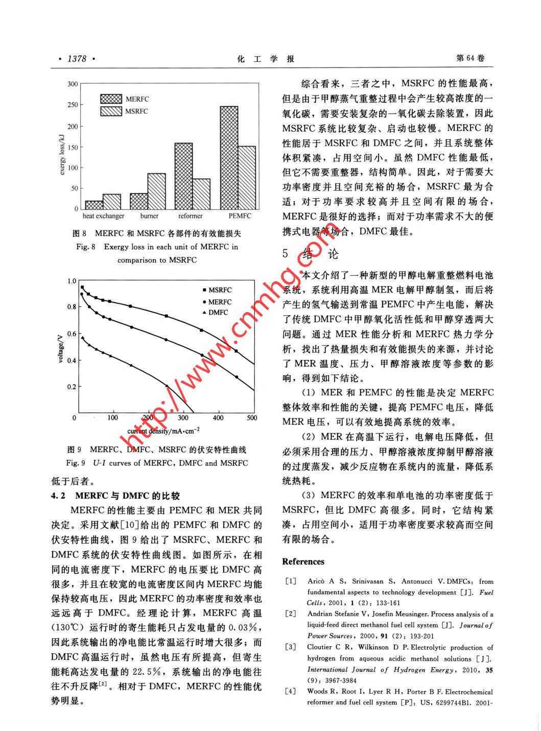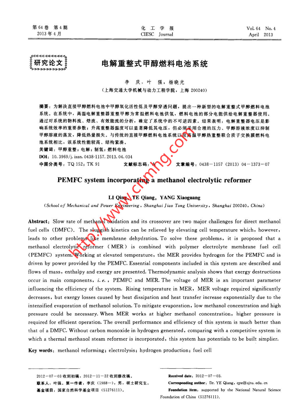 第64卷第4期化工學(xué)報Vol. 64 No. 42013年4月CIESC JournalApril 2013研究論文資電解重整式甲醇燃料電池系統(tǒng).李慶,葉強,楊曉光(上海交通大學(xué)機械與動力工程學(xué)院,上海200240)摘要:為解決直接甲醇燃料電池中甲醇氧化活性低及甲醇穿透問題,提出一種新型的電解重整式甲醇燃料電池系統(tǒng)。在系統(tǒng)中,高溫電解重整器重整甲醇為常溫燃料電池供氫,燃料電池的部分電能供給電解重整器使用。通過對系統(tǒng)的物料流、焓流、有效能流的分析,確定了系統(tǒng)中的不可逆因素。結(jié)果表明:電解重整器電壓是影響系統(tǒng)效率的重要參數(shù);升高重整器溫度可以顯著降低其電壓,但必須采用合理的壓力、甲醇溶液濃度以抑制甲醇溶液的蒸發(fā),降低熱量損失。與傳統(tǒng)的直接甲醇燃料電池系統(tǒng)以及高溫甲醇熱重整聯(lián)合質(zhì)子交換膜燃料電池系統(tǒng)相比,該系統(tǒng)性能較高、結(jié)構(gòu)緊湊。關(guān)鍵詞:甲醇重整;電解;制氫;燃料電池DOI: 10. 3969/j. issn. 0438- 1157.2013. 04. 034中圖分類號: TQ 152; TK 91文獻標(biāo)志碼: A文章編號: 0438- 1157 (2013) 04- 1373-07PEMFC system incorporating a methanol electrolytic reformerLI Qing, YE Qiang, YANG Xiaoguang(School of Mechanical and Power Engineering , Shanghai Jiao Tong University, Shanghai 200240, China)Abstract: Slow rate of methanol oxidation and its crossover are two major challenges for direct methanolfuel cells (DMFC). The sluggish kinetics can be relieved by elevating cell temperature which, however,leads to other problems like membrane dehydration. To solve these problems, it is proposed that amethanol electrolytic reformer ( MER) is combined with polymer electrolyte membrane fuel cell(PEMFC) system. Working at elevated temperature, the MER provides hydrogen for the PEMFC and isdriven by power provided by the PEMFC. Essential components included in this system are described andflows of mass, enthalpy and exergy are presented. Thermodynamic analysis shows that exergy destructionsoccur in main components, i.e. ,PEMFC and MER. The voltage of MER is an important parameterinfluencing the efficiency of the system. Rising temperature in MER, MER voltage required significantlydecreases, but exergy losses caused by heat dissipation and heat transfer increase exponentially due to theintensified evaporation of methanol solution. To mitigate evaporation, low methanol concentration and highpressure could be necessary. When MER works at higher methanol concentration, higher pressure isrequired for efficient operation. The overall performance and efficiency of this system is much better thanthat of a DMFC. Without carbon monoxide in hydrogen generated, comparing with a competitive system inwhich a thermal methanol steam reformer is incorporated, this system has potentials to be built simplier.Key words: methanol reforming; electrolysis; hydrogen production; fuel cell2012-07-03收到初稿,2012- 11- - 22收到修改稿。Received date:聯(lián)系人:葉強。第一作者:李慶(1988-), 男,碩士研究生。Correspoading author: Dr. YE Qiang, qye@ sjtu. edu. cn基金項目:國家自然科學(xué)基金項目(51276111).Foundation item: supported by the National Natural ScienceFoundation of China (51276111).第64卷1374●化工學(xué)報MERPEMFC引言| 150O,+6H*+6e^- - 3H2。O質(zhì)子交換膜燃料電池(PEMFC)采用氫氣作為燃料,性能高,其發(fā)展受制于儲氫問題。直接甲醇燃料電池(DMFC)結(jié)構(gòu)與PEMFC類似,燃料61*+6e^-- - 3H2些3H2- 一6H*+6e^易于儲存,但常溫下甲醇電化學(xué)氧化活性不高,陽極側(cè)極化損失較大。此外,甲醇容易穿透質(zhì)子交換g1 MERFC系統(tǒng)原理圖膜(proton exchange membrane, PEM)到達陰極Fig. 1 Schematic ilustrtion of MERFC system并與陰極側(cè)氧氣直接反應(yīng),形成混合電勢,進一步行壓力低,氣體壓縮功耗較小。同時,MER陰極降低了DMFC性能”。提高DMFC溫度是加快電側(cè)的析氫反應(yīng)不受甲醇穿透的影響,從而避免了化學(xué)反應(yīng)速率,降低活化過電位的有效途徑。然而DMFC中存在的陰極混合電勢損失。因此,MER-高溫下PEM極易失水,為保證其良好潤濕,必須FC系統(tǒng)有望克服制約DMFC性能提高的兩大提高電池運行壓力(特別是陰極側(cè)氣相反應(yīng)物壓難題。力)。氣體增壓功耗很大印,且高溫下甲醇穿透往在MER和PEMFC兩個核心部件之外,往更為嚴重,因此通過提高電池溫度來提升DM-MERFC系統(tǒng)還包括燃料罐、液體泵、換熱器、燃FC系統(tǒng)性能的方法有很大的局限性.燒器和水槽。系統(tǒng)運行流程如圖2(a)所示:燃料隨著甲醇電化學(xué)氧化研究的不斷深入,出現(xiàn)了罐 中輸出的甲醇、水槽輸出的水以及蒸氣冷凝生成- .種新型的制氫方法:甲醇電解制氫[1。甲醇電的甲醇和水,經(jīng)液體泵增壓、換熱器預(yù)熱后,進入解重整器(methanol electrolysis reformer, MER)MER.在MER中,電解反應(yīng)伴隨著甲醇溶液的蒸的結(jié)構(gòu)與DMFC類似,其化學(xué)反應(yīng)方程式如下發(fā),MER輸出的氫氣和二氧化碳兩股氣流中都含CH,OH() + H201)- - . CO,(g) +3H;(g) (1)有飽和的甲醇蒸氣和水蒸氣。在換熱器中冷凝大部MER陽極發(fā)生甲醇電化學(xué)氧化反應(yīng),陰極發(fā)分蒸氣后,氫氣氣流在水槽中除去剩余甲醇蒸氣,生析氫反應(yīng)。析氫反應(yīng)的極化損失極小,電解電壓然后通入PEMFC發(fā)電,部分電能供給MER;仍主要由甲醇電化學(xué)氧化反應(yīng)決定。為降低電解電含有少量甲醇蒸氣的二氧化碳氣流和PEMFC中未壓,MER需高溫運行,此時也需提高陰陽兩極液利用的