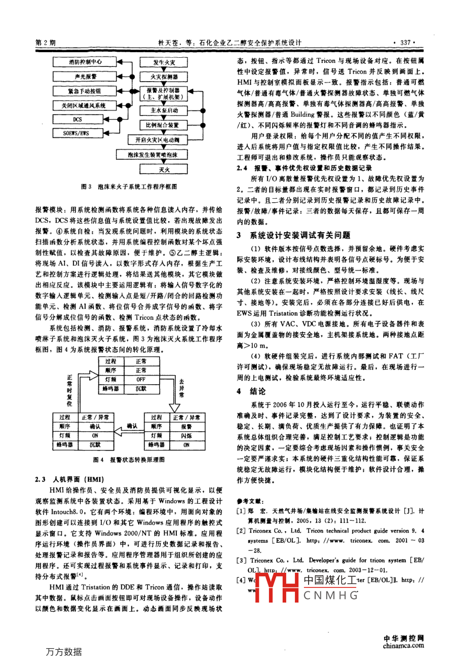 控制技術計算機測量與控制.2009.17(2)Computer Measurement Control335文章編號:1671-4598(2009102-0335-03中圖分類號:TP273文獻標識碼:A石化企業(yè)乙二醇安全保護系統(tǒng)設計杜天蒼,刻華(北京石油化工學院信息工程學院,北京102617)擴要:針對某石化公司乙二醇裝置,設計并實現(xiàn)了一個防止火災和毒氣的安全保護系統(tǒng);利用 Tricon配置了系統(tǒng)硬件,它由主系統(tǒng)、工程師站、SOE站、操作站/臺、檢測單元、聲光報警器等組成,并與DCS和LAN通信;采用 Tristationl131設計了控制邏輯和控制軟件,包含功能相對獨立的5個模塊:與DCS通信,故障和控制過程問題報警、故障報警、系統(tǒng)自檢、主邏輯;應用 Intouch設計了友好的人機界面;進行了系統(tǒng)調(diào)試;系統(tǒng)的應用取得了預期效果關鍵安全保護系統(tǒng); Tricon; Tristationl13l; IntouchDesign of Security and Protection Systemfor EOEG in Petrochemical FactoryDu Tiancang, Liu Hua(Information Engineering School, Beijing Institute of Petrochemical Technology, Beijing 102617, China)and is realized. The system hardware is configured by Tricon of Triconex, that is constituted by main system, engineer workstation, se-quence of events workstation, operation station detection unit and sound-light alarming equipment, it can be communicated with DCS andLAN, The system controlling logic and controlling software are designed by Tristationl131, they include five independent function modules:ontrol process accident alarm, System Alarm, System Diagnoseis designed by Intouch. The system debugging is introduced in the paper. The application of the system brings about expectant effect for theenterprise.Key words: EOEGr security and protection system; Tricon: Tristation1131: Intouch0引言現(xiàn)場檢測器、報警開關、報警燈/蜂鳴器和消防設備相連接,石化生產(chǎn)中的乙二醇裝置處于高溫、高壓、臨氫、易燃實現(xiàn)報警和邏輯處理;EWS用于系統(tǒng)組態(tài)、下裝、調(diào)試、維護和修改運行邏輯,操作站/操作臺監(jiān)控生產(chǎn)裝置運行狀況易爆、有毒介質(zhì)操作環(huán)境中,操作條件苛刻,爆炸和火災危險性極高。為避免災害發(fā)生造成巨大損失,確保裝置和人員安二者互為備用; SOEWS用于報警事件順序記錄,2↑ Mosaic全,裝備可靠的安全保護系統(tǒng)至關重要。本系統(tǒng)是某工程的一模擬面板用于監(jiān)視。1.1 Tricon硬件個子項目,主要用于防止火災和毒氣發(fā)生,它連續(xù)監(jiān)視裝置和環(huán)境中有關信號,在必要時采取保護措施。由于生產(chǎn)工藝的連Tricon將3路分電路隔離、并行的和具有廣泛自診斷功能續(xù)性和復雜性,必須全面考慮引起火災和毒氣事故的可能的控制系統(tǒng)集成為一個系統(tǒng),用3取2表決電路提供高度完善、無差錯、不間斷的過程操作,不會因單點故障而導致系統(tǒng)素,將各因素量化為一點或多點輸人。系統(tǒng)綜合各種因素,經(jīng)失效。其軟硬件通過TaⅤAK6認證。有3個MP(主處理邏輯判斷和處理,將各種狀態(tài)輸出給工作人員,發(fā)生異常則報器)。傳感器信號至輸入模塊被分成隔離的3路,通過3個獨警.它還與DCS相聯(lián),應用網(wǎng)絡技術將各種狀態(tài)發(fā)布給有關立通道分別送到3個MP中,MP間總線按多數(shù)原則表決數(shù)據(jù),并糾正任何輸入數(shù)據(jù)偏差,MP的輸出沿3個通道送到輸1系統(tǒng)組成系統(tǒng)采用 Triconex公司的基于TMR(三重模塊冗余)結構的 Tricon,該結構是目前世界上技術最先進、性能最可靠的緊急停車系統(tǒng)。包含二個機架,如圖1,由 Tricon V9主系統(tǒng)、EwS(工程師站)、 SOEWS(SOE站)、操作站/操作臺、測單元、聲光報警器等組成,并與DCS通信。實現(xiàn)區(qū)域內(nèi)的火災和可燃氣體/有毒氣體的檢測報警和消防聯(lián)動。主系統(tǒng)與收稿日期:2008-08-23;修回日期:2008-09-29中國煤化工作者簡介:杜天蒼(1962-),男,內(nèi)蒙古呼和浩特市人,教授,碩士,C N MH GSOEWS主要從事計算機信息管理與工業(yè)控制方面的研究中華測控網(wǎng)計算機測量與控制出模塊,并冉次表決/選擇。在表決電路中含有總的反饋電路,個激活系統(tǒng)便認為該回路中產(chǎn)生了報警,報警觸點閉合。當切用于對輸出狀態(tài)做最后校驗,診斷潛在故障斷電源、重置探測器后,報警觸點斷開。短路問路時,I>Tricon對每個獨立分電路/模塊/功能電路都進行廣泛自診15.14。開路冋路時,Im<0.49。設備閉合路時(只要有斷,對操作錯誤進行檢測和報告。所有診斷信息均存在系統(tǒng)變一個探測器激活):7.812%中值時產(chǎn)生通道故障,LED指示。接收氣體探測器4~20mA倩號或壓力、流量和電平開關0~20mA信號。②2個監(jiān)督型數(shù)字輸出模塊 TMR SDO3624:24VDC/16點。對每圖2(c)光學煙霧探測器接線出容錯硬件表決;專利四方輸出電路;可以對現(xiàn)場回路和潛在圖2輸入設備環(huán)路圖故障檢測;輸出通道完全隔離;與若干點相連。每個集成機柜里還有:2個8312冗余230VAC/24VDC電源;I/O空槽位模1.5輸出設備回路塊8105若干;4個32點AI擴展端子板(ETP)、6根10米報警回路:每個環(huán)路上只能接一個報警器和驅(qū)動點;電鈴Elco電纜連接ETP和1O模塊、6個16點SDO端子板、現(xiàn)場回路;燈頻回路:每個環(huán)路上只能接一個燈頻和驅(qū)動點;電磁信號接收端子板若干。另外配有2個 Mosaic模擬面板,通過控制閥回路:每個SDO模塊只與一個電磁閥相連。這4個回Modbus協(xié)議與RS485端口供操作員使用路均