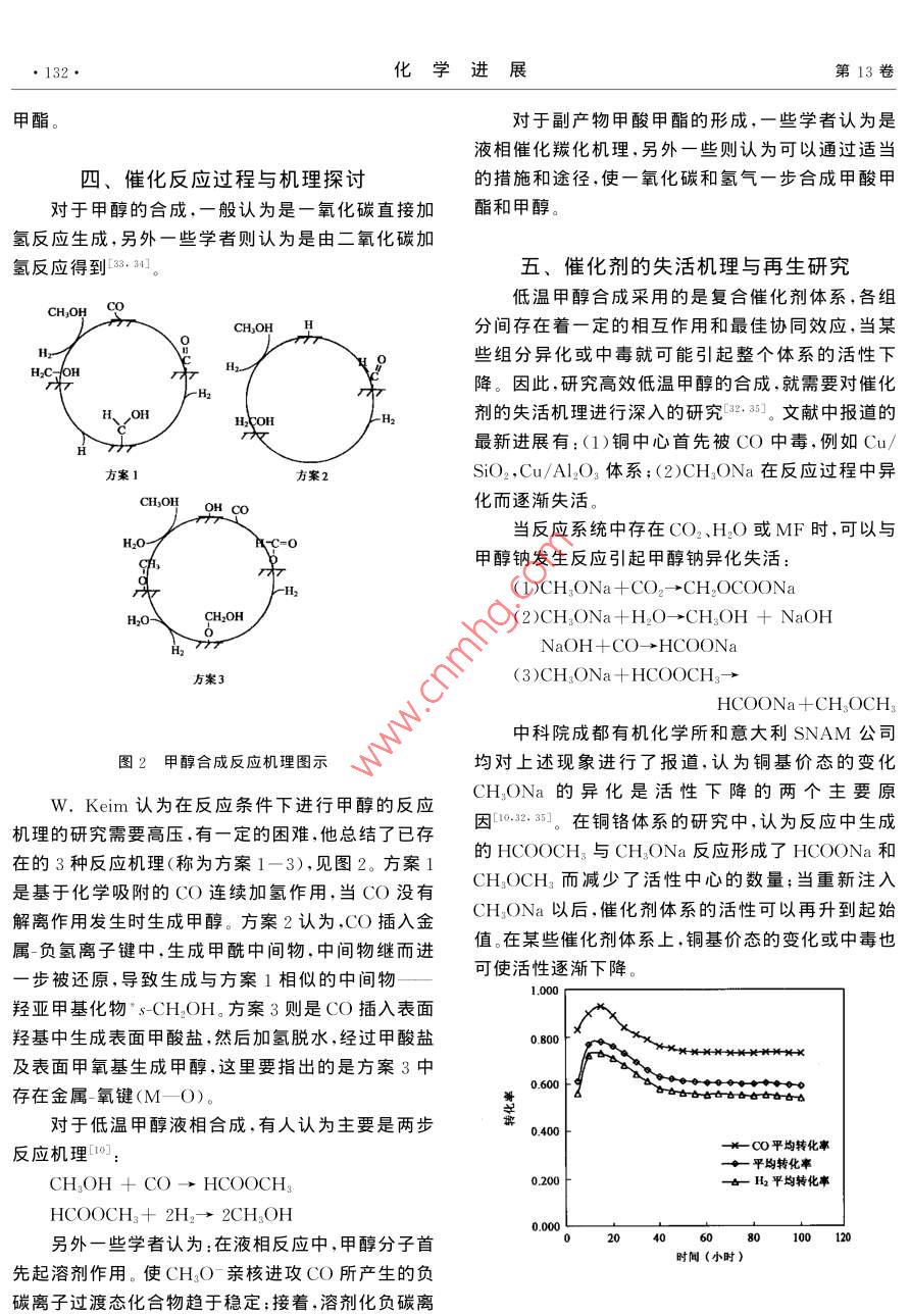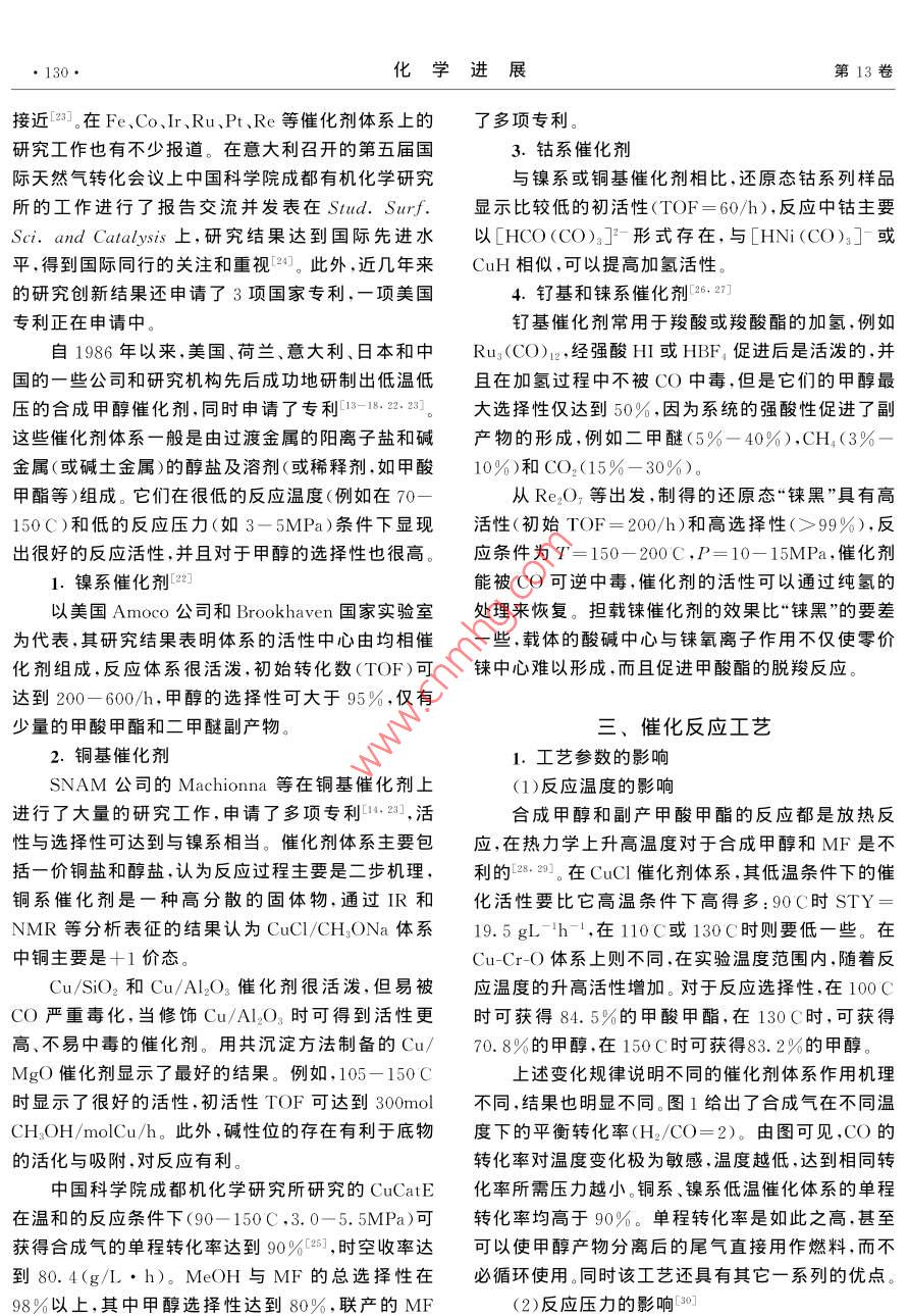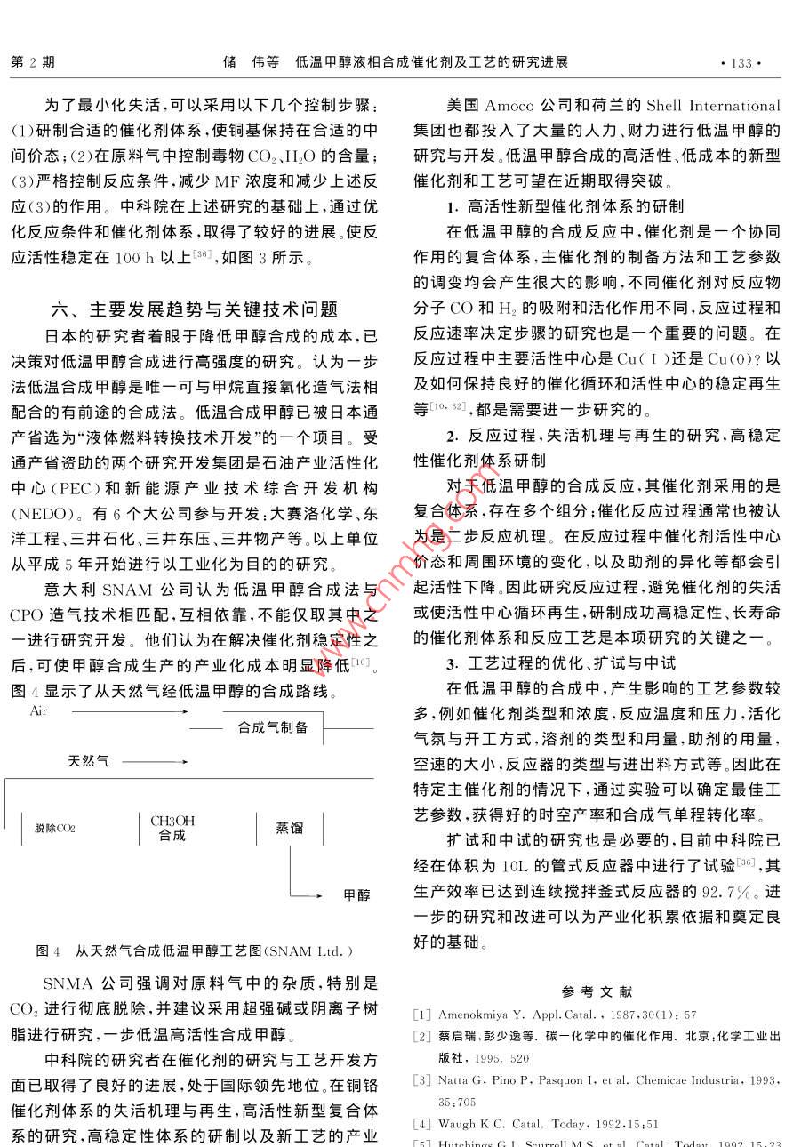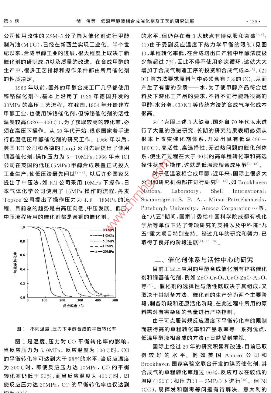 第13卷第2期化學進展2001年3月PROGRESS IN CHEMISTRY2001低溫甲醇液相合成催化劑及工藝的研究進展儲偉吳玉塘羅仕忠(中國科學院成都有機化學研究所成都610041)包信和林勵吾(中國科學院大連化學物理研究所大連116023)摘要本文綜述了低溫液相合成甲醇的發(fā)展歷史、研究現(xiàn)狀和目前存在的關鍵技術問題。重點討論了催化劑體系和活性中心、催化反應過程和工藝、反應機理和失活機理以及催化劑循環(huán)再生的研究。與傳統(tǒng)的甲醇合成方法比較,液相低溫甲醇直接合成方法具有單程轉化率高(90%以上),生產成本低,產品品質優(yōu),反應條件溫和等優(yōu)點。共引用參考文獻36篇。關鍵詞甲醇液相合成催化劑反應工藝機理失活再生活性中心中圖分類號:O643.3;TQ51文獻標識碼:A文章編號:1005-281X(2001)02-0128-0Investigation on the Catalysts and reaction Process for the methanoSynthesis at Lower-Temperature in Liquid PhaseChu Wei Wu Yutang Luo shizhong(Chengdu Institute of Organic Chemistry, Chinese Academy of Sciences, Chengdu 610041, China)Bao Xinhe lin liez( Dalian Institute of Chemical Physics, Chinese Academy of Sciences, Dalian 116023, ChinaAbstract The history and development of methanol synthesis at lower-temperature in liquid phase(MSLTLP), the research situations, and the present key problems of the technology to be solved arereviewed in this paper. The following topics are especially discussed the catalyst systems, active sitesreaction pathways and processes, reaction mechanism and catalyst deactivation mechanism, the catalyre-cycle and regeneration. Comparing the traditional techniques for methanol synthesis, there are a fewadvantages for the MSL TLP method: the high simple-pass conversion (more than 90%), the lowproduction cost, the high grade product quality, the mild and temperate reaction conditions. 36 referencesare citedKey words methanol; liquid phase synthesis; catalyst; reaction process; mechadeactivationregeneration active sites甲醇是碳一化學中一個大噸位的化工產品,近幾十年來,其轉化利用的發(fā)展勢頭迅猛。目前世界甲甲醇是一種極其重要的化工原料,又是一種潛醇年產量已達3000萬噸/年,主要用于生產甲醛在的車用燃料和燃料電池的燃料,因此合成甲醇的甲基叔丁基醚(MTBE)、醋酸、醋酸酐、醋酸甲酯、汽研究和探索,在國際上一直受到重視油添加劑、甲酸甲酯、二甲醚等。此外,美國 MOBIL第2期儲偉等低溫甲醇液相合成催化劑及工藝的研究進展129公司使用改性的ZSM-5分子篩為催化劑進行甲醇的水平,但仍存在著3大缺點有待克服和突破78制汽油(MTG),已經在新西蘭實現(xiàn)工業(yè)化。半個世(1)由于受到反應溫度下熱力學平衡的限制(見圖紀以來,合成甲醇工業(yè)的進展,很大程度上取決于新1),單程轉化率低,在合成塔出口產物中甲醇濃度極催化劑的研制成功以及質量的改進。在合成甲醇的少能超過7%,因此不得不使用多次循環(huán),這就大大生產中,很多工藝指標和操作條件都由所用催化劑增加了合成氣制造工序的投資和合成氣成本7。(2)的性質決定。ICI等方法要求原料氣中必須含有5%的CO2,從而1966年以前,國外的甲醇合成工廠幾乎都使用產生了有害的雜質—水,為了使甲醇產品符合燃鋅鉻催化劑,基本上沿用了1923年德國開發(fā)的料及下游化工產品的要求,不得不進行能耗很高的3oMPa的高壓工藝流程。在我國,1954年開始建立甲醇水分離。(3)ICI等傳統(tǒng)方法的合成氣凈化成本甲醇工業(yè),也使用鋅鉻催化劑,但鋅鉻催化劑的活性很高溫度較高(320400C),為了荻取較高的轉化率,必為了克服上述3大缺點,國外自70年代以來進須在高壓下操作。從50年代開始,很多國家著手進行了大量的改進研究,長期的研究結果表明必須從行低溫低壓甲醇催化劑的研究工作。1966年以后,根本上改變催化劑體系,開發(fā)出具有低溫(90英國ICⅠ公司和西德的 Lurgi公司先后提出了使用180C)、高活性、高選擇性、無過熱問題的催化劑體銅基催化劑,操作壓力為5-10MPa;1966年末ICI系,使生產過程在大于90%的高單程轉化率和高選公司在英國的低壓(5MPa)甲醇合成裝置正式投入擇性狀態(tài)下操作,這就是低溫液相合成甲醇-12。工業(yè)生產,使低壓法最先問世4-6。以后許多國家又對于低溫液相合成甲醇,近年來,國際上很多大提出了中壓法,如IC1公司采用10MPa下操作,日公司和研究機構都在進行研究"-11,如 Brookhaven本氣體化學公司使用了15MPa操作的流程,丹麥 National Laboratory, Shell International,Topsoe公司提出了操作壓力為4.8-18MPa的流 namprogretti S.P.A., Mitsui petrochemicals,程。目前總的趨勢是由高壓向低、中壓發(fā)展。低壓、 Pittsburgh University, Amoco Corporation…等。中壓流程所用的催化劑都是含銅的催化劑。在“八五”期間,國家計委給中國科學院成都有機化學所等單位下達了專項研究的支持以及中科院“九0.IMPa1. 0MPa五”重大項目特別支持。經過幾年的研究和努力,已取得了良好的階段進展115-20二、催化劑體系與活性中心的研究0.4目前工業(yè)上應用的甲醇合成催化劑有鋅鉻催化劑和銅基催化劑,例如 ZnO-Cr2O3、 Cuo-Zno(-Al2等1。催化劑的選擇性與活性既取決于其組成,又取決于其制備方法。催化劑的生產分為兩個主要階反應溫度/c段:制備階段和還原活化階段。在此過程中所用的原料需對有害雜質的含量進行嚴格控制。由于可克服常規(guī)反應溫度下平衡轉化率的限制圖1不同溫度、壓力下甲醇合成的平衡轉化率而獲得高的單程轉化率和產品