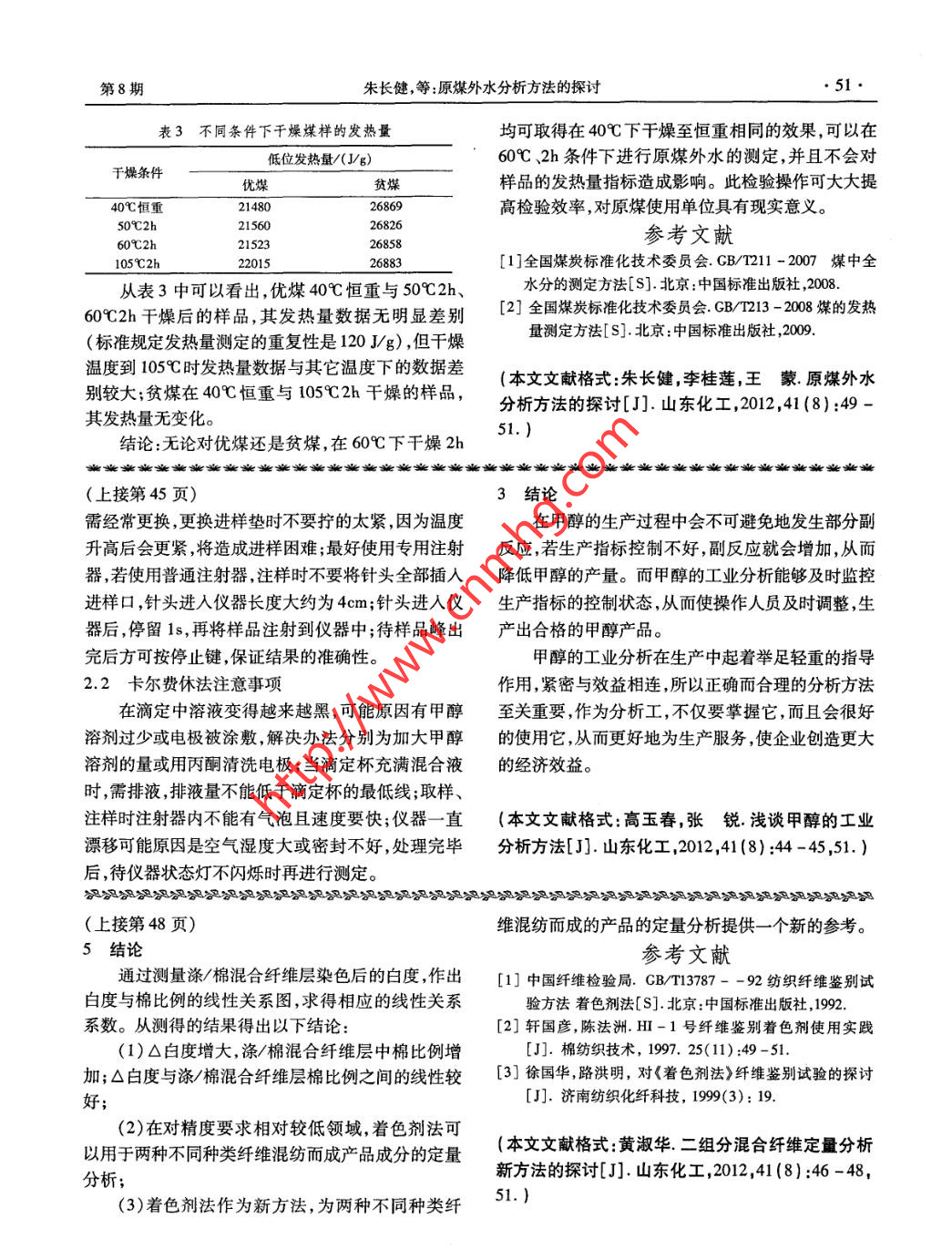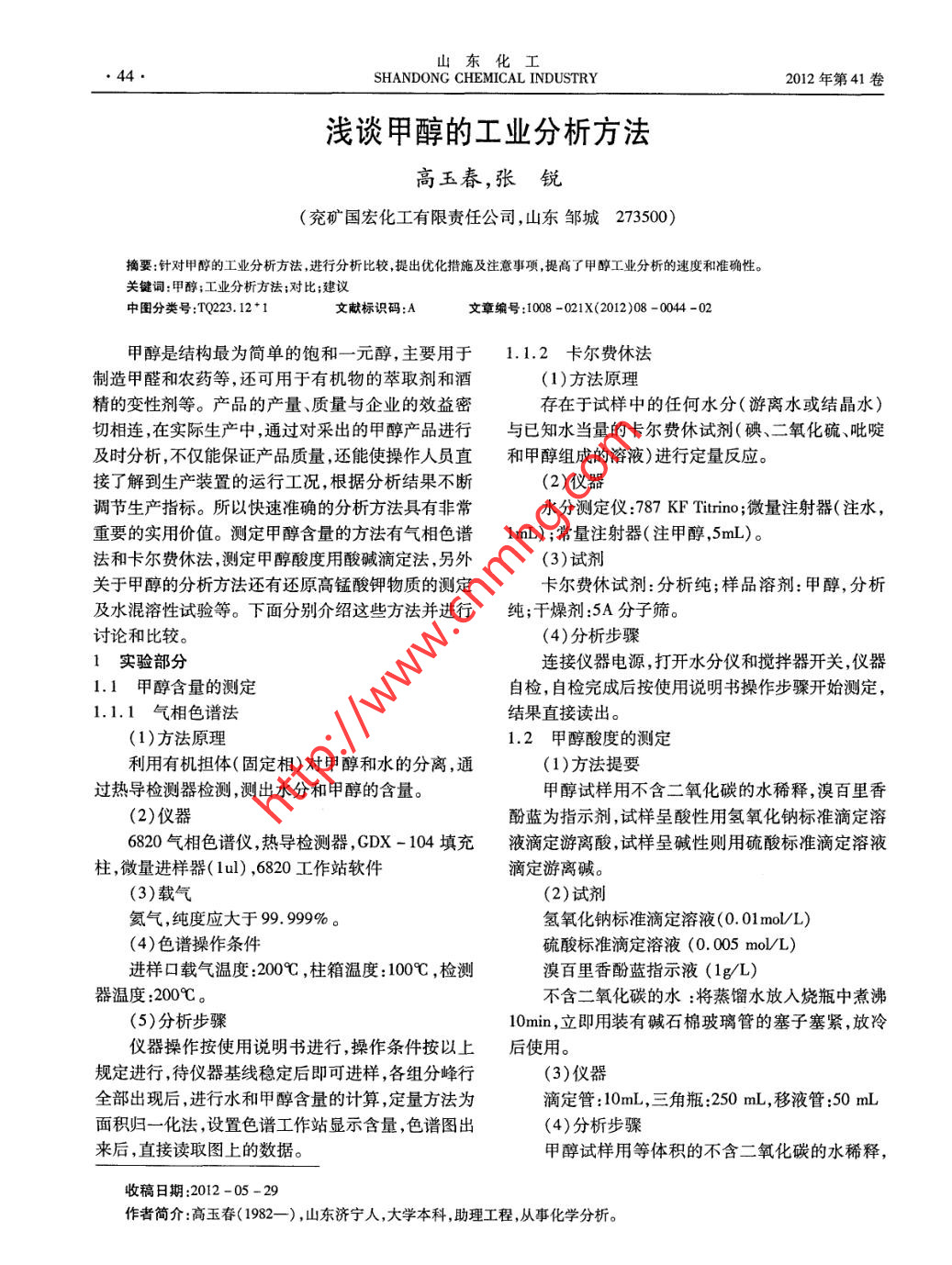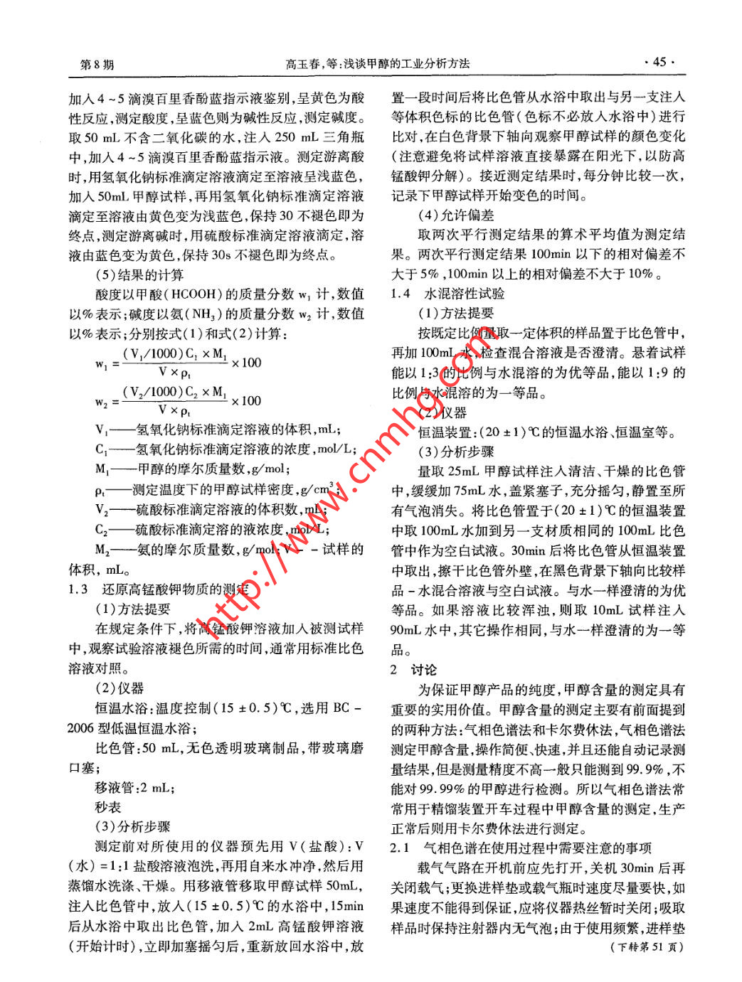 ●44●SHANDONG CHEMICAL INDUSTRY2012年第41卷淺談甲醇的工業(yè)分析方法高玉春,張銳(兗礦國宏化工有限責(zé)任公司,山東鄒城273500)摘要:針對甲醇的工業(yè)分析方法,進行分析比較,提出優(yōu)化揩施及注意事項,提高了甲醇工業(yè)分析的速度和準(zhǔn)確性。關(guān)鍵詞:甲醇;工業(yè)分析方法;對比;建議中圖分類號:TQ223.12+1文獻標(biāo)識碼:A文章編號:1008 -021X(2012)08 -0044 -02甲醇是結(jié)構(gòu)最為簡單的飽和一元醇, 主要用于1.1.2卡 爾費休法制造甲醛和農(nóng)藥等,還可用于有機物的萃取劑和酒(1)方法原理.精的變性劑等。產(chǎn)品的產(chǎn)量、質(zhì)量與企業(yè)的效益密存在于試樣中的任何水分(游離水或結(jié)晶水)切相連,在實際生產(chǎn)中,通過對采出的甲醇產(chǎn)品進行與已知水當(dāng)量的卡爾費休試劑(碘、二氧化硫、吡啶及時分析,不僅能保證產(chǎn)品質(zhì)量,還能使操作人員直和甲醇組成的溶液)進行定量反應(yīng)。接了解到生產(chǎn)裝置的運行工況,根據(jù)分析結(jié)果不斷(2)儀器調(diào)節(jié)生產(chǎn)指標(biāo)。所以快速準(zhǔn)確的分析方法具有非常水分測定儀:787 KF Titrino ;微量注射器(注水,重要的實用價值。測定甲醇含量的方法有氣相色譜1mL) ;常量注射器(注甲醇,5mL)。法和卡爾費休法,測定甲醇酸度用酸堿滴定法,另外(3)試劑關(guān)于甲醇的分析方法還有還原高錳酸鉀物質(zhì)的測定卡爾費休試劑:分析純;樣品溶劑:甲醇,分析及水混溶性試驗等。下面分別介紹這些方法并進行純;干燥劑:5A分子篩。討論和比較。(4)分析步驟1實驗部分連接儀器電源,打開水分儀和攪拌器開關(guān),儀器1.1 甲醇含量的測定自檢,自檢完成后按使用說明書操作步驟開始測定,1.1.1 氣相色譜法結(jié)果直接讀出。(1)方法原理1.2 甲醇酸度的測定利用有機擔(dān)體(固定相)對甲醇和水的分離,通(1)方法提要.過熱導(dǎo)檢測器檢測,測出水分和甲醇的含量。甲醇試樣用不含二氧化碳的水稀釋,溴百里香酚藍為指示劑,試樣呈酸性用氫氧化鈉標(biāo)準(zhǔn)滴定溶6820氣相色譜儀,熱導(dǎo)檢測器,GDX - 104填充液滴定游離酸,試樣呈堿性則用硫酸標(biāo)準(zhǔn)滴定溶液柱,微量進樣器( 1ul) ,6820工作站軟件滴定游離堿。(3)載氣(2)試劑氦氣,純度應(yīng)大于99. 999%。氫氧化鈉標(biāo)準(zhǔn)滴定溶液(0.01mol/L)(4)色譜操作條件硫酸標(biāo)準(zhǔn)滴定溶液(0. 005 molVL)進樣口載氣溫度:2009 ,柱箱溫度:100C ,檢測溴百里香酚藍指示液(1g/L)器溫度:200%。不含二氧化碳的水:將蒸餾水放入燒瓶中煮沸(5)分析步驟10min ,立即用裝有堿石棉玻璃管的塞子塞緊,放冷儀器操作按使用說明書進行,操作條件按以上后使用。規(guī)定進行,待儀器基線穩(wěn)定后即可進樣,各組分峰行(3)儀器全部出現(xiàn)后,進行水和甲醇含量的計算,定量方法為滴定管:10mL,三角瓶:250 mL,移液管:50 mL面積歸一化法,設(shè)置色譜工作站顯示含量,色譜圖出來后,直接讀取圖上的數(shù)據(jù)。甲醇試樣用等體積的不含二氧化碳的水稀釋,收稿日期:2012-05 -29作者簡介:高玉春( 1982- -) ,山東濟寧人,大學(xué)本科,助理工程,從事化學(xué)分析。第8期高玉春,等:淺談甲醇的工業(yè)分析方法加入4 ~5滴溴百里香酚藍指示液鑒別,呈黃色為酸置一段時間后將比色管從水浴中取出與另一支注人性反應(yīng),測定酸度,呈藍色則為堿性反應(yīng),測定堿度。等體積色標(biāo)的 比色管<色標(biāo)不必放人水浴中)進行取50 mL不含二氧化碳的水,注人250 mL三角瓶比對,在白色背景下軸向觀察甲醇試樣的顏色變化中,加入4 ~5滴溴百里香酚藍指示液。測定游離酸(注意避免將試樣溶液直接暴露在陽光下,以防高時,用氫氧化鈉標(biāo)準(zhǔn)滴定溶液滴定至溶液呈淺藍色,錳酸鉀分解)。 接近測定結(jié)果時,每分鐘比較一次,加人50mL甲醇試樣,再用氫氧化鈉標(biāo)準(zhǔn)滴定溶液記錄下甲醇試樣開始變色的時間。滴定至溶液由黃色變?yōu)闇\藍色,保持30不褪色即為(4)允許偏差終點,測定游離堿時,用硫酸標(biāo)準(zhǔn)滴定溶液滴定,溶取兩次平行測定結(jié)果的算術(shù)平均值為測定結(jié)液由藍色變?yōu)辄S色,保持30s不褪色即為終點。果。兩次平行測定結(jié)果100min 以下的相對偏差不(5)結(jié)果的計算大于5% ,100min以上的相對偏差不大于10%。酸度以甲酸( HCOOH)的質(zhì)量分數(shù)w,計,數(shù)值1.4水混溶性試驗以%表示;堿度以氨(NH3)的質(zhì)量分數(shù)w2計,數(shù)值(1)方法提要.以%表示;分別按式( 1)和式(2)計算:按既定比例量取一定體積的樣品置于比色管中,(V,/1000)C, xM;再加100mL水,檢查混合溶液是否澄清。懸著試樣w,=tx 100Vxρ能以1:3的比例與水混溶的為優(yōu)等品,能以1:9的: (V/1000)C2 xM x 100比例與水混溶的為- - 等品。V xp:(2)儀器-氫氧化鈉標(biāo)準(zhǔn)滴定溶液的體積,mL;恒溫裝置:(20 +1)C的恒溫水浴、恒溫室等。-氫氧化鈉標(biāo)準(zhǔn)滴定溶液的濃度,mol/L;(3)分析步驟M,一一甲醇的摩爾質(zhì)量數(shù),g/ 'mol;量取25mL甲醇試樣注人清潔、干燥的比色管ρ.一測定 溫度下的甲醇試樣密度,g/cm' ;中,緩緩加75mL水,蓋緊塞子,充分播勻,靜置至所V2-- -硫酸標(biāo)準(zhǔn)滴定溶 液的體積數(shù), mL;有氣泡消失。將比色管置于(20士1)C的恒溫裝置C2一硫酸標(biāo)準(zhǔn)滴定溶 的液濃度,mol/L; ,中取100mL水加到另- -支材質(zhì)相同的100mL比色M2--氨的摩