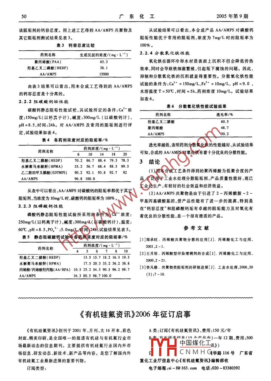 48廣東化工2005年第9期聚丙烯酸、丙烯酸共聚物的合成與應(yīng)用李遠(yuǎn)蘭,陳淑嫻2(1.廣東省石油化工研究院,廣東廣州510665;2.中科院華南植物園,廣東廣州510650)[摘要]介紹了聚丙烯酸、丙烯酸共聚物的合成方法,以及在工業(yè)循環(huán)冷卻水中的應(yīng)用、原理、性能。[關(guān)鍵詞]丙烯酸;共聚物;合成;應(yīng)用Synthesis and Application of Polyacrylic Acid and Acrylic CopolymerLi Yuanlan. Chen Shuxia(1. Guangdong Research Institute of Petro-chemical Industry, Guangzhou 510665;(2. South China Botanical Garden, Chinese Academy of Science, Guangzhou 510650, ChinaAbstract: This paper intraluced the synthetic methods of polyacrylic acid and acrylic copolymer respectively. Inaddition, their mechanism and high performance were studied when used as scale inhibitor and dispersing agent inindustrial circulating cooling water.Keywords: polyacrylic acid; acrylic copolymer; synthetic; application丙烯酸因其聚合的分子量大小的差異,有著不同的用(1)主要原料及規(guī)格途。它廣泛用于石油、采礦業(yè)用分散劑,合成洗滌用分散聚合單體:丙烯酸,聚合級工業(yè)品;引發(fā)劑:過硫酸銨,工劑,印染增稠劑2及工業(yè)循環(huán)冷卻水處理分散阻垢劑。因業(yè)品;鏈轉(zhuǎn)移劑:低碳醇,工業(yè)品;阻聚劑:RS,工業(yè)品。此,在合成方法上采用不同的工藝條件,合成出不同分子量(2)聚合反應(yīng)的聚丙烯產(chǎn)品,以滿足應(yīng)用上的需要。就工業(yè)循環(huán)冷卻水用在一個帶有攪拌、測溫儀、升溫裝置及與高位槽連接的作分散阻垢劑而言,聚丙烯酸為低聚合度的產(chǎn)品,其平均分聚合反應(yīng)釜,將部分的水、鏈轉(zhuǎn)移劑及阻聚劑投放于聚合釜子量在1006000范圍內(nèi)有較好的分散阻垢效果,另外,為中,用氮氣置換聚合釜中的空氣后加熱升溫,當(dāng)溫度升至所提高產(chǎn)品的使用性能和效果,引進其它基團,將丙烯酸與其需的溫度時,停止加熱,并改為冷卻形式,以除去聚合時產(chǎn)生它單體共聚,或與其它水處理藥劑復(fù)配,以得到更好的應(yīng)用過多的熱。將丙烯酸溶液和引發(fā)劑溶液同時加入到聚合反效果。應(yīng)釜中,溫度控制在80-100℃,物料加入時間為1~2h,完1聚丙烯酸畢,保溫繼續(xù)反應(yīng)1-2h,冷卻,得到無色或微黃色透明的溶11聚丙烯酸的合成工藝液狀產(chǎn)物,用烏氏粘度計測定其極限粘度(30℃)為0.055用于工業(yè)水處理劑的聚丙稀酸是以過硫酸鹽為引發(fā)劑0. 10dv go醇類為鏈轉(zhuǎn)移劑添加少量的阻聚劑,在水溶液中將丙烯酸1.2聚丙烯酸性能及應(yīng)用單體聚合而成。產(chǎn)品聚丙烯酸的平均分子量測定是用烏氏此合成產(chǎn)物為低分子量聚電解質(zhì),在水中電離生成帶負(fù)粘度計測定其極限粘度。丙烯酸聚合反應(yīng)表示式為:電荷的陰離子具有強烈的吸附作用,又具有良好的鰲合性能,能有效地阻止水溶液中碳酸鈣、磷酸鈣成垢,同時還能分ncH2=cH-CoOH5發(fā)劑散非沮砂粉塵腐蝕產(chǎn)物和牛物粘泥等,是循環(huán)冷卻水系中國煤化工烯酸可單獨作分散阻H C-OH垢劑CNMHG其它水處理劑如有機磷酸鹽、有機磷酸酯、聚磷酸鹽及其它水處藥劑復(fù)配使用,[收稿日期]2005-08-24作者簡介李遠(yuǎn)蘭(1973-),女,廣東五華人,中專,助理工程師2005年第9期廣東化工高產(chǎn)品使用的綜合性能丙烯酸/2-丙烯酸胺-2-甲基丙基磺酸( AA/AMPS)共聚1.2.1聚丙烯酸對硫酸鈣的阻垢作用物復(fù)配進行阻磷酸鈣試驗試驗是以含Ca2200mg/L,PO用上述合成工藝條件得到的聚丙烯酸,以含有6800mg/5mg/L,pH為8560℃條件下測定阻垢結(jié)果,試驗結(jié)果如表L硫酸鈣的過飽和溶液,在80℃條件下,測定了聚丙烯酸在表1聚丙烯酸對硫酸鈣的穩(wěn)定作用不同的使用濃度,對硫酸鈣過飽和溶液的穩(wěn)定作用。其試驗使用濃度/(mg·L)穩(wěn)定作用/%結(jié)果如表1。從表1結(jié)果可以看出,在低濃度時對硫酸鈣的過飽和溶液隨著使用濃度的增加,穩(wěn)定作用也迅速提高。當(dāng)使用濃度為5mg/L時有較好的穩(wěn)定作用88.381.2.2聚丙烯酸與其它分散阻垢劑復(fù)配后的阻垢作用分散阻垢劑之間相互復(fù)配恰當(dāng),存在著協(xié)同效應(yīng),現(xiàn)與表2阻磷酸鈣結(jié)果聚丙烯酸(A)AA/AMPS(B)(A)投加量/(mg·L-)抑制磷酸鈣/%(B)投加量/(mg·L)抑制磷酸鈣/%(A+B)/%(A+B)/%/%聚丙烯酸80/20AA/AMPS11.519聚丙烯酸/80 AA/AMPS聚丙烯酸60/40 AA/AMPS52336421)80/20 AA/AMPS為80%的丙烯酸與20%的2-丙烯酸胺-2-甲基丙基磺酸共聚產(chǎn)物,其余類推從試驗結(jié)果上看,當(dāng)聚丙烯酸與8020 AA/AMPS共聚2丙烯酸/2-丙烯酰胺-2-甲基丙基磺酸物復(fù)配時,有26%的增值效果;當(dāng)與2080 AA/AMPS共聚物(以下簡稱 AA/AMPS共聚物復(fù)配時,其增減數(shù)為0;而與60/40AA/AMPS共聚物復(fù)配時,A/AMPS是丙烯酸單體與2-丙烯酰胺-2-甲基丙基其增數(shù)為42%,具有較好協(xié)同效應(yīng)作用。藥劑之間復(fù)配的恰磺酸單體在一定的工藝條件下共聚而成的產(chǎn)物。據(jù)文獻(xiàn)報當(dāng)有增效作用;若復(fù)配不恰當(dāng)不僅無增效甚至可能出現(xiàn)道),不同的單體在共聚物阻垢劑分子中可通過不同的作用增值數(shù)為負(fù)數(shù)。所以,藥劑復(fù)配時水垢的抑制作用,大部分機理發(fā)揮不同的阻垢作用。阻碳酸鈣、硫酸鈣垢的主要是羥能產(chǎn)生協(xié)同效應(yīng),但亦有產(chǎn)生激抗作用,是藥劑復(fù)配時要注酸基;羥基、酰胺基等對阻