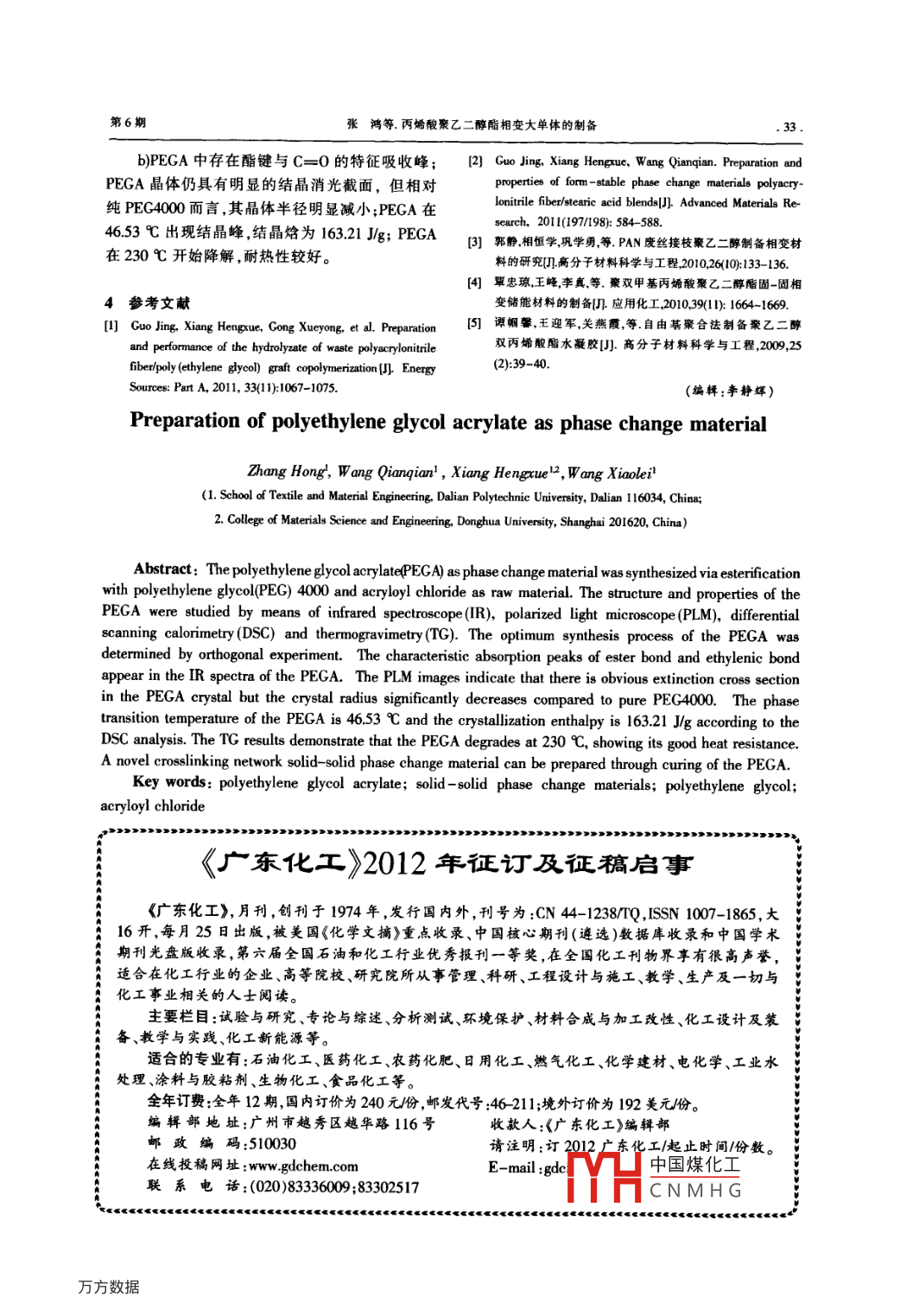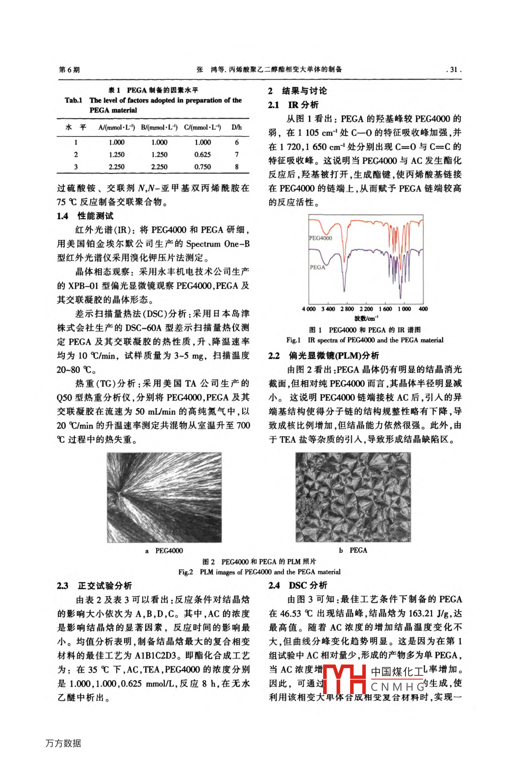 研究與開發(fā)合成樹脂及塑料,2011, 28(6): 30CHINA SYNTHETIC RESIN AND PLASTICS丙烯酸聚乙二醇酯相變大單體的制備張鴻',王倩倩',相恒學(xué)2,王曉磊1(1.大連工業(yè)大學(xué)紡織與材料工程學(xué)院,遼寧省大連市116034;2.東華大學(xué)材料科學(xué)與工程學(xué)院.上海市201620)摘要:以聚乙二醇(PEG)4000及丙烯酰氯為原料.采用酯化法合成了丙烯酸聚乙二醇酯(PEGA)相變大單體。利用紅外光譜(IR)、偏光顯微鏡(PLM)、差示掃描址熱(DSC)、熱重(TC)分析等研究了PECA相變大單體的結(jié)構(gòu)與性能,通過正交實(shí)驗(yàn)獲得PECA的最佳合成工藝。IR顯示PEGA中出現(xiàn)酯鍵及C=C的特征峰;PLM顯示PECA晶體仍有明顯的結(jié)晶消光截面,但相對(duì)純PEC4000而言.其晶體半徑明顯減小;DSC分析表明PEGA在46.53 C出現(xiàn)結(jié)晶峰,結(jié)晶焓為163.21 J/g;TG分析表明PEGA在230 C開始降解.耐熱性較好。PECA交聯(lián)固化后可制得新型交聯(lián)網(wǎng)絡(luò)型固-固相變材料。關(guān)鍵詞:丙烯酸聚乙二醇酯固-固相變復(fù)合材料 聚乙二醇丙烯酰氯中圈分類號(hào): TK0I;TQ341 文獻(xiàn)標(biāo)識(shí)碼:文章編號(hào): 1002-1396(2011)06 -0030-04相變材料是指隨著外界溫度變化,物質(zhì)實(shí)現(xiàn)大,分子鏈端的羥基活性有限,導(dǎo)致直接制備鍵不同相態(tài)的轉(zhuǎn)變,并伴隨能量的吸收及釋放,實(shí)合 型固-固相變復(fù)合材料受到限制。通過對(duì)PEG現(xiàn)局部區(qū)域環(huán)境穩(wěn)定的材料物質(zhì)1-31。該過程具端羥基的基團(tuán)轉(zhuǎn)化,可提高PEC反應(yīng)活性叫。本研有可控性,可用于提高能源利用率。而作為常用究用酰氯法將丙烯酸活性雙鍵引入PEG鏈端,的相變介質(zhì)聚乙二醇(PEG), 由于自身分子鏈制備了性能優(yōu)異的相變大單體[見式(1)、(2)]。CH,=CH- -CO- -Cl+H0(CH2CH2O),H一→>CH2= =CH- -CO- -0(CH2CH2O),H+HCl(1)2CH,=CH-C0- -Cl+H0(CH2CH20).H一 →CH2= =CH- -CO- 0(CH2CH20).- -CO- -CH=CH:+2HCl(2)本研究制備的PEGA相變大單體隨溫度的變山東中瑞化工科技有限公司生產(chǎn)。三乙胺(TEA),化發(fā)生固液態(tài)間的相態(tài)轉(zhuǎn)變,實(shí)現(xiàn)能量的儲(chǔ)存和二氯甲烷(DCM),均為分析純,天津市凱信化學(xué)工釋放。雙鍵的引人使其可與其他聚合物或單體通業(yè)有限公司生產(chǎn)。過接枝、共聚合或交聯(lián)等化學(xué)反應(yīng)得到可控性能1.2 PEGA相變材料的制備的一系列固-固相變材料49,是- -種 全新的制備鍵按表1的正交實(shí)驗(yàn)方案,將定量的PEG4000合型固-固相變材料的研究方法,為制備PEC類溶于DCM中,加入TEA,再緩慢滴加AC。滴加完復(fù)合相變材料的研究開辟了新的方向。畢后升溫至35 C,在氮?dú)獗Wo(hù)下反應(yīng),以乙醚為研究者多采用丙烯酰氯(AC)與低相對(duì)分子質(zhì)沉淀劑,析出PEGA,減壓抽濾。A,B,C,D 分別表量的PEG制備水凝膠或吸水劑,其共聚酯不僅相示AC,TEA ,PEG4000的濃度和反應(yīng)時(shí)間。對(duì)分子質(zhì)量小,且焓值低。本研究用相對(duì)分子質(zhì)量1.3 PEGA交聯(lián)聚合物的制備為4000的PEG與AC反應(yīng),制備了丙烯酸聚乙將所得PEGA溶于去離子水中,加入引發(fā)劑二醇酯(PEGA)相變大單體,并交聯(lián)固化成以PEG為工作介質(zhì)的固-固相變材料,研究了其熱性能。收稿日期: 2011-05- -28;修回日期: 2011-08 -26。作者簡介:張鴻,女,1971 年生,博士,副教授,2008年畢1實(shí)驗(yàn)部分業(yè)于大連理工大學(xué)材料學(xué)專業(yè).從事高分子材料成型與1.1 試齊改性研究中國煤化工m;聯(lián)系電話:PEG ,PEC4000,化學(xué)純;無水乙醚,分析純:均(0411)863MYHCNMH G為國藥集團(tuán)化學(xué)試劑有限公司生產(chǎn)。AC,分析純,基金項(xiàng)目:大連 市科技基金項(xiàng)目(2010J21DW014)。.第6期.張鴻等.丙烯酸聚乙二醇酯相變大 單體的制備.31.表1 PEGA 制備的因素水平2結(jié)果與討論Tab.1 The level of factors adopted in preparation of the.1 IR分析PEGA material從圖1看出: PEGA的羥基峰較PEG4000的水平A/(mmol.L) B/mmolL) C/mmol-L") D/h弱,在1105cm-'處C-0的特征吸收峰加強(qiáng),并1.000在1 720,1 650 cm-1處分別出現(xiàn)C=0與C=C的1.2500.625特征吸收峰。這說明當(dāng)PEG4000與AC發(fā)生酯化2.2500.750反應(yīng)后,羥基被打開,生成酯鍵,使丙烯酸基鏈接過硫酸銨、交聯(lián)劑N,N-亞甲基雙丙烯酰胺在在PEG4000的鏈端上,從而賦予PEGA鏈端較高75 C反應(yīng)制備交聯(lián)聚合物。的反應(yīng)活性。1.4性能測(cè)試紅外光譜(IR):將PEG4000和PEGA研細(xì),PEG4000用美國鉑金埃爾默公司生產(chǎn)的SpectrumOne-B型紅外光譜儀采用溴化鉀壓片法測(cè)定。晶體相態(tài)觀察:采用永豐機(jī)電技術(shù)公司生產(chǎn)的XPB-01型偏光顯微鏡觀察PEG4000,PEGA及其交聯(lián)凝膠的晶體形態(tài)。差示掃描量熱法(DSC)分析:采用日本島津4000 3400 2800 2200 16000 1000 400波數(shù)/cm-'株式會(huì)社生產(chǎn)的DSC-60A型差示掃描量熱儀測(cè)圖1 PEC4000 和PEGA的IR譜圖定PEGA及其交聯(lián)凝膠的熱性質(zhì),升、降溫速率Fig.1 IR spectra of PEG4000 and the PEGA material均為10 C/min,試樣質(zhì)量為3~5 mg,掃描溫度2.2 偏光顯微鏡(PLM)分析20~80 C。由圖2看出:PEGA晶體仍有明顯的結(jié)晶消光熱重(TG)分析:采用美國TA公司生產(chǎn)的截面,但相對(duì)純PEG4000而言,其晶體半徑明顯減Q50型熱重分析儀,分別將PEG4000, PEGA及其小。這說明PEG4000鏈端接枝AC后,引人的異交聯(lián)凝膠在流速為50mL/mi
