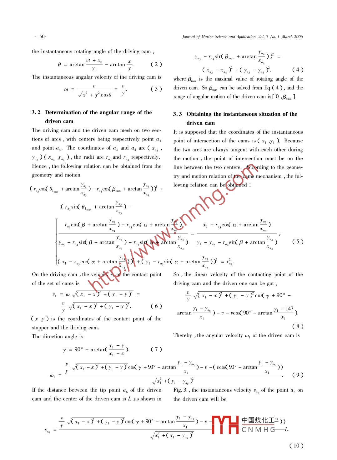Joural of Marine Science and Application ,Vol.5 No. I ,March 2006 pp. 48 -52Simulation and analysis of breechblock mechanismLUO A-ni ,HU Sheng-hai LIU He-ping and ZHANG Jia-taiSchool of Mechanical and Electrical Engineering , Harbin Engineering University , Harbin 150001 , ChinaAbstract .This paper analyzes the motion state and forces of the warship gun breechblock cam. Firstly ,the method of driven cam locking the breechblock safely and reliably can be obtained through analyzingthe force between the driven cam and breechblock. And then according to the geometry and motion rela-tionships between the driving cam , driven cam and stopper , the angular range of camns and the instanta-neous angular velocity of driven cam are obtained. Finally ,with the specific velocity , the velocity-accel-eration curve at the head of the driven cam can be obtained by simulating with the Adams software. Itcan ensure that the driven cam can make the part driven certain velocity in a short time and cannot de-form plastically.Keywords naval gun ; lock-breechblock ; cam ; rillry cartridge extractorCLC number :TJ302Document code :AArticle ID 1671 - 9433( 2006 )01 - 0048 -051 Introductionat an angle. Partl which makes the cartridge case tou-ch with the end of partl ,is pushed by part3 to rotateIn the shooting system of the navalun , the require-rapidly. External force pushes part2 to move down.ment for the motion accuracy of its mechanism is strictAfter part3 gets to the surface of part4 , the springin manufacturing and assembling. But the mechanismdrives part2 to move up rapidly. Part2 is blocked byof the warship gun moves to-and-fro at a high velocity ,hook of partl. Part3 glides on the surface of part4 , andthe impacts between some parts influence the accuracykeeps relatively stationary at an angle ,so part2 isof the motion because of their elastic and plastic de-blocked by partl. When part3 moves to the left side offormations in parts. So ,it is essential to research thepart 4 , the gun body , on which part1 , part2 and part3kinematics and dynamics of the key parts. Accordingre fixed ,moves right. After part3 impacts part4to the results , these important parts are corrected dur-part3 rotates clockwise to original position in order thating manufacturing , assembling and operation , the ac-partl rotates anticlockwise. Part2 is driven to move upcuracy of the motion is improved. [ 11by the spring. These parts move periodically. The to-and-fro velocities of partl , part2 and part3 can reach2 Analyzing the function of the driven2.6 m/s , which is bound to result in impacting.As is shown in Fig. 1 ,part2 moves upwards quickly bycam blocks breechblockthe action of spring force , after part2 impacts partl ,Fig. 1 shows the structure of breechblock. In the struc-the impact force makes partl rotate anticlockwise 2ture part4 is fixed ,part 1 , while part2 and part3 moveThen partl cannot lock part2 , namely breechblock willto-and-fro together with the gun body. Partl , part3 canmove up still. If such a thing happens , then the nextrotate around their axes respectively ,and part2 canshell cannot be put into gun barrel , which will influ-move around vertical direction. When part1 ,part2 andence the smooth operation of the whole system. So it ispart3 move from left side to right side of part4 , part3necessary to ma中國煤化工ler to avoidkeeps in touching with part4 , and rotates anticlockwisesuch phenomenacting onTYHC NMH G^Received date 2005 -06 -28.Foundation item Supported by Harbin Engineering University Fund Projee( NO. HEUFT05071 )..LUO A-ni et al :Simulation and analysis of breechblock mechanism19.breechblock. Fig. 2 ( a ) is the ideal situation. Suchthis way , the angle can ensure the fulillment of loc-impact can make the driven cam lock breechblock reli-king the breechblock safely and reliably.able. Since such force can produce a torque , it drivesthe driven cam to rotate clockwise. Thus the driven3 Analysis on the motion on lock-cam can lock the breechblock more tightly. Mean-breechblock' s camswhile ,if the impact force is the same as Fig. 2( b )shows , the bad results will happen. Because of the an-Fig.3 is the sketch of the cam mechanism. Accordingticlockwise torque , driven cam rotates and makes theto the analysis and the calculation , the mutual impactsspace for breechblock moving continually upwards.among the driving cam , the stopper and the driven camThe mechanism work invalidation , the next shell can-take place on three sections of arcs , the centers ofnot be put.(3]which are the points a a2 and az. The coordinates ofaa2anda3are(x)(Ya)(xn)(Yar)and.(x。)( ya ) respectively. The impact of the drivingcam and the stopper happens on two sections of arcswhose point of intersection is( xapr )(yap ). So whenthe driving cam touches the stopper , its maximal rota-ting angle is0m = arccos.. arctan-"I .arccos(1)1. Driven cam ;2. Breechblock ;√xi +y2Yo23. Driving cam ;4. Limiting position stopperThe angular range of the driving cam is[0 .. ]Fig. 1 Structure of breechblock+a( a )The ideal situation ( b ) The bad resultsFig.2 Forces of stopper on driven camGaFig. 3 Coordinates of the camsThus ,if part3 is demanded to move around the uppersurface of par14 , partl ( driven cam ) can lock part2( breechblock ) , the impact force must be around the3.1 The instantaneous angular velocity of thedriving camleft side of axis. That is to say , the force should pro-duce clockwise torque. Such clockwise torque needsIt is assumed that the pair of cams doesn' t translate,the hook on the driven cam to ensure it. It is to saybut rotate around their own axes , and then the stopperthat the hook on the partl can not be more than 90 de-will translate rightward in motion. The velocity of thegree. Meanwhile , in order to lock the part2 , the anglestopper motion中國煤化工isI(x v)is the coordinat5pact point ,of the hook should not too small. After simulating , the( x vo)is the inuan pount ul Ilitietiunl of the stop-:0HCNMHGangle ran