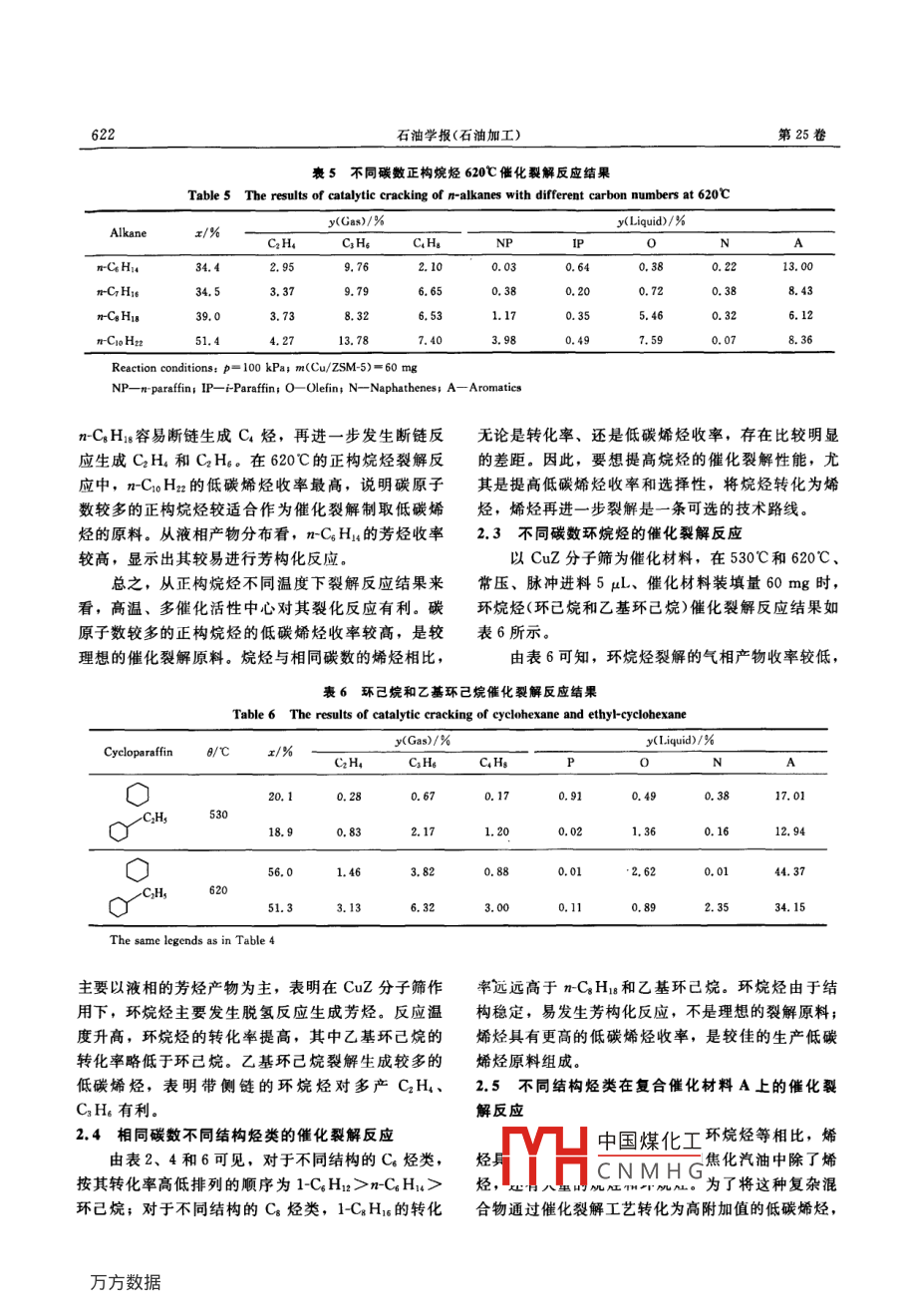 石油學報(石油加工)2009年CTA PETROLEI SINICA (PETROLEUM PROCESSING SECTION)第25卷第5期文章編號:1001-8719(2009)05061906不同烴類催化裂解生產(chǎn)低碳烯烴的性能侯煥娣,張書紅,代振宇,崔德春,李銳(中國石化石油化工科學研究院,北京100083)摘要:為了拓寬乙烯裂解原料并合理利用焦化石腦油資源,研究了烷烴、烯烴、環(huán)烷烴及相同碳數(shù)不同結(jié)構(gòu)烴在Cu改性ZSM5分子篩及其與金屬氧化物復合催化材料上的催化裂解性能。結(jié)果表明,同系物烴類裂解性能隨著碳數(shù)增加,裂解生成低碳烯烴的性能增強;高碳數(shù)的烯烴和烷烴的轉(zhuǎn)化率和低碳烯烴收率較高,是較好的催化裂解生產(chǎn)低碳烯烴的原料。在相同反應條件下,烷烴和環(huán)烷烴的轉(zhuǎn)化率明顯低于相同碳數(shù)烯烴的轉(zhuǎn)化率。復合催化材料A中的金屬氧化物與cu改性ZSM5分子篩之間具有很好的協(xié)同作用,能夠提高烷烴和環(huán)烷烴的裂解活性關(guān)攏詞:烴結(jié)構(gòu);催化裂解;低碳烯烴中圖分類號:TE624.4文獻標識碼:ACATALYTIC PYROLYSIS OF DIFFERENT HYDROCARBONS FOR LIGHT OLEFINSHOU Huan-di, ZHANG Shu-hong, DAI Zhen-yu, CUI De-chun, LI RuiAbstract: The catalytic pyrolysis behaviors of alkanes, olefins and cyclo-alkanes on Cu modifiedZSM-5 and composite catalytic materials were studied in order to broaden the steam crackingfeedstock and utilize the coker naphtha resource properly The results showed that the conversionand the yield of total light olefins increased gradually as the carbon number of feedstock becamelarger. Alkanes and alkenes with larger carbon numbers were better feedstocks for catalyticpyrolysis to produce light olefins. The conversions of alkanes and cyclo-alkanes were much lowerthan that of alkenes under the same reaction conditions. The composite catalytic material a wasused as the catalyst to enhance the conversions of alkanes and cycloalkanes cracking, in which theetal oxide component and Cu modified ZSM-5 had good synergetic effects.Key words: hydrocarbon structure; catalytic pyrolysis; light olefins乙烯、丙烯作為基本的有機化工原料,其用途裂化汽油、減壓瓦斯油和重質(zhì)油-。已有的研究十分廣泛,在國民經(jīng)濟中扮演著非常重要的角色,表明,催化劑和原料性質(zhì)以及反應條件對催化裂解它的發(fā)展帶動著其它基本有機化工產(chǎn)品的發(fā)展。目產(chǎn)品分布有著重要影響。同樣是輕質(zhì)原料,組成不前,生產(chǎn)乙烯和丙烯的主要方法有烴類蒸汽裂解、同,催化裂解所得低碳烯烴的收率可相差約10%。催化裂化、催化裂解以及丙烷脫氫等工藝。與傳統(tǒng)因此,為了更好地了解輕質(zhì)油的催化裂解性能,研的烴類蒸汽熱裂解工藝相比,催化裂解不僅能夠降究不同碳鏈長度、不同碳鏈結(jié)構(gòu)的烴類化合物的裂低反應溫度和能耗,而且可以靈活調(diào)整產(chǎn)品結(jié)構(gòu)。解性能有著非常重要的意義。催化裂解的原料廣泛,包括C4烴、石腦油、催化焦化汽油是延遲焦化工藝的重要產(chǎn)物。近年來中國煤化工收稿日期:2008-11-0基金項目:國家重大基礎研究項目(G2006cB2025006)資助CNMHG訊聯(lián)系人:侯煥娣,Tel:010-82368560;E-mail:hound@rpp-sinopec.com石油學報(石油加工)第25卷由于延遲焦化工藝的快速發(fā)展,焦化汽油的產(chǎn)量逐烴作為原料年遞增。焦化汽油經(jīng)過加氫精制,作為蒸汽裂解原1.2催化材料的制備料可得到較高的低碳烯烴產(chǎn)率,但要增加加氫過程釆用金屬Cu改性分子篩Cu/ZSM5(簡稱的投資和操作費用。焦化汽油中約含有33%烯烴CuZ)和復合催化材料A(簡稱A)作為催化劑。采用(質(zhì)量分數(shù))、45%烷烴(質(zhì)量分數(shù))和12%環(huán)烷烴浸漬法制備CuZ,干燥焙燒后使用,其物化性質(zhì)如(質(zhì)量分數(shù)),可否將焦化汽油直接作為催化裂解原表1所示。參照相關(guān)文獻-0制備復合催化材料A料來生產(chǎn)低碳烯烴是一條值得探索的路線。筆者從將CuZ與金屬氣化物機械混合、壓片成型得到復合烴類組成、結(jié)構(gòu)岀發(fā),考察了烯烴、烷烴及環(huán)烷烴催化材料A,再粉碎為40~60目備用。同系物及相同碳數(shù)不同結(jié)構(gòu)烴類的催化裂解性能,1.3實驗方法及其數(shù)據(jù)處理并在此基礎上,探討了能獲得更高的低碳烯烴收率在脈沖微反色譜上進行不同烴類催化裂解反應。的催化材料應具備的性能。在常壓、530℃和620℃、脈沖進樣量5μL的條件1實驗部分下,考察了烷烴、烯烴和環(huán)烷烴的裂解性能。反應產(chǎn)物直接進入氣相色譜在線分析其組成。定義原料原的轉(zhuǎn)化率為低于反應物碳數(shù)產(chǎn)物質(zhì)量分數(shù)的總和由于焦化汽油餾分主要由C~C12烴類組成,采用固定床反應器,考察了不同催化材料催化不同因此實驗選用C6~C12范圍內(nèi)的烯烴、烷烴和環(huán)烷結(jié)構(gòu)C烴的裂解反應表1cu/ZSM5催化劑物化性質(zhì)Table 1 Physico-chemical properties of catalyst Cu/ZSM-5u(CuO)/%u(Al2O3)/%Acid amount/umol .g)Sget/(m2. 8) Vpore/(cm.g-)0.19510532結(jié)果與討論1個丙烯分子和1個伯正碳離子,反應過程如圖1所示。這兩步反應的難易與其轉(zhuǎn)化率密切相關(guān)2.1不同碳數(shù)烯烴的催化裂解反應表2不同碳數(shù)a烯烴催化裂解反應結(jié)果在530℃、常壓、原料進料量5μL、CuZ裝填Table 2 The results of catalytic cracking of alkenes wit量5mg時,考察了1-C~1C12的催化裂解反應性different carbon numbers能,結(jié)果如表2所示。由表2可見,烯烴轉(z