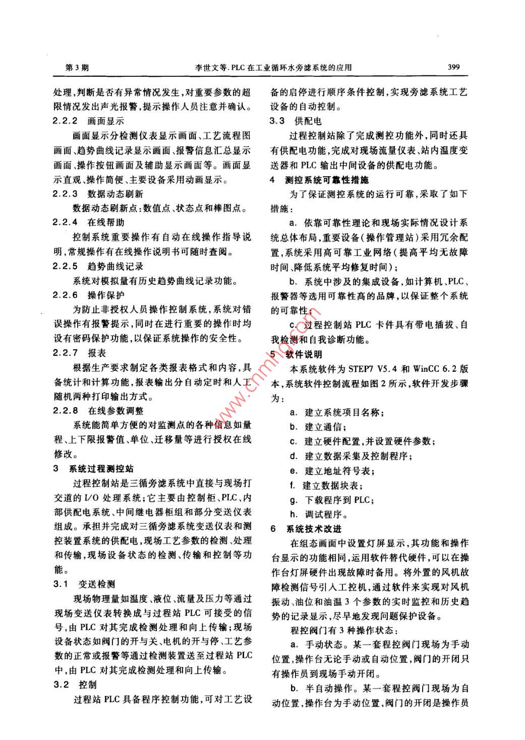 98化工自動化及儀表第40卷PLC在工業(yè)循環(huán)水旁濾系統(tǒng)的應用李世文'馮媛媛’韓濤’(1.大連三星國際企業(yè)集團有限公司,遼寧大連116001 ;2.大連佳爾沃水處理工程技術有限公司,遼寧大連116001)摘要介紹了大慶煉油廠第三循環(huán)水場旁濾系統(tǒng)自動化控制系統(tǒng)的系統(tǒng)配置、軟件編程、控制功能、系統(tǒng)特點及實際應用等內容。關鍵詞PLC HMI 遠程I/0 WinCC STEP7中圖分類號TH865文獻標識碼B文章編號1000-3932(2013 )03-0398-03大慶煉油廠第三循環(huán)水系統(tǒng),肩負著3臺大打印及報表等功能。型冷卻風機,4臺大型循環(huán)水泵的控制和故障狀1.2 軟件系統(tǒng)結構態(tài)顯示,以及旁濾池和中和池兩套順序控制系統(tǒng)三循旁濾控制系統(tǒng)的軟件體系組成主要由組等。該廠第三循環(huán)水場全流程生產線旁濾系統(tǒng)計態(tài)開發(fā)軟件體系和運行軟件體系兩大部分組成。算機自動控制系統(tǒng),基礎自動化PLC控制站由西組態(tài)開發(fā)軟件主要是WinCC 6.2,運行軟件主要門子公司S7-300可編程控制器組成,S7-300是用.是STEP7 V5.4。于中檔性能范圍的可編程序控制器,它的模塊化、2系統(tǒng)操作管理站無排風扇結構、易于實現分布、廣泛的通信性能及系統(tǒng)操作管理站安放于控制室內,主要由操友好的操作界面等特點使得S7-300成為各種中作臺、工控計算機、寬行中文打印機、面板按鈕及規(guī)模控制任務的方便的解決方案。轉換開關、狀態(tài)指示燈屏、報警器及其專用電源等1系統(tǒng)配置組成。承擔并完成對三循旁濾系統(tǒng)的上位監(jiān)督、.1 硬件體系結構操作和管理功能。系統(tǒng)由工業(yè)以太網接口將上位機與PLC站2.1 硬件結構及配置組成工業(yè)以太網,CPU與遠程I/0通過PROFI-系統(tǒng)的操作管理站使操作人員能通過鍵盤或BUS網構成現場設備網,系統(tǒng)構成如圖1所示。者鼠標靈活、方便、準確地監(jiān)視各種過程變量,以計算機維護站計算機操作站及根據流程變化調整過程參數等;操作管理站采用開放結構,選用可靠的工業(yè)控制機,并配以其他優(yōu)選設備,組成一個完整的操作員操作管理系統(tǒng)。系統(tǒng)操作管理站硬件配置:a.工業(yè)操作臺;b.工業(yè)控制計算機(CPU Intel 酷睿i3 530、2G內存、500G硬盤、1G顯卡、液晶顯示器);C.打印機(HP P1007);PROFIBUS-DPd.狀態(tài)指示燈屏(5x8矩陣式,帶確認試驗按鈕、蜂鳴器及專用電源)。圖1系統(tǒng)構成示意 圖2.2主要功能整個系統(tǒng)由兩個操作管理站、一個PLC過程2.2.1信號 檢測處理控制站、兩個PLC遠程站和一個按鈕操作指示臺對現場模擬量和開關量信號進行實時檢測和組成,用于完成對三循旁濾系統(tǒng)的工藝參數檢測顯示、設備狀態(tài)檢測顯示控制和信息儲存、查閱、收稿日期:2013-01-11(修改稿)第3期李世文等.PLC在工業(yè)循環(huán)水旁濾系統(tǒng)的應用399處理,判斷是否有異常情況發(fā)生,對重要參數的超備的啟停進行順序條件控制,實現旁濾系統(tǒng)工藝限情況發(fā)出聲光報警,提示操作人員注意并確認。設備的自動控制。2.2.2畫面顯示3.3供配電畫面顯示分檢測儀表顯示畫面、工藝流程圖.過程控制站除了完成測控功能外,同時還具畫面、趨勢曲線記錄顯示畫面、報警信息匯總顯示有供配電功能,完成對現場流量儀表、站內溫度變畫面、操作按鈕畫面及輔助顯示畫面等。畫面顯送器和PLC輸出中間設備的供配電功能。示直觀、操作簡便、主要設備采用動畫顯示。4測控系統(tǒng)可靠性措施2.2.3數據 動態(tài)刷新為了保證測控系統(tǒng)的運行可靠,采取了如下數據動態(tài)刷新點:數值點、狀態(tài)點和棒圖點。措施:2.2.4在線幫助a.依靠可靠性理論和現場實際情況設計系控制系統(tǒng)重要操作有自動在線操作指導說統(tǒng)總體布局,重要設備(操作管理站)采用冗余配明,常規(guī)操作有在線操作說明書可隨時查閱。置,系統(tǒng)采用高可靠工業(yè)網絡(提高平均無故障2.2.5趨勢曲線記錄時間、降低系統(tǒng)平均修復時間); .系統(tǒng)對模擬量有歷史趨勢曲線記錄功能。b.系統(tǒng)中涉及的集成設備,如計算機、PLC、2.2.6操作 保護報警器等選用可靠性高的品牌,以保證整個系統(tǒng)為防止非授權人員操作控制系統(tǒng),系統(tǒng)對錯的可靠性;誤操作有報警提示,同時在進行重要的操作時均c.過程控制站PLC卡件具有帶電插拔、自設有密碼保護功能,以保證系統(tǒng)操作的安全性。我檢測和自我診斷功能。2.2.7報表5軟件說明根據生產要求制定各類報表格式和內容,具本系統(tǒng)軟件為STEP7 V5.4和WinCC 6.2版?zhèn)浣y(tǒng)計和計算功能,報表輸出分自動定時和人工本,系統(tǒng)軟件控制流程如圖2所示,軟件開發(fā)步驟隨機兩種打印輸出方式。為:2.2.8在線參 數調整a.建立系統(tǒng)項目名稱;系統(tǒng)能簡單方便的對監(jiān)測點的各種信息如量b. 建立通信;程、上下限報警值、單位、遷移量等進行授權在線C.建立硬件配置,并設置硬件參數;修改。d.建立數據采集及控制程序;3系統(tǒng)過程測控站e.建立地址符號表;過程控制站是三循旁濾系統(tǒng)中直接與現場打f. 建立數據塊表;交道的I/0處理系統(tǒng);它主要由控制柜、PLC、內g.下載程序到PLC;部供配電系統(tǒng)、中間繼電器柜組和部分變送儀表h.調試程序。組成。承擔并完成對三循旁