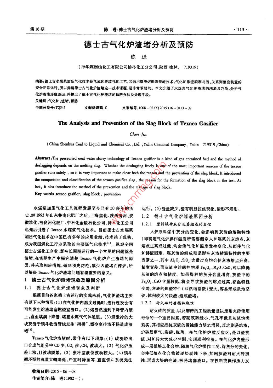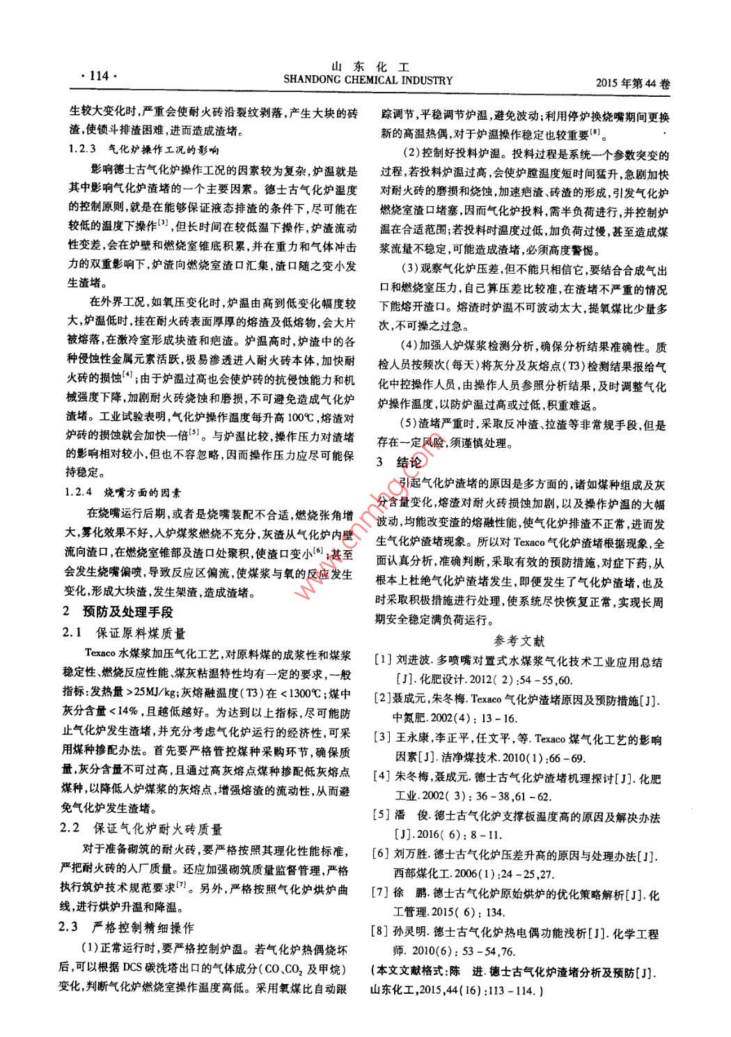 第16期陳進(jìn):德士古氣化爐渣堵分析及預(yù)防.●113●德士古氣化爐渣堵分析及預(yù)防陳進(jìn)(神華煤制油化工有限公司榆林化工分公司,陜西榆林,719319)摘要:德士古水煤漿加壓氣化技術(shù)是氣流床連續(xù)氣化工藝,其采用煤渣熔融態(tài)排渣技術(shù),氣化爐排液順利與否,關(guān)系到整套裝置的安全正常運(yùn)行,所以弄清德士古氣化爐渣堵這-技術(shù)課題 ,是非常重要的。本文介紹了水煤漿氣化爐渣堵的現(xiàn)象及判斷,分析氣化爐渣堵形成原因,并提出了德士古氣化爐渣堵的預(yù)防辦法及處理手段。關(guān)鍵詞:氣化爐;渣堵;預(yù)防中團(tuán)分類號(hào):TQS45文獻(xiàn)標(biāo)識(shí)碼:C文章編號(hào):1008 -021X(2015)16 -0113 -02The Analysis and Prevention of the Slag Block of Texaco GasifierChen Jin(China Shenhua Coal to Liquid and Chemical Co. ,Ltd. ,Yulin Chemical Company, Yulin 719319 ,China)Abstract:The pressuried coal water slurry technology of Texaco gasifer is a kind of gas entrained bed and the method ofdelagging deponds on the melting slag. Whether the deslagging feely is one of the most important reasons of the texacogasifer runs safely,so it is very important to make clear both the reason and the prevention of the slag block. It introducedthe composition and cassication of the texaco gasifier slag, the reason for the formation of the slag block in the tex. Atlast, it also introduce the method of the prevention and the manage of slag block.Key words:texaco gasifer; slag block; prevention水煤漿加壓氣化工藝流程發(fā)展至今已有50多年的歷運(yùn)行。(5)渣量減少,渣有明顯拉絲現(xiàn)象,渣形不規(guī)則。史,繼1993年山東魯南化肥廠之后,上海焦化、陜西渭河、安1.2 德士古氣化爐堵渣原因分析徽準(zhǔn)化、浩良河化肥廠、中石化金陵石化公司神木化工公司.2.1 原料煤種灰分及其組成的變化也先后引進(jìn)了Texaco 水煤漿氣化技術(shù)。目前德士古水煤漿人爐原料煤中灰分的變化,會(huì)影響到灰渣的熔融特性加壓氣化技術(shù)在中國(guó)已有多年的應(yīng)用業(yè)績(jī),技術(shù)趨于成熟,(即確定氣化爐操作溫度所需要測(cè)定人爐煤漿的灰熔點(diǎn),灰成為我國(guó)煤化工行業(yè)采取的主要煤氣化技術(shù)"。縱觀全國(guó)熔點(diǎn)過高或過低,均會(huì)使氣化爐溫度發(fā)生變化,從而使氣化德士古煤化工企業(yè),影響長(zhǎng)周期運(yùn)行的一一個(gè)常見的問題就是爐排渣困難。煤灰渣的組成則是影響灰渣粘溫特性的主要渣堵,在實(shí)際生產(chǎn)中探究清楚Texaco氣化爐產(chǎn)生渣堵的原因素之- ,其中AL20,、SiO2含量過高均會(huì)使灰渣熔點(diǎn)升高,因,并采取相應(yīng)措施,做到預(yù)先防范,減少因渣堵而停爐,所粘度變差,而灰渣中的堿性物質(zhì)Fe203、MgO、CaO,可以降低以解決Texaco氣化爐渣堵問題有著重要的意義?;以娜埸c(diǎn)和粘度。如果煤種的灰分含量增高,灰渣中的1德士古氣化爐渣堵現(xiàn)象及原 因分析Fe2O,、CaO含量較低,將會(huì)導(dǎo)致灰渣的熔點(diǎn)過高,粘溫特性1.1德士古氣化爐渣堵現(xiàn)象及 判斷變差,灰渣的焦渣特性(即粘結(jié)指數(shù))變大,容易形成質(zhì)地堅(jiān)根據(jù)目前各家德士古運(yùn)行的實(shí)踐來看,氣化爐渣堵主要硬、體積較大的塊渣,造成渣堵。有以下三種情形;(1)在氣化爐內(nèi)溫度過低時(shí),進(jìn)行連投會(huì)有1.2.2耐火磚的磨損和燒蝕可能發(fā)生熔渣堵塞燃燒室渣口。(2)熔渣粘掛到下降管內(nèi)壁耐火磚的質(zhì)量,以及砌磚的工程質(zhì)量是決定耐火磚使用上,直至填滿下降管,堵塞水煤氣氣體通道。(3)經(jīng)激冷的大壽命的一個(gè)重要因素,若砌筑磚縫小,氣孔率低且灰漿飽滿塊灰渣于鎖斗收渣管線發(fā)生“架橋”,激冷室排渣不暢造成渣緊實(shí),其相應(yīng)抵抗灰渣的侵蝕能力隨之增強(qiáng),反之則易結(jié)渣,堵[2。爐磚易竄氣,裂縫,脫落。在氣化爐爐膛反應(yīng)區(qū),是以渣抗Texaco 氣化爐渣堵時(shí),常伴有以下現(xiàn)象:(1)碳洗塔出渣,對(duì)爐磚大大減少?zèng)_涮,實(shí)現(xiàn)順利排渣。在氣化爐內(nèi)壁形口合成氣組分中CO少,CO2多,CH,波動(dòng)大。(2) 氣化爐壓成一層低熔 點(diǎn)化合物,隨著氣化爐操作工況煤灰分的變化,差上漲,且波動(dòng)頻繁。(3) 激冷室液位波動(dòng)較大。(4)鎖斗會(huì)使低熔點(diǎn)化合物被逐層剝蝕下來,加劇灰渣對(duì)耐火磚損循環(huán)泵的流量大幅降低,嚴(yán)重時(shí)降至零,直至鎖斗系統(tǒng)無法蝕,形成大塊的疤渣, 極易堵塞渣口。在投料或操作壓力發(fā)收稿日期:2015-06-08作者簡(jiǎn)介:陳進(jìn)(1982-),I東化..?!?14.SHANDONC CHEMICAL INDUSTRY2015年第44卷生較大變化時(shí),嚴(yán)重會(huì)使耐火磚沿裂紋剝落,產(chǎn)生大塊的磚蹤調(diào)節(jié),平穩(wěn)調(diào)節(jié)爐溫,避免波動(dòng);利用停爐換燒嘴期間更換渣,使鎖斗排渣困難,進(jìn)而造成渣堵。新的高溫?zé)崤?對(duì)于爐溫操作穩(wěn)定也較重要'。.1.2.3氣化爐操作 工況的影響(2)控制好投料爐溫。投料過程是系統(tǒng)個(gè)參數(shù)突變的影響德士古氣化爐操作工況的因素較為復(fù)雜,爐溫就是過程,若投料爐溫過高,會(huì)使?fàn)t膛溫度短時(shí)間猛升,急劇加快其中影響氣化爐渣堵的一個(gè)主要因素。德士古氣化爐溫度對(duì)耐火磚的磨損和燒蝕,加速疤渣、磚渣的形成,引發(fā)氣化爐的控制原則,就是在