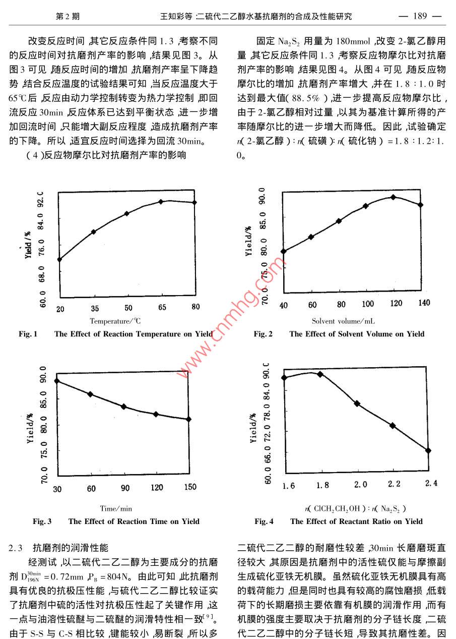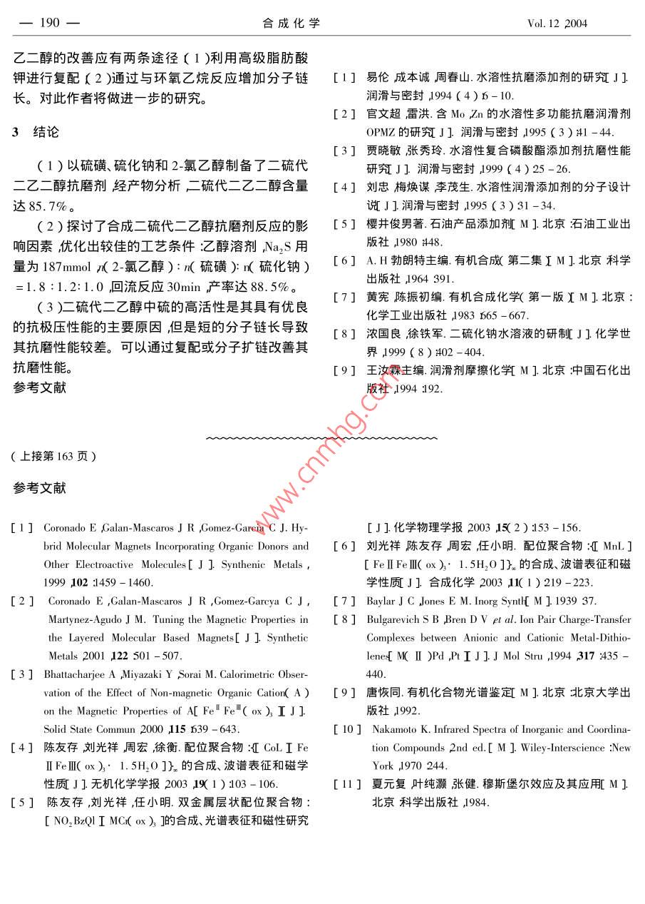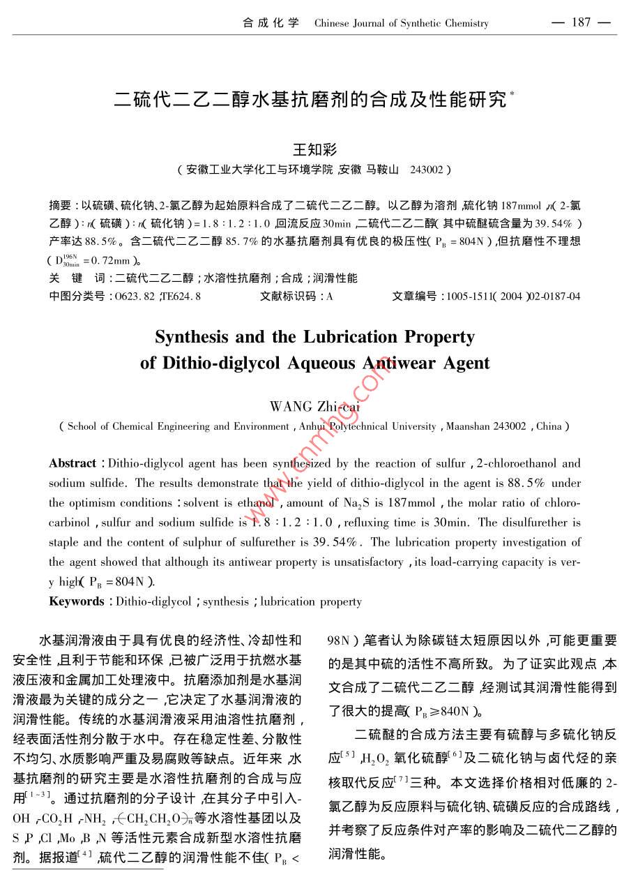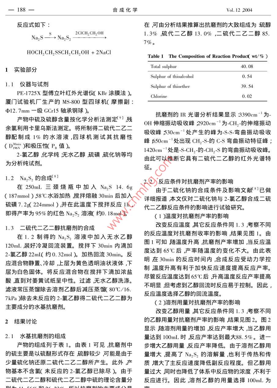 合成化學(xué) Chinese Journal of Synthetic Chemistry187二硫代二乙二醇水基抗磨劑的合成及性能研究王知彩安徽工業(yè)大學(xué)化工與環(huán)境學(xué)院安徽馬鞍山243002)摘要:以硫磺、硫化鈉、2-氯乙醇為起始原料合成了二硫代二乙二醇。以乙醇為溶劑硫化鈉187moκ2·氯乙醇):κ硫磺):κ硫化鈉)=1,8:1.2:1.0冋回流反應(yīng)30min匚硫代二乙二釀`其中硫醚硫含量為39.54%)產(chǎn)率達(dá)8.5%。含二硫代二乙二醇85.7%的水基抗磨劑具有優(yōu)良的極壓性(P=804N),但抗磨性不理想(D3o=0.72mm關(guān)鍵詞:二硫代二乙二醇;水溶性抗磨劑;合成;潤滑性能中圖分類號:0623.82丌TF624.8文獻(xiàn)標(biāo)識碼:A文章編號:1005-1511(200402018704Synthesis and the lubrication Propertyof Dithio-diglycol Aqueous Antiwear AgentWANG Zhi-caSchool of Chemical Engineering and Environment Anhui Polytechnical University Maanshan 243002, ChinaAbstract: Dithio-diglycol agent has been synthesized by the reaction of sulfur 2-chloroethanol andsodium sulfide. The results demonstrate that the yield of dithio-diglycol in the agent is 88. 5% underthe optimism conditions: solvent is ethanol, amount of Na, S is 187mmol, the molar ratio of chlorocarbinol, sulfur and sodium sulfide is 1.8:1.2: 1.0, refluxing time is 30min. The disulfurether isstaple and the content of sulphur of sulfurether is 39. 54%. The lubrication property investigation ofthe agent showed that although its antiwear property is unsatisfactory its load-carrying capacity is ver-y higH( PB=804N)Keywords: Dithio-diglycol synthesis i lubrication property水基潤滑液由于具有優(yōu)良的經(jīng)濟(jì)性、冷卻性和98N)筆者認(rèn)為除碳鏈太短原因以外,可能更重要安全性且利于節(jié)能和環(huán)保已被廣泛用于抗燃水基的是其中硫的活性不高所致。為了證實(shí)此觀點(diǎn)本液壓液和金屬加工處理液中??鼓ヌ砑觿┦撬鶟櫸暮铣闪硕虼叶冀?jīng)測試其潤滑性能得到滑液最為關(guān)鍵的成分之一它決定了水基潤滑液的潤滑性能。傳統(tǒng)的水基潤滑液采用油溶性抗磨劑了很大的提高PB≥840N經(jīng)表面活性劑分散于水中。存在穩(wěn)定性差、分散性二硫醚的合成方法主要有硫醇與多硫化鈉反不均勻、水質(zhì)影響嚴(yán)重及易腐敗等缺點(diǎn)。近年來水應(yīng)3〕H2O2氧化硫醇6及二硫化鈉與鹵代烴的親基抗磨劑的研究主要是水溶性抗磨劑的合成與應(yīng)核取代反應(yīng)三種。本文選擇價(jià)格相對低廉的2用1-3通過抗磨劑的分子設(shè)計(jì)在其分子中引入OH;CO2HNH2,∈CH2CH2O等水溶性基團(tuán)以及氯乙醇為反應(yīng)原料與硫化鈉、硫磺反應(yīng)的合成路線SPCI Mo, B,N等活性元素合成新型水溶性抗磨并考察了反應(yīng)條件對產(chǎn)率的影響及二硫代二乙醇的劑。據(jù)報(bào)道41,硫代二乙醇的潤滑性能不佳(Pn<潤滑性能。188合成化學(xué)Vol.122004反應(yīng)式如下:在可由分析結(jié)果推算出抗磨劑的大致組成為巰醇2CICH, CH, OH1.3%硫代二乙醇13.0%,二硫代二乙二醇857%HOCH. CH SSCH CHOH +2NacTable 1 The Composition of Reaction Product wt/%)1實(shí)驗(yàn)部分Total sulphur40.08Sulphur of thioalcohol0.541.1儀器與試劑PE-1725X型傅立葉紅外光譜儀KBr涂膜法)Chlorine0.02廈門試驗(yàn)機(jī)廠生產(chǎn)的Ms-800型四球機(jī)(摩擦副:Φ12.7mm-級GCrl5軸承鋼球)產(chǎn)物中硫及硫醇含量按化學(xué)分析法測定”殘抗磨劑的IR光譜分析結(jié)果顯示:3390cm-1為余氯利用卡里烏斯法測定。將所制得二硫代二乙~OH伸縮振動(dòng)吸收峰2920cm-1為CH2-的伸縮振動(dòng)醇配制成1%的水溶液,四球機(jī)測試其抗磨性吸收峰530cm-處產(chǎn)生的峰為-S-S彎曲振動(dòng)吸收(D)和極壓性P值峰50cmˉ處岀現(xiàn)CH,-S-的CS彎曲振動(dòng)特征峰1420cm-處是-S-CH2-的-CH2S的彎曲振動(dòng)吸收峰。2-氯乙醇化學(xué)純無水乙醇硫磺硫化鈉等均為分析純試劑由此可以推斷它具有二硫代二乙醇的紅外光譜特征1.2Na2S2的合成312.2反應(yīng)條件對抗磨劑產(chǎn)率的影響在250mL三頸燒瓶中加入Na2S14.6由于二硫化鈉的合成條件及影響文獻(xiàn)8已做187mmol)58℃水浴加熱攪拌熔融30min后加入詳細(xì)報(bào)道本文僅對二硫化鈉與2氯乙醇合成二硫硫磺7222mo),并在此溫度下攪拌反應(yīng)lh,代二乙醇反應(yīng)條件的影響進(jìn)行試驗(yàn)研究。即得產(chǎn)率為95%的紅色Na2S2溶液約0.18mol(1)溫度對抗磨劑產(chǎn)率的影響1.3二硫代二乙二醇抗磨劑的合成改變反應(yīng)溫度其它反應(yīng)條件同1.3考察不同在1.2制得的Na2S2溶液中加入無水乙醇的反應(yīng)溫度對抗磨劑收率的影響結(jié)果見圖1。由120mL裝好冷凝回流裝置。攪拌下30min內(nèi)滴加圖1可知隨溫度升高抗磨劑產(chǎn)率增加當(dāng)反應(yīng)溫2氯乙醇2mn(約0.32ml)加熱回流30mn。反度達(dá)到65后產(chǎn)率隨溫度的變化不大。由此表應(yīng)混合物靜置冷卻,上層為黃色透明油狀液體,下明在30min的反應(yīng)時(shí)間內(nèi)合成反應(yīng)受動(dòng)力學(xué)控層為白色固體。將反應(yīng)混合物在攪拌下滴加濃鹽制溫度升高有利于加快反應(yīng)速度提高反應(yīng)產(chǎn)率。酸直到對姜黃試紙呈中性。過濾,無水乙醇洗滌。盡管反應(yīng)溫度達(dá)到65℃后升高溫度反應(yīng)產(chǎn)率提高濾液常壓蒸餾除去溶劑乙醇后減壓蒸餾80℃/16.明顯但考慮到乙醇回流時(shí)反應(yīng)易于控制。因此7kPa脎除去未反應(yīng)的2-氯乙醇得二硫代二乙二醇為及應(yīng)溫度選擇乙醇的回流溫度。主