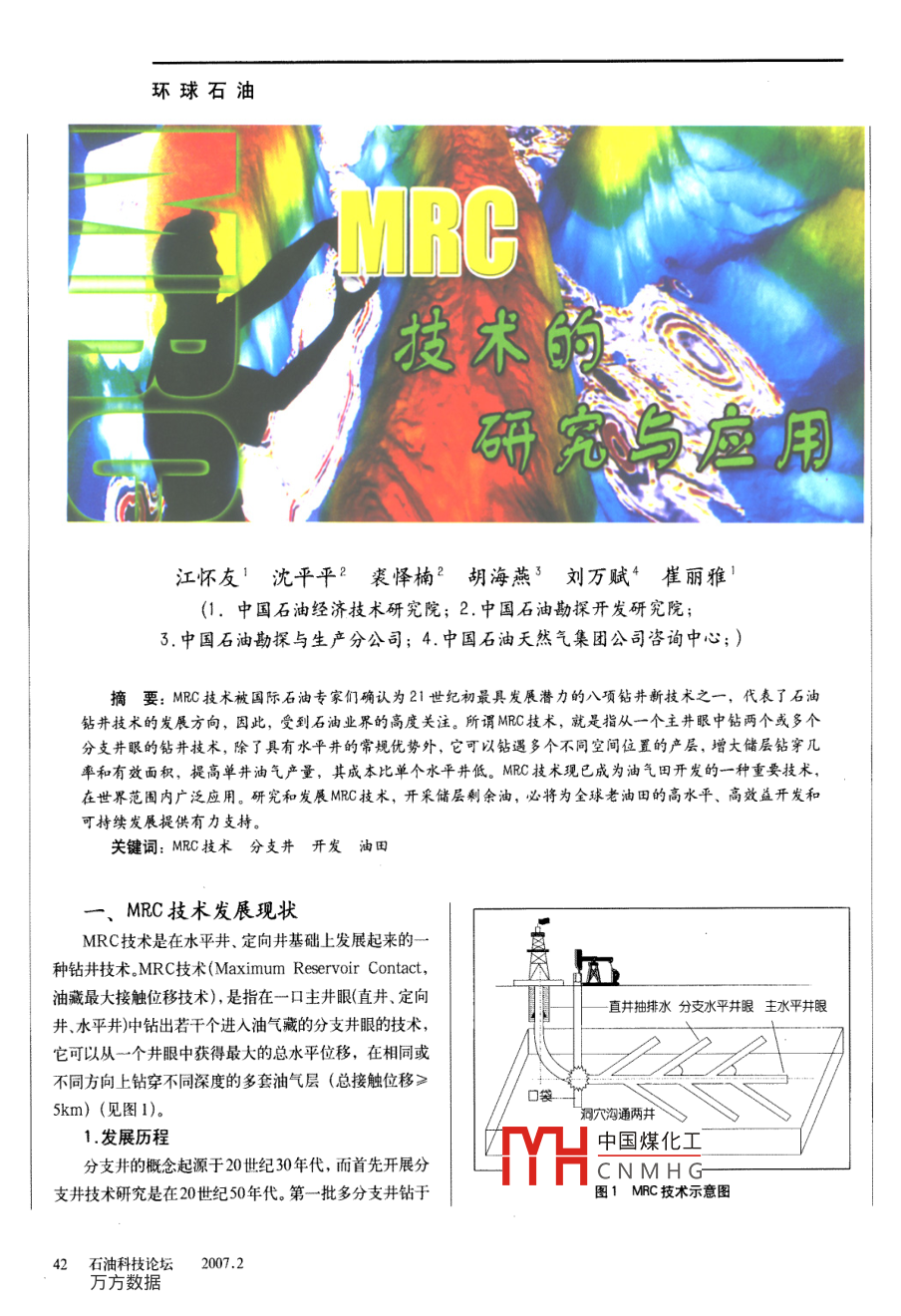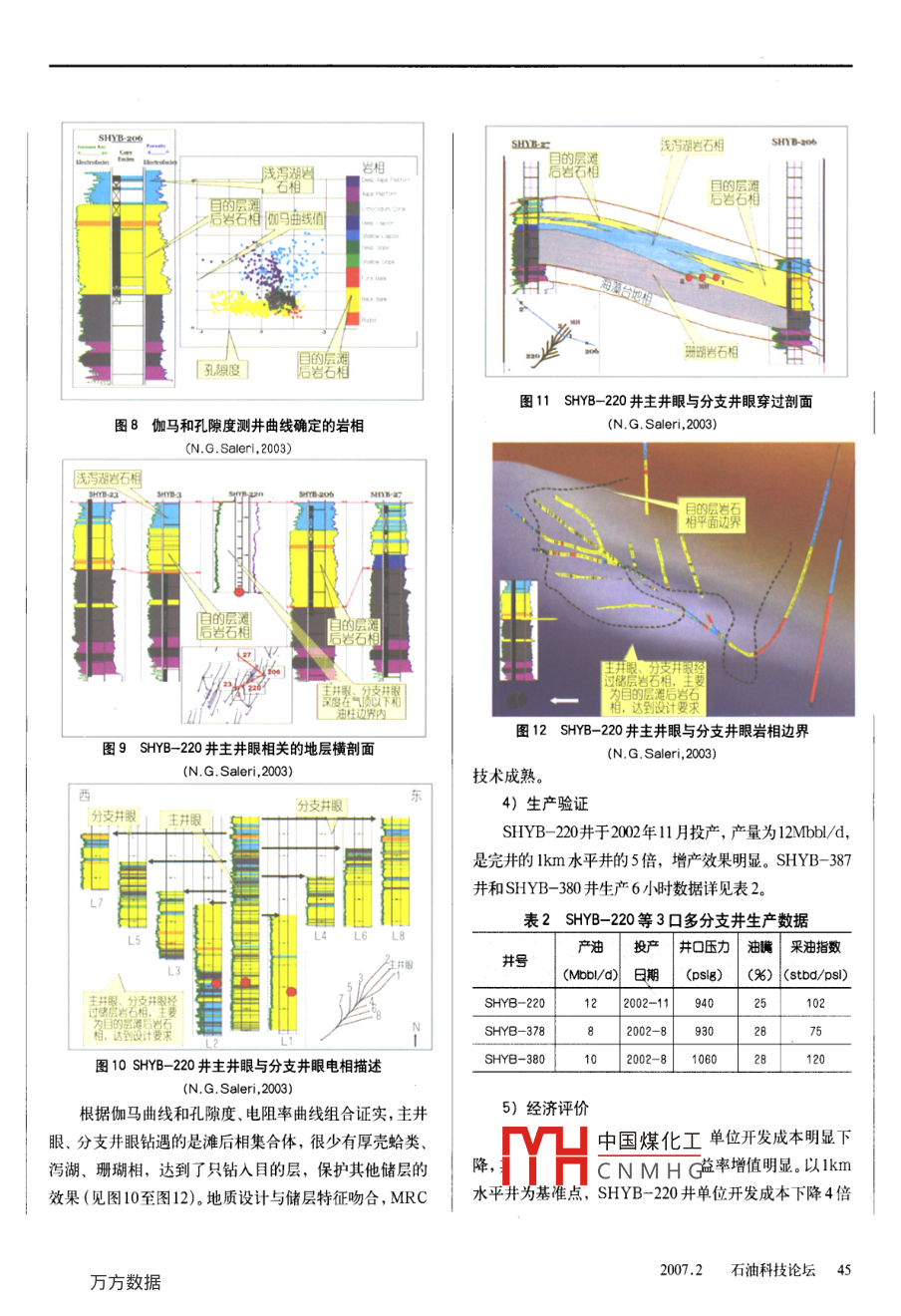 環(huán)球石油技術(shù)的江懷友沈平平?裘懌楠2胡海燕3劉萬賦←崔麗雅(1.中國石油經(jīng)濟技術(shù)研究院;2.中國石油勘探開發(fā)研究院3.中國石油勘探與生產(chǎn)分公司;4.中國石油天然氣集團公司咨詢中心;)摘要:MBC技術(shù)被國際石油專家們確認(rèn)為21世紀(jì)初最具發(fā)展?jié)摿Φ陌隧椼@井新技術(shù)之一,代表了石油鉆井技術(shù)的發(fā)展方向,因此,受到石油業(yè)界的高度關(guān)注。所謂MRC技術(shù),就是指從一個主井眼中鉆兩個或多個分支井眼的鉆井技術(shù),除了具有水平井的常規(guī)優(yōu)勢外,它可以鉆遇多個不同空間位置的產(chǎn)層,增大儲層鉆穿凡率和有效面積,提高單井油氣產(chǎn)量,其成本比單個水平井低。MRC技術(shù)現(xiàn)已成為油氣田開發(fā)的一種重要技術(shù)在世界范圍內(nèi)廣泛應(yīng)用。研究和發(fā)展MRC技術(shù),開釆儲層剩余油,必將為全球老油田的高水平、高效益開發(fā)和可持續(xù)發(fā)展提供有力支持。關(guān)鍵詞:MRC技術(shù)分支井開發(fā)油田、MRC技術(shù)發(fā)展現(xiàn)狀MRC技術(shù)是在水平井、定向井基礎(chǔ)上發(fā)展起來的一種鉆井技術(shù)。MRC技術(shù)( Maximum reservoir contact,油藏最大接觸位移技術(shù)),是指在一口主井眼(直井、定向直井抽排水分支水平井眼主水平并眼井水平井)中鉆出若干個進入油氣藏的分支井眼的技術(shù)它可以從一個井眼中獲得最大的總水平位移,在相同或不同方向上鉆穿不同深度的多套油氣層(總接觸位移≥5km)(見圖1)。a穴溝通兩井1發(fā)展歷程中國煤化工分支井的概念起源于20世紀(jì)30年代,而首先開展分CNMHG支井技術(shù)研究是在20世紀(jì)50年代。第一批多分支井鉆于圖1MRc技術(shù)示意圖42石油科技論壇2007.2前蘇聯(lián)的俄羅斯和阿塞拜疆、烏克蘭,但一開始技術(shù)發(fā)展緩慢,主要原因是完井技術(shù)沒有過關(guān)。我國20世紀(jì)60年代初也曾在玉門油田進行了研究與實踐,打成功了兩口井。到90年代末,全世界累計鉆分支井126口。1995年以后,隨著水平井完井技術(shù)的發(fā)展和三維地震技術(shù)的普及,多分支井技術(shù)得到迅速發(fā)展。美國、加拿大、英國、法國、沙特等國家的多家石油公司對分支井的開發(fā)應(yīng)用給予了較大的投入,開始集中力量解決分支井的完井系統(tǒng)問題。完井工具和工藝技術(shù)的成功開發(fā)使分支井技術(shù)在世界圖4混合型多分支井范圍內(nèi)被廣泛應(yīng)用,并日益得到開發(fā)。(A S. Dossary, 2003)2.分類類型3級別劃分根據(jù)分支井的數(shù)量、方向及與主井眼的連接方式,分TAML復(fù)雜性分級的依據(jù)是功能和連接的復(fù)雜性。支井可分為:疊加式雙或三水平分支井、反向雙分支井TAML是由德士古、殼牌等16家有鉆多分支井經(jīng)驗的二維雙水平分支井、二維三水平分支井、二維位移四分司和8家伙伴公司組成的公司集團,為多分支井發(fā)展提支水平井、二維反向四水平分支井、疊加/定向三分支出技術(shù)規(guī)范和方向,將TAML劃分為級別1至級別6共水平井、輻射狀四分支井、輻射狀三分支井、疊加輻射6個亞級狀四分支井。目前出現(xiàn)的分類方法是將多分支井劃分為4.核心技術(shù)音叉型、魚骨型、混合型(見圖2至圖4)MRC技術(shù)是集井眼軌道設(shè)計、鉆井液設(shè)計、側(cè)鉆技術(shù)、完井技術(shù)和采油工藝于一體的新技術(shù)。目前國際著名大公司,如斯倫貝謝、哈里伯頓、貝克休斯、威德福等都研發(fā)出自己的專利技術(shù)。哈里伯頓公司研發(fā)了分支井的鉆井、完井、開采和分支井重新進入等配套技術(shù)和工具裝備,擁有20余項專利技術(shù),技術(shù)水平在世界處于領(lǐng)先地位in查鞋二、適用于MRC技術(shù)的儲層地質(zhì)條件圖2音叉型多分支井該技術(shù)適合于碎屑巖、碳酸巖、變質(zhì)巖、巖漿巖儲層,(A S Dossary, 2003)適用于新老油田的低滲透油層、重油油藏、多層薄油藏、裂縫性油藏、復(fù)雜斷塊油藏以及煤層氣開發(fā)。圖5是沙特阿拉伯國家石油公司 Delta油田的 Unayzah砂巖氣藏的口多分支井剖面,為3級智能完井。儲層為砂巖氣藏,開采目的層為2個砂巖單元: Unayzah a和 UnayzahB。中間由粉砂巖單元分隔開來國外油田應(yīng)用情況卵0則7襯管鞋中國煤化工,如墨西哥灣、北海、3魚骨型多分支井中CNMHGpears and Associates(A.S. Dossary, 2003)公司統(tǒng)計,全世界分支井共計2481口,其中智能完井1522007.2石油科技論壇43環(huán)球石油從圖上可以看出設(shè)計井眼與實際鉆井井眼吻合得很好。A設(shè)計并眼軌跡13560TVD買際抖眼軌跡粉砂巖13780′TVDnay實際井眼軌跡王眼圖5沙特Deta油田D-10多分支井軌跡合效果好(Ginest, 2005)次,可膨脹實體管150次(30480m);可膨脹篩管150次分支眼1.MRC技術(shù)解決的實際問題MRC技術(shù)在油田開發(fā)中可以解決如下問題:一是通圖7SHYB-220并井眼軌跡過提高井眼與油藏的接觸長度,增加泄油面積,提高單(N. G, Saleri, 2003)井生產(chǎn)能力;二是降低井?dāng)?shù),并且降低打井時的地面設(shè)2)鉆井施工備,對于海上油田可減小平臺尺寸重量;三是降低鉆井SHYB-220井2002年3月7日開鉆,采用智能完井方和生產(chǎn)的單位成本,從而降低油田的整體開發(fā)成本四是式。主井及分支井的長度、鉆進時間、鉆速數(shù)據(jù)詳見表1。有效地應