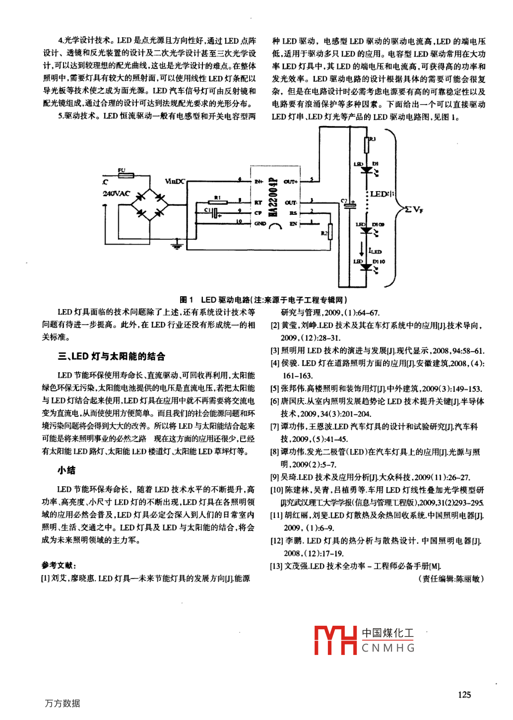 科技之窗 Technology Windows中外企業(yè)家2011年第9期(下】總第381期IED燈應(yīng)用及展望宋冬靈信息工程大學(xué)理學(xué)院河南鄭州450001)摘要:LED作為新一代燈具,具有環(huán)保高效節(jié)能靈活等特點,是未來燈具發(fā)展的方向。從LED燈的發(fā)光特點、應(yīng)用面臨的技術(shù)問題、LED燈與太陽能的結(jié)合幾個方面綜逑了LED燈,指出未來社會的照明應(yīng)該是LED與太陽能的結(jié)合。關(guān)鍵詞:LED;芯片;封裝;節(jié)能中圖分類號:M923文獻(xiàn)標(biāo)識碼:A文章編號:1000-8772(2011)18-0123-03引言本較低,缺點是發(fā)光效率低,不到40m/W,且紫外線照射下材料易老化。第三種方式是藍(lán)光LED加黃色熒光粉,優(yōu)點是演色性發(fā)光二極管LED,英文 Light Emitting Diode。近幾年,隨著和發(fā)光效率都高,可達(dá)80mW左右,成本低缺點是藍(lán)光LEDLED技術(shù)的飛速發(fā)展和LED燈無可比擬的優(yōu)勢,LED燈作為繼發(fā)光波長的偏移、強(qiáng)度的改變及熒光粉涂布厚度的改變都會影白熾燈、熒光燈、高強(qiáng)度氣體放電燈(HID)之后的第四代燈具在響白光的均勻度,且光譜較窄,色彩不全,色溫偏高燈光對眼睛照明領(lǐng)域已被廣泛應(yīng)用,小到臺燈、手電筒、各種電器上的指示不柔和不協(xié)調(diào)所以這種白光還需要改進(jìn)第三種方式目前已經(jīng)燈、信號燈等,大到室內(nèi)外照明、路燈、裝飾燈、景觀照明、演播室比較成熟且已商業(yè)化。正是第三種獲得白光LED的方式帶來了燈、汽車燈具、液晶顯示背光模組等。到2011年年初,全球高亮LED燈的飛速發(fā)展。度LED的產(chǎn)值已達(dá)106億美元。(二)LED燈的特點相比前三代燈具,LED燈具具有許多優(yōu)勢和特點LED燈的發(fā)光及特點LED燈是直流電源驅(qū)動,驅(qū)動電壓低,功率小耗電量少(一川LED燈的發(fā)光節(jié)能省電。由于LED的發(fā)光部件是半導(dǎo)體PN結(jié)芯片,它具有ED是利用半導(dǎo)體PN結(jié)芯片發(fā)光的。PN結(jié)由P型半導(dǎo)體單向?qū)?反向截流的特點,所以LED燈只能用直流電源供電,和N型半導(dǎo)體組成在他們的交界面兩側(cè)深層形成PN結(jié)。PN且需要的驅(qū)動電壓很低,單珠驅(qū)動電壓為3V-34V,功率很結(jié)具有單向?qū)щ娦浴.?dāng)給PN結(jié)加正向電壓時,P區(qū)和N區(qū)的多小。以單珠白光LED為例,小功率LED為006W,電流不能超過數(shù)載流子向?qū)Ψ綌U(kuò)散,由于電子的遷移率比空穴的遷移率大的20mA,大功率LED現(xiàn)在常用的有1W和3W的,再大功率的需多,就出現(xiàn)了大量電子向P區(qū)擴(kuò)散構(gòu)成P區(qū)少數(shù)電子的注入。要解決散熱問題,可以用多個芯片集成得到。常用的獲得較大功這些電子與價帶上的空穴復(fù)合,復(fù)合時釋放出光子而發(fā)光。這率LED燈具的方法是將多珠LED串聯(lián)或混聯(lián),這樣就可以獲就是PN結(jié)也即LED燈的發(fā)光原理。得任意功率的IED燈具。由于這些特點,LED燈具的耗電量非構(gòu)成PN結(jié)芯片的半導(dǎo)體材料有硅(Si)、氮(N)、磷(P)、砷常低。以一個路燈的電耗為例將高壓鈉燈、LED路燈以及太陽(As)、鋁〔Al)、鍺(G)、嫁(Ca)、鍶(Sr)、銦(ln)等元素構(gòu)成。具體能LED路燈進(jìn)行對比。若每天供電10小時,其中太陽能LED選擇何種材料則由需要的LED發(fā)光顏色決定。例如車燈系統(tǒng)中路燈為2小時加8小時太陽能供電,則三種燈具的年耗電量分常用的芯片材料有:藍(lán)色一nCaN、黃色一 AlInGaP、紅色一別為54750KW/h、21900KWh和4380KWh。LED的年耗電量僅AlGaAs不同的材料發(fā)出的光只覆蓋很小范圍的波長,所以是高壓鈉燈的40%左右,而太陽能LED路燈的年耗電量僅是高LED基本上只發(fā)出單色光,且大多在可見光區(qū)域LED燈發(fā)出壓鈉燈的8%左右。相比之下,使用后者作為路燈將大大節(jié)約電的光有紅、綠、黃、橙、藍(lán)等各種顏色?,F(xiàn)在單色LED已經(jīng)被廣泛能,節(jié)省電費?,F(xiàn)在在我國已有大功率大規(guī)模的LED路燈和太應(yīng)用在信號燈系統(tǒng)中。陽能LED路燈系統(tǒng)投入使用。隨著LED技術(shù)的發(fā)展,現(xiàn)在不但有單色光LED,還出現(xiàn)了2LED燈具的發(fā)光效率高。表1是四代燈具發(fā)光效率對照白光LED。實現(xiàn)白光LED的方式主要有三種:第一種方式是利表。由表1可以看出四代燈具中LED燈的發(fā)光效率最高。LED用紅、綠藍(lán)三色LED混光產(chǎn)生白光優(yōu)點是紅、綠、藍(lán)三色混光燈具的發(fā)光效率理論值可達(dá)到250lm/W,而國內(nèi)現(xiàn)產(chǎn)的白光可簡單調(diào)出所要的色溫和色光,演色性高(大于90),發(fā)光效率LED燈低于100lm/W,國外的略高于100lmW,與理論值還有高(大于80mW),缺點是三種不同的發(fā)光源同時進(jìn)行,電源供定的差距。低功率的I燈在同筆昭明情況下可以代替高功應(yīng)設(shè)計復(fù)雜,且在某些距離有顏色不均勻現(xiàn)象第二種方式是利率的普通燈具中國煤化工100的白熾燈的亮用紫外線LED(UⅤLED)加紅綠藍(lán)熒光粉,優(yōu)點是演色性高,成度,30W的相CN MHGW收稿日期:201-09-02作者簡介:宋冬靈(1977-),女,河南新鄉(xiāng)人,講師,主要從事教學(xué)及科研工作123LED燈表1:各種燈具的發(fā)光效率IED雖然有很多優(yōu)點,但是也存在著許多不足和技術(shù)問題燈具種類發(fā)光效率(1m/W)有待進(jìn)一步改進(jìn)和解決,下面從幾個方