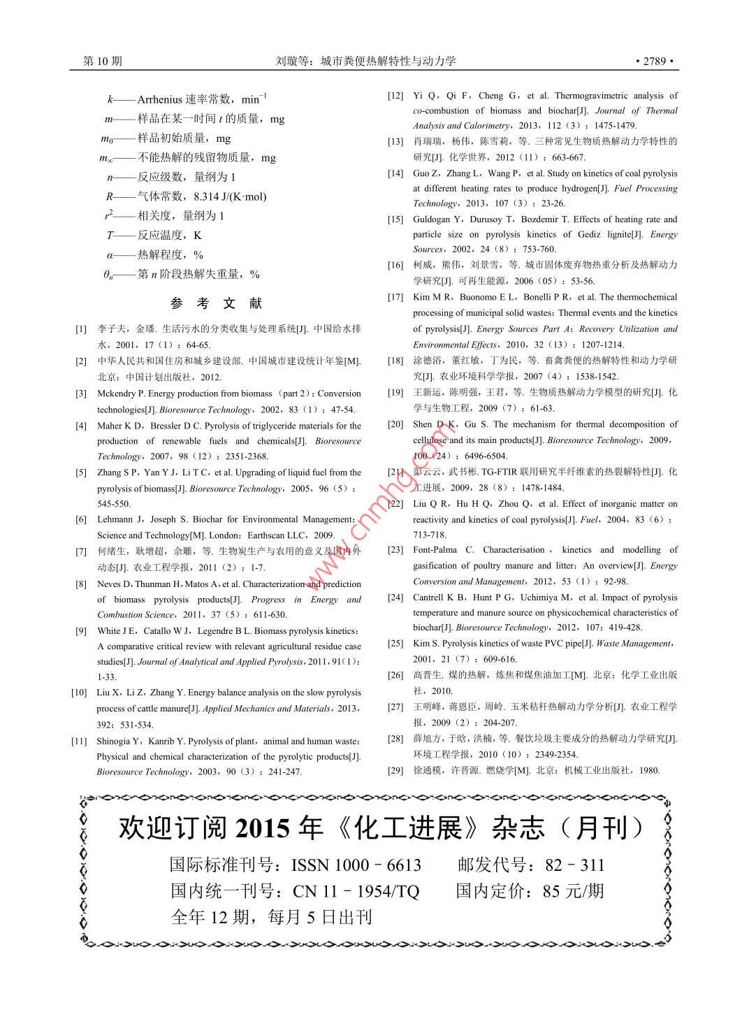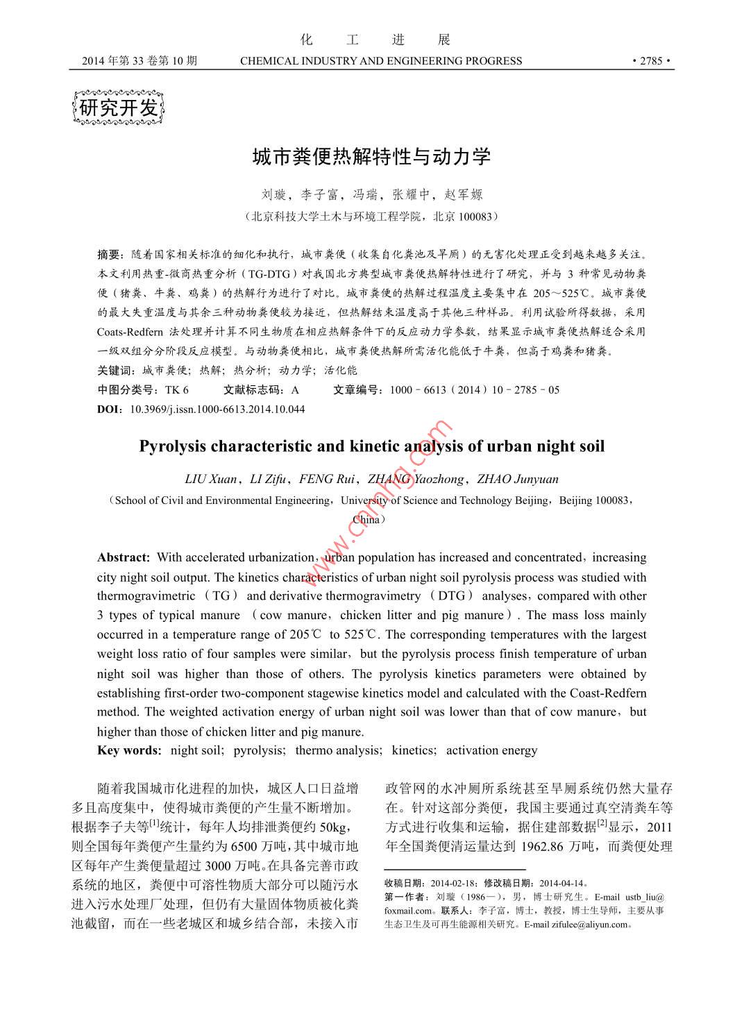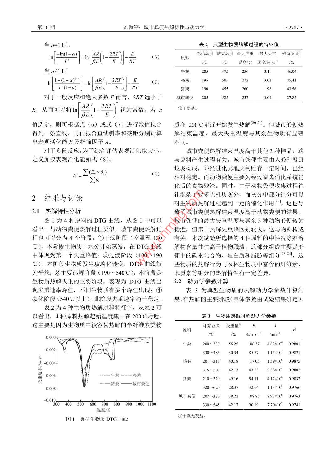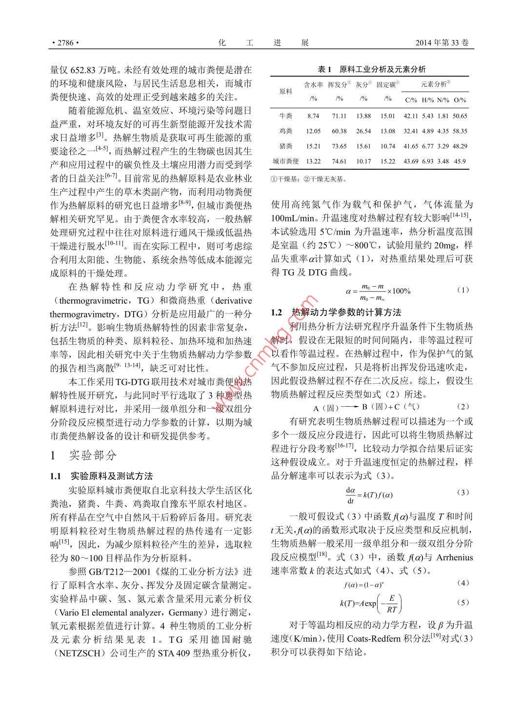 化工進(jìn)展2014年第33卷第10期CHEMICAL INDUSTRY AND ENGINEERING PROGRESS研究開發(fā)城市糞便熱解特性與動力學(xué)劉璇,李子富,馮瑞,張耀中,趙軍嫄(北京科技大學(xué)土木與環(huán)境工程學(xué)院,北京100083)滴要:隨著國家相關(guān)標(biāo)準(zhǔn)的細(xì)化和執(zhí)行,城市糞便(收集自化糞池及旱廁)的無害化處理正受到越來越多關(guān)注本文利用熱重-微商熱重分析(TG-DTG)對我國北方典型城市糞便熱解特性進(jìn)行了研究,并與3種常見動物糞便(豬糞、牛糞、雞糞)的熱解行為進(jìn)行了對比。城市糞便的熱解過程溫度主要集中在205~525℃。城市糞便的最大失重溫度與其余三種動物糞便較為接近,但熱解結(jié)束溫度髙于其他三種樣品。利用試驗所得欻裾,采用〔oats- Redfern法處理并計算不同生物質(zhì)在相應(yīng)熱解條件下的反應(yīng)動力學(xué)參數(shù),結(jié)果顯示城市糞便熱解適合采用一級雙組分分階段反應(yīng)模型。與動物糞便相比,城市糞便熱解所需活化能低于牛糞,但高于雞糞和豬糞。關(guān)鍵詞:城市糞便;熱解;熱分析;動力學(xué);活化能中圖分類號:TK6文獻(xiàn)標(biāo)志碼:A文章編號:1000-6613(2014)10-2785-05DOl:10.3969/issn.1000-6613.2014.10.044Pyrolysis characteristic and kinetic analysis of urban night soilLIU Xuan, Ll Zifu, FENG Rui, ZHANG Yaozhong, ZHAO Junyuan( School of Civil and Environmental Engineering, University of Science and Technology Beijing, Beijing 100083Abstract: With accelerated urbanization, urban population has increased and concentrated, increasingcity night soil output. The kinetics characteristics of urban night soil pyrolysis process was studied withthermogravimetric (TG) and derivative thermogravimetry dtG )analyses, compared with other3 types of typical manure cow manure, chicken litter and pig manure ) The mass loss mainlyoccurred in a temperature range of 205c to 525C. The corresponding temperatures with the largestweight loss ratio of four samples were similar, but the pyrolysis process finish temperature of urbannight soil was higher than those of others. The pyrolysis kinetics parameters were obtained byestablishing first-order two-component stagewise kinetics model and calculated with the Coast-Redfernmethod. The weighted activation energy of urban night soil was lower than that of cow manure, buthigher than those of chicken litter and pig manureKey words: night soil; pyrolysis; thermo analysis; kinetics; activation energy隨著我國城市化進(jìn)程的加快,城區(qū)人口日益增政管網(wǎng)的水沖廁所系統(tǒng)甚至旱廁系統(tǒng)仍然大量存多且高度集中,使得城市糞便的產(chǎn)生量不斷増加。在。針對這部分糞便,我國主要通過真空清糞車等根據(jù)李子夫等統(tǒng)計,每年人均排泄糞便約50kg,方式進(jìn)行收集和運(yùn)輸,據(jù)住建部數(shù)據(jù)2顯示,2011則全國每年糞便產(chǎn)生量約為6500萬噸,其中城市地年全國糞便清運(yùn)量達(dá)到1962.86萬噸,而糞便處理區(qū)每年產(chǎn)生糞便量超過3000萬噸。在具備完善市政系統(tǒng)的地區(qū),糞便中可溶性物質(zhì)大部分可以隨污水收稿日期:2014-02-18:修改稿日期:20140414進(jìn)入污水處理廠處理,但仍有大量固體物質(zhì)被化糞第一作者:劉(6=.男,博土研究生,Emu池截留,而在一些老城區(qū)和城鄉(xiāng)結(jié)合部,未接入市生態(tài)衛(wèi)生及可再生能源相關(guān)研究。E-mailzifulee(aaliyun.com2786·化工進(jìn)展2014年第33卷量僅65283萬噸。未經(jīng)有效處理的城市糞便是潛在表1原料工業(yè)分析及元素分析的環(huán)境和健康風(fēng)險,與居民生活息息相關(guān),而城市含水率揮發(fā)分①灰分固定碳元素分析糞便快速、高效的處理正受到越來越多的關(guān)注原料/%0%C/% H%o N/% O/隨著能源危機(jī)、溫室效應(yīng)、環(huán)境污染等問題日牛糞8.7471.1113.88150142.115431.8150.65益嚴(yán)重,對環(huán)境友好的可再生新型能源開發(fā)技術(shù)需雞糞120560.3826.5413.0832414894.3558.35求日益增多。熱解生物質(zhì)是獲取可再生能源的重要途徑之一45,而熱解過程產(chǎn)生的生物碳也因其生豬糞152173.65156110.7441.656.773.2948.29產(chǎn)和應(yīng)用過程中的碳負(fù)性及土壤應(yīng)用潛力而受到學(xué)城市糞便1327461101715224369693348459者的日益關(guān)注6刀。目前常見的熱解原料是農(nóng)業(yè)林業(yè)①干燥基;②干燥無灰基生產(chǎn)過程中產(chǎn)生的草木類副產(chǎn)物,而利用動物糞便作為熱解原料的硏究也日益增多8,但城市糞便熱使用高純氮?dú)庾鳛檩d氣和保護(hù)氣,氣體流量為解相關(guān)研究罕見。由于糞便含水率較高,一般熱解100mL/min。升溫速度對熱解過程有較大影響-15,處理研究過程中往往對原料進(jìn)行通風(fēng)干燥或低溫?zé)岜驹囼炦x用5℃/min為升溫速率,熱分析溫度范圍干燥進(jìn)行脫水1。而在實際工程中,則可考慮綜是室溫(約25℃)~800℃,試驗用量約20mg,樣合利用太陽能、生物能、系統(tǒng)余熱等低成本能源完品失重率α計算如式(1),對熱重結(jié)果處理后可獲成原料的干燥處理得TG及DTG曲線在熱解特性和反應(yīng)動力學(xué)研究中,熱重( thermogravimetric,TG)和微商熱重( derivativeImo - xhermogravimetry,DTG)分析是應(yīng)用最廣的一種分1.2熱解動力學(xué)參數(shù)的計算方法析方法2。影響生物質(zhì)熱解特性的因素非常復(fù)雜利用熱分析方法研究程序升溫條件下生物質(zhì)熱包括生物質(zhì)的種類、原料粒徑、加熱環(huán)境和加熱速解時,假設(sh