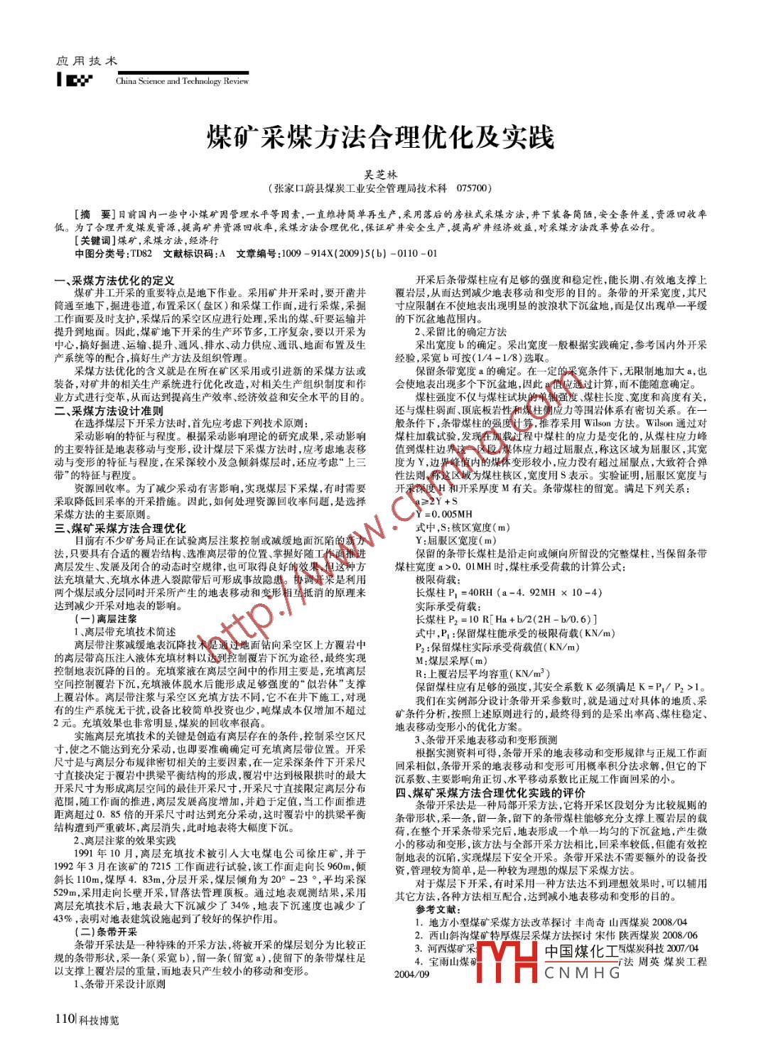 應用技術(shù)|EChina Science and Technology Review煤礦采煤方法合理優(yōu)化及實踐吳芝林(張家口蔚縣煤炭工業(yè)安全管理局技術(shù)科075700)[摘要]目前國內(nèi)一些中小煤礦因管理水平等因素,一直維持簡單再生產(chǎn),采用落后的房柱式采煤方法,并下裝備簡陋,安全條件差,資源回收率低。為了合理開發(fā)煤炭資源,提高礦井資源回收率,采煤方法合理優(yōu)化,保證礦井安全生產(chǎn),提高礦井經(jīng)濟效益,對采煤方法改革勢在必行。[關(guān)鍵詞]煤礦,采煤方法,經(jīng)濟行中圖分類號:TD82文獻標識碼:A 文章編號 :1009 -914X(2009)5(b) -0110 -01一、采煤方法優(yōu)化的定義開采后條帶煤柱應有足夠的強度和穩(wěn)定性,能長期、有效地支撐上點是地下作業(yè)。采用礦井開采時,要開鑿井覆巖層,從而達到減少地表移動和變形的目的。條帶的開采寬度,其尺筒通至地下,掘進巷道,布置采區(qū)(盤區(qū))和采煤工作面,進行采煤,采掘寸應限制在不使地表出現(xiàn)明顯的波浪狀下沉盆地,而是僅出現(xiàn)單-平緩工作面要及時支護,采煤后的采空區(qū)應進行處理,采出的煤、研要運輸并的下沉盆地范圍內(nèi)。提升到地面。因此,煤礦地下開采的生產(chǎn)環(huán)節(jié)多,工序復雜,要以開采為2、采留比的確定方法中心,搞好掘進、運輸、提升、通風、排水、動力供應、通訊、地面布置及生采出寬度b的確定。采出寬度一般根據(jù)實踐確定 ,參考國內(nèi)外開采產(chǎn)系統(tǒng)等的配合,搞好生產(chǎn)方法及組織管理。經(jīng)驗,采寬b可按(1/4- 1/8)選取。采煤方法優(yōu)化的含義就是在所在礦區(qū)采用或引進新的采煤方法或保留條帶寬度a的確定。在一-定的采寬條件下,無限制地加大a,也裝備,對礦井的相關(guān)生產(chǎn)系統(tǒng)進行優(yōu)化改造,對相關(guān)生產(chǎn)組織制度和作會使地表出現(xiàn)多個下沉盆地,因此a值應通過計算,而不能隨意確定。業(yè)方式進行變革,從而達到提高生產(chǎn)效率、經(jīng)濟效益和安全水平的目的。煤柱強度不僅與煤柱試塊的單軸強度、煤柱長度、寬度和高度有關(guān),二、采煤方法設計準則還與煤柱弱面頂?shù)装鍘r性和煤柱側(cè)應力等圍巖體系有密切關(guān)系。在一在選擇煤層下開采方法時,首先應考慮下列技術(shù)原則:般條件下,條帶煤柱的強度計算,推薦采用Wilson 方法。Wilson 通過對采動影響的特征與程度。根據(jù)采動影響理論的研究成果,采動影響煤柱加載試驗,發(fā)現(xiàn)在加載過程中煤柱的應力是變化的,從煤柱應力峰的主要特征是地表移動與變形,設計煤層下采煤方法時,應考慮地表移值到煤柱邊界這一區(qū)段,煤體應力超過屈服點,稱這區(qū)域為屈服區(qū),其寬動與變形的特征與程度,在采深較小及急傾斜煤層時,還應考慮“上三度為Y ,邊界峰值內(nèi)的煤體變形較小,應力沒有超過屈服點,大致符合彈帶”的特征與程度。性法則,稱這區(qū)域為煤柱核區(qū),寬度用S表示。實驗證明,屈服區(qū)寬度與資源回收率。為了減少采動有害影響,實現(xiàn)煤層下采煤,有時需要開采深度H和開采厚度M有關(guān)。條帶煤柱的留寬。滿足下列關(guān)系:采取降低回采率的開采措施。因此,如何處理資源回收率問題,是選擇采煤方法的主要原則。Y =0.00SMH三、煤礦采煤方法合理優(yōu)化式中,S:核區(qū)寬度(m)Y:屈服區(qū)寬度( m)法,只要具有合適的覆巖結(jié)構(gòu)、選準離層帶的位置、掌握好隨工作面推進保留的條帶長煤柱是沿走向或傾向所留設的完整煤柱,當保留條帶離層發(fā)生、發(fā)展及閉合的動態(tài)時空規(guī)律,也可取得良好的效果,但這種方煤柱寬度a>0. 01MH時,煤柱承受荷載的計算公式:法充填量大、充填水體進入裂隙帶后可形成事故隱患。協(xié)調(diào)開采是利用極限荷載:網(wǎng)個煤層或分層同時開采所產(chǎn)生的地表移動和變形相互抵消的原理來長煤柱P =40RH (a-4.92MH x 10-4)達到減少開采對地表的影響。實際承受荷載:.(-)離層注漿長煤柱P2 =10 R[ Ha+ b/2(2H- b/0.6)]1、離層帶充填技術(shù)簡述式中,P :保留煤柱能承受的極限荷載( KN/m)離層帶注漿減緩地表沉降技術(shù)是通過地面鉆向采空區(qū)上方覆巖中P2:保留煤是荷載值( KN/m)的離層帶高壓注入液體充填材料以達到控制覆巖下沉為途徑,最終實現(xiàn)M:煤層采厚(m)控制地表沉降的目的。充填漿液在離層空間中的作用主要是,充填離層R:上覆巖層平均容重( KN/m3 )空間控制覆F沉,充填液體脫水后能形成足夠強度的“似巖體”支撐保留煤柱應有足夠的強度,其安全系數(shù)K必須滿足K=P,/P2>1。上覆巖體。離層帶注漿與采空區(qū)充填方法不同,它不在井下施工,對現(xiàn)我們在實例部分設計條帶開采參數(shù)時,就是通過對具體的地質(zhì)、采有的生產(chǎn)系統(tǒng)無干擾,設備比較簡單投資也少,噸煤成本僅增加不超過礦條件分析,按照上述原則進行的,最終得到的是采出率高、煤柱穩(wěn)定、2元。充填效果也非常明顯,煤炭的回收率很高。地表移動變形小的優(yōu)化方案。實施離層 充填技術(shù)的關(guān)鍵是創(chuàng)造有離層存在的條件,控制采空區(qū)尺3、條帶開采地表移動和變形預測寸,使之不能達到充分采動,也即要準確確定可充填離層帶位置。開采根據(jù)實測資料可得,條帶開采的地表移動和變形規(guī)律與正規(guī)工作面