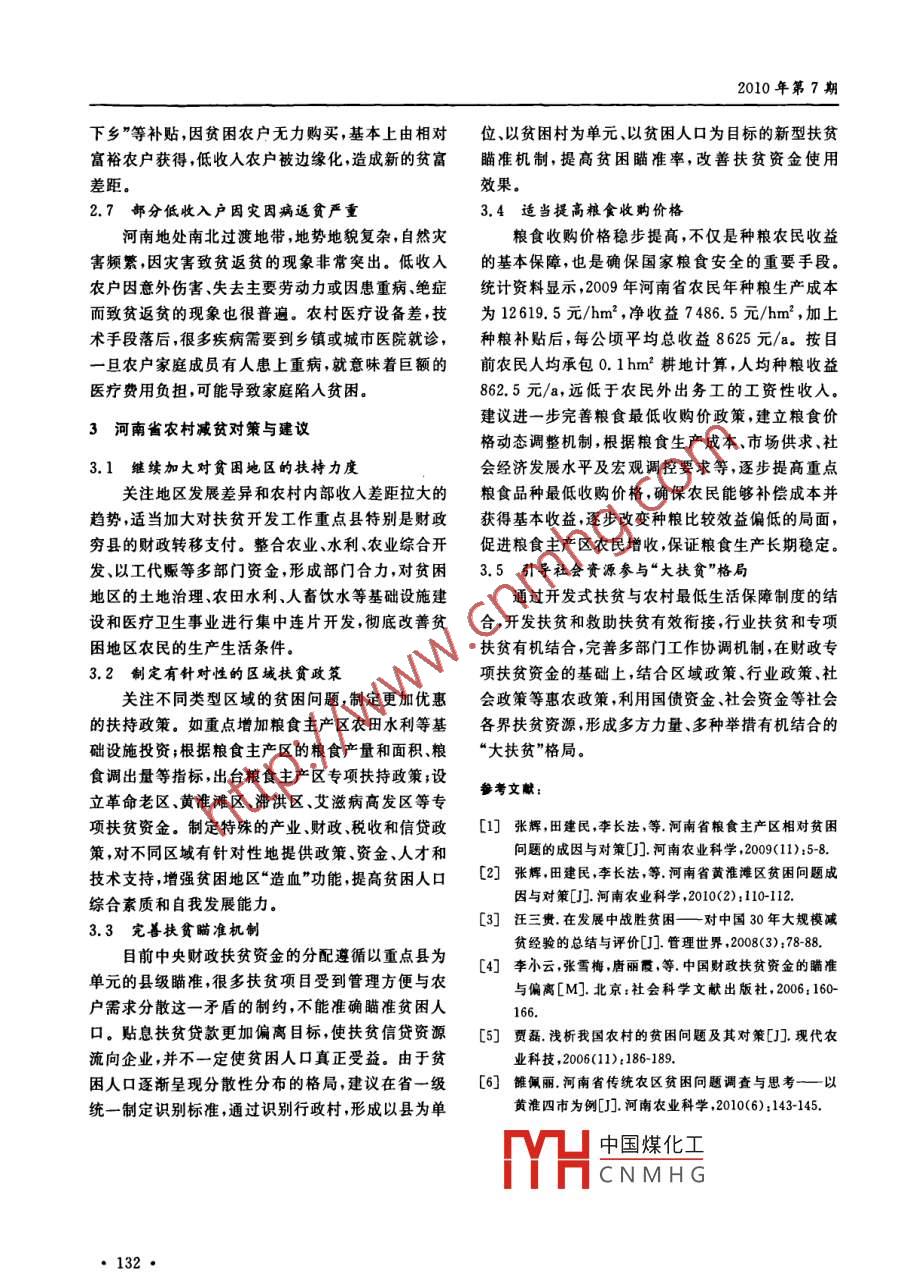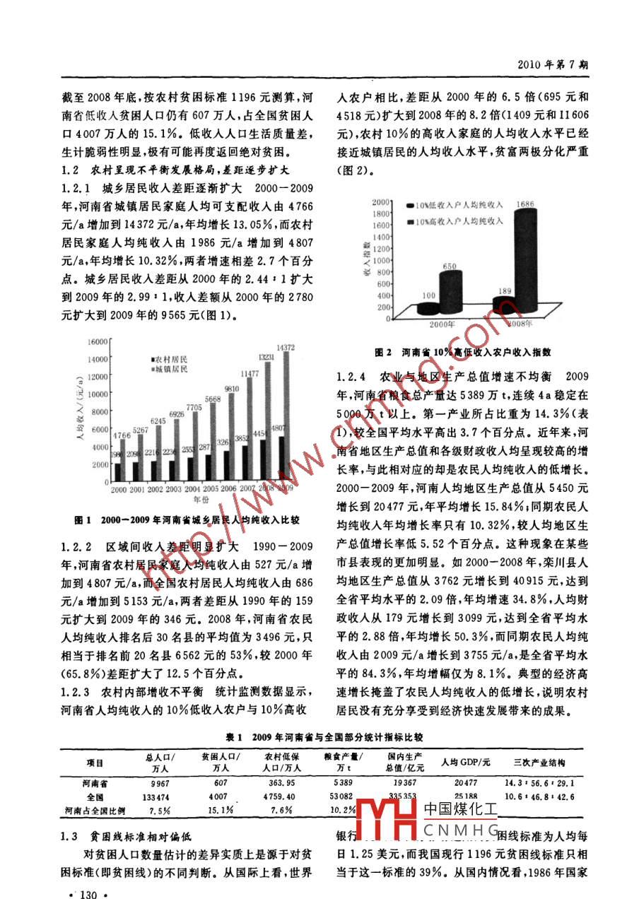 河南農(nóng)業(yè)科學(xué)河南省農(nóng)村減貧對(duì)策研究雛佩麗(中國(guó)農(nóng)業(yè)大學(xué)人文與發(fā)展學(xué)院,北京100193)摘要:河南省是全國(guó)第一農(nóng)業(yè)大省,連年為全國(guó)糧食豐收做出了巨大貢獻(xiàn),但河南省的農(nóng)村貧困問(wèn)題卻日益突出。為此,在實(shí)地調(diào)研的基礎(chǔ)上,采用定量分析和定性研究的方法,對(duì)河南省農(nóng)村貧困現(xiàn)狀及其原因進(jìn)行了系統(tǒng)分析,并提出了相應(yīng)對(duì)策和建議。關(guān)鍵詞:河南;貧困問(wèn)題;減貧對(duì)策中圖分類號(hào): F31-6文獻(xiàn)標(biāo)識(shí)碼: B文章編號(hào): 1004 - 3268(2010)07 -0129 -042009年,河南省糧食總產(chǎn)量達(dá)5389萬(wàn)t,占全1河南省農(nóng)村 貧困現(xiàn)狀國(guó)糧食總產(chǎn)量的10. 2%,連續(xù)6a創(chuàng)歷史新高。然而,在獲得糧食豐收的同時(shí),農(nóng)民增產(chǎn)不增收問(wèn)題依1.1 絕對(duì)貧困人口持續(xù)減少,相對(duì)貧困問(wèn)題依然然突出。截至2008年底,河南省貧困人口占全國(guó)的突出比重達(dá)15.1%,由此反映出河南農(nóng)村的致貧原因復(fù)2000- 2008 年,河南省農(nóng)村絕對(duì)貧困人口從232雜,減貧難度大。為此,在實(shí)地調(diào)研和統(tǒng)計(jì)分析的基萬(wàn)人下降到85萬(wàn)人,農(nóng)村絕對(duì)貧困發(fā)生率從3.2%下礎(chǔ)上,對(duì)河南省的農(nóng)村貧困現(xiàn)狀、成因及其對(duì)策進(jìn)行降到1.3%。2008 年全省享受農(nóng)村低保政策的人口了研究。已達(dá)270. 46萬(wàn)人,農(nóng)村絕對(duì)貧困問(wèn)題基本得到緩解。收稿日期:2010-03-11基金項(xiàng)目:河南省扶貧開發(fā)辦項(xiàng)目作者筒介;錐佩麗(1976-).女,河南靈寶人,在讀博士研究生,研究方向:農(nóng)村發(fā)展與管理。E- mail; hncadluopl@ yahoo. com. cn等方面建立統(tǒng)一標(biāo)準(zhǔn)和規(guī)范.考慮信息共享、信息處理能力;在確保信息資源可靠標(biāo)準(zhǔn)體系建設(shè)是網(wǎng)絡(luò)信息資源開發(fā)與利用的重性和有效性的前提下,信息資源利用首先要考慮通要保證,必須在國(guó)家、行業(yè)相關(guān)標(biāo)準(zhǔn)的基礎(chǔ)上,建立過(guò)信息共享途徑滿足對(duì)信息資源的需求,避免重復(fù)一整套從信息采集、傳輸、處理、建庫(kù)到業(yè)務(wù)應(yīng)用系開發(fā)那些已有能夠滿足需要的信息資源,最大限度統(tǒng)集成、信息發(fā)布與服務(wù)的完整技術(shù)與政策體系。地?cái)U(kuò)展信 息資源的綜合利用水平。引導(dǎo)和規(guī)范各部門、各行業(yè)進(jìn)行信息資源的數(shù)字化、參考文獻(xiàn):標(biāo)準(zhǔn)化、網(wǎng)絡(luò)化和空間化改造,促進(jìn)信息資源共享,保障信息安全。[1] 赫曉輝,趙暉,王政峰.寧夏農(nóng)村信息服務(wù)站現(xiàn)狀調(diào)查3.4 正確處理好信息資源開發(fā)與利用的關(guān)系.與分析[J].現(xiàn)代農(nóng)業(yè)科技,2009(22) :366-367.信息資源的開發(fā)與利用是一對(duì)矛盾,“利用”是.[2] 張艷鳴,胡鳴鳴.高校圖書館網(wǎng)絡(luò)信息資源的組織與管理[J].現(xiàn)代情報(bào),2004 ,24(3)111-112.矛盾的主要方面,是“開發(fā)”的目的、動(dòng)力和歸宿。信[3] 胡昌平,谷斌.網(wǎng)絡(luò)環(huán)境下下信息資源整合模式分析息資源只有在不斷的利用中,才能體現(xiàn)它的價(jià)值;只[J].武漢大學(xué)信息資源開發(fā)研究,2002(5) :24-27.有經(jīng)過(guò)不斷的、深層次的提煉、加工、處理和分析,才[4] 胡昌平,黃曉梅,賈君枝.信息服務(wù)管理[M].北京:科能使之成為真正有價(jià)值的信息資源。因此,必須始學(xué)出版社,2006.終以效能和經(jīng)濟(jì)利益優(yōu)先的原則,制定詳盡的信息[5]中國(guó)煤化工及發(fā)展對(duì)策[J].河資源開發(fā)與利用計(jì)劃,注重實(shí)際應(yīng)用和效益,加強(qiáng)合CH.CNMHG作,及時(shí)了解國(guó)內(nèi)外相關(guān)技術(shù)的先進(jìn)思想,努力做到[6]' 卓文飛。我國(guó)微觀農(nóng)業(yè)信息服務(wù)創(chuàng)新模式研究[J].河高起點(diǎn),避免低水平的重復(fù)建設(shè)。信息資源開發(fā)要.南農(nóng)業(yè)科學(xué),2007(3) :22-24.129 ●2010年第7期截至2008年底,按農(nóng)村貧困標(biāo)準(zhǔn)1196元測(cè)算,河人農(nóng)戶相比,差距從2000年的6.5倍(695元和南省低收人貧困人口仍有607萬(wàn)人,占全國(guó)貧困人4518元)擴(kuò)大到2008年的8.2倍(1409元和11606口4007萬(wàn)人的15. 1%。低收人人口生活質(zhì)量差,元) ,農(nóng)村10%的高收入家庭的人均收入水平已經(jīng)生計(jì)脆弱性明顯,極有可能再度返回絕對(duì)貧困。接近城鎮(zhèn)居民的人均收入水平,貧富兩極分化嚴(yán)重1.2農(nóng)村呈現(xiàn)不平衡發(fā)展格局,差距逐步擴(kuò) 大(圖2)。1.2.1城鄉(xiāng)居民收人差距逐漸擴(kuò) 大2000- 2009年,河南省城鎮(zhèn)居民家庭人均可支配收入由476620001■10%低收入戶人均純收入 16861800元/a增加到14372元/a,年均增長(zhǎng)13. 05% ,而農(nóng)村1600■10病收入戶 人均純收入1400居民家庭人均純收人由1986 元/a增加到4807元/a,年均增長(zhǎng)10. 32%,兩者增速相差2.7個(gè)百分< 1000650告800點(diǎn)。城鄉(xiāng)居民收入差距從2000年的2.44: 1擴(kuò)大600到2009年的2.99; 1,收人差額從2000年的2780400100200元擴(kuò)大到2009年的9565元(圖1).2000年2008年1600014372圍2河南