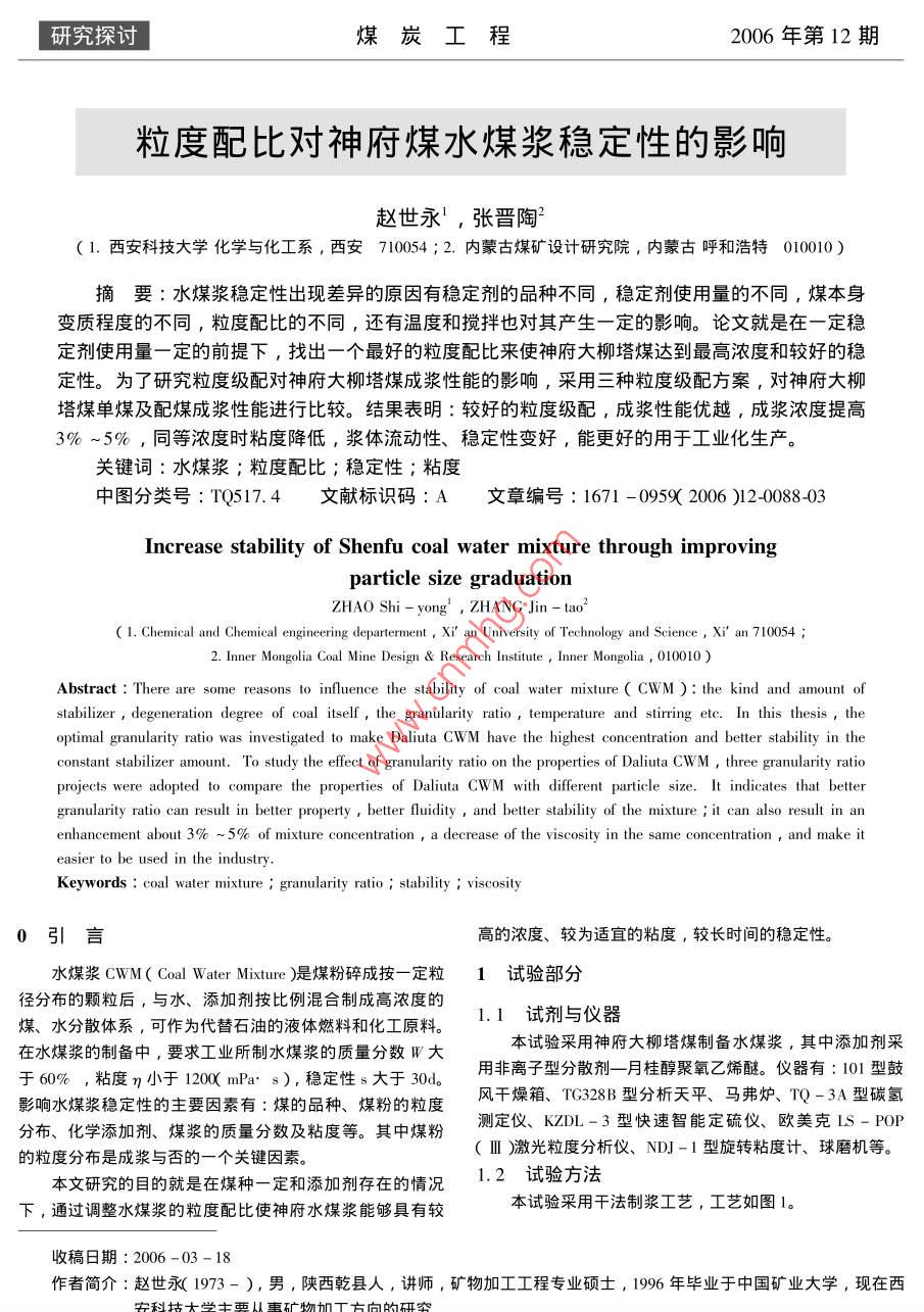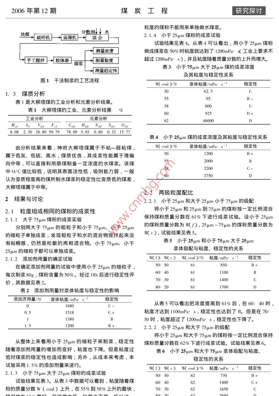 研究探討煤炭工程2006年第12期粒度配比對神府煤水煤漿穩(wěn)定性的影響趙世永,張晉陶1.西安科技大學(xué)化學(xué)與化工系,西安7100542.內(nèi)蒙古煤礦設(shè)計(jì)研究院,內(nèi)蒙古呼和浩特010010)摘要∶水煤漿穩(wěn)定性岀現(xiàn)差異的原因有穩(wěn)定劑的品種不同,穩(wěn)定劑使用量的不同,煤本身變質(zhì)程度的不同,粒度配比的不同,還有溫度和攪拌也對其產(chǎn)生一定的影響。論文就是在一定穩(wěn)定劑使用量一定的前提下,找岀—個(gè)最好的粒度配比來使神府大柳塔煤達(dá)到最高濃度和較好的穩(wěn)定性。為了研究粒度級配對神府大柳塔煤成漿性能的影響,采用三種粒度級配方案,對神府大柳塔煤單煤及配煤成漿性能進(jìn)行比較。結(jié)果表明∶較好的粒度級配,成漿性能優(yōu)越,成漿濃度提高3%~5%,同等濃度時(shí)粘度降低,漿體流動性、穩(wěn)定性變好,能更好的用于工業(yè)化生產(chǎn)。關(guān)鍵詞∶水煤漿;粒度配比;穩(wěn)定性;粘度中圖分類號:TQ517.4文獻(xiàn)標(biāo)識碼:A文章編號:1671-0959(2006)2-008803Increase stability of Shenfu coal water mixture through improvingrticle sizZHAO Shi-yong, ZHANG Jinl. Chemical and Chemical engineering departerment, Xi an University of Technology and Science, Xi'an 7100542. Inner Mongolia Coal Mine Design Research Institute, Inner Mongolia, 010010)Abstract:There are some reasons to influence the stability of coal water mixture( CWM): the kind and amount ofstabilizer, degeneration degree of coal itself, the granularity ratio, temperature and stirring etc. In this thesis, theoptimal granularity ratio was investigated to make Daliuta CWM have the highest concentration and better stability in theconstant stabilizer amount. To study the effect of granularity ratio on the properties of Daliuta CWM, three granularity ratioprojects were adopted to compare the properties of Daliuta CWM with different particle size. It indicates that bettergranularity ratio can result in better property better fluidity, and better stability of the mixture it can also result in anenhancement about 3%0-5% of mixture concentration a decrease of the viscosity in the same concentration, and make iteasier to be used in the industryKeywords: coal water mixture granularity ratio stability ; viscosity高的濃度、較為適宜的粘度,較長時(shí)間的穩(wěn)定性。水煤漿CwM( Coal Water Mixture)是煤粉碎成按一定粒1試驗(yàn)部分徑分布的顆粒后,與水、添加劑按比例混合制成高濃度的煤、水分散體系,可作為代替石油的液體燃料和化工原料。1.1試劑與儀器在水煤漿的制備中,要求工業(yè)所制水煤漿的質(zhì)量分?jǐn)?shù)W大本試驗(yàn)采用神府大柳塔煤制備水煤漿,其中添加劑采于60%,粘度η小于1200mPa·s),穩(wěn)定性s大于30d用非離子型分散劑一月桂醇聚氧乙烯醚。儀器有:101型鼓影響水煤漿穩(wěn)定性的主要因素有:煤的品種、煤粉的粒度風(fēng)干燥箱、TG328B型分析天平、馬弗爐、TQ-3A型碳分布、化學(xué)添加劑、煤漿的質(zhì)量分?jǐn)?shù)及粘度等。其中煤粉測定儀、KZDL-3型快速智能定硫儀、歐美克LS-POP的粒度分布是成漿與否的一個(gè)關(guān)鍵因素。Ⅲ皦激光粒度分析儀、NDJ-1型旋轉(zhuǎn)粘度計(jì)、球磨機(jī)等。本文研究的目的就是在煤種一定和添加劑存在的情況1.2試驗(yàn)方法下,通過調(diào)整水煤漿的粒度配比使神府水煤漿能夠具有較本試驗(yàn)采用干法制漿工藝,工藝如圖1。收稿日期:2006-03-18作者簡介:趙世永(1973-),男,陜西乾縣人,講師,礦物加工工程專業(yè)碩士,1996年畢業(yè)于中國礦業(yè)大學(xué),現(xiàn)在西2006年第12期煤炭工程研究探討粒度的煤粉不能用來單獨(dú)做水煤漿塊破機(jī)“分散劑亦2.1.4小于25μm煤粉的成漿試驗(yàn)試驗(yàn)結(jié)果見表4。從表4可以看出,用小于25μm煤粉測量濃度做成煤漿在50%時(shí)粘度就達(dá)到了1200mPa·(工業(yè)上要求不1工拌!敗體】辣量黏度超過1200mPa·s),并且粘度隨著質(zhì)量分?jǐn)?shù)的上升而增大?!笢y量穩(wěn)定性表3小于75um大于25μm煤的成漿濃度及其粘度與穩(wěn)定性關(guān)系圖1千法制漿的工藝流程W(coa)%漿體粘度/mPa,s穩(wěn)定性1.3煤質(zhì)分析表1是大柳塔煤的工業(yè)分析和元素分析結(jié)果。表1大柳塔煤的工業(yè)、元素分析結(jié)果%工業(yè)分析元素分析460008.082.3038.8059.7978.095.030.800.3215.77表4小于25μm煤的成漿濃度及其粘度與穩(wěn)定性關(guān)系由分析結(jié)果來看,神府大柳塔煤屬于不粘一弱粘煤,w( coal y%o漿體粘度/mPa穩(wěn)定性屬于低灰、低硫、高水,煤質(zhì)優(yōu)良,其成漿性能屬于難偏向中等,可以直接利用原煤制備一定濃度的水煤漿。該煤中OC值比較低,說明其表面活性低,吸附能力弱,一般認(rèn)為變質(zhì)程度高的煤所制水煤漿的穩(wěn)定性比變質(zhì)低的煤差,大柳塔煤屬于中等。2.2兩級粒度配比2結(jié)果與討論2.2.1小于25μm和大于25μm小于75μm的級配2.1粒度組成相同的煤粉的成漿性將小于25μm和25μm到75μm的煤粉按一定比例混合2.1.1大于75μm煤粉的成漿實(shí)驗(yàn)保持煤粉質(zhì)量分?jǐn)?shù)在61%下進(jìn)行成漿試驗(yàn)。設(shè)小于25μm分別用大于75μm的粗粒子和小于75μm、小于25μm的煤粉質(zhì)量分?jǐn)?shù)為∫),25μm~75μm的煤粉質(zhì)量分?jǐn)?shù)為的細(xì)粒子單獨(dú)成漿,發(fā)現(xiàn)粗粒子和水的混合物攪拌起來沒c),試驗(yàn)結(jié)果見表有粘稠感,仍然是松散的兩相混合物。小于75μm、