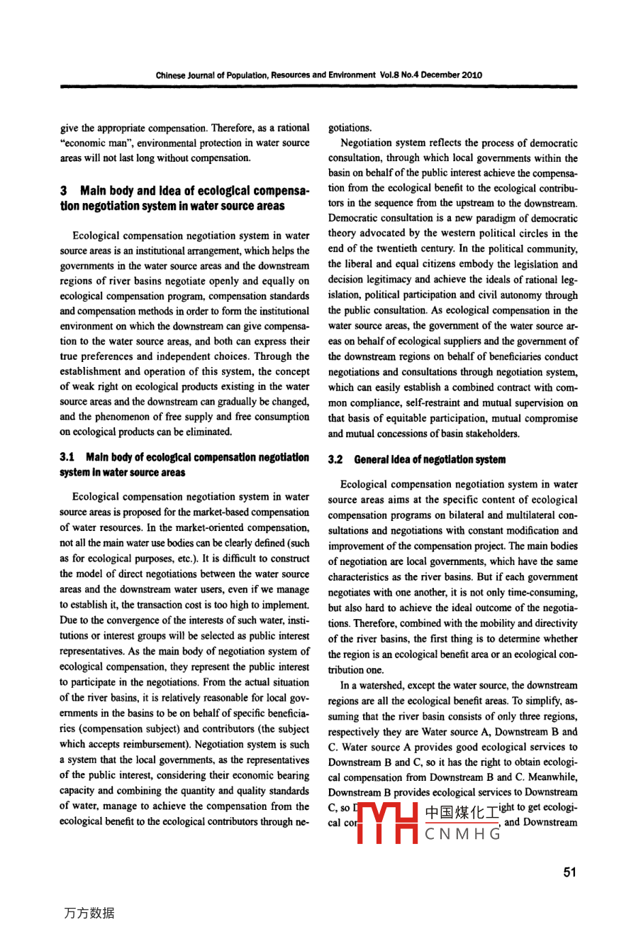 Chinese Jourmal of Populatin, Resources and Environment Vol.8 No.4 December 2010Negotiation System of Ecological Compensation ofWater Source AreasGe Yanxiang', Liu Shuyan2, Wu Feifei', Liang Ljuan'1. School of Economics and Management, Shandong Agricultural University, Tai"an Shandong 271018, China;2. Shandong Communication Media College, Jinan Shandong 250200, ChinaAbstract: In view of no generally acepted ecological compen- between water source areas and the downstream regions ofsation standards and metbods at present, this paper discusses the river basins, the standards and methods of compensationintroduction of the negotiation system to the process of ecologi- can be fixed. In this way, the stakeholders are motivated tocal compensation for water source areas. Tbat is, tbe govenneat extensively participate so that the compensation mechanismin water source areas and the downstream regions of river basins could run more efficiently, democratically and transpar-should confirm their respective rights and obligations and then es- ently.tablish their compensation standards through negotiations accord-ing t0 he dferet purposes of waler use. The amoun ofcompep 2 Extenalities of ecological benefts and eco-sation should be determined in the comprehensive considerationlogical compensation in water source areasof the quality, quantity and compensation price of water. Throughopen and fair negotiations, an institutional arangement will be setThe development, usage and protection of the ecologicalup, which can make the waler soure areas and the downsteam resources in water source areas will produce exteralitie.regions of river basins fully express their true preferences and theirThe existence of externality easily causes market failure.independent choices on the ecological environmentIn accordance with the views of economist Pigou (1952),Key words: water resource, cological compensation,n negoiation the government should pay compensation with financialsystem, extemalityrevenue for the positive extermalities, and impose a fine forthe negative extemalties, so that the private cost of the ex-1 Introductiontermnality producer is equal to social cost, in such a case thesocial welfare is enhanced.Ecological compensation, an economic measure to pro-tect the ecological environment of the downstream regions2.1 Extermality of ecologlcal compensation In waterof river basins, is the syntbesis of interest-driven, incentivesource areasand coordination mechanism that can promote ecologicalWater source areas will produce positive externality toprotection of the upstream areas. In the existing researchsoil and water conservation, watershed protection and waterand practice of ecological compenstion for water soure quality improvement when it protects and constructs theareas, the focuses and difculties are the determination ofecological environment resources. The positive extemnalitycompensation standards. Both the goverment compensa- makes the downstream gain profts more than the upstream,tion and the market compensation are the most controversialand the difference would constitute the positive external-issues in the eco-compensation. Ecological compensation ity of the ecological management (Ge, 2009). Accordinginvolves multiple main bodies, and there are no generally to extemnality theory, either the positive extermality or theaccepted standards and methods of compensation at pres- negative externality needs to achieve internalization. Theent. The implementation of current ecological or contingentimplementation of ecological compensation system, an ef-valuation method for water resources is dificult, and the act fective measure to achieve intermalization of economic ex-bodies are difficult to reach an agreement.ternalities, can correct the market failure which is caused byIn order to reduce transaction costs, a negotiation system economic extermalities in the field of ecological protectioncan be introduced into the process of ecological compensa- (Li, 2006), and achieve the optimal alcaion of ecologicaltion in the water source areas. Through the consultations resour中國(guó)煤化工Received 26 April 2010; acepted 17 July 2010TYHCNMHGCorresponding autbo: Ge Yanrxiang (geyarxiang@126.com)l9Chinese Joumal of Population, Resources and Emironment Vol.8 No.4 December 2010For the act body of the ecological construction, if the ex- areas and the downstream regions can be seen as“smalltermal cost cannot get compensation, they will certainly pro- pig”" and“big pig" in the process of the game. The optionsduce enough amount in accordance with their own needs (at for two sides are as fllows: option one, the downstream in-the intersection of the marginal private cost curve and the vests two units solely, the water source areas do not invest.marginal individual beneft curve) instead of social needs, At a result, the water source areas can obtain four units'thus causing supply shortage.benefits, while downstream gets four units' (10-4-4=4);For those who obtain external benefts without bearing option two, the water source areas invest two units solely,the extermal cost, they would further expand the invisiblethe downstream does not invest. The downstream can obtaindemand. At this time, there is a certain gap between the nine units' benefts, while the water source gets -1 unit (10quantity that the main body of the ecological construction-9-2=-1); option three, both the upstream and the down-is willing to produce and the quantities of the social needs, stream invest the same units to protect the basin ecologicaland this gap is just the shortage of the ecological construc-environment, the downstream gets six units' profits, andtion products. In this case, market mechanism has lost its only two units' profits are left to the water source areas; op-function, and inadequate supply of ecological construction tion four, neither the upstream nor the downstream invests,will result in the loss of social benefts.in this case, both sid