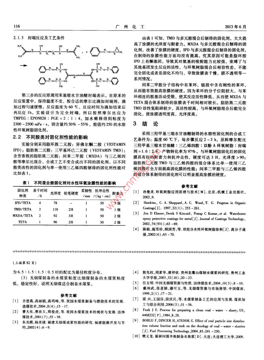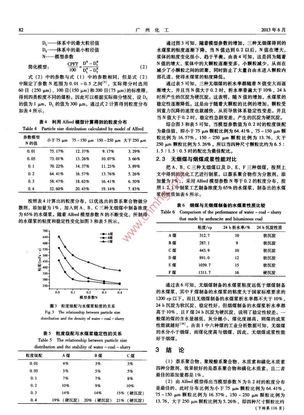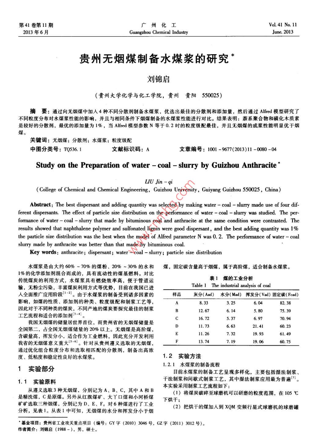 第41卷第11期廣州化工Vol 41 No 112013年6月Guangzhou Chemical IndustryJune 2013貴州無(wú)煙煤制備水煤漿的研究劉錦啟(貴州大學(xué)化學(xué)與化工學(xué)院,貴州貴陽(yáng)550025)摘要:通過(guò)向無(wú)煙煤中加入4種不同分散劑制備水煤漿,優(yōu)選出最佳的分散劑和添加量,然后通過(guò) Alfred模型研究了不同粒度分布對(duì)水煤漿性能的影響,并且與相同條件下煙煤制備的水煤漿性能進(jìn)行對(duì)比。結(jié)果表明:萘系聚合物和磺化木質(zhì)素是較好的分散劑,最優(yōu)的添加量為1%,當(dāng) Alfred模型參數(shù)N等于0.2時(shí)的粒度級(jí)配最佳,并且無(wú)煙煤的成漿性能明顯優(yōu)于煙煤。關(guān)鍵詞:無(wú)煙煤;分散劑;水煤漿;粒度級(jí)配中圖分類號(hào):TQ536.1文獻(xiàn)標(biāo)識(shí)碼:A文章編號(hào):1001-9677(2013)1-0080-04Study on the Preparation of water-coal-slurry by Guizhou AnthraciteLIU JinCollege of Chemical and Chemical Engineering, Guizhou University, Guiyang Guizhou 550025, China)Abstract: The best dispersant and adding quantity was selected by making water-coal-slurry made use of four dif-ferent dispersants. The effect of particle size distribution on the performance of water-coal-slurry was studied. The per-formance of water-coal-slurry that made by bituminous coal and anthracite at the same condition were contrasted.Theresults showed that naphthalene polymer and sulfonated lignin were good dispersant, and the best adding quantity was 1%the particle size distribution was the best when the model of Alfred parameter n was 0. 2. The performance of water-coalslurry made by anthracite was better than that made by bituminous coal.Key words: anthracite; dispersant; water-coal-slurry; particle size distribution水煤漿是由大約60%~η0%的煤粉、2ω0%~30%的水和煤,固定碳含量高于煙煤,屬于高階煤,適合制備水煤漿。1%的化學(xué)添加劑混合而成的,具有流動(dòng)性的煤基燃料。對(duì)比傳統(tǒng)煤炭的利用方式,水煤漿具有燃燒效率高,便于管道運(yùn)表1煤的工業(yè)分析輸,無(wú)粉塵污染,豐富煤炭利用方式等優(yōu)勢(shì),目前在我國(guó)已進(jìn)Table 1 The industrial analysis of coal入全面推廣應(yīng)用階段12。由于水煤漿的制備受到諸多因素的樣品灰分(Aad)水分(Mnd)揮發(fā)分(vad)固定碳(Fad)影響,如煤的性質(zhì)、添加劑的種類、粒度級(jí)配和制漿工藝等8.333.256.0482.38因此對(duì)于不同種類的煤炭,不同產(chǎn)地的煤炭要探究最佳的制漿工藝流程和適合的添加劑34。我國(guó)無(wú)煙煤的儲(chǔ)量居世界首位,而貴州省的無(wú)煙煤儲(chǔ)量是.9全國(guó)第二,占全國(guó)無(wú)煙煤儲(chǔ)量的20%以上。無(wú)煙煤是高階煤,含碳量高,揮發(fā)分小,適合作為工業(yè)燃料,因此充分開(kāi)發(fā)利用11.267.32我省的無(wú)煙煤意義重大6。針對(duì)從貴州遵義選取的無(wú)煙煤F13.7460.75通過(guò)優(yōu)化組合粒度分布和選取相匹配的分散劑,制備出高濃度、低粘度和穩(wěn)定性良好的水煤漿。1.2實(shí)驗(yàn)方法1.2.1水煤漿的制備流程1實(shí)驗(yàn)部分目前水煤漿的制備工藝呈現(xiàn)多樣化,主要包括濕法制漿1.1實(shí)驗(yàn)原料干法制漿和間歇式制漿工藝,其中濕法制漿應(yīng)用最為普遍。本實(shí)驗(yàn)采用制漿工藝流程如下從遵義選取3種無(wú)煙煤,分別記為A、B、C,其中A和B是精洗煤,C是原煤。另外從紅旗煤礦、大丫口煤和小河橋煤下烘干;(1)將煤炭破碎至球磨機(jī)可以研磨的粒度范圍,在105℃礦礦選取三種煙煤,分別記為D、E、F。對(duì)6種煤進(jìn)行了工業(yè)分析,見(jiàn)表1。從表1中可知,無(wú)煙煤的水分和揮發(fā)分小于煙(2)把烘干的煤加人到XQM變頻行星式球磨機(jī)的球磨罐基金項(xiàng)目:貴州省工業(yè)攻關(guān)重點(diǎn)項(xiàng)目(編號(hào):CY字(2010)3046號(hào),CZ字(2011)3012號(hào))。作者簡(jiǎn)介:劉錦啟(1988-),男,碩士。第41卷第11期劉錦啟:貴州無(wú)煙煤制備水煤漿的研究中,研磨至粉末狀,然后用200目標(biāo)準(zhǔn)篩進(jìn)行篩分,篩上部分再分別用100目和60目的標(biāo)準(zhǔn)篩進(jìn)行篩分,得到四種粒度的煤碳化木質(zhì)素粉一系聚合物(3)按照一定的粒度級(jí)配,把煤粉、水和添加劑再放入XQM變頻行星式球磨機(jī)的球磨罐中,以一定轉(zhuǎn)速研磨成均勻的漿體水煤漿性質(zhì)的測(cè)定水煤漿的粘度的測(cè)定使用NXS-4C型水煤漿粘度計(jì)進(jìn)行測(cè)定,析水率和濃度按照國(guó)標(biāo)GBT1882-200和GBT8856.42002來(lái)測(cè)定,并結(jié)合落棒法測(cè)試24h時(shí)沉淀的性質(zhì),表征0.00.20.40.6081012141.6.82.02.2添加量{%水煤漿的穩(wěn)定性。圖1分散劑添加量與水煤漿粘度的關(guān)系2結(jié)果與討論Fig 1 The relationship between the quantityof the dispersant and the density of water- coal-slury2.1選取合適的分散劑種類和添加量由于水煤漿的成漿性能受諸多因素影響,為避免煤的性質(zhì)160碳化木質(zhì)素對(duì)制漿工藝的影響,因此采用已知成漿性能較好的無(wú)煙煤A進(jìn)13族系聚合物行制漿,以選取合理的分散劑。選用萘系聚合物、聚羧酸系聚合物、木質(zhì)素和磺化木質(zhì)素四種物質(zhì)作為分散劑,制備濃度為260%和65%的水煤漿,其中分散劑的添加量都為1.5%,所制備的水煤漿的性質(zhì)見(jiàn)表2和表3。表2濃度為60%的水煤漿的性質(zhì)Table 2 The performance of water-coal-slurrywhen the density is 60%08101.2141.6182.02.2粘度/cp24h析水率/%24h沉淀性質(zhì