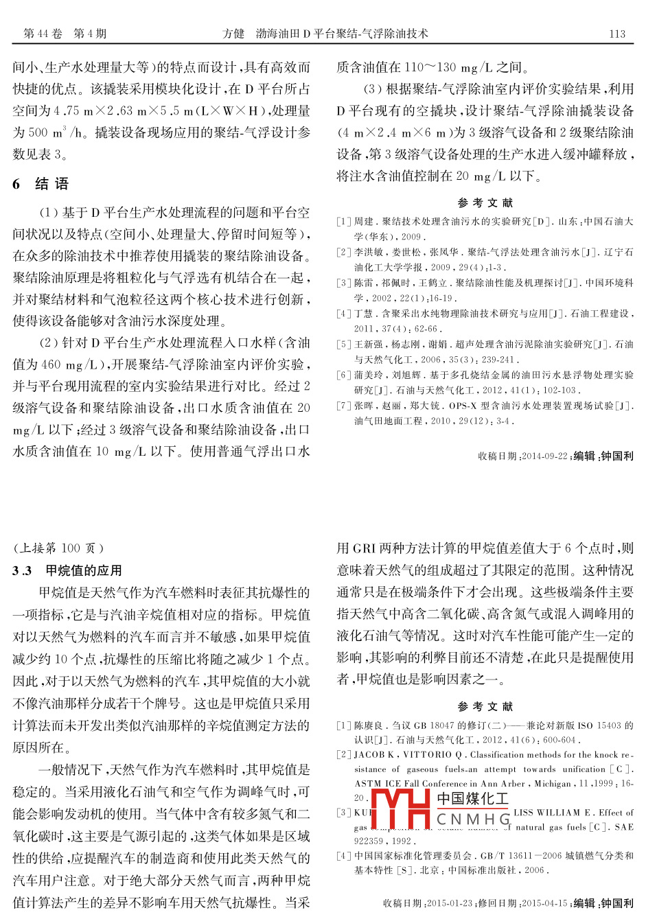 石油與天然氣化工第44卷第4期CHEMICAL ENGINEERING OF OIL gas97ISO/TR22302《天然氣-甲烷值計(jì)算》的解讀唐蒙蔡黎1.中國(guó)石油西南油氣田公司天然氣研究院2.中國(guó)石油天然氣集團(tuán)公司天然氣質(zhì)量控制能量計(jì)量重點(diǎn)實(shí)驗(yàn)室摘要介紹了ISO/TR22302:2014的主要內(nèi)容,包括甲烷值的定義,美國(guó)氣體研究院的兩種甲烷值計(jì)算方法,給出了方法的限定范圍,給出了36個(gè)歐洲、30個(gè)中國(guó)和泰國(guó)的天然氣組成計(jì)算的甲烷值。討論了同一天然氣組成采用美國(guó)氣體研究院兩種方法計(jì)算甲烷值時(shí),如果甲烷值之間的差值超過(guò)6個(gè)點(diǎn),那么應(yīng)該是該天然氣的組成不符合計(jì)算方法的限定范圍。ISO/TR22302:2014為甲烷值的應(yīng)用提供了有利的技術(shù)支持。關(guān)鍵詞天然氣甲烷值組成計(jì)算方法中圖分類號(hào):TE642文獻(xiàn)標(biāo)志碼:ADOI:10.3969/ I.Issn.1007-3426.2015.04.020A brief understanding on the ISO /TR 22302Natural Gas-calculation of Methane NumberTang mel(I. Research Institute of Natural Gas Technology, PetroChina Southwest Oil& Gasfield Com pany, Cheng du 610213, China)(2. Key Laboratory of Natural Gas Quality and Energy Measurement, CNPC, Chengdu 610213, China)Abstract: This article introduced the main contents of ISO/TR 22302. 2014, including the definition of methane number, two calculation methods of methane number developed by Gas Research Institute (GRI), listed the limitation of two methods and calculated the methane numbers of 36 gasmixtures from European and 30 gas mixtures from China and Thailand. It discussed that if the difference betw een two GRI methods is more than 6, the composition of natural gas should not be in accordance with the limitation of the calculation method. ISO/TR 22302: 2014 gives the technical sup-orts for application of methane num berKey words natural gas, methane number, composition, calculation method2014年6月,ISO發(fā)布了IsO/TR22302:20141技術(shù)報(bào)告的背景《天然氣-甲烷值計(jì)算》技術(shù)報(bào)告。此項(xiàng)技術(shù)報(bào)告是2003年,在ISO/TC193召開(kāi)的年會(huì)期間,中國(guó)ISO/TC193天然氣技術(shù)委員會(huì)WG6工作組起草的代表團(tuán)接受了承擔(dān)TC193甲烷值工作組召集人的工該工作組是中國(guó)專家擔(dān)任工作組召集人。這是在天然作。中國(guó)石油西南油氣田公司天然氣研究院主導(dǎo)編寫氣領(lǐng)域,由中國(guó)專家擔(dān)任工作組召集人而完成的首個(gè)的《天然氣甲烷值計(jì)算》國(guó)際技術(shù)報(bào)告由國(guó)際標(biāo)準(zhǔn)化ISO技術(shù)報(bào)告。以下就技術(shù)報(bào)告的背景和主要內(nèi)容進(jìn)組織在中國(guó)煤化工這是我國(guó)在天然氣標(biāo)準(zhǔn)行解讀和說(shuō)明。化領(lǐng)域CNMH術(shù)報(bào)告作者簡(jiǎn)介:唐蒙(1962—)髙工,1983年華東石油學(xué)院畢業(yè),現(xiàn)就職于中國(guó)石油西南油氣田公司天然氣研究院。一直從事天然氣分析測(cè)試方法研究、標(biāo)準(zhǔn)化及相關(guān)管理工作。作為主要起草人,編寫了GB17820、GB13610等多項(xiàng)國(guó)家標(biāo)準(zhǔn),研制了多種天然氣分析用國(guó)家一級(jí)和二級(jí)標(biāo)準(zhǔn)物質(zhì)。Emal:tang@petrochina.com,cn98唐蒙等IsO/TR22302《天然氣-甲烷值計(jì)算》的解讀2015此項(xiàng)技術(shù)報(bào)告之所以耗費(fèi)較長(zhǎng)的時(shí)間,分歧主要表1MN計(jì)算公式各組分的代號(hào)和名稱為,目前在歐洲主要采用奧地利AVL公司提出的計(jì)Table 1 Symbols of different componentsin the mon cal cul ation formul a算方法,但AVL只提供商用軟件,不公開(kāi)其計(jì)算模組分代號(hào)123型。在北美主要采用美國(guó)氣體研究院(GRⅠ提出的計(jì)組分名稱甲烷乙烷丙烷丁烷二氧化碳算方法。在編制過(guò)程中,起草組在缺少AVL方法的情況下,只能根據(jù)歐洲、中國(guó)和泰國(guó)提供的天然氣組成2.3.2天然氣氫碳比與辛烷值關(guān)聯(lián)式數(shù)據(jù),采用GRI的兩種方法計(jì)算了甲烷值及其差值,使用氫碳比計(jì)算MON的公式如下并指出計(jì)算方法的限定范圍。MON=-406.14+508.04R-173.55R+20.17R2技術(shù)報(bào)告的主要內(nèi)容式中,R為氣體燃料氫原子與碳原子數(shù)目的比值2.1范圍在GRI用于辛烷值試驗(yàn)的氣體燃料的源組成數(shù)IsO/丌R2302:2014規(guī)定了已知?dú)怏w摩爾組成據(jù)中,重?zé)N組分是丁烷。實(shí)際上,對(duì)于真實(shí)氣體,重?zé)N的干天然氣的甲烷值(MN, methane number)的計(jì)算可能是C,甚至為C。如果考慮丁烷以上的重?zé)N,方法氫碳比可能不同。不僅需考慮比丁烷輕的烴組分,還美國(guó)氣體研究院(GRI方法用來(lái)計(jì)算氣體的甲烷應(yīng)考慮所有烴組分。值(MN)和馬達(dá)法辛烷值(MON, motor octane num-23.3天然氣甲烷值與辛烷值的關(guān)聯(lián)式ber),線性關(guān)系適用于甲烷含量高的天然氣抗爆性的使用MON計(jì)算MN,以及使用MN計(jì)算MON比較和測(cè)量。的公式如下2.2定義MN=1.445MON-103.42(3)甲烷值(MN):衡量氣體燃料抗爆性的指標(biāo),在標(biāo)MON=0.679MN+72.3(4)準(zhǔn)規(guī)定的爆震試驗(yàn)條件下,具有相同的爆震趨勢(shì)的氣式(3)和式(4)不是完全線性的,因此這兩個(gè)關(guān)聯(lián)體燃料具有相同的爆震指標(biāo)。規(guī)定純甲烷作為抗爆性式相互間并不是完全可逆的標(biāo)準(zhǔn)燃料,純甲烷的甲烷值為100,而純氫氣作為不