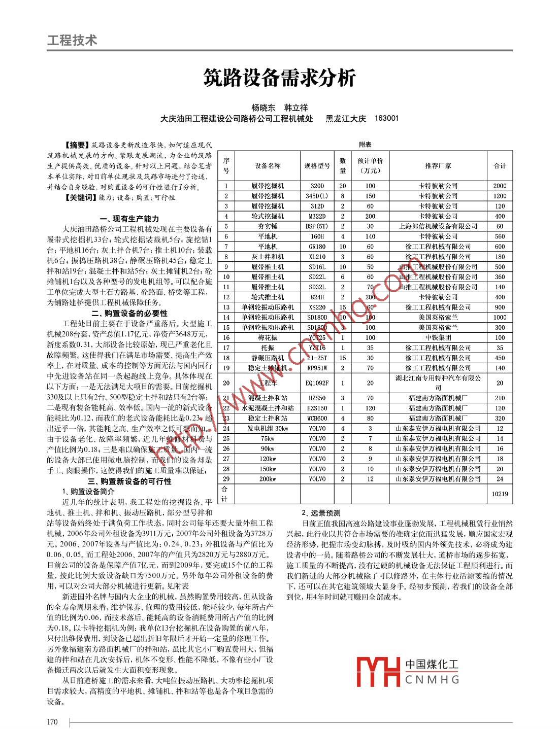 工程技術(shù)筑路設(shè)備需求分析楊曉東韓立祥大慶油田工程建設(shè)公司路橋公司工程機(jī)械處黑龍江大慶 163001[摘要]筑路設(shè)備更新改造很快,如何適應(yīng)現(xiàn)代附表筑路機(jī)械發(fā)展的方向、緊跟發(fā)展潮流,為企業(yè)的筑路序數(shù)預(yù)計(jì)單價(jià)生產(chǎn)提供高效、優(yōu)質(zhì)的設(shè)備。針對(duì)以上問(wèn)題,結(jié)合筆者店設(shè)備名稱(chēng)規(guī)格型號(hào)|雙推薦廠(chǎng)家.|合計(jì)量| (萬(wàn)元)本單位實(shí)際,對(duì)目前單位現(xiàn)狀及筑路市場(chǎng)進(jìn)行了論述,并結(jié)合自身經(jīng)驗(yàn),對(duì)購(gòu)置設(shè)備的可行性進(jìn)行了分析。履帶挖掘機(jī)320D 20100卡特彼勒公司|2000[關(guān)鍵詞]能力;設(shè)備;購(gòu)置;可行性345D(L)8I151200312D輪式挖掘機(jī)200|40-.現(xiàn)有生產(chǎn)能力大慶油田路橋公司工程機(jī)械處現(xiàn)在主要設(shè)備有夯實(shí)錘BSP (5T)30上海郎信機(jī)械設(shè)備有限公司一6履帶式挖掘機(jī)33臺(tái);輪式挖掘裝載機(jī)5臺(tái);旋挖鉆1平地機(jī)160HT140二560臺(tái);平地機(jī)16臺(tái);灰土拌合機(jī)7臺(tái);推土機(jī)10臺(tái):裝載-GR180徐工工程機(jī)械有限公司機(jī)6臺(tái);振搗壓路機(jī)38臺(tái);靜碾壓路機(jī)45臺(tái);穩(wěn)定土9灰土拌和機(jī)XL2106050080履帶推士機(jī)SD16LT150山推工程機(jī)械股份有限公司拌和站19臺(tái);混凝土拌和站5臺(tái);灰土攤鋪機(jī)2臺(tái);砼10履帶推土機(jī)SD22L6C|36攤鋪機(jī)1臺(tái)以及各種型號(hào)的發(fā)電機(jī)組等??梢耘浜鲜┕挝煌瓿纱笮屯潦铰坊?、砼路面、橋梁等工程,[ 11SD32L1412824H為鋪路建橋提供工程機(jī)械保障任務(wù)。13| 單 鋼輪振動(dòng)壓路機(jī)XS220 15 十90-.購(gòu)置設(shè)備的必要性14|單鋼輪 振動(dòng)壓路機(jī)SD180D 10|美國(guó)英格索蘭「1000工程處目前主要在于設(shè)備嚴(yán)重落后。大型施工15單鋼輪振動(dòng)壓路機(jī) SD180D 3[300機(jī)械208臺(tái)套,資產(chǎn)總值1.17億元,凈資產(chǎn)3648萬(wàn)元,16每花振YCT25 1中鐵集團(tuán)00]新度系數(shù)0.31,大部設(shè)備比較原始,現(xiàn)已嚴(yán)重老化且17托振YZT16T 1 f35故障頻繁。這使得我們?cè)跐M(mǎn)足市場(chǎng)需要、提高生產(chǎn)效H 18靜碾壓路機(jī)21-25T 15率上,在對(duì)質(zhì)量、成本的控制等方面無(wú)法與國(guó)內(nèi)同行「19穩(wěn)定土攤鋪機(jī)RP951W2t中先進(jìn)設(shè)備站在同一條起跑線(xiàn) 上競(jìng)爭(zhēng)。具體體現(xiàn)在湖北江南專(zhuān)用特種汽車(chē)有限公以下方面:一是無(wú)法滿(mǎn)足大項(xiàng)目的需要。目前挖掘機(jī)工程車(chē)EQ1092F||2(330及以上只有2臺(tái)、500型穩(wěn)定土拌和站只有2臺(tái)等,「21混凝士拌和站_HZS5070福建南方路面機(jī)械廠(chǎng)上210二是現(xiàn)有裝備能耗高、效率低。國(guó)內(nèi)-流的新式設(shè)備22 水泥混凝 士拌和站HZS150L 120能耗比為0.12,而我們]的老式設(shè)備能耗比是0.23,超[ 23穩(wěn)定土拌和站W(wǎng)CB600 4|320出近乎-倍,其能耗之高、生產(chǎn)效率之低可想而知。[ 24發(fā)電機(jī)組30kwVOLvO 4山東泰安伊萬(wàn)福電機(jī)有限公司12由于設(shè)備老化、故障率頻繁,近幾年維修材料費(fèi)與[ 2575kwVOLVO山東泰安伊萬(wàn)福電機(jī)有限公司產(chǎn)值比例為0.18;三是難以確保施工質(zhì)量。國(guó)內(nèi)- -流的設(shè)備大部已使用微電腦控制,而我們的設(shè)備卻是27120kw山東泰安伊萬(wàn)福電機(jī)有限公司18手工、肉眼操作,這使得我們的施工質(zhì)量難以保證: 28150kw山東泰安伊萬(wàn)福電機(jī)有限公司2三.購(gòu)置新設(shè)備的可行性29|200kwVOLVOT 21.購(gòu)置設(shè)備簡(jiǎn)介合|10219近幾年的統(tǒng)計(jì)表明,我工程處的挖掘設(shè)備、平計(jì)⊥地機(jī)、推土機(jī)、拌和機(jī)、振動(dòng)壓路機(jī),部分型號(hào)拌和2.遠(yuǎn)景預(yù)測(cè)站等設(shè)備始終處于滿(mǎn)負(fù)荷工作狀態(tài),同時(shí)公司每年還要大量外租工程目前正值我國(guó)高速公路建設(shè)事業(yè)蓬勃發(fā)展,工程機(jī)械租賃行業(yè)悄然機(jī)械,2006年公司外租設(shè)備為3911萬(wàn)元; 2007年公司外租設(shè)備為3728萬(wàn)興起, 此行業(yè)以其符合市場(chǎng)需要的準(zhǔn)確定位而迅猛發(fā)展,順應(yīng)國(guó)家宏觀(guān)元。2006.2007年設(shè)備與產(chǎn)值比為: 0.24、0.23;外租設(shè)備與產(chǎn)值比為經(jīng)濟(jì)形勢(shì), 把握市場(chǎng)變幻脈搏,及時(shí)吸納國(guó)內(nèi)外領(lǐng)先技術(shù),必將成為建0.06. 0.05。而工程處2006.2007年的產(chǎn)值只為2820萬(wàn)元與2880萬(wàn)元。設(shè) 者中的一一員。 隨著路橋公司的不斷發(fā)展壯大,道橋市場(chǎng)的逐步拓寬,目前公司的設(shè)備是保障產(chǎn)值7億元,而到2009年,要完成15個(gè)億的工程施 工質(zhì)量的不斷提高,沒(méi)有過(guò)硬的機(jī)械設(shè)備無(wú)法保證工程順利進(jìn)行。而量,按此比例大致設(shè)備缺口為7500萬(wàn)元。另外每年公司外租設(shè)備的費(fèi)我們]新進(jìn)的大部分機(jī)械除了可以修路外,在主體行業(yè)活源萎縮的情況用,可以對(duì)公司大部分機(jī)械進(jìn)行更新。見(jiàn)附表下,還可以在其它建筑領(lǐng)域大顯身手。經(jīng)初步預(yù)測(cè),若我們的設(shè)備全部新進(j
