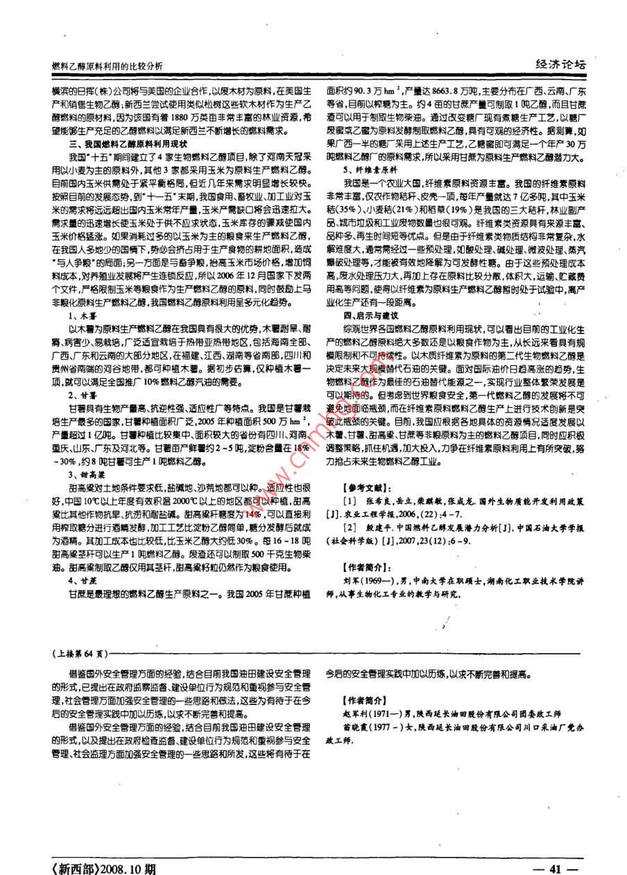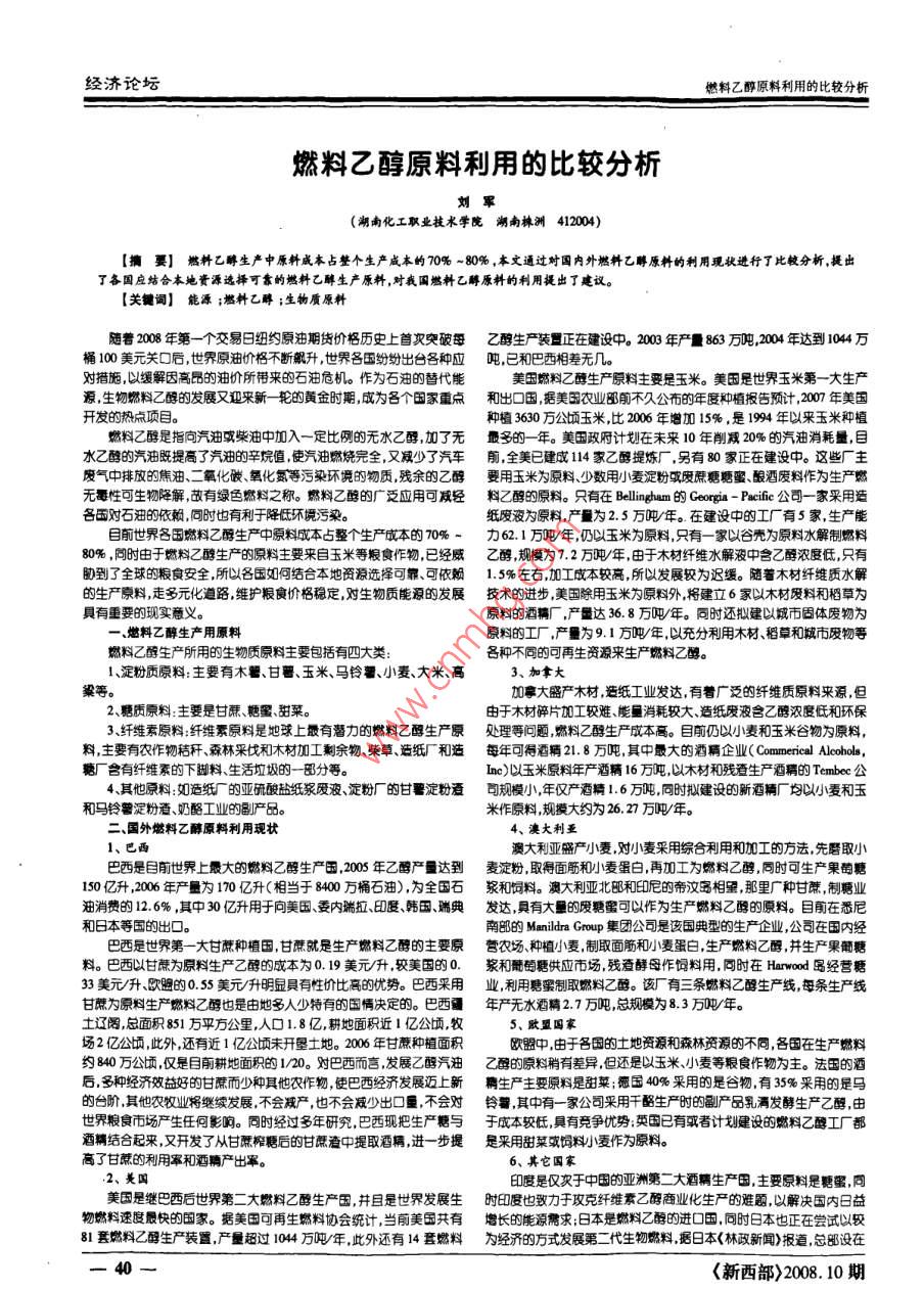 經(jīng)濟(jì)論壇燃料乙醇原料利用的比較分析燃料乙醇原料利用的比較分析劉軍(湖南化工職業(yè)技術(shù)學(xué)院湖南株洲412004)【摘要】燃料乙醇生產(chǎn)中原料成本占整個(gè)生產(chǎn)成本的70%~80%,本文通過(guò)對(duì)國(guó)內(nèi)外燃料乙醇原料的利用現(xiàn)狀進(jìn)行了比較分析提出了各國(guó)應(yīng)結(jié)合本地資源選擇可靠的燃料乙醇生產(chǎn)原料對(duì)我國(guó)燃料乙醇原料的利用提出了建議。【關(guān)鍵詞】能源;燃料乙醇;生物質(zhì)原料隨著2008年第一個(gè)交易日紐約原油期貨價(jià)格歷史上首突破每乙醇生產(chǎn)裝置正在建設(shè)中2003年產(chǎn)量863萬(wàn),2004年達(dá)到104萬(wàn)桶100美元關(guān)口后,世界原油價(jià)格不斷飆升,世界各國(guó)紛紛出各種應(yīng)噸已和巴西相差無(wú)幾對(duì)措施,以緩解因高昂的油價(jià)所帶來(lái)的石油危機(jī)。作為石油的替代能美國(guó)燃料乙醇生產(chǎn)原料主要是玉米。美國(guó)是世界玉米第一大生產(chǎn)源,生物燃料乙醇的發(fā)展又迎來(lái)新一輪的黃金時(shí)期成為各個(gè)國(guó)家重點(diǎn)和出口國(guó)據(jù)美國(guó)農(nóng)業(yè)部前不久公布的年度種植報(bào)告預(yù)計(jì)2007年美開(kāi)發(fā)的熱點(diǎn)項(xiàng)目。種植3630方公頃玉米比2006年增加15%,是1994年以來(lái)玉米種植燃料乙醇是指向汽油或柴油中加入一定比例的無(wú)水乙醇,加了無(wú)最多的一年。美國(guó)政府計(jì)劃在未來(lái)10年削減20%的汽油消耗量目水乙醇的汽油既提高了汽油的辛烷值,使汽油燃燒完全,減少了汽車前,全美已建成114家乙醇提煉廠,另有80家正在建設(shè)中這些廠主廢氣中排放的焦油、二氧化碳、氧化氮等污染環(huán)境的物質(zhì),殘余的乙醇要用玉米為原料、少數(shù)用小麥淀粉或廢蔗糖糖蜜釀酒廢料作為生產(chǎn)燃無(wú)毒性可生物降解,故有綠色燃料之稱。燃料乙醇的廣泛應(yīng)用可減輕料乙醇的原料。只有在 Bellingham的 Georgia-Pacific公司一家采用造各國(guó)對(duì)石油的依賴,同時(shí)也有利于降低環(huán)境污染。下成本的70力621萬(wàn)噸年以玉米為原料只有一家以谷殼為原料水解制燃料紙廢液為原料,產(chǎn)量為2.5萬(wàn)噸/年。在建設(shè)中的工廠有5家,生產(chǎn)能目前世界各國(guó)燃料乙醇生產(chǎn)中原料成本占整個(gè)生產(chǎn)80%,同時(shí)由于燃料乙醇生產(chǎn)的原料主要來(lái)自玉米等糧食作物,已經(jīng)威乙醇,規(guī)模為7.2萬(wàn)噸/年,由于材纖維水解液中含乙醇濃度低只有助到了全球的食安全,所以各國(guó)如何結(jié)合本地資源選擇可靠、可依賴1.5%左右加工成本較高所以發(fā)展較為遲緩隨著木材纖維質(zhì)水解的生產(chǎn)原料,走多元化道路,維護(hù)糧食價(jià)格穩(wěn)定,生物質(zhì)能源的發(fā)展技術(shù)的進(jìn)步,美國(guó)除用玉米為原料外將建立6家以木材廢料和稻草為重要的現(xiàn)實(shí)意義。原料的酒精廠產(chǎn)量達(dá)36.8萬(wàn)噸/年。同時(shí)還擬建以城市固燃料乙醇生產(chǎn)用原料原料的工廠產(chǎn)量為9.1方噸/年,以充分利用木材、稻草和城市廢燃料乙醇生產(chǎn)所用的生物質(zhì)原料主要包括有四大類:各種不同的可再生資源來(lái)生產(chǎn)燃料乙醇。1、淀粉質(zhì)原料:主要有木薯、甘普、玉米、馬鈴薯、小麥、大米、高3、加拿大梁等。加拿大盛產(chǎn)木材,造紙工業(yè)發(fā)達(dá),有著廣泛的纖維質(zhì)原料來(lái)源,但2、糖質(zhì)原料:主要是甘蔗、糖蜜、甜菜。由于木材碎片加工較難、能量消耗較大、造紙廢液含乙醇濃度低和環(huán)保3、纖維素原料纖維素原料是地球上最有潛力的燃料乙醇生產(chǎn)原處理等問(wèn)題,燃料乙醇生產(chǎn)成本高。目前仍以小麥和玉米谷物為原料,料主要有農(nóng)作物秸稈、森林采伐和木材加工剩余物、柴草、造紙廠和造每年可得酒精21.8萬(wàn)噸,其中最大的酒精企業(yè)Commerical Alcohols糖廠含有纖維素的下腳料、生活垃圾的一部分等。Inc)以玉米原料年產(chǎn)酒精16萬(wàn)噸以木材和殘生產(chǎn)酒精的 Tembec公4、其他原料:如造紙廠的亞硫酸鹽紙漿廢液、淀粉廠的甘薯淀查司規(guī)模小,年僅產(chǎn)酒精1.6萬(wàn)噸,同時(shí)擬建設(shè)的新酒精廠均以小麥和玉和馬鈴薯淀粉、奶酪工業(yè)的副產(chǎn)品。米作原料,規(guī)摸大約為26.27萬(wàn)噸/年。二、國(guó)外燃料乙醇原料利用現(xiàn)狀4、澳大利亞1、巴西澳大利亞盛產(chǎn)小麥,對(duì)小麥采用綜合利用和加工的方法,先磨取小巴西是目前世界上最大的燃料乙醇生產(chǎn),2005年乙醇產(chǎn)量達(dá)到麥淀粉取得面筋和小麥蛋白再加工為燃料乙醇,同時(shí)可生產(chǎn)果萄糖150億升,2006年產(chǎn)量為170億升(相當(dāng)于8400萬(wàn)桶石油),為全國(guó)石漿和飼料。澳大利亞北部和印尼的帝汝島相望,那里廣種甘蔗制糖業(yè)油消費(fèi)的12.6%,其中30億升用于向美國(guó)、委內(nèi)瑞拉、印、韓國(guó)、瑞典發(fā)達(dá),具有大量的廢糖蜜可以作為生產(chǎn)燃料乙醇的原料目前在悉尼和日本等國(guó)的出口。南部的 Manildra Group集團(tuán)公司是該國(guó)典型的生產(chǎn)企業(yè),公司在國(guó)內(nèi)經(jīng)巴西是世界第一大甘蔗種植國(guó),甘蔗就是生產(chǎn)燃料乙醇的主要原營(yíng)