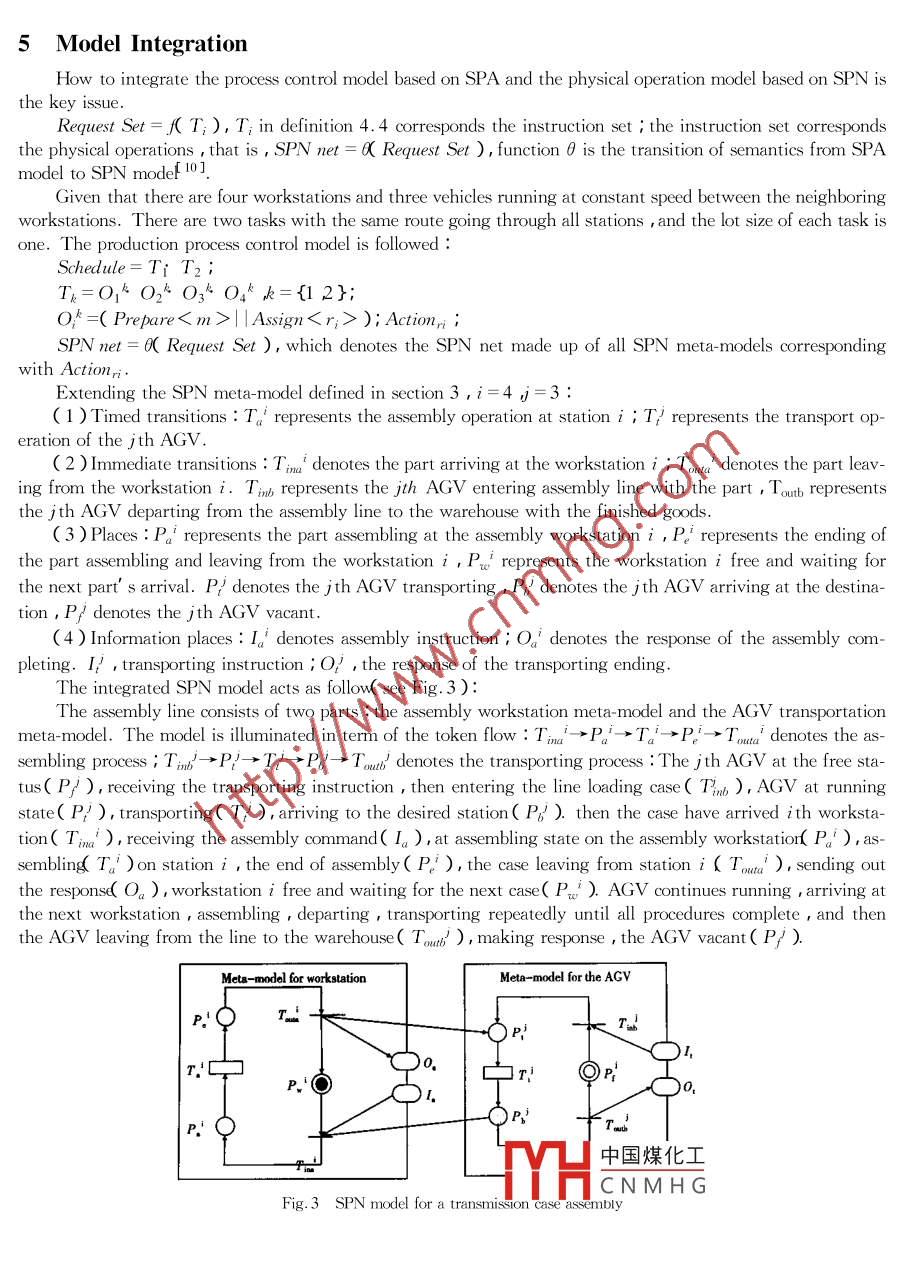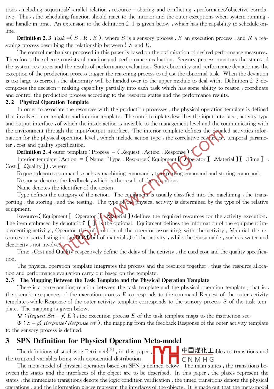 Research on Production Process Control Method Combined StochasticProcess Algebra and Stochastic Petri NetsLIU Chang SHI Haibo( Shenyang Inst. of Automation , Chinese Academy of Sciences , Shenyang 110016 , China E mail ichangl@sia. cn )Abstract : A hierarchical closed loop procduction control scheme integrating scheduling , control and per. formance eraluation isdiscussed. Firstly the production process is dirvided into two main hierarchies : the lonrcer lerel is the physical operation level andthe upper one is the management level. Scondly , the schedule tem, plate for the management level and the activity template for theplhysical operation level are constructed separately , the tasks in the schelule hare the ability to make partial decisions , and the per.formance parameters are introduced into activity template. Thirdly , the two levels use different model representations : stochasticprocess algebra for the management level whose output is the control commands and stochastic Petri net for the physical operation lev-el which is the erecution of the control commands. Then , the integration of the two levels is the control commands mapping into thelorwer physical operat ions and the responses feeding back to the upper decision -making that are defined by some transition functions.Under the proposed scheme , the production process control of a flexible assembly is exemplified. It is concluded that the process con-trol model has partial ability to make decision on-line for uncertain and dymamic environments and facilitates reasoning about the be-haviors of the process control , and performance eraluation can be done omline for real-ime schecluling to ensure the global optimiza-tionKey words: production process control ; stochastic process algebra ; stochastic Petri net ; hierarchical control1 IntroductionThe objective of production process control is to make manufacturing system operate in optimal mode , andthe functions embody organizing , scheduling , coordinating and controlling the production processes. Productionprocess exhibits as the material flow , whereas the material flow is controlled by a set of production control com-mands( information ), which is the result of a set of decision-making activities. The basis of decision- making isthe information of the manufacturing system , including the status of the manufacturing resources and the resultsof performance evaluation. Scheduling , coordination , control and performance evaluation working on each otherare a whole and uniformly called' control' . At present , most manufacturing control architecture was hierarchi-cal. However , practical experience has indicated that many hierarchical systems tend to have problems with re-activity to disturbances , but have advantage with global optimization. In order to achieve fast response to unex-pected events in a stochastic manufacturing system , the control mechanism must also have the capability to mon-itor and evaluate the real-time performance online. Assessing the performance measures of a stochastic manufac-turing system at the end of a production period provides only limited insight since the next production can becompletely different , and improvement of these measures becomes impossible.Due to the graphical representation and the mathematical method , Petri nets have been used extensively tomodel , analyze and control of manufacturing systems. Stochastic manufacturing systems have more uncertaintyevents and stochastic behaviors , such as machine failures , operator absences , material unavailability , surges indemand , and variations of processing time. Stochastic Petri nets( SPN ) are effective tools to describe such un-certain events and stochastic behaviors. Process algebras ( PA ) have a much greater descriptive power than au-tomata and Petri nets 1. It has been noted that applies process algebra to the modeling and analysis of manufac-turing systems. Nevertheless , compared with Petri net , in process algebra based formalisms , causality is not ex-hibited and there is no clear notion of state , and the concept of state and model coincide. From a modeling pointof view , process algebra is focused on actions. It is concluded that the two formalisms have distinctive strengthsand weaknesses , accordingly the combination of the two formalisms for the modeling and performance evaluationof manufacturing systems is worthy of being discussed.中國煤化工Using recursive processes in a top -down way ,a hierarchicMHC N M H Give control design tech-nique for a flexible manufacturing system is developed , which preserves system modularity and integrity1. Hi-erarchical control structure model based on Petri nets is discussed271. A modeling framework for general routingand resource booking problems is presented , and the modeling language combined Petri nets and process algebrais provided8]._ .428In this paper,the hierarchical production process control structure is adopted which decomposes the compli-cated task into more detailed subtasks step by step. Under the hierarchical scheme , the scheduling and controlare integrated. And that , the model has the ability of online performance evaluation ,and the result of the per-formance evaluation being the feedback information which is the basis of the upper level' s decision- making. Furthermore,the production process control structure for assembly is still based on the assembly process informa-tion ,which consists of not only sequential but also parallel and competitive relationship. The process controlmodel based on stochastic process algebra( SPA ) represents as a set of concurrent , communicating computationalprocesses. The process execution model is partitioned into sub-systems according to the equipment types , meta-models are constructed for each sub- systems based on SPN. And then , the top- down method is used to synthe-size the system model. The model can be applied to both the simulation analysis and real-time control.Some advantages 
