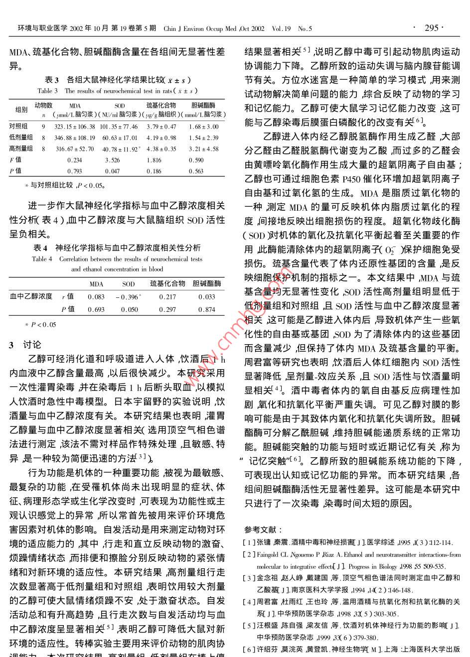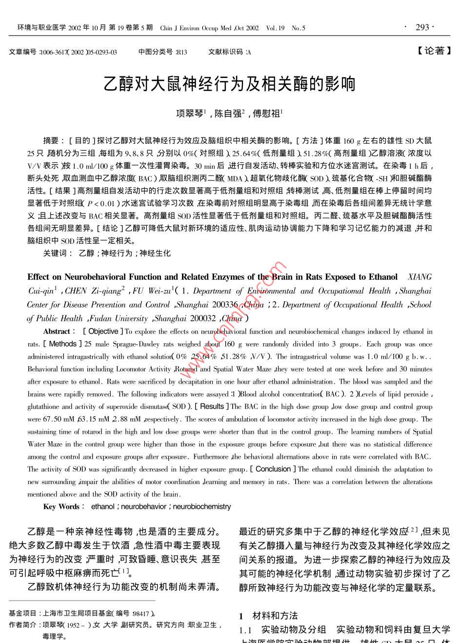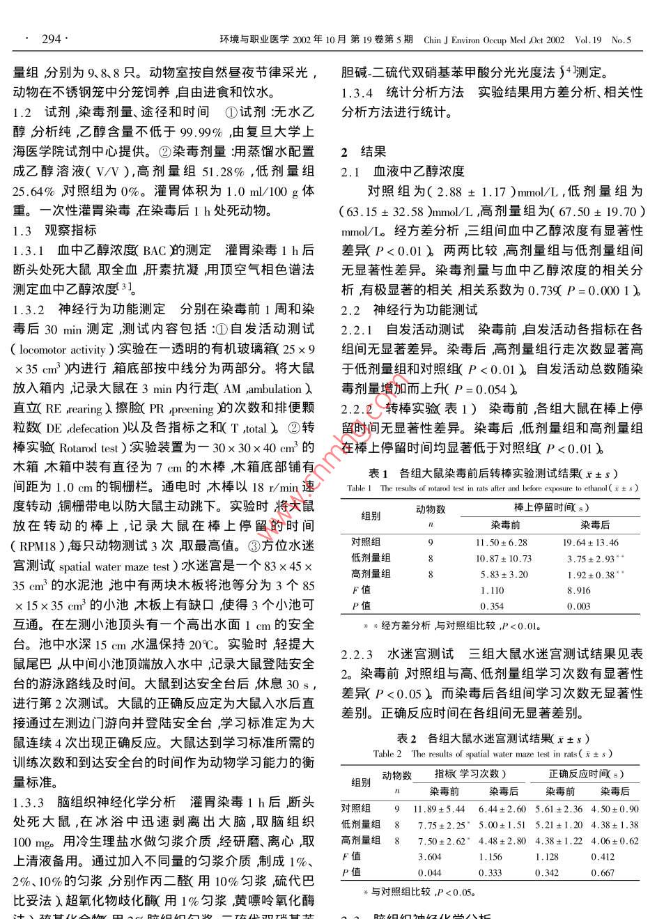 環(huán)境與職業(yè)醫(yī)學(xué)2002年10月第19卷第5期 Chin J Environ Occup Med (ct200vd.19N.5293文章編號(hào)1006-361X2002)5-0293-03中圖分類號(hào)R13文獻(xiàn)標(biāo)識(shí)碼∶【論著】乙醇對(duì)大鼠神經(jīng)行為及相關(guān)酶的影響項(xiàng)翠琴,陳自強(qiáng)2,傅慰祖1摘要∶[目的]探討乙醇對(duì)大鼠神經(jīng)行為效應(yīng)及腦組織中相關(guān)酶的影響。[方法]體重160g左右的雄性SD大鼠25只隨機(jī)分為三組每組為98、8只分別以0%對(duì)照組)25.64%(低劑量組)51.28%(高劑量組)乙醇溶液(濃度以ⅤⅤ表示胺1.0ml/100g體重一次性灌胃染毒。30min后進(jìn)行自發(fā)活動(dòng)、轉(zhuǎn)棒實(shí)驗(yàn)和方位水迷宮測(cè)試。在染毒1h后斷頭處死取血測(cè)血中乙醇濃度BAC)取腦組織測(cè)丙二醛MDA)超氧化物歧化釀(SOD巰基化合物-SH廂和膽堿酯酶性。[結(jié)果]高劑量組自發(fā)活動(dòng)中的行走次數(shù)顯著高于低劑量組和對(duì)照組轉(zhuǎn)棒測(cè)試高、低劑量組在棒上停留時(shí)間均顯著低于對(duì)照組P<0.01)水迷宮試驗(yàn)學(xué)習(xí)次數(shù)在染毒前對(duì)照組明顯高于染毒組而在染毒后各組間差異無統(tǒng)計(jì)學(xué)意沮且上述改變與BAC相關(guān)顯著。高劑量組SωD活性顯著低于低劑量組和對(duì)照組。丙二醛、巰基水平及膽堿酯酶活性各組間無眀顯差異。[結(jié)論]乙醇可降低大鼠對(duì)新環(huán)境的適應(yīng)性、肌肉運(yùn)動(dòng)協(xié)調(diào)能力下降和學(xué)習(xí)記憶能力的減退并和腦組織中SOD活性呈一定相關(guān)。關(guān)鍵詞:乙醇;神經(jīng)行為;神經(jīng)生化Effect on Neurobehavioral Function and Related Enzymes of the Brain in Rats Exposed to Ethanol XIANGCui-qin, CHEN Zi-qiang, FU Wei-zu'( 1. Department of Environmental and Occupational Health, ShanghaiCenter for Disease Prevention and Control, Shanghai 200336, China ;2. Department of Occupational Health r Schoolof Public Health, Fudan Uniersity Shanghai 200032, ChinaAbstract: Objective To explore the effects on neurobehavioral function and neurobiochemical changes induced by ethanolIts.[ Methods 25 male Sprague-Dawley rats weighed about 160 g were randomly divided into 3 groups. Each groupIministered intragastrically with ethanol solution( O% 25. 64% 51. %, V/V). The intragastrical volume was 1.0 ml/100 g bwBehavioral function including Locomotor Activity ,Rotarod and Spatial Water Maze , they were tested at one week before and 30 minutesafter exposure to ethanol. Rats were sacrificed by decapitation in one hour after ethanol administration, The blood was sampled and thebrains were rapidly removed. The following indicators were assayed :1 )Blood alcohol concentration BAC ) 2 )Levels of lipid peroxideglutathione and activity of superoxide dismutas( SOD ) Results The BAC in the high dose group ,low dose group and control groupwere 67.50 mM 63. 15 mM 2. 88 mM respectively. The scores of ambulation of locomotor activity increased in the high dose group. Thesustaining time of rotarod in the high and low dose groups were shorter than that in the control group. The learning numbers of spatialWater Maze in the control group were higher than those in the exposure groups before exposure , but there was no statistical differencemong the control and exposure groups after exposure. Furthermore the behavioral alternations above in rats were correlated with BACThe activity of SOD was significantly decreased in higher exposure group Conclusion The ethanol could diminish the adaptation totor coordination ,earning and memory in rats. There was a correlation between the alterationsmentioned above and the SOd activity of the brainKey Words: ethanol neurobehavior neurobiochemistry乙醇是一種親神經(jīng)性毒物,也是酒的主要成分。最近的研究多集中于乙醇的神經(jīng)化學(xué)效應(yīng)21,但未見絕大多數(shù)乙醇中毒發(fā)生于飲酒,急性酒中毒主要表現(xiàn)有關(guān)乙醇攝入量與神經(jīng)行為改變及其神經(jīng)化學(xué)效應(yīng)之為神經(jīng)行為的改變嚴(yán)重時(shí)可致昏睡、意識(shí)喪失甚至間關(guān)系的報(bào)道。為進(jìn)一步探索乙醇的神經(jīng)行為效應(yīng)及「引起呼吸中樞麻痹而死亡1。其可能的神經(jīng)化學(xué)機(jī)制通過動(dòng)物實(shí)驗(yàn)初步探討了乙乙醇致機(jī)體神經(jīng)行為功能改變的機(jī)制尚未弄清。醇所致神經(jīng)行為功能改變與神經(jīng)化學(xué)的定量聯(lián)系?;痦?xiàng)目:上海市衛(wèi)生局項(xiàng)目基金編號(hào)984171材料和方法作者簡(jiǎn)介:項(xiàng)翠數(shù)(192-)大學(xué)副研究員,研究方向職業(yè)衛(wèi)生,1.1實(shí)驗(yàn)動(dòng)物及分組實(shí)驗(yàn)動(dòng)物和飼料由復(fù)旦大學(xué)294環(huán)境與職業(yè)醫(yī)學(xué)2002年10月第19卷第5期 Chin J Environ Occup Med Act2002Vdl.19No.5量組分別為9、8、8只。動(dòng)物室按自然晝夜節(jié)律采光,膽堿二硫代雙硝基苯甲酸分光光度法4測(cè)定。動(dòng)物在不銹鋼籠中分籠飼養(yǎng)自由進(jìn)食和飲水。1.3.4統(tǒng)計(jì)分析方法實(shí)驗(yàn)結(jié)果用方差分析、相關(guān)性1.2試劑染毒劑量、途徑和時(shí)間①試劑:無水乙分析方法進(jìn)行統(tǒng)計(jì)。醇分析純,乙醇含量不低于99.99%,由復(fù)旦大學(xué)上海醫(yī)學(xué)院試劑中心提供。②染毒劑量闈用蒸餾水配置2結(jié)果成乙醇溶液(w/V),高劑量組51.28%,低劑量組2.1血液中乙醇濃度25.64%對(duì)照組為0%。灌胃體積為1.0ml/l00g體對(duì)照組為(2.88±1.17)mmo/L,低劑量組為重。一次性灌