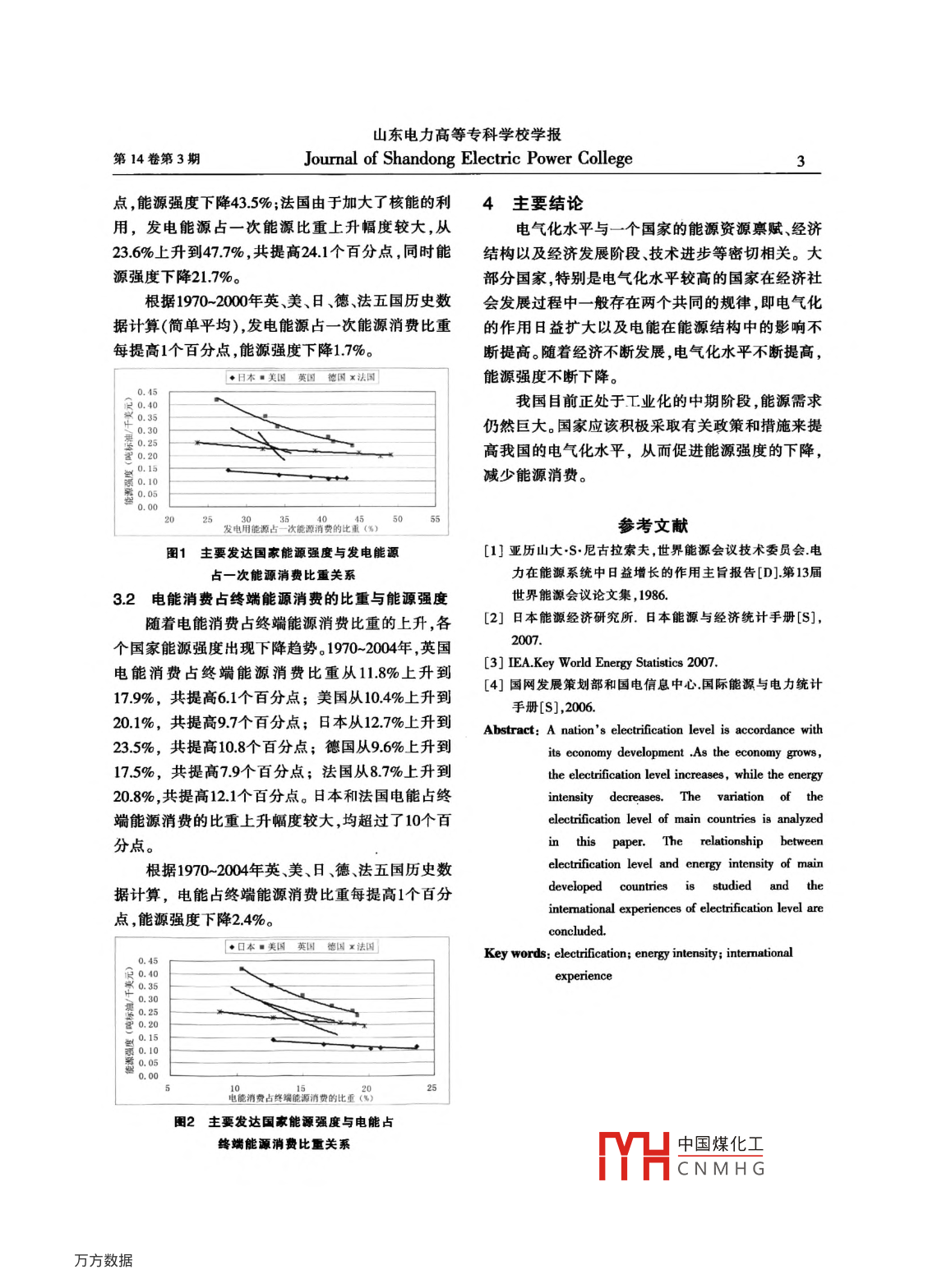山東電力高等??茖W(xué)校學(xué)報(bào)第14卷第3期Journal of Shandong Electric Power College電力工程電氣化發(fā)展的國(guó)際經(jīng)驗(yàn)分析The Analysis on International Experiences of Electrification Development楊露露國(guó)網(wǎng)北京經(jīng)濟(jì)技術(shù)研究院北京100052【摘要】一個(gè)國(guó)家的電氣化程度與其經(jīng)濟(jì)發(fā)展水平相適應(yīng),隨著經(jīng)濟(jì)的不斷發(fā)展,電氣化水平不斷提高,能源強(qiáng)度不斷降低。本文對(duì)國(guó)際上主要國(guó)家的電氣化水平變化趨勢(shì)進(jìn)行了分析,對(duì)主要發(fā)達(dá)國(guó)家電氣化水平與能源強(qiáng)度的關(guān)系進(jìn)行了實(shí)證研究,總結(jié)了電氣化發(fā)展的相關(guān)國(guó)際經(jīng)驗(yàn)?!娟P(guān)鍵詞】電氣化能源強(qiáng)度國(guó)際經(jīng)驗(yàn)【中圖分類號(hào)】TM92【文獻(xiàn)標(biāo)識(shí)碼】A1電氣化的內(nèi)涵根據(jù)以上定義,電氣化是反映能源消費(fèi)與電力電能是由各類一次能源轉(zhuǎn)換而成的優(yōu)質(zhì)二次消費(fèi)關(guān)系的一個(gè)重要指標(biāo)。電氣化水平的變化雖然能源,它能方便地轉(zhuǎn)換成動(dòng)力、光、熱等其他能源形在公式上是由發(fā)電能源消費(fèi)、一次能源消費(fèi)或電力式。另外,電力的使用十分方便,具有廣泛的可控消費(fèi)、終端能源消費(fèi)所決定的,但實(shí)質(zhì)上是經(jīng)濟(jì)發(fā)性。電能的這些特性決定了它在國(guó)民經(jīng)濟(jì)中的廣泛展、產(chǎn)業(yè)結(jié)構(gòu)、能源消費(fèi)結(jié)構(gòu)、電力消費(fèi)結(jié)構(gòu)、技術(shù)應(yīng)用和在能源體系中的重要地位。進(jìn)步等因素的集中反映。電氣化是一次能源需求向電能轉(zhuǎn)換的過(guò)程,其間伴隨著替代其他形式能源的電力需求不斷增長(zhǎng)2國(guó)際上電氣化水平的變化趨勢(shì)的過(guò)程。通常,電氣化水平可以用兩個(gè)指標(biāo)表示:發(fā)達(dá)國(guó)家在經(jīng)濟(jì)發(fā)展過(guò)程中,始終把電力工業(yè)是發(fā)電能源消費(fèi)占一次能源消費(fèi)的比重,它反映電發(fā)展放在十分重要的位置。一般規(guī)律是,一個(gè)國(guó)家力在能源系統(tǒng)中的地位;二是電能消費(fèi)占終端能源的電氣化程度與其經(jīng)濟(jì)發(fā)展水平密切相關(guān),經(jīng)濟(jì)發(fā)消費(fèi)的比重,用來(lái)度量各類用戶的電力消費(fèi)水平,達(dá)程度越高,其電氣化水平越高。說(shuō)明電力對(duì)社會(huì)經(jīng)濟(jì)發(fā)展的作用。衡量電氣化水平2.1發(fā)電能源占一次能源消費(fèi)的比重的兩個(gè)指標(biāo)計(jì)算公式如下:總體上看,世界各國(guó)為了提高能源利用效率電氣化水平上=發(fā)電用能源消費(fèi)×100%(1)節(jié)約能源,不斷增加發(fā)電用能源占一次能源消費(fèi)的比重。1980~2000年,發(fā)達(dá)國(guó)家發(fā)電能源占一次能源電氣化水平電力消費(fèi)終端能源消費(fèi)x100%(2)消費(fèi)總量的比重,從32%上升到40%以上;發(fā)展中國(guó)家從20%上升到30%以上。主要國(guó)家發(fā)電能源占收稿日期:2011-03-30次能源消費(fèi)的比重變化情況見(jiàn)表1:作者簡(jiǎn)介:楊露露(1969),女,國(guó)網(wǎng)北京經(jīng)濟(jì)技術(shù)研究院高級(jí)工程師,主要從事電網(wǎng)規(guī)劃相關(guān)研究。中國(guó)煤化工CNMHG2電氣化發(fā)展的國(guó)際經(jīng)驗(yàn)分析VoL 14 No. 3表1部分國(guó)家發(fā)電能源占一次能源消費(fèi)的比重單位%超過(guò)60%。電力牽引相對(duì)于內(nèi)燃牽引單位運(yùn)量能耗19601019801985199010951200低、功率特性優(yōu)、環(huán)保效果佳,因此世界各國(guó)都積極276236322391449491477發(fā)展電力機(jī)車。實(shí)踐證明,電氣化鐵路不僅提高了日本2527.634338.540.8419432鐵路運(yùn)行水平和行駛速度,也增加了經(jīng)濟(jì)產(chǎn)出,提美國(guó)21.226232.534140.841544高了社會(huì)整體能效。英國(guó)23431634235347346348表2部分國(guó)家電能消費(fèi)占終端能源消費(fèi)比重單位:%2830.728833735.838,1中國(guó)20621.324.729134019601970198019851990199520002004在一次能源消費(fèi)中,發(fā)電能源比重越大,表明世界1031251415.3164轉(zhuǎn)換為優(yōu)質(zhì)二次能源電能)的一次能源越多,說(shuō)明平均179184電力在能源系統(tǒng)中發(fā)揮著越重要的作用。由于不同法國(guó)873124153177187198208國(guó)家的能源資源儲(chǔ)量和品種不同,導(dǎo)致了發(fā)電用能德國(guó)8.19.613.314715.816.1175175源結(jié)構(gòu)有所不同。如北歐國(guó)家水力資源豐富,以水本13412.718920.721.22223.2235力發(fā)電為主,發(fā)電能源占一次能源消費(fèi)比重超過(guò)英國(guó)77118414915116216617617950%;美國(guó)煤、油、氣資源較為豐富煤電、油電及氣美國(guó)821041321521318819598電都較為發(fā)達(dá),其中90%的煤炭消費(fèi)用于發(fā)電,發(fā)巴西1216.322.123323.123238電能源占一次能源消費(fèi)比重在40%左右;日本是能印度1213315418218720.2源資源貧乏國(guó)家,火電和核電占較大比重。中國(guó)6869881.615917522電能消費(fèi)占終端能源消費(fèi)的比重注:(1)表中數(shù)據(jù)來(lái)自于日本能源統(tǒng)計(jì)手冊(cè),2007;電能占終端能源消費(fèi)的比重,是衡量電氣化程(2)中國(guó)數(shù)據(jù)按熙國(guó)家統(tǒng)計(jì)局公布數(shù)據(jù)計(jì)算。度的另一個