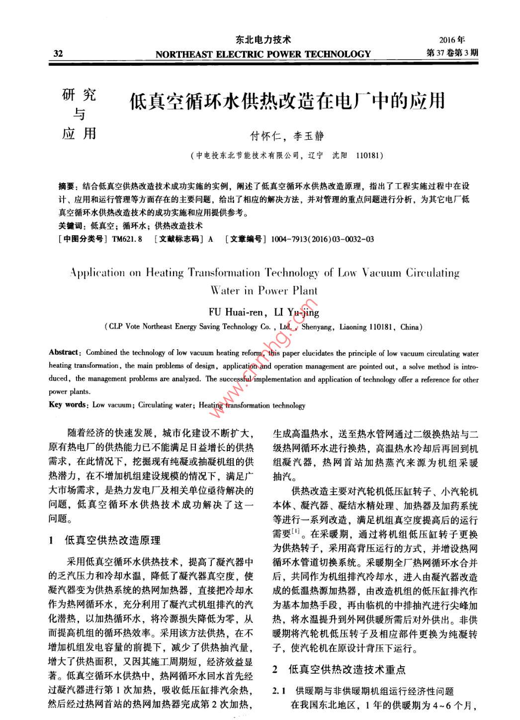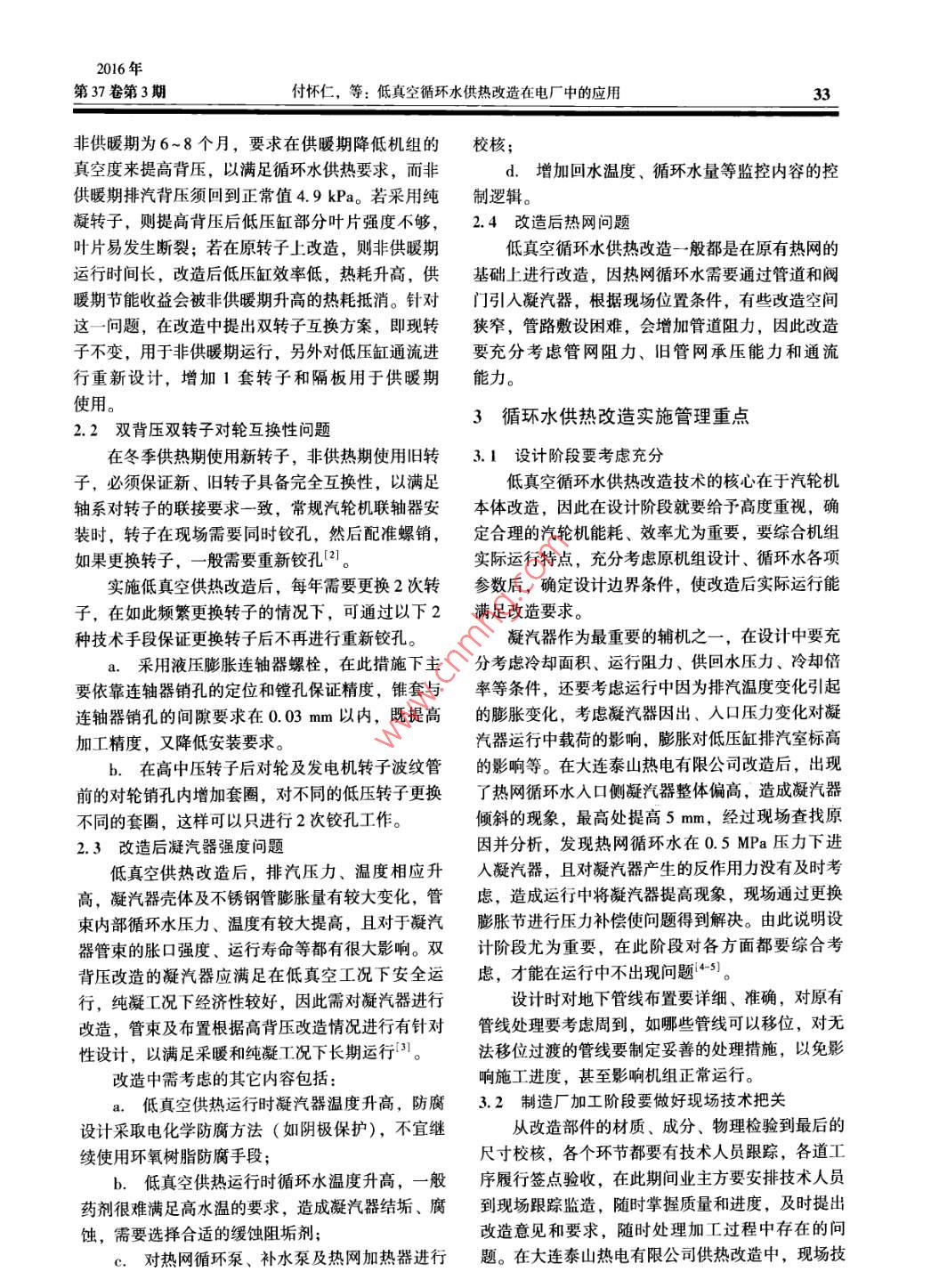 東北電力技術(shù)2016年NORTHEAST ELECTRIC POWER TECHNOLOGY第37卷第3期研究低真空循環(huán)水供熱改造在電廠中的應(yīng)用與應(yīng)用付懷仁,李玉靜(中電投東北節(jié)能技術(shù)有限公司,遼寧沈陽(yáng)110181)摘要:結(jié)合低真空供熱改造技術(shù)成功實(shí)施的實(shí)例,闡述了低真空循環(huán)水供熱改造原理,指出了工程實(shí)施過(guò)程中在設(shè)計(jì)、應(yīng)用和運(yùn)行管理等方面存在的主要問(wèn)題,給出了相應(yīng)的解決方法,并對(duì)管理的重點(diǎn)問(wèn)題進(jìn)行分析,為其它電廠低真空循環(huán)水供熱改造技術(shù)的成功實(shí)施和應(yīng)用提供參考關(guān)鍵詞:低真空;循環(huán)水;供熱改造技術(shù)[中圖分類(lèi)號(hào)]TM621.8[文獻(xiàn)標(biāo)志碼]A[文章編號(hào)]1004-7913(2016)03-0032-03Application on Heating Transformation Technology of Low Vacuum CirculatingWater in Power plantFU Huai-ren, LI Yu-jingCLP Vote Northeast Energy Saving Technology Co., Ld, Shenyang, Liaoning 110181, China)Abstract: Combined the technology of low vacuum heating reform, this paper elucidates the principle of low vacuum circulating waterheating transformation, the main problems of design, application and operation management are pointed out, a solve method is intro-duced, the management problems are analyzed. The successful implementation and application of technology offer a reference for otherpower plantsKey words: Low vacuum; Circulating water; Heating transformation technology隨著經(jīng)濟(jì)的快速發(fā)展,城市化建設(shè)不斷擴(kuò)大,生成高溫?zé)崴?送至熱水管網(wǎng)通過(guò)二級(jí)換熱站與二原有熱電廠的供熱能力已不能滿(mǎn)足日益增長(zhǎng)的供熱級(jí)熱網(wǎng)循環(huán)水進(jìn)行換熱,高溫?zé)崴鋮s后再回到機(jī)需求,在此情況下,挖掘現(xiàn)有純凝或抽凝機(jī)組的供組凝汽器,熱網(wǎng)首站加熱蒸汽來(lái)源為機(jī)組采暖熱潛力,在不增加機(jī)組建設(shè)規(guī)模的情況下,滿(mǎn)足廣抽汽大市場(chǎng)需求,是熱力發(fā)電廠及相關(guān)單位亟待解決的供熱改造主要對(duì)汽輪機(jī)低壓缸轉(zhuǎn)子、小汽輪機(jī)問(wèn)題,低真空循環(huán)水供熱技術(shù)成功解決了這一本體、凝汽器、凝結(jié)水精處理、加熱器及加藥系統(tǒng)問(wèn)題。等進(jìn)行一系列改造,滿(mǎn)足機(jī)組真空度提高后的運(yùn)行1低真空供熱改造原理需要山。在釆暖期,通過(guò)將機(jī)組低壓缸轉(zhuǎn)子更換為供熱轉(zhuǎn)子,采用高背壓運(yùn)行的方式,并增設(shè)熱網(wǎng)釆用低真空循環(huán)水供熱技術(shù),提高了凝汽器中循環(huán)水管道切換系統(tǒng)。采暖期全廠熱網(wǎng)循環(huán)水合并的乏汽壓力和冷卻水溫,降低了凝汽器真空度,使后,共同作為機(jī)組排汽冷卻水,進(jìn)入由凝汽器改造凝汽器變?yōu)楣嵯到y(tǒng)的熱網(wǎng)加熱器,直接把冷卻水成的低溫?zé)嵩醇訜崞?由改造機(jī)組的低壓缸排汽作作為熱網(wǎng)循環(huán)水,充分利用了凝汽式機(jī)組排汽的汽為基本加熱手段,再由臨機(jī)的中排抽汽進(jìn)行尖峰加化潛熱,以加熱循環(huán)水,將冷源損失降低為零,從熱,將水溫提升到外網(wǎng)供暖所需后對(duì)外供出。非供而提高機(jī)組的循環(huán)熱效率。采用該方法供熱,在不暖期將汽輪機(jī)低壓轉(zhuǎn)子及相應(yīng)部件更換為純凝轉(zhuǎn)增加機(jī)組發(fā)電容量的前提下,減少了供熱抽汽量,子,使汽輪機(jī)在原設(shè)計(jì)背壓下運(yùn)行增大了供熱面積,又因其施工周期短,經(jīng)濟(jì)效益顯著。低真空循環(huán)水供熱中,熱網(wǎng)循環(huán)水回水首先經(jīng)2低真空供熱改造技術(shù)重點(diǎn)過(guò)凝汽器進(jìn)行第1次加熱,吸收低壓缸排汽余熱,2.1供暖期與非供暖期機(jī)組運(yùn)行經(jīng)濟(jì)性問(wèn)題然后經(jīng)過(guò)熱網(wǎng)首站的熱網(wǎng)加熱器完成第2次加熱在我國(guó)東北地區(qū),1年的供暖期為4~6個(gè)月,2016年第37卷第3期付懷仁,等:低真空循環(huán)水供熱改造在電廠中的應(yīng)用33非供暖期為6~8個(gè)月,要求在供暖期降低機(jī)組的校核;真空度來(lái)提高背壓,以滿(mǎn)足循環(huán)水供熱要求,而非d.增加回水溫度、循環(huán)水量等監(jiān)控內(nèi)容的控供暖期排汽背壓須回到正常值4.9kPa。若采用純制邏輯。凝轉(zhuǎn)子,則提高背壓后低壓缸部分葉片強(qiáng)度不夠,2.4改造后熱網(wǎng)問(wèn)題葉片易發(fā)生斷裂;若在原轉(zhuǎn)子上改造,則非供暖期低真空循環(huán)水供熱改造一般都是在原有熱網(wǎng)的運(yùn)行時(shí)間長(zhǎng),改造后低壓缸效率低,熱耗升高,供基礎(chǔ)上進(jìn)行改造,因熱網(wǎng)循環(huán)水需要通過(guò)管道和閥暖期節(jié)能收益會(huì)被非供暖期升高的熱耗抵消。針對(duì)門(mén)引人凝汽器,根據(jù)現(xiàn)場(chǎng)位置條件,有些改造空間這一問(wèn)題,在改造中提出雙轉(zhuǎn)子互換方案,即現(xiàn)轉(zhuǎn)狹窄,管路敷設(shè)困難,會(huì)增加管道阻力,因此改造子不變,用于非供暖期運(yùn)行,另外對(duì)低壓缸通流進(jìn)要充分考慮管網(wǎng)阻力、舊管網(wǎng)承壓能力和通流行重新設(shè)計(jì),增加1套轉(zhuǎn)子和隔板用于供暖期能力。使用。2.2雙背壓雙轉(zhuǎn)子對(duì)輪互換性問(wèn)題3循環(huán)水供熱改造實(shí)施管理重點(diǎn)在冬季供熱期使用新轉(zhuǎn)子