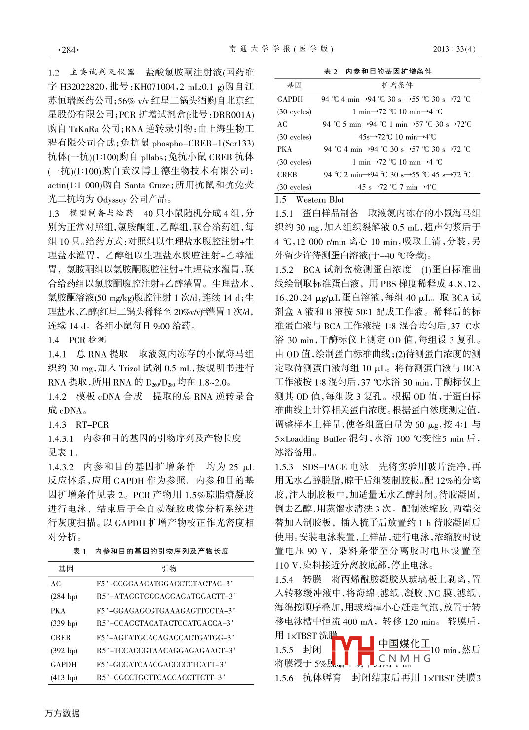 南通大學(xué)學(xué)報(bào)(醫(yī)學(xué)版)Journal of Nantong University (Medical Sciences) 2013: 33(4)283氯胺酮與乙醇對小鼠海馬PKA-CREB信號通路的影響楊美玉13,丁飛2,蔣小崗3,顧振綸3,卞士中1(蘇州大學(xué)醫(yī)學(xué)部法醫(yī)學(xué)系,蘇州215123;2上海市公安局寶山分局刑事科學(xué)研究所;3蘇州中藥研究所)摘要]目的:研究氯胺酮與乙醇對小鼠海馬ⅣKA-CREB信號通路的影響,探討氯胺酮與乙醇致學(xué)習(xí)記憶障礙的分子學(xué)機(jī)制。方法:40只ICR小鼠隨機(jī)分為4組:對照組、氯胺酮組、乙醇組、氯胺酮乙醇合用組,每組10只。氯胺酮和乙醇分別采取腹腔注射和灌胃的給藥方式,1次,連續(xù)14d。通過RT-PCR檢測海馬中c-AMP反應(yīng)單元結(jié)合蛋白(c- AMP response element binding protein,CREB)、蛋白激酶A( protein kinase A,PA)及腺苷酸環(huán)化酶( adenylate cyclase,AC)mRNA的表達(dá); Western blot檢測 pCREB/CREB的蛋白表達(dá)。結(jié)果:RT-PCR檢測結(jié)果:氯胺酮乙醇合用組可顯著降低海馬區(qū)CREB、PKA及 AC mrNA的表達(dá)(P<0.05), Western Blot檢測顯示 PCREB/CREB的蛋白表達(dá)顯著降低(P<0.05)。結(jié)論:氯胺酮與乙醇可協(xié)同抑制小鼠的學(xué)習(xí)記憶行為,其機(jī)制可能與大腦海馬區(qū)CREB信號通路相關(guān)[關(guān)鍵詞]氯胺酮;乙醇;學(xué)習(xí)記憶;環(huán)磷酸腺苷反應(yīng)結(jié)合蛋白;小鼠[中圖分類號]R971[文獻(xiàn)標(biāo)志碼]A[文章編號]1674-7887(2013)04-0283-05Effects of ketamine on ethanol-induced learning and memory impairment in miceYANG Meiyu., DING Fei JIANG Xiaogang, GU Zhenlun, BIA N Shizhong(Department of Forensic MedicineMedical College oflow University, Institute of Forensic Sciences of Soochow University, Suzhou 215123; Institute ofCriminal Sciences, Baoshan Branch of Shanghai Public Security Bureau; Suzhou Institute of Chinese Materia Medica[Abstract] Objective: To study the effects of ketamine and ethanol on PKA-CREB pathway of hippocampus -dependentlearning and memory in mice and its possible mechanism. Methods: A total of 40 male mice were divided into 4 groups: anormal control group, a ketamine group, an ethanol group and an ethanol plus ketamine group. Ketamine and ethanol wererespectively taken by intraperitoneal injection and oral administration, once per day, for 14 d. The expressions of CreBPKA and AC gene in hippocampus were detected by RT-PCR. The expressions of pCrEB/CREB were detected by WesterBlot. Results: After the combined treatment with ketamin and ethanol. creb. pKa and ac mrnA were down regulated byRT-PCR(P<0.05), and pCREB/CREB were down regulated by Western Blot(P<0.05 ). Conclusion: The data indicatethat combination of ketamine and ethanol is synergic in the inhibition of learning and memory in mice, its mechanism maybe related to the CReB signal transduction pathway[Key words] ketamine; ethanol; learning and memory C-AMP-response element binding protein; mouse氯胺酮是N-甲基-D-天(門)冬氨酸(N- methyl-入細(xì)胞核磷酸化CREB,然后激活I(lǐng)Gs(C-fos)等,其D- aspartate,NMDA受體的非特異性阻斷劑,其作激活產(chǎn)物進(jìn)一步編碼LTP所需要的蛋白質(zhì)。用機(jī)制復(fù)雜。日前研究認(rèn)為,麻醉劑量的氯胺酮本研究以小鼠為實(shí)驗(yàn)對象,觀察氯胺酮與酒精可通過阻斷NMDA受體抑制學(xué)習(xí)記憶,該受體對神聯(lián)合給藥對小鼠學(xué)習(xí)記憶的影響。采用RT-PCR技經(jīng)元突觸長時(shí)程增強(qiáng)(ong- -term potentiation,TP)的術(shù)檢測小鼠海馬中CREB、PKA及腺甘酸環(huán)化酶產(chǎn)生、維持和學(xué)習(xí)記憶功能至關(guān)重要。adenylate cyclase, AC)mRNA的表達(dá); Western blot令A(yù)環(huán)磷腺 cyclin adenosine monophosphate, C-AMP))檢測 pCREB/CREB的蛋白表達(dá)情況,以探討氯胺酮應(yīng)元件結(jié)合蛋白(e- AMP response element bindi與乙醇對小鼠學(xué)習(xí)記憶行為學(xué)影響的分子機(jī)制protein,CREB)是一種依賴c-AMP的轉(zhuǎn)錄因子,可將細(xì)胞內(nèi)的c-AMP的量的變化轉(zhuǎn)錄為基因表達(dá)的1材料與方法形式。CREB在記憶的形成過程中發(fā)揮了及其重要1.1實(shí)驗(yàn)動物ICR小鼠40只,雄性,體質(zhì)量25~的作用,其過程可能是:神經(jīng)遞質(zhì)等作用神經(jīng)元細(xì)30g蘇州大學(xué)實(shí)驗(yàn)動物中心提供。實(shí)驗(yàn)前小鼠適應(yīng)胞,導(dǎo)致胞質(zhì)內(nèi)c-AMP濃度升高,使蛋白激酶A性飼養(yǎng)3d,維中國煤化仝實(shí)驗(yàn)過程中protein kinase A,PKA)激活,PKA的催化亞單位進(jìn)小鼠自由飲水CNMHG*[作者簡介]楊美玉,女,漢族,生于1984年3月,山東省濟(jì)寧市人,碩土在讀,研究方向:法醫(yī)毒理病理學(xué)*[通信作者]卞士中,電話:0512-67580893,E- mail hanshizhong@ suda. edu. en284南通大學(xué)學(xué)報(bào)(醫(yī)學(xué)版)2013:33(4)1.2主要試劑及儀器鹽酸氯胺酮注射液(國藥準(zhǔn)表2內(nèi)參和目的基因擴(kuò)增條件字H32022820,批號:KH071004,2ml0.1g)購自江基因擴(kuò)增條件蘇恒瑞醫(yī)藥公司;56%v紅星二鍋頭酒購自北京紅 GAPDH94℃4min94℃30s-55℃3072℃星股份有限公司;PCR擴(kuò)增試劑盒(批號:DRRO0Almin→72℃10min+4℃抗體(抗10購p兔抗小鼠CREB米W多購自 TaKara公司;RNA逆轉(zhuǎn)錄引物:由上海生物工94℃5min+94℃1min→57℃30s72℃程有限公司合成;兔抗鼠 phospho-CREB-1(Ser13345s-+72℃10min+4℃94℃4min+94℃30s→57℃30s-72℃(30 cycleslmin→+72℃10min+4℃942min→94℃30s→55℃45s72℃actin(1:1000購自 Santa cruze;所用抗鼠和抗兔熒45s-+72℃7min-+4℃光二抗均為 Odyssey公司產(chǎn)品5 Western blot1.3模型制