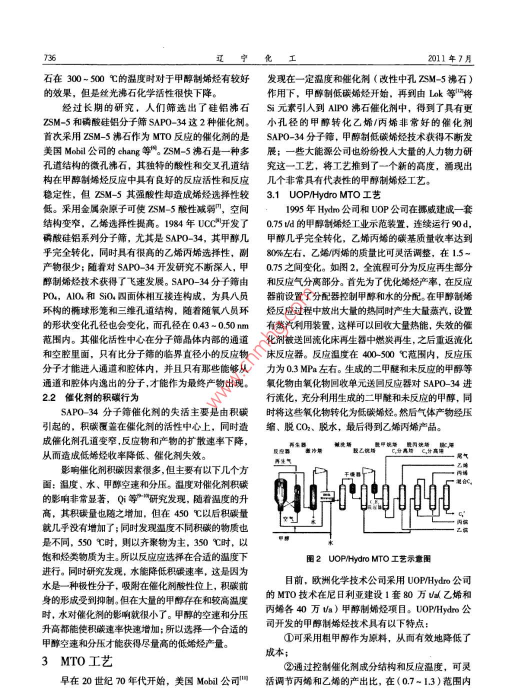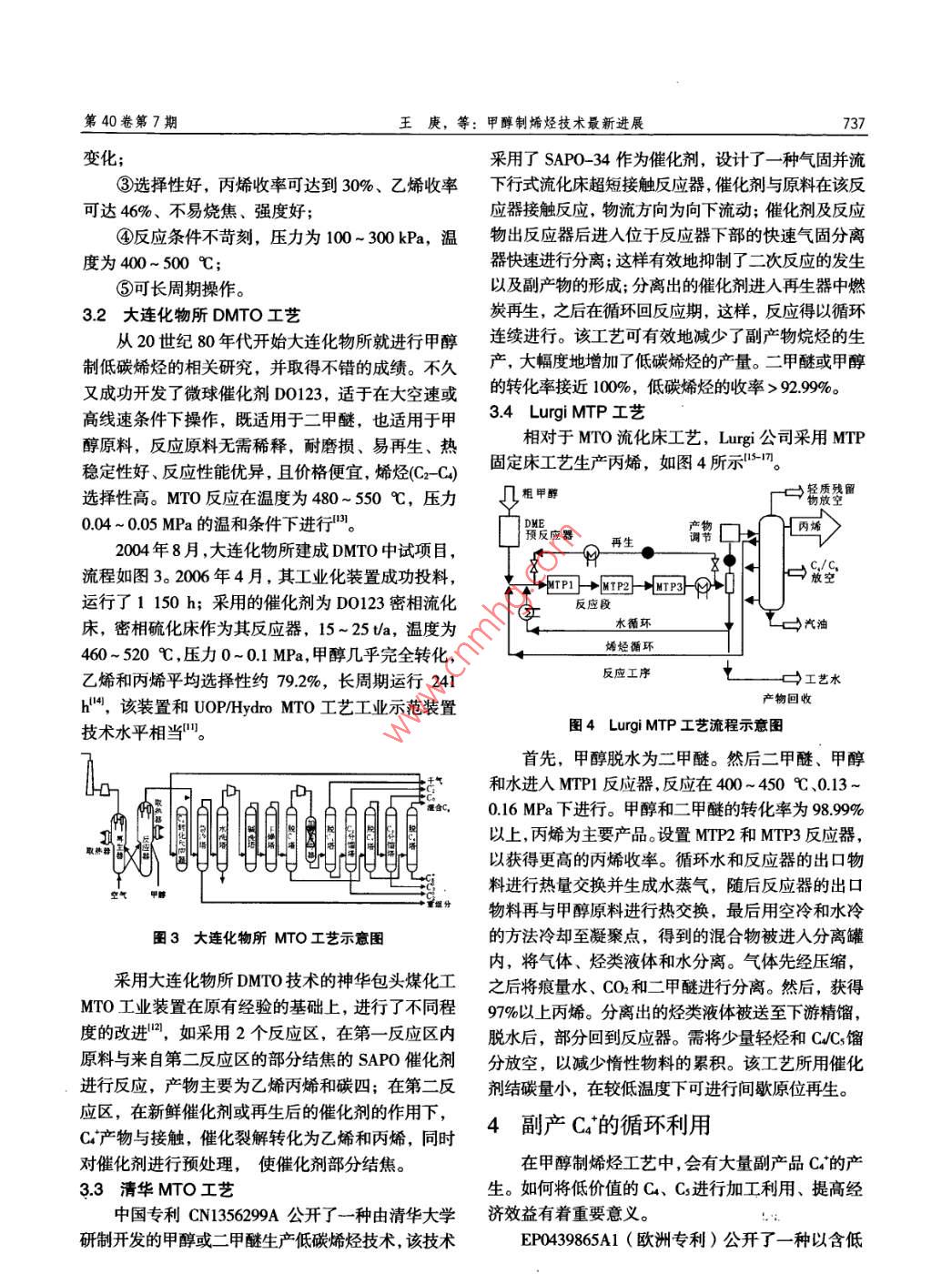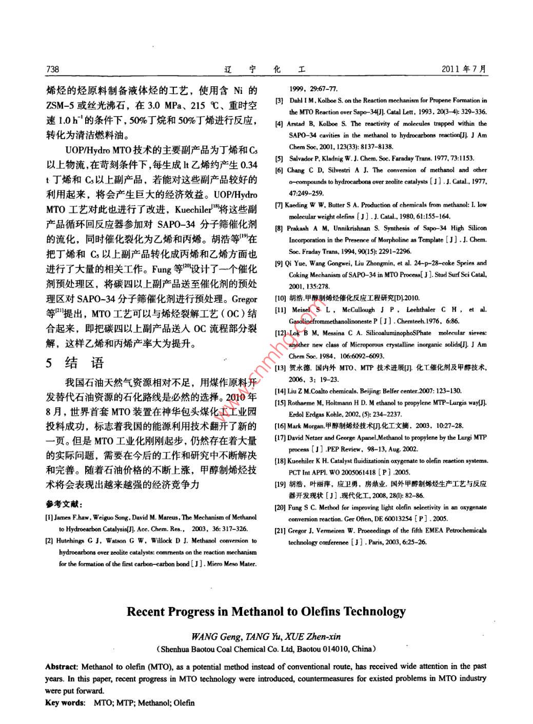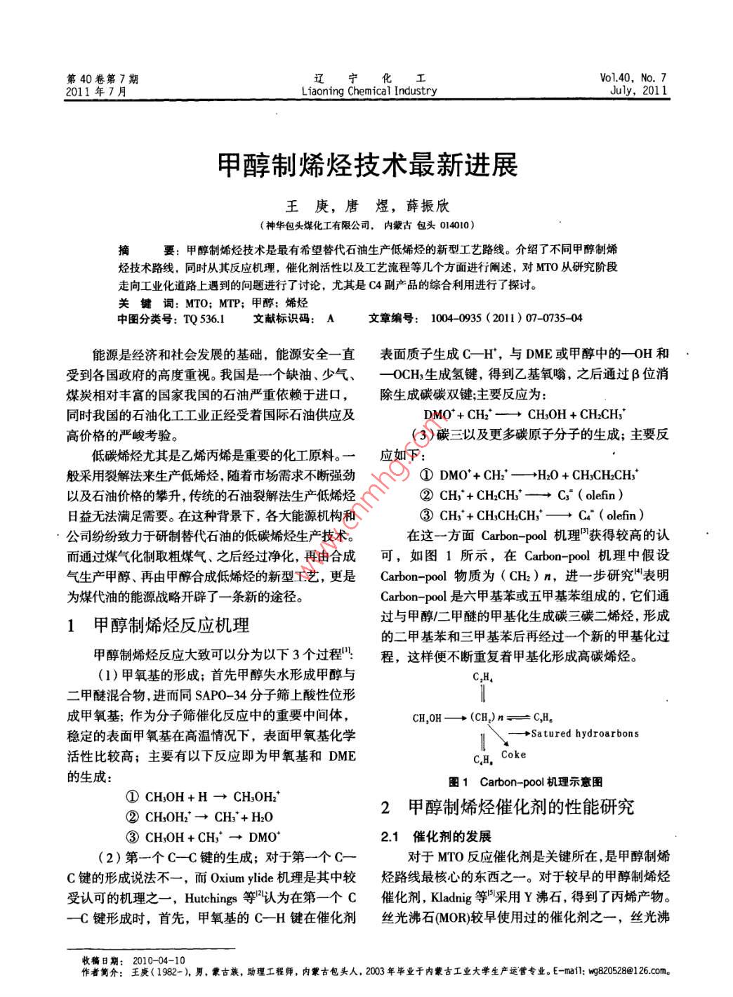 第40卷第7期遼*化工Vo1.40, No. 72011年7月Liaoning Chemical IndustryJuly, 2011甲醇制烯烴技術(shù)最新進(jìn)展王庚,唐煜,薛振欣(神華包頭煤化工有限公司,內(nèi)蒙古包頭014010)摘要:甲醇制烯烴技術(shù)是最有希望替代石油生產(chǎn)低烯烴的新型工藝路線。介紹了不同甲醇制烯烴技術(shù)路線,同時(shí)從其反應(yīng)機(jī)理,催化劑活性以及工藝流程等幾個(gè)方面進(jìn)行闡述,對(duì)MTO從研究階段走向工業(yè)化道路上遇到的問(wèn)題進(jìn)行了討論,尤其是C4副產(chǎn)品的綜合利用進(jìn)行了探討。關(guān)鍵詞:MTO;MTP;甲醇;烯烴中圖分類(lèi)號(hào): TQ 536.1文獻(xiàn)標(biāo)識(shí)碼: A文章編號(hào): 1004- _0935 (2011) 07-0735- 04能源是經(jīng)濟(jì)和社會(huì)發(fā)展的基礎(chǔ),能源安全一直表面質(zhì)子生成C- -H*,與DME或甲醇中的一0H和受到各國(guó)政府的高度重視。我國(guó)是- -個(gè)缺油、少氣、一0CH;生成氫鍵, 得到乙基氧嗡,之后通過(guò)β位消煤炭相對(duì)豐富的國(guó)家我國(guó)的石油嚴(yán)重依賴(lài)于進(jìn)口,除生成碳碳雙鍵;主要反應(yīng)為:同時(shí)我國(guó)的石油化工工業(yè)正經(jīng)受著國(guó)際石油供應(yīng)及DM0*+ CH'-→CH0H + CH2CH*高價(jià)格的嚴(yán)峻考驗(yàn)。(3)碳三以及更多碳原子分子的生成;主要反低碳烯烴尤其是乙烯丙烯是重要的化工原料。一應(yīng)如下:般采用裂解法來(lái)生產(chǎn)低烯烴,隨著市場(chǎng)需求不斷強(qiáng)勁①DM0*+ CH;'-→H2O + CHsCHzCH3'以及石油價(jià)格的攀升,傳統(tǒng)的石油裂解法生產(chǎn)低烯烴②CH3* + CH2CH;*-→Cs ( olefin )日益無(wú)法滿(mǎn)足需要。在這種背景下,各大能源機(jī)構(gòu)和③CH3* + CH,CH2CH;*-→ C4 ( olefin )公司紛紛致力于研制替代石油的低碳烯烴生產(chǎn)技術(shù)。在這一方面Carbon- -pool機(jī)理'獲得較高的認(rèn)而通過(guò)煤氣化制取粗煤氣、之后經(jīng)過(guò)凈化,再由合成可,如圖1所示,在Carbon-pool機(jī)理中假設(shè)氣生產(chǎn)甲醇、再由甲醇合成低烯烴的新型工藝,更是Carbon-poo物質(zhì)為(CH2)n,進(jìn)一步研究"表明為煤代油的能源戰(zhàn)略開(kāi)辟了- -條新的途徑。Carbon- pool 是六甲基苯或五甲基苯組成的,它們通過(guò)與甲醇/二甲醚的甲基化生成碳三碳二烯烴,形成1甲 醇制烯烴反應(yīng)機(jī)理的二甲基苯和三甲基苯后再經(jīng)過(guò)一個(gè)新的甲基化過(guò)甲醇制烯烴反應(yīng)大致可以分為以下3個(gè)過(guò)程'程,這樣便不斷重復(fù)著甲基化形成高碳烯烴。(1)甲氧基的形成;首先甲醇失水形成甲醇與C.H.二甲醚混合物,進(jìn)而同SAP0-34分子篩上酸性位形成甲氧基;作為分子篩催化反應(yīng)中的重要中間體,CH,0H- + (CH)n=一C,H。穩(wěn)定的表面甲氧基在高溫情況下,表面甲氧基化學(xué)1一 →+Satured hydroarbons活性比較高;主要有以下反應(yīng)即為甲氧基和DMEH,Coke的生成:圍1 Carbon-pool 機(jī)理示意圖①CHsOH+H -→CH,OH*2甲 醇制烯烴催化劑的性能研究②CHzOH2'→CH;*+ H2O③CH,OH+ CH;*→DMO*2.1催化劑的發(fā)展(2)第一個(gè)C- -C鍵的生成;對(duì)于第一個(gè)C-對(duì)于MTO反應(yīng)催化劑是關(guān)鍵所在,是甲醇制烯C鍵的形成說(shuō)法不- -,而Oxium ylide機(jī)理是其中較烴路線最核心的東西之- -。對(duì)于較早的甲醇制烯烴受認(rèn)可的機(jī)理之-一, Hutchings 等認(rèn)為在第一-個(gè)C催化劑, Kladnig 等"采用Y沸石,得到了丙烯產(chǎn)物。- C鍵形成時(shí),首先,甲氧基的C-H鍵在催化劑絲光沸石(MOR)較早使用過(guò)的催化劑之一, 絲光沸收稿日期: 2010-04-10作者簡(jiǎn)介:王庚(1982-), 男,蒙古族,助理工程師,內(nèi)策古包頭人,2003年畢業(yè)于內(nèi)蒙古工業(yè)大學(xué)生產(chǎn)運(yùn)曹專(zhuān)業(yè)。E-maf1: wg820528@126.com.第40卷第7期王庚,等:甲醇制烯烴技術(shù)最新進(jìn)展737變化;采用了SAP0- -34作為催化劑,設(shè)計(jì)了一種氣固并流③選擇性好,丙烯收率可達(dá)到30%、乙烯收率下行式流化床超短接觸反應(yīng)器,催化劑與原料在該反,可達(dá)46%、不易燒焦、強(qiáng)度好;應(yīng)器接觸反應(yīng),物流方向?yàn)橄蛳铝鲃?dòng);催化劑及反應(yīng)④反應(yīng)條件不苛刻,壓力為100 ~ 300 kPa,溫物出反應(yīng)器后進(jìn)入位于反應(yīng)器下部的快速氣固分離度為400~500 C;器快速進(jìn)行分離;這樣有效地抑制了二次反應(yīng)的發(fā)生⑤可長(zhǎng)周期操作。以及副產(chǎn)物的形成;分離出的催化劑進(jìn)人再生器中燃3.2大連化物所DMTO工藝炭再生,之后在循環(huán)回反應(yīng)期,這樣,反應(yīng)得以循環(huán)從20世紀(jì)80年代開(kāi)始大連化物所就進(jìn)行甲醇連續(xù)進(jìn)行。該工藝可有效地減少了副產(chǎn)物烷烴的生制低碳烯烴的相關(guān)研究,并取得不錯(cuò)的成績(jī)。不久產(chǎn) 大幅度地增加了低碳烯烴的產(chǎn)量。二甲醚或甲醇又成功開(kāi)發(fā)了微球催化劑D0123,適于在大空速或的轉(zhuǎn)化率接近100%,低碳烯烴的收率> 92.99%。高線速條件下操作,既適用于二甲醚,也適用于甲3.4 Lurgi MTP工藝醇原料,反應(yīng)原料無(wú)需稀釋,耐磨損、易再生、熱相對(duì)于MTO流化床工藝, Lurgi公司采用MTP穩(wěn)定性好、反應(yīng)性能優(yōu)異,且價(jià)格便宜,烯烴(Cx- C2)固定床工藝生產(chǎn)丙烯,如圖4所示15-1。選擇性高。MTO反應(yīng)在溫度為480~550 C,壓力幾粗甲醇0
