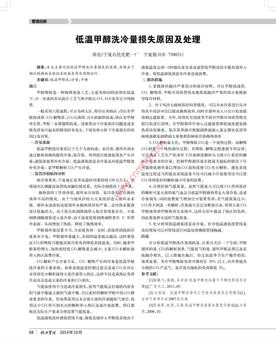 低溫甲醇洗冷量損失原因及處理