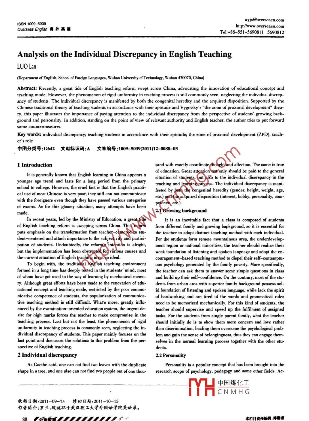ISSN 1009-5039http://www.overscaen.comOverseas English海外英謁Tel:+86- -551-5690811 5690812Analysis on the Individual Discrepancy in English TeachingLUO Lan(Department of English, School of Foreign Languages, Wuhan University of Technology, Wuhan 430070, China)Abstract: Recendly, a great tide of English teaching reform swept acrOss China, advocating the innovation of educational concept andteaching mode. However, the phenomenon of rigid uniformity in teaching process is still commonly seen, neglecting the individual discrep-ancy of students. The individual discrepancy is manifested by both the congenital heredity and the acquired disposition. Supported by theChinese traditional theory of teaching students in accordance with their aptitude and Vygotsky s "the zone of proximal development" theo-ry, this paper ilustrates the importance of paying attention to the individual discrepancy from the perspective of students' growing back-ground and personality. In addition, standing on the point of view of relevant authority and English teacher, the author tries to put forwardsome countermeasures.Key words: individual discrepancy; teaching students in accordance with their aptitude; the zone of proximal development (ZPD); teach-er's role中圖分類號:G642文獻(xiàn)標(biāo)識碼:A 文章編號: 1009- -5039(2011)12 -0088 -031 Introductionsand with exactly coordinate thought and afection. The same is trueof education. Great attention not only should be paid to the generalIt is generally known that English learming in China appears asituation of students, but also to the individual discrepancy in theyounger age trend and lasts for a long period from the primaryteaching and learning process. The individual discrepancy is mani-school to college. However, the cruel fact is that the English practi-fested by both the congenital heredity (gender, height, weight, age,cal use of most Chinese is very poor, they still can not communicateetc.) and the acquired disposition (interest, hobby, personality, com-with the foreigners even though they have passed various calegoriespetence, etc.).of exams. As for this gloomy situation, many attempts have been2.1 Growing backgroundmade.In recent years, led by the Ministry of Education, a great tideIt is an inevitable fact that a class is composed of studentsof English teaching refom is sweeping across China. This reformfrom different family and growing background, 80 it is essential forputs emphasis on the transformation from teacher- centered to stu-the teacher to adopt distinct teaching method with each individual.dent- centered and attach importance to the subjectivity and partici-For the students form remote mountainous area, the underdevelop-pation of students. Undoubtedly, the reform's intention is alright,ment region or national minorities, the teacher should realize theirbut the implementation has been obstructed for various causes andweak foundation of listening and spoken language and adopt the en-the eurrent situation of English teaching is not so ideal.couragement -based teaching method to dispel their self-contemptu-To begin with, the traditional English teaching environmentous psychology generated by the family poverty. More seifically,formed in a long time has deeply rooted in the students' mind, mostthe teacher can ask them to answer some simple questions in classof whom have got used to the way of learming by mechanical memo-and build up their self- -confidence. On the contrary, most of the stu.ry. Although great efforts have been made to the renovation of edu-dents from urban area with superior family background possess sol-cational concept and teaching mode, restricted by the poor commu-id foundation of listening and spoken language, while lack the spiritnicative competence of students, the popularization of communica-of hardworking and are tired of the words and grammatical rulestive teaching method is still difficult. What's more, greatly influ-need to be memorized mechanically. For this kind of students, theenced by the examination- -oriented education system, the urgent de-'teacher should supervise and speed up the fulfIment of assignedsire for high marks forces the teacher to make compromise in thetasks. For the students from single parent family, what the teacherteaching process. Last but not the least, the phenomenon of rigidshould initially do is to show them more concern and love ratheruniformity in teaching process is commonly seen, neglecting the in-than discrimination, leading them overcome the paychological prob-dividual discrepancy of students. This paper mainly focuses on thelem and gain the sense of belongingness, thus they can engage them-last point and diseusses the solutions to this problem from the per-selves in the normal leaming process together with the other stu-spective of English teaching.dents.2 Individual discrepancy2.2 PersonalityA8 Goethe said, one can not find two leaves with the duplicatePersonality is a popular concept that has been brought into theshape in a tree, and one also can not find two people out of one thou-research scope of psychology, pedagogy and Bome other fields. Ac-中國煤化工MYHCNM HG收稿日期:2011-09-15修回 日期:2011-10-15作者簡介:羅蘭,現(xiàn)就職于武漢理工大學(xué)外國語學(xué)院英語系。88外薄穎曠/ 111111118。r欄赍任編輯:得勤奎2011年12月Overseas English海外具語cording to the American psychologist Ryckman, personality can bedevelopment.defined as a dynamic and organized :set of characteristics possessed3.2 The zone of proximal development (ZPD)by a person that uniquely influences his or her cognitions, motiva-tions, and behaviors in various situations. (Ryckman, 2004) ThereThe zone of proximal development is a concept created by sem-are several theoretical perspectives on personality in psychology,inal psychologist Lev Vygotsky. According to Vygotsky, the zone ofwhich involve diferent ideas about the relationship between person-proxim
