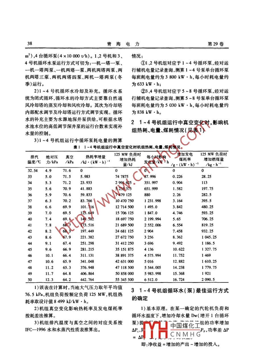 第29卷第4期青海電力Vol. 29 No. 42010年12月QINGHAI ELECTRIC POWERDec. ,2010橋頭鋁電二廠1 ~4號(hào)機(jī)組循環(huán)水系統(tǒng)優(yōu)化運(yùn)行及應(yīng)用趙國棟(青海橋頭鋁電股份有限公司發(fā)電分公司生技部,青海大通810100)擠要: 火電廠凝汽式機(jī)組循環(huán)水系統(tǒng)優(yōu)化運(yùn)行是提高機(jī)組經(jīng)濟(jì)運(yùn)行的重要途徑。由于機(jī)組循環(huán)泵大部分是定速運(yùn)行,機(jī)組運(yùn)行最佳真空確定后,無法實(shí)現(xiàn)最佳的循環(huán)水量調(diào)節(jié)。但可根據(jù)機(jī)組負(fù)荷、循環(huán)水溫情況,通過對(duì)循環(huán)水泵不同的組合方式,使循環(huán)水量盡可能接近最佳循環(huán)水量,從而提高機(jī)組運(yùn)行的經(jīng)濟(jì)性。文章通過對(duì)橋二廠1 ~4號(hào)機(jī)組循環(huán)水系統(tǒng)設(shè)備及運(yùn)行方式、計(jì)算對(duì)比,確定出循環(huán)水系統(tǒng)不同運(yùn)行方式下的最佳起泵調(diào)節(jié)點(diǎn),為運(yùn)行人員操作提供了循環(huán)水系統(tǒng)優(yōu)化運(yùn)行方式的參考依據(jù)。關(guān)鍵詞:循環(huán)水系統(tǒng);優(yōu)化運(yùn)行; 應(yīng)用中圖分類號(hào):T223.7*5文獻(xiàn)標(biāo)識(shí)碼: B文章編號(hào): 1006 -8198(2010)04 -0037 -03Optimizing Operation and Application for 1 -4* Units CirculatingWater System in Qinghai Qiaotou Electricity & Aluminum CorporationZHAO Guo dongAbstract: Optimizing operation for circulating water system of thermal power steam condensed is an important ap-proach to improve unit economic operation. After confirming optimal vacuum of unit operation, it can not realize opti-mal circulating water quantity because of constant speed operating of circulating pump. Through adopting different eir-culating pump assembly mode based on load and water temperature of unit, in order to make the circulating waterquantity approaching to optimal point, thus improving cconomical eficiency of unit operation. The paper confirms ptimal pumping regulation point of circulating water system under different operating mode through comparing circulat-ing water system equipment and operating mode of 1 -4* units in second branch of Qinghai Qiaotou Electricity & Alu-minum Corporation , thus provides reference for operating staffs.Keywords: circulating water system; optimizing operation; application火電廠凝汽式機(jī)組循環(huán)水系統(tǒng)的優(yōu)化運(yùn)行,氣候條件等因素影響。因此循環(huán)水系統(tǒng)的優(yōu)化運(yùn)是火電廠提高機(jī)組運(yùn)行經(jīng)濟(jì)性研究的重要途徑,行應(yīng)根據(jù)本廠循環(huán)水系統(tǒng)的實(shí)際情況,制定-套其目的就是要求汽輪機(jī)運(yùn)行部門根據(jù)當(dāng)時(shí)的機(jī)組可行的方案來指導(dǎo)機(jī)組循環(huán)水系統(tǒng)的調(diào)節(jié)。運(yùn)行臺(tái)數(shù),汽輪機(jī)帶負(fù)荷情況和循環(huán)水進(jìn)水溫度1 1 ~4號(hào)機(jī)組循環(huán)水系統(tǒng)簡介及時(shí)調(diào)整循環(huán)水系統(tǒng)的運(yùn)行方式,調(diào)整循環(huán)水泵的運(yùn)行臺(tái)數(shù),實(shí)現(xiàn)循環(huán)水系統(tǒng)的優(yōu)化運(yùn)行,保證凝1)1、2號(hào)機(jī)循環(huán)水系統(tǒng)為一組母管制供給,汽器在最佳真空下運(yùn)行,最大限度地提高汽輪機(jī)配有2臺(tái)自然通風(fēng)冷卻塔(填料層冷卻面積為2的運(yùn)行經(jīng)濟(jì)性。x2 000 m2)、4臺(tái)循環(huán)泵(4x9 000 Vh),3、4號(hào)電廠循環(huán)水系統(tǒng)的設(shè)計(jì)必須綜合考慮裝機(jī)臺(tái)機(jī)循環(huán)水系統(tǒng)設(shè)計(jì)為一-組母管制供給,配有2臺(tái)數(shù)、單機(jī)容量、循環(huán)水水源、循環(huán)水冷卻方式、當(dāng)?shù)刈匀煌L(fēng)冷卻塔(填料層冷卻面積為2x2000中國煤化工作者簡介:趙國棟( 1972 - )男,青海大通人,助理工程師,從事YHCNMHG收稿日期: 2010-05 -2638青海電力第29卷m2),4臺(tái)循環(huán)泵(4x10000t/h)。1、2 號(hào)機(jī)和3、情況:4號(hào)機(jī)循環(huán)水泵運(yùn)行方式可切為:一機(jī)一塔- -泵、①l2號(hào)機(jī)組對(duì)應(yīng)于1~4號(hào)循環(huán)泵,經(jīng)對(duì)運(yùn)一機(jī)一塔兩泵、一機(jī)兩塔- 泵、兩機(jī)兩塔兩泵、兩行輔機(jī)電量記錄查詢,測(cè)算1 ~4號(hào)泵單臺(tái)循環(huán)泵機(jī)兩塔三泵、兩機(jī)兩塔四泵、兩機(jī)- -塔兩泵(冬每班耗電量約為3 800 kW●h,每小時(shí)耗電量約季)運(yùn)行。為633 kW .h;2)1 ~4號(hào)機(jī)循環(huán)水冷卻及補(bǔ)充。循環(huán)水系②3.4號(hào)機(jī)組對(duì)應(yīng)于5 ~8號(hào)循環(huán)泵,經(jīng)對(duì)運(yùn)統(tǒng)為閉式循環(huán),循環(huán)水的冷卻方式主要靠自然通行輔機(jī)電量記錄查詢,測(cè)算5~8號(hào)泵單臺(tái)循環(huán)泵風(fēng)冷卻塔的蒸發(fā)冷卻和風(fēng)吹冷卻。其次為冷卻塔每班耗電量約為5 030 kW●h,每小時(shí)耗電量約內(nèi)部配水調(diào)節(jié)及冷卻塔運(yùn)行方式調(diào)節(jié)實(shí)現(xiàn)。循環(huán)為838kW●h。水的補(bǔ)充主要為水源地深井泵供給,可根據(jù)水塔2 1 ~4號(hào)機(jī)組運(yùn)行中真空變化時(shí),影響機(jī)水池水位的高低調(diào)節(jié)深井泵的運(yùn)行臺(tái)數(shù)來實(shí)現(xiàn)補(bǔ)組熱耗、電量煤耗情況(見表1)水量的控制。3)1~4號(hào)機(jī)組運(yùn)行中循環(huán)泵耗電量的測(cè)算表! 1~4 號(hào)機(jī)組運(yùn)行中真空變化時(shí)機